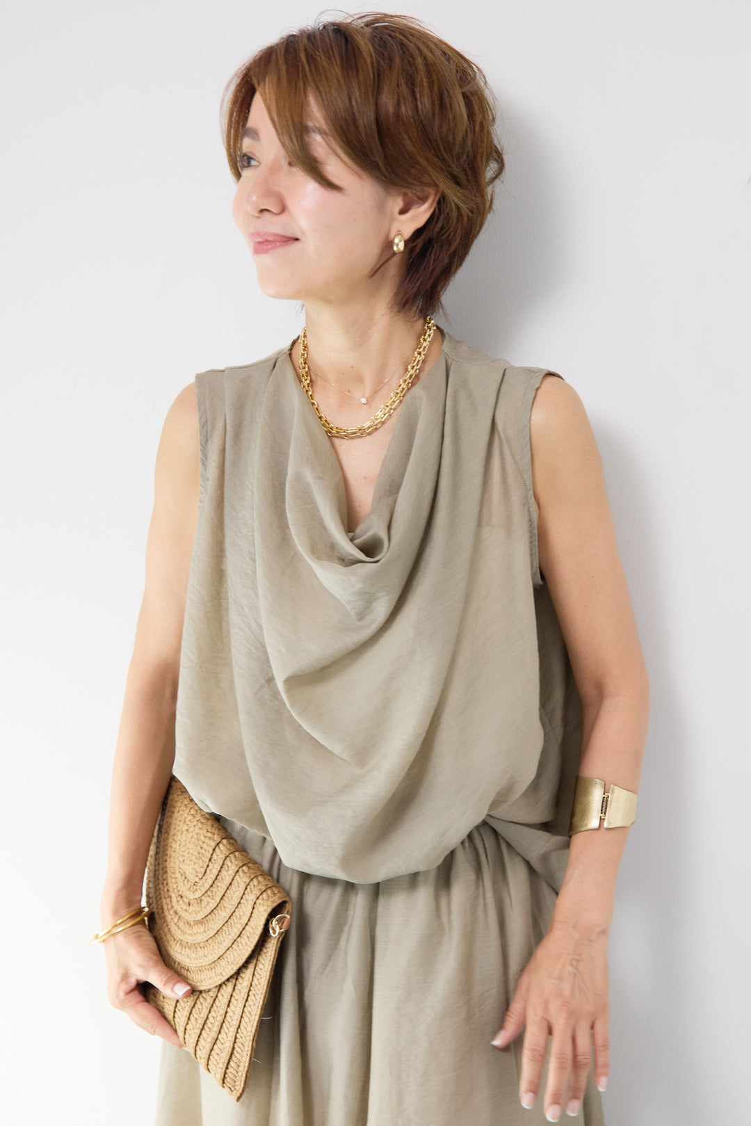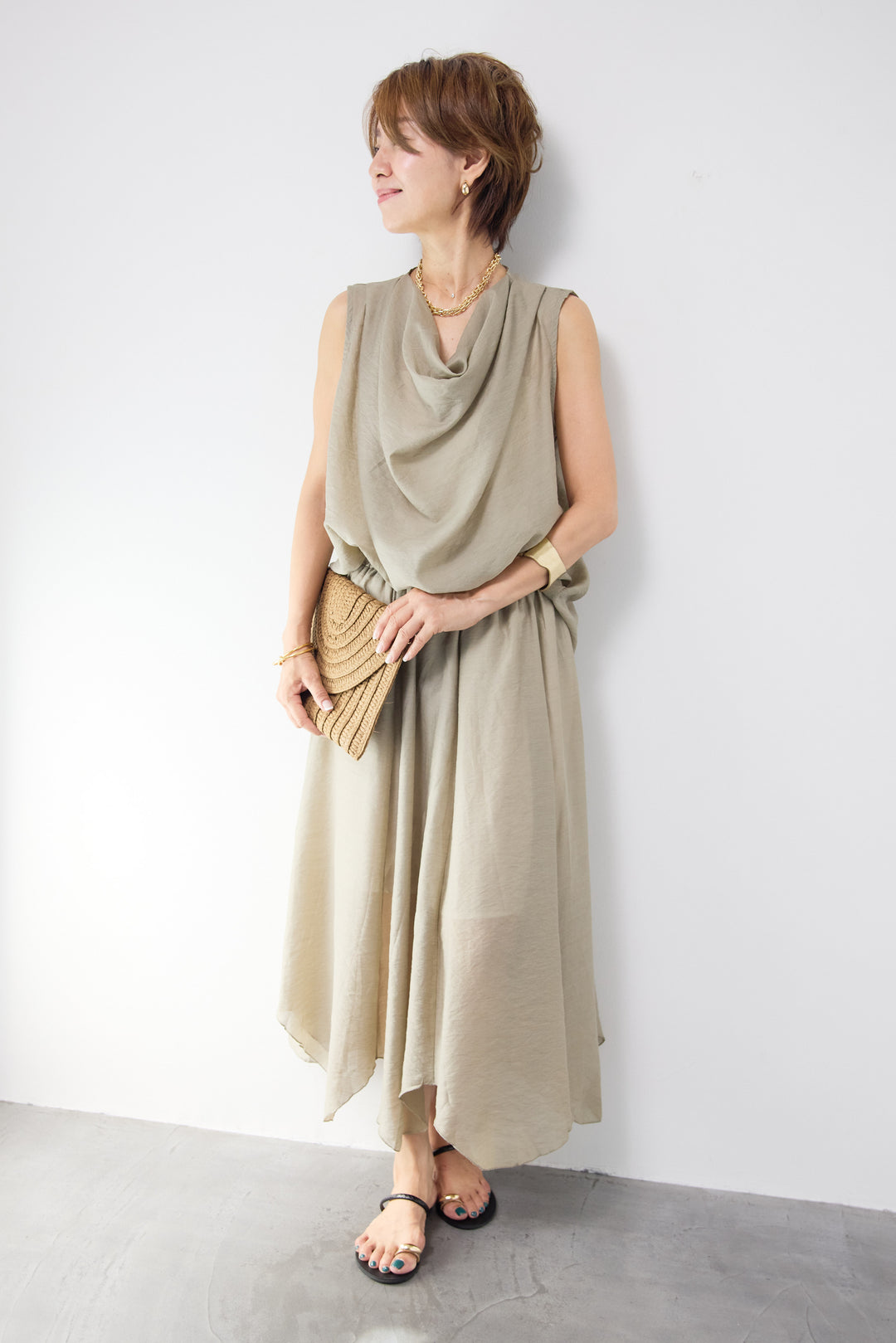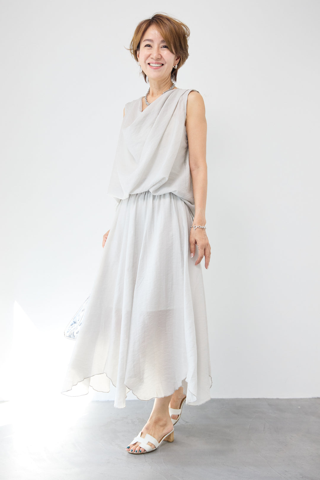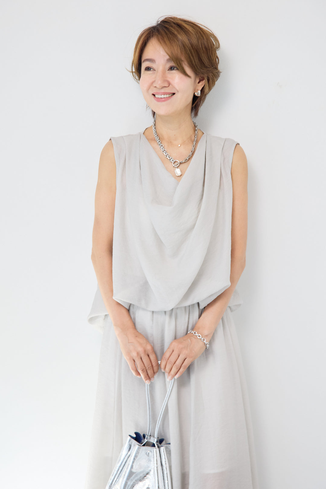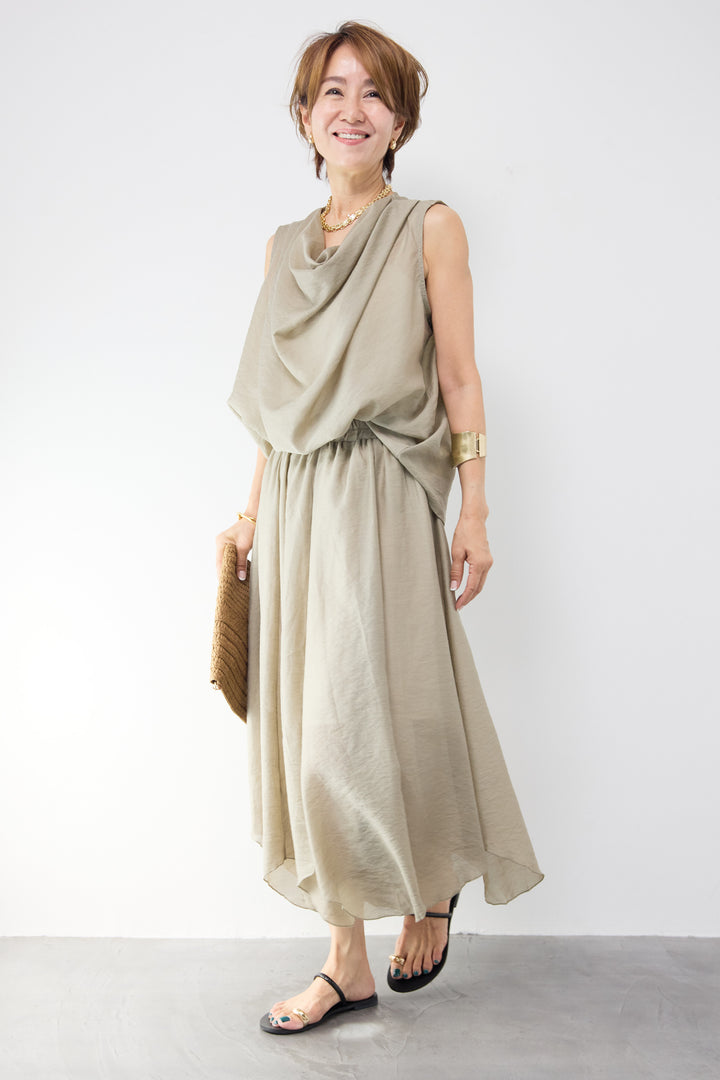 上品なとろみ感が魅力のドレープブラウスと、華やかに広がるフレアスカートのセットアップ。ブラウスはゆったりとしたシルエットに流れるようなドレープが映え、体のラインを拾いにくくエレガントな印象に。セットのスカートは、動くたびにふんわりと揺れるフレアシルエットで、足元まで軽やかな雰囲気を演出します。上下ともにシンプルなデザインなので、それぞれ単品使いもでき、着こなしの幅が広がります。フォーマルな場面から日常のお出かけまで、シーンを問わず活躍するアイテムです。