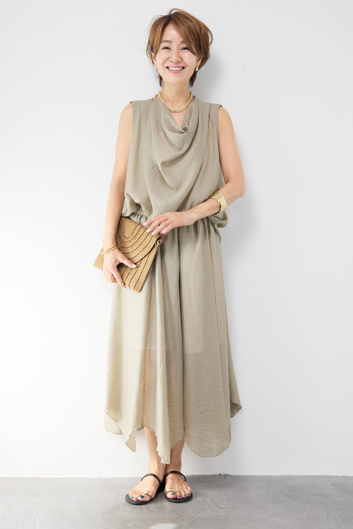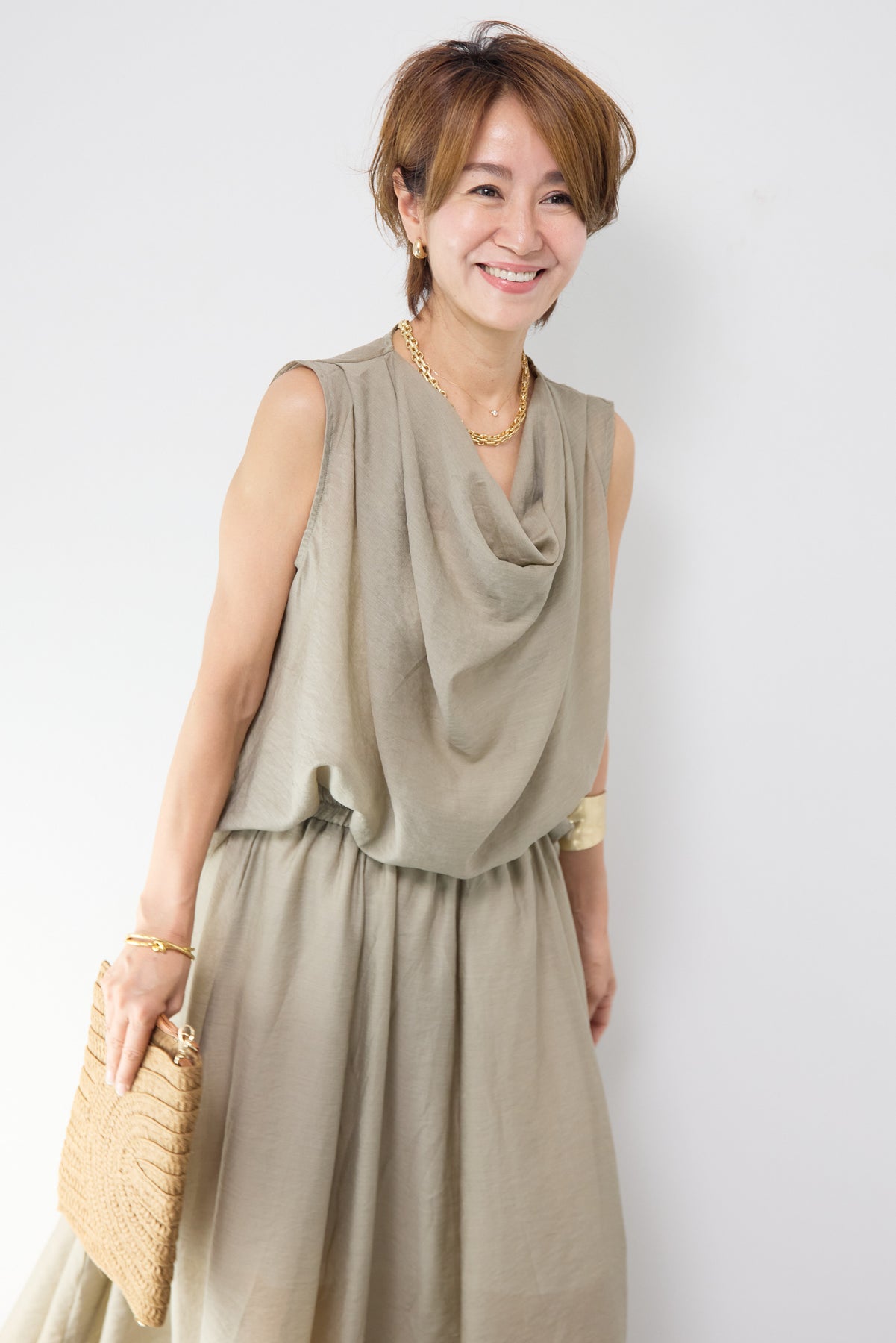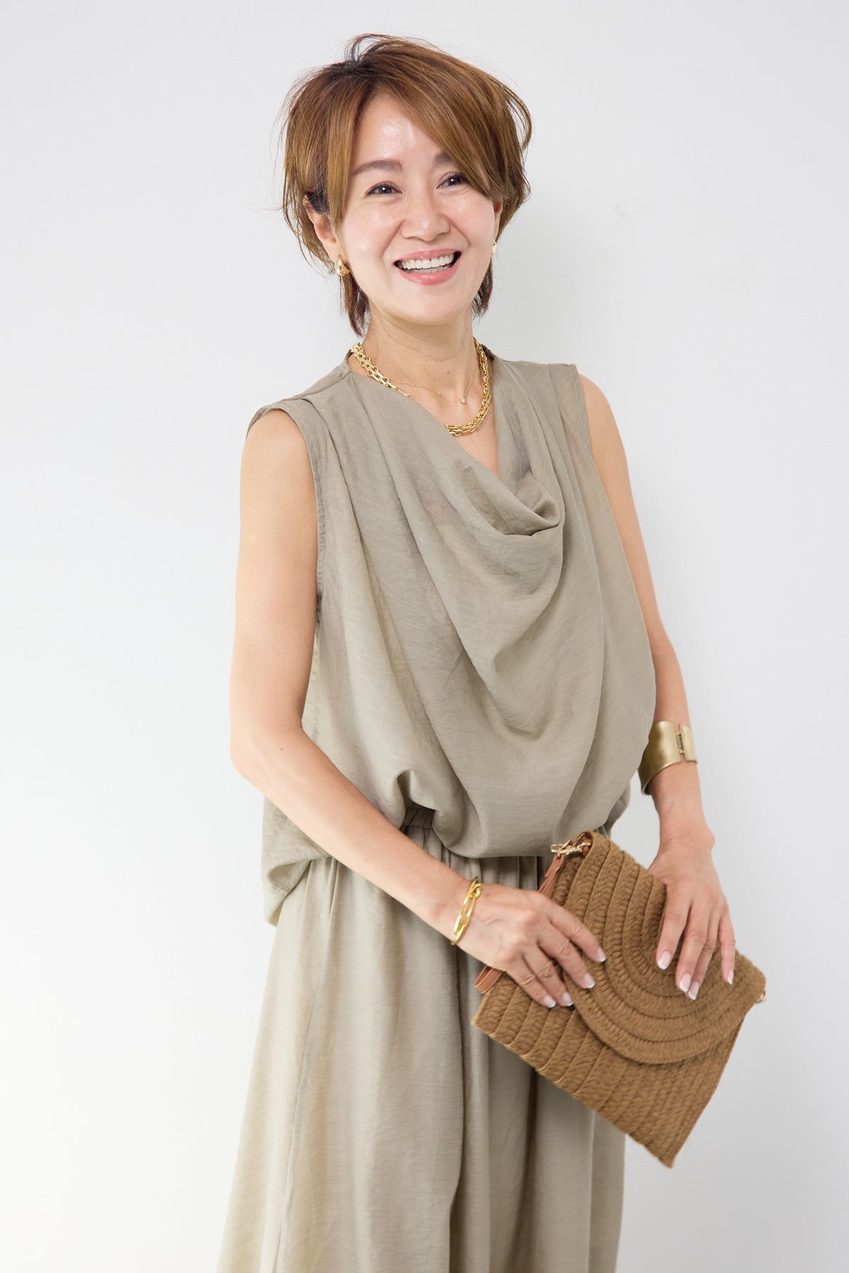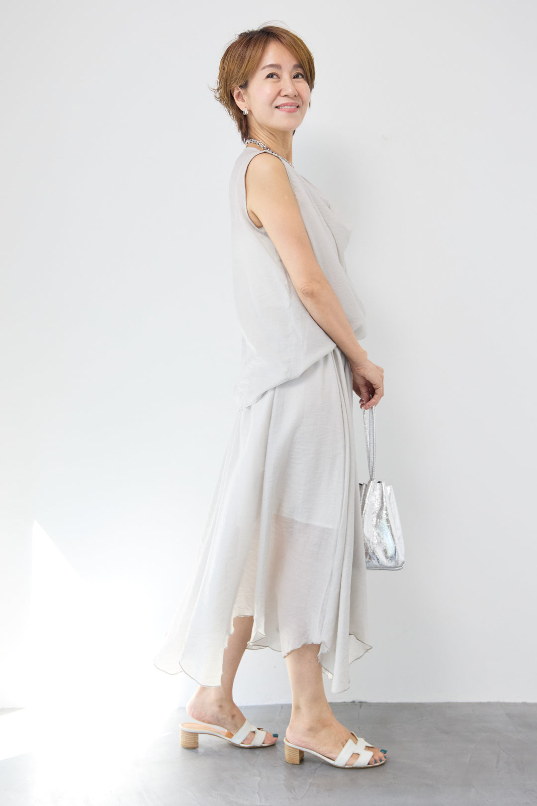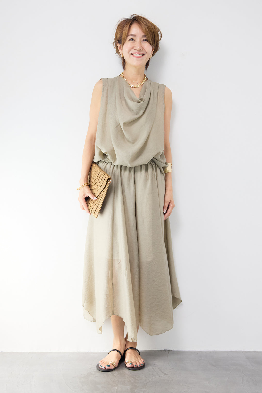 上品なとろみ感が魅力のドレープブラウスと、華やかに広がるフレアスカートのセットアップ。ブラウスはゆったりとしたシルエットに流れるようなドレープが映え、体のラインを拾いにくくエレガントな印象に。セットのスカートは、動くたびにふんわりと揺れるフレアシルエットで、足元まで軽やかな雰囲気を演出します。上下ともにシンプルなデザインなので、それぞれ単品使いもでき、着こなしの幅が広がります。フォーマルな場面から日常のお出かけまで、シーンを問わず活躍するアイテムです。