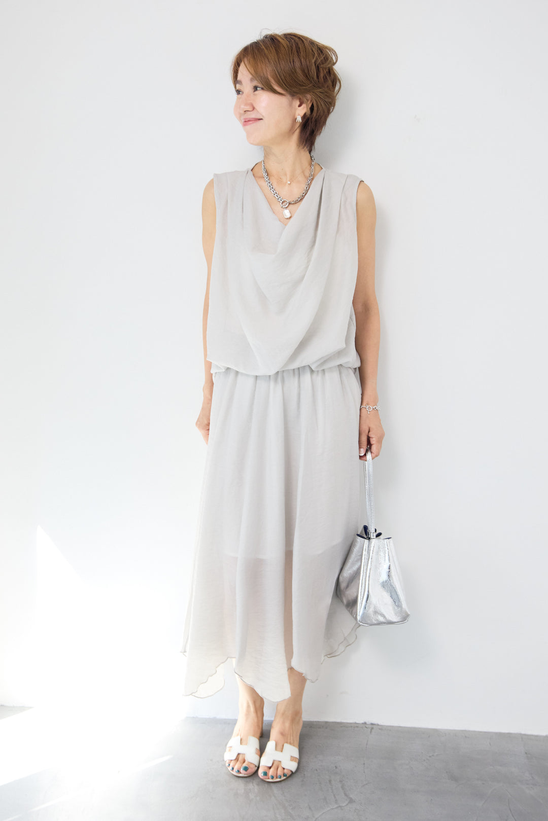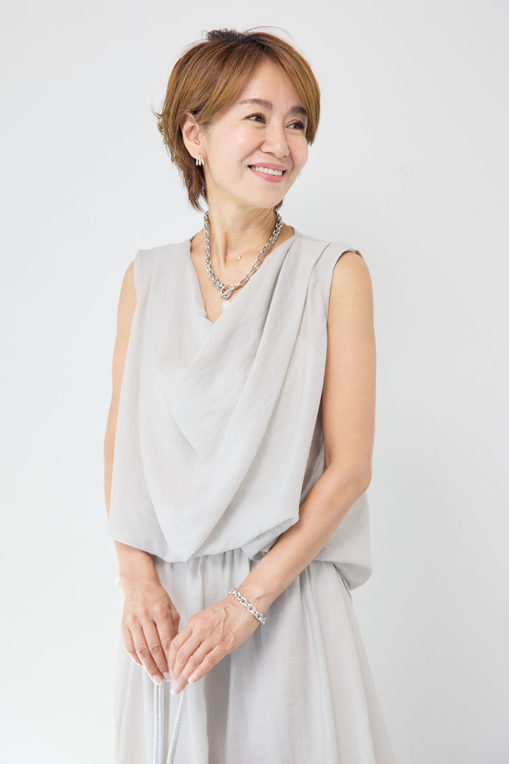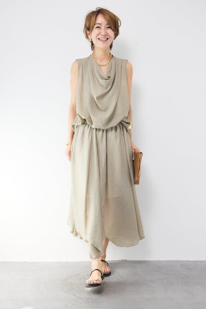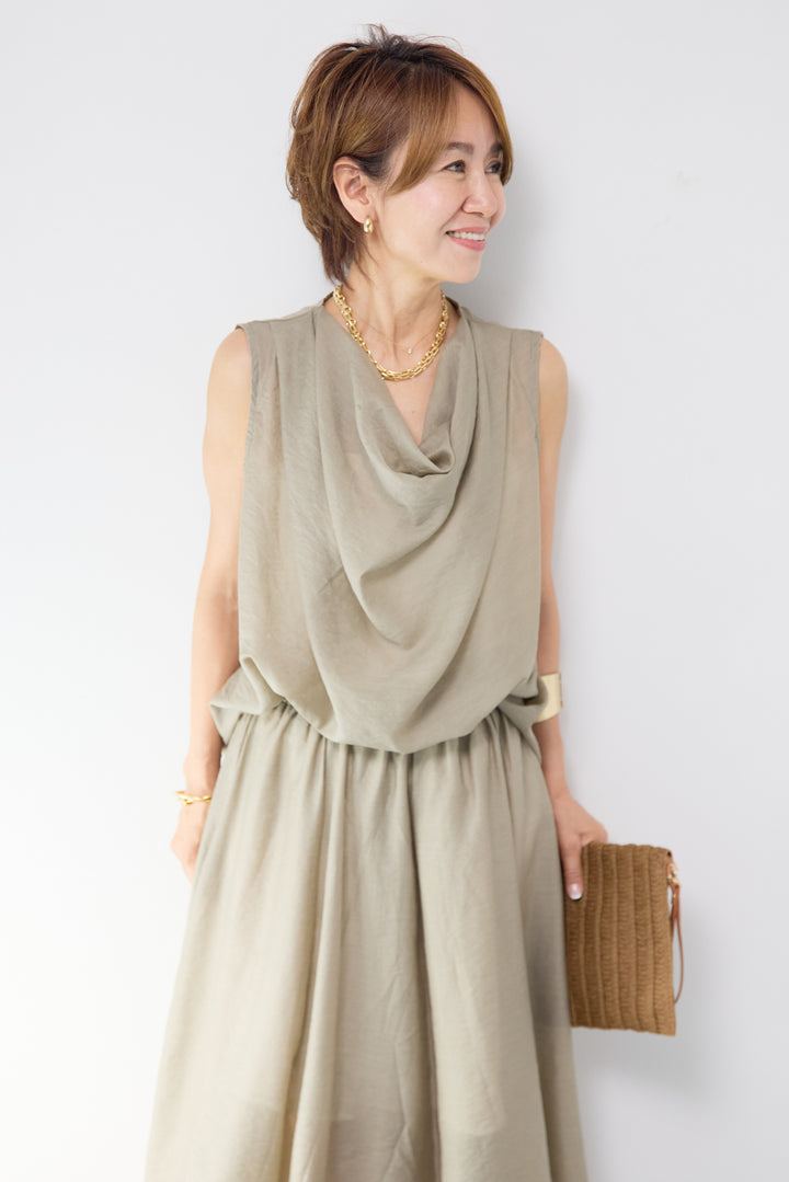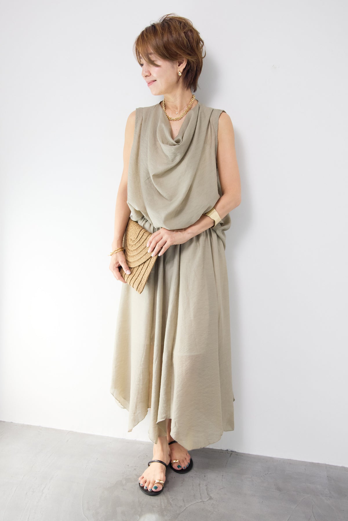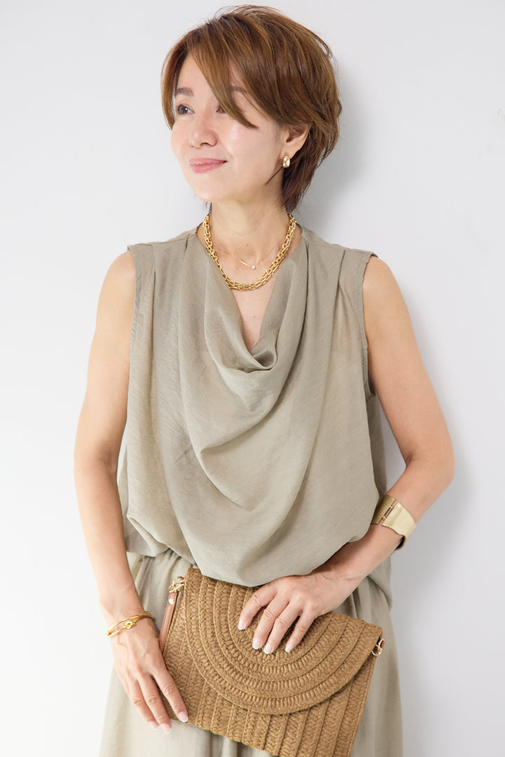 上品なとろみ感が魅力のドレープブラウスと、華やかに広がるフレアスカートのセットアップ。ブラウスはゆったりとしたシルエットに流れるようなドレープが映え、体のラインを拾いにくくエレガントな印象に。セットのスカートは、動くたびにふんわりと揺れるフレアシルエットで、足元まで軽やかな雰囲気を演出します。上下ともにシンプルなデザインなので、それぞれ単品使いもでき、着こなしの幅が広がります。フォーマルな場面から日常のお出かけまで、シーンを問わず活躍するアイテムです。