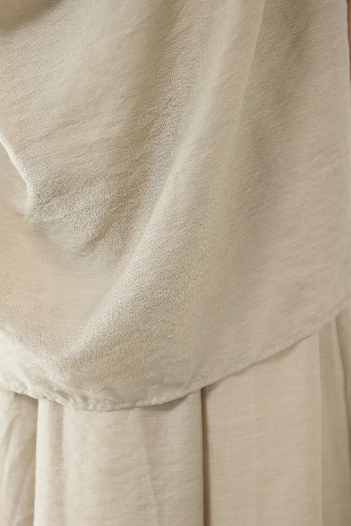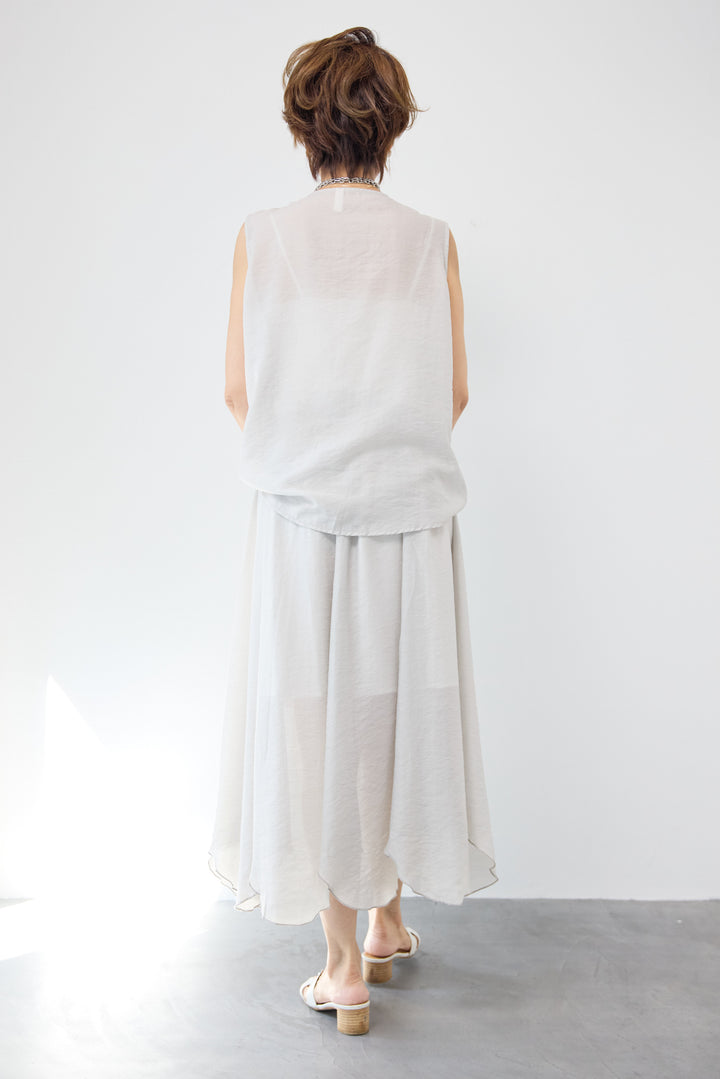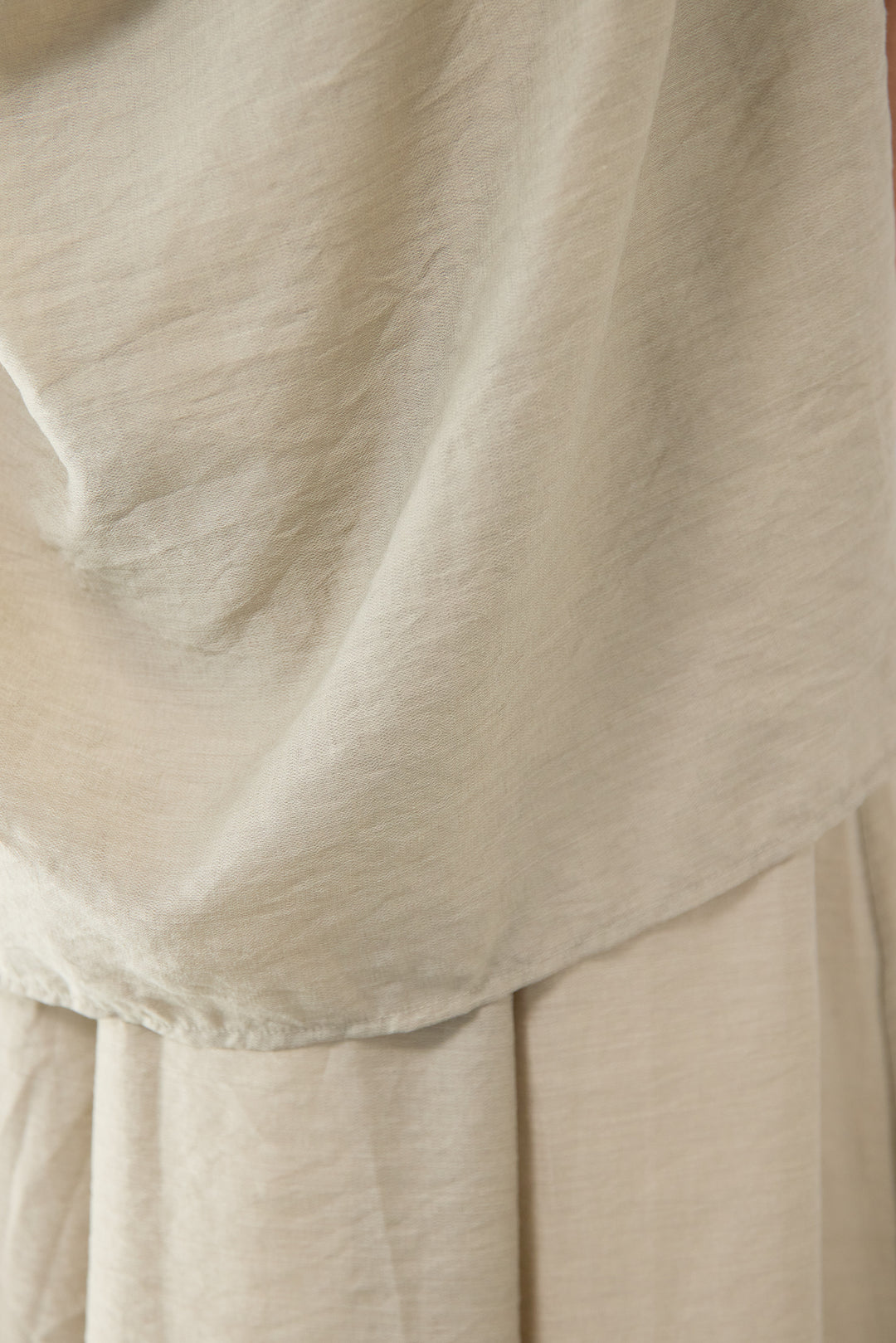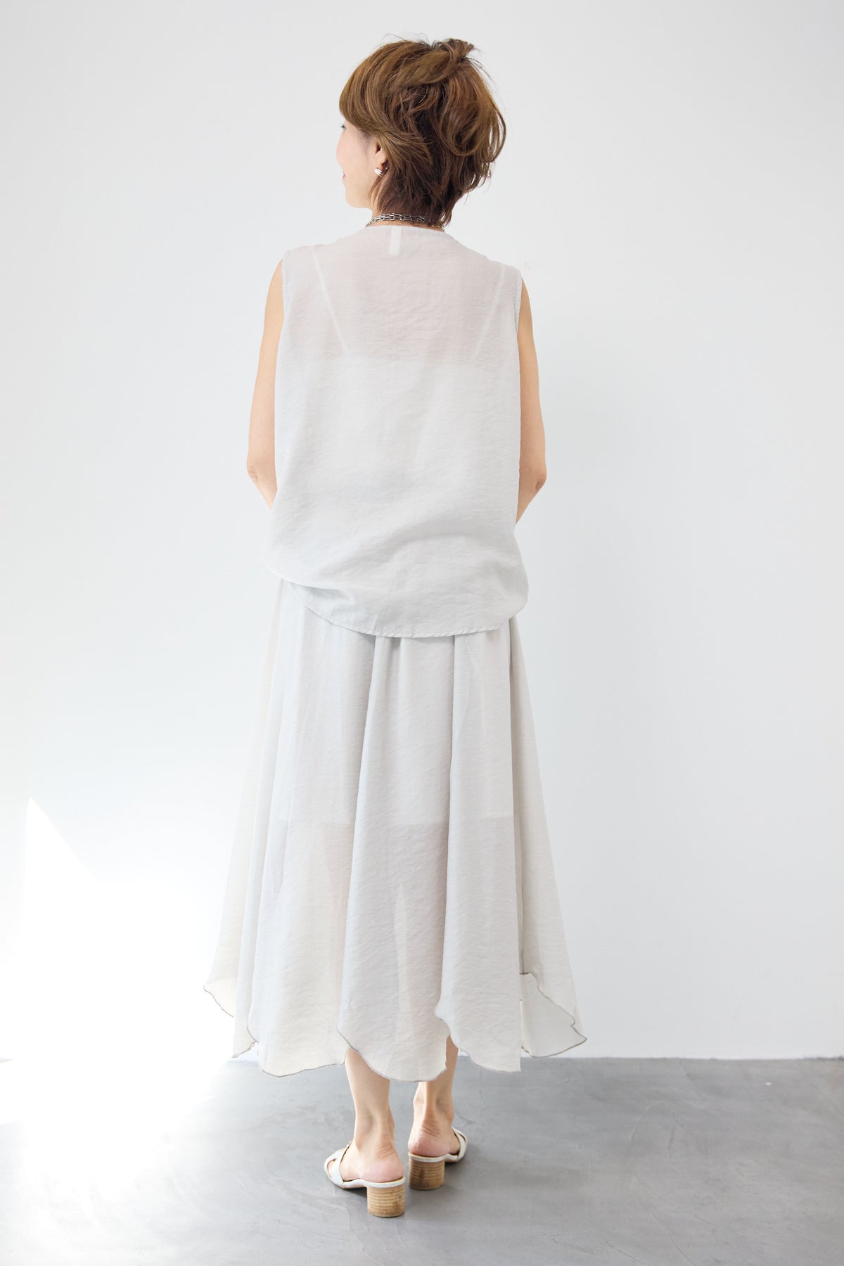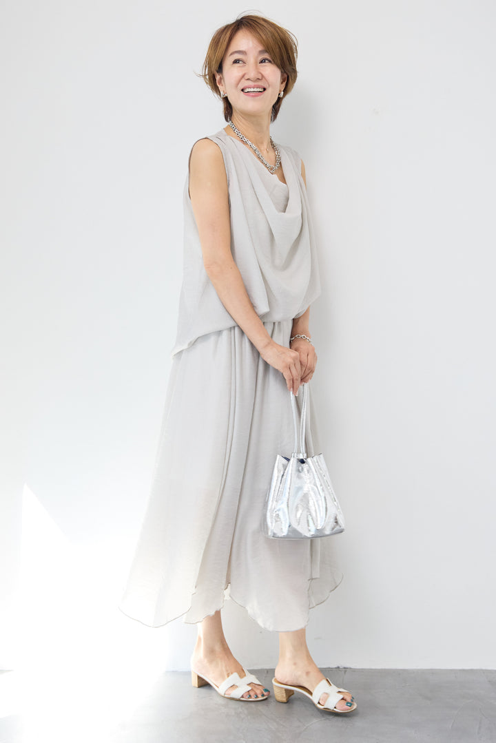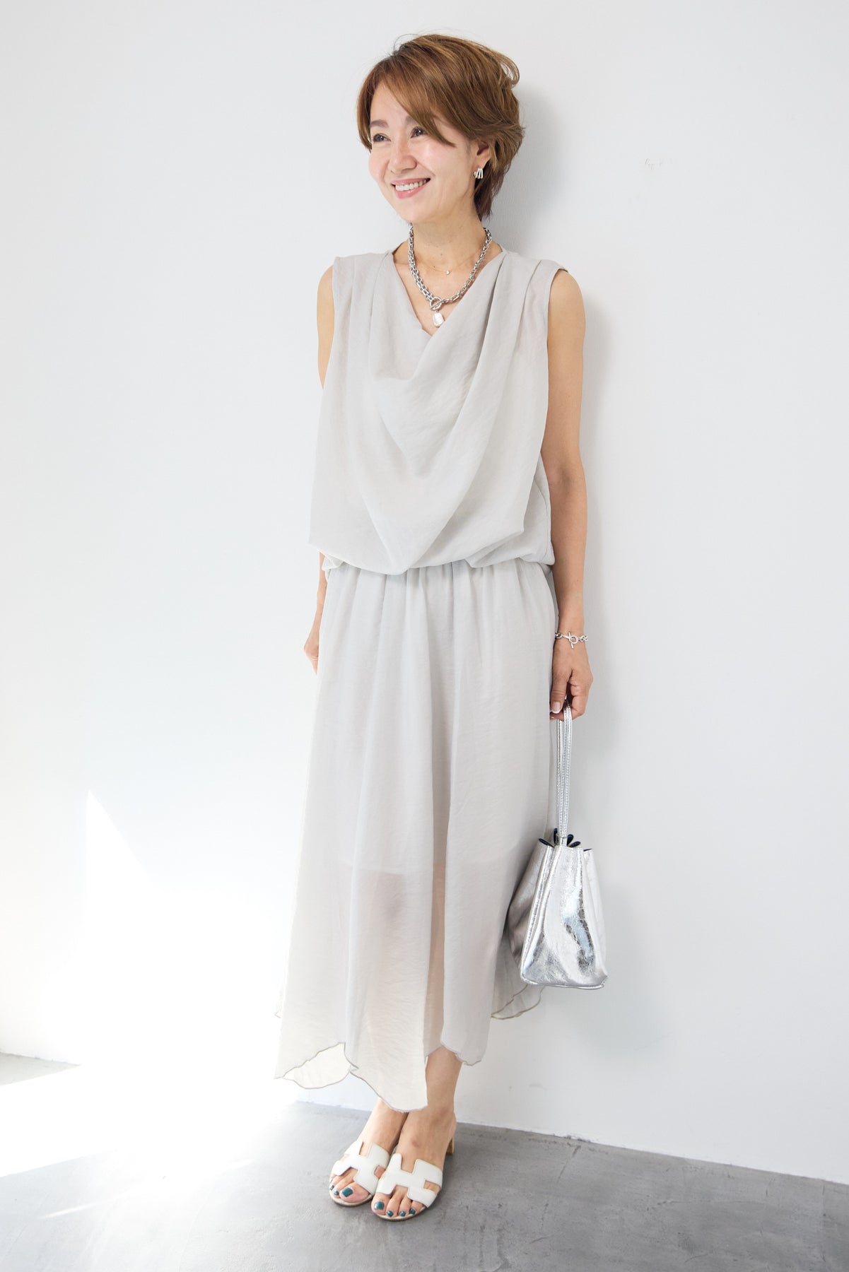 上品なとろみ感が魅力のドレープブラウスと、華やかに広がるフレアスカートのセットアップ。ブラウスはゆったりとしたシルエットに流れるようなドレープが映え、体のラインを拾いにくくエレガントな印象に。セットのスカートは、動くたびにふんわりと揺れるフレアシルエットで、足元まで軽やかな雰囲気を演出します。上下ともにシンプルなデザインなので、それぞれ単品使いもでき、着こなしの幅が広がります。フォーマルな場面から日常のお出かけまで、シーンを問わず活躍するアイテムです。