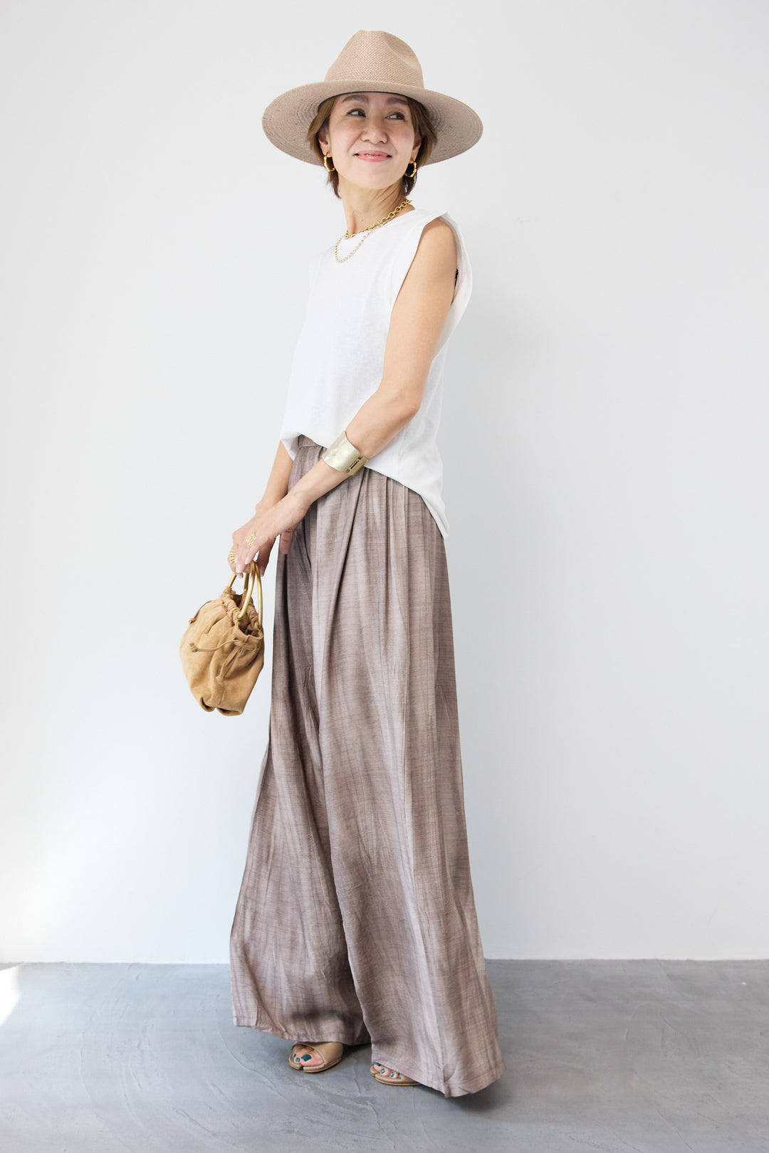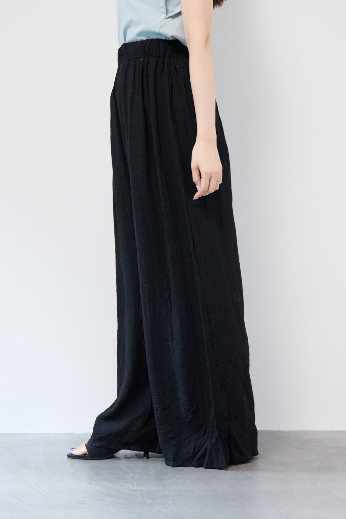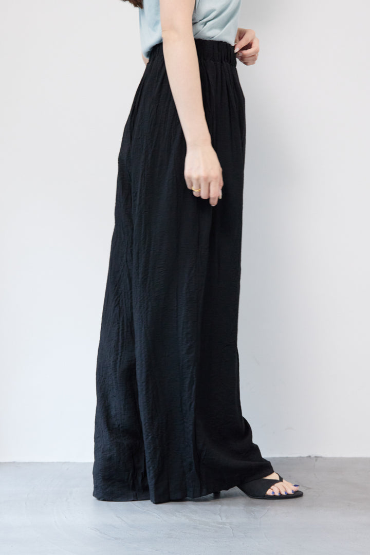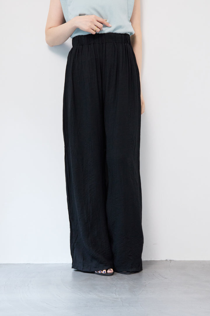 グラデーションの色合いが魅力のワッシャーパンツ。シワ感のある素材が動きにニュアンスを与え、抜け感のある大人のリラックススタイルを叶えます。ウエストはゴム仕様で、着心地も快適。シンプルなトップスを合わせるだけで、コーディネートにアクセントを加えてくれる一本です。