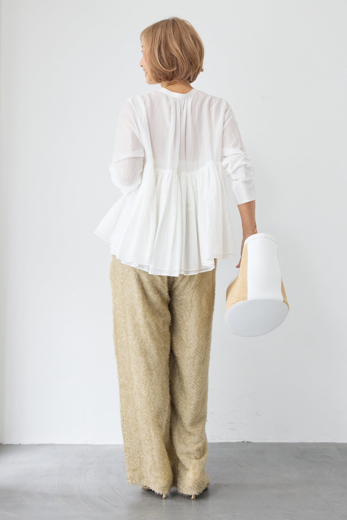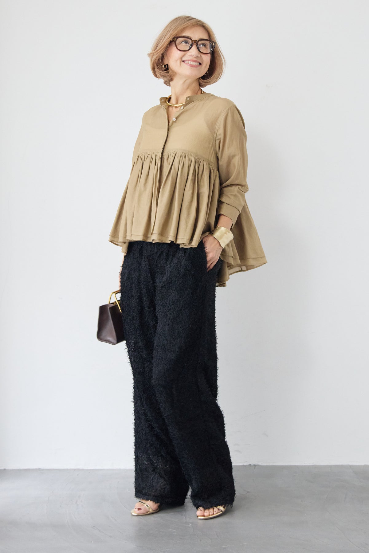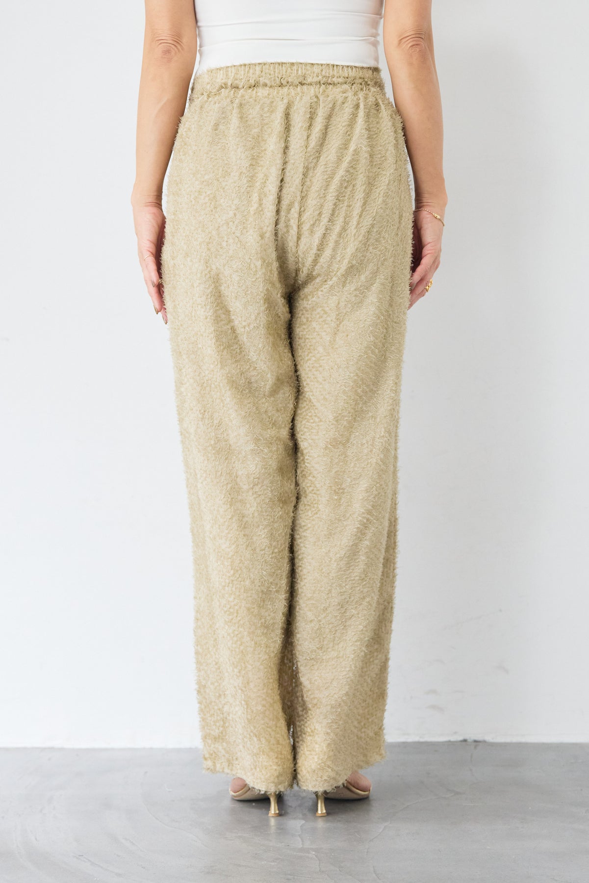 一目で目を引く、立体的なフリンジカットジャガード生地を贅沢に使用したワイドパンツ。 毛足のある柔らかな質感が、コーディネートに奥行きと華やかさをプラスします。