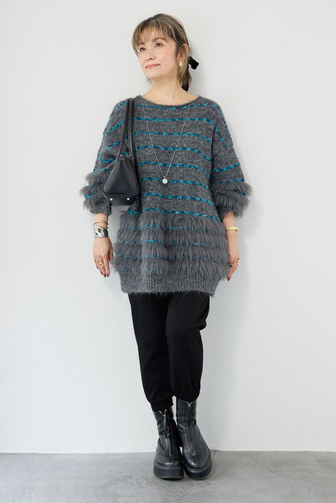 [SET]配色ラインシャギーニット+【REIKOコラボ】スウェット起毛ジョガーパンツ(2set)