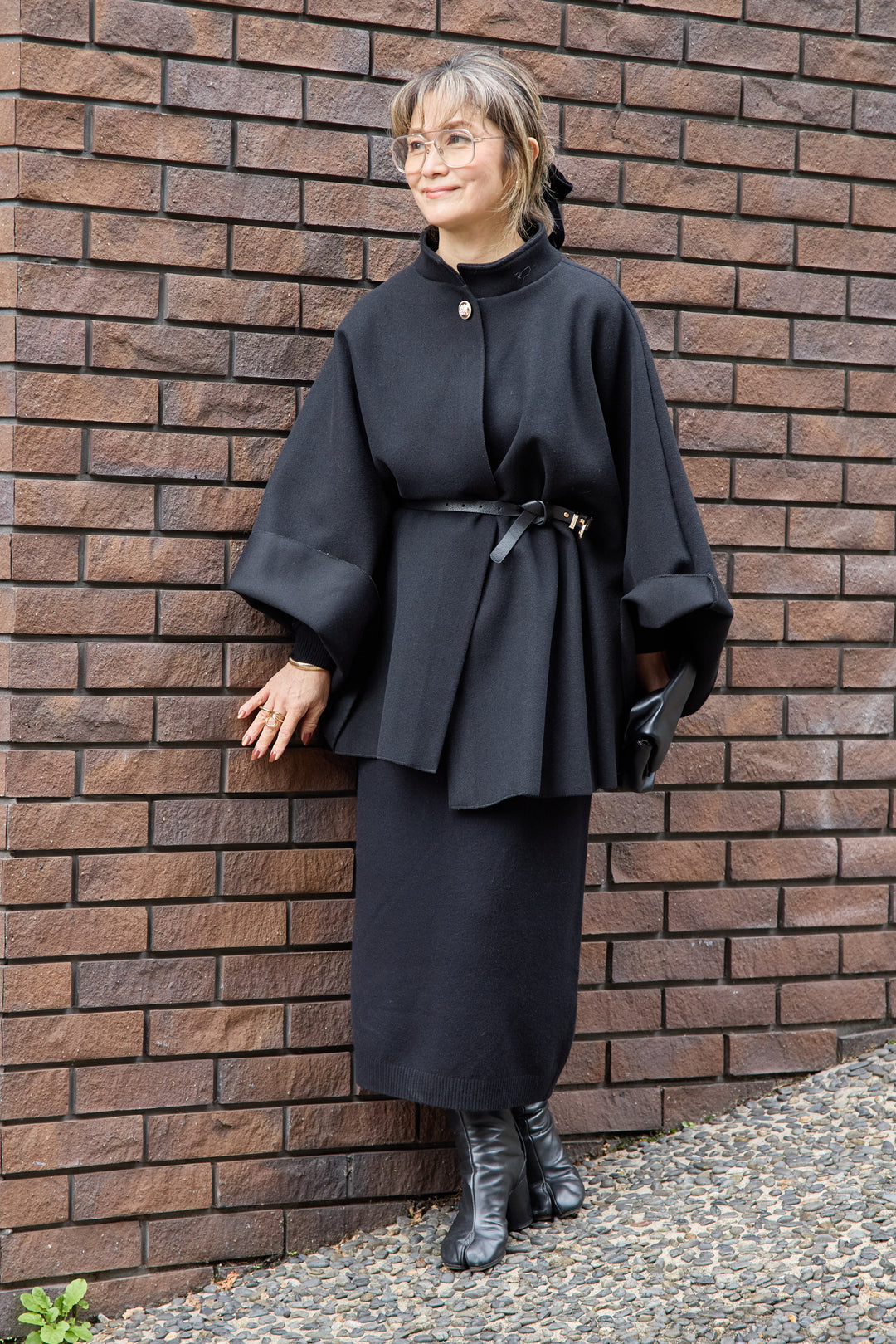 [SET]スタンドカラーケープコート+Vネック ロングニットワンピース(2set)
