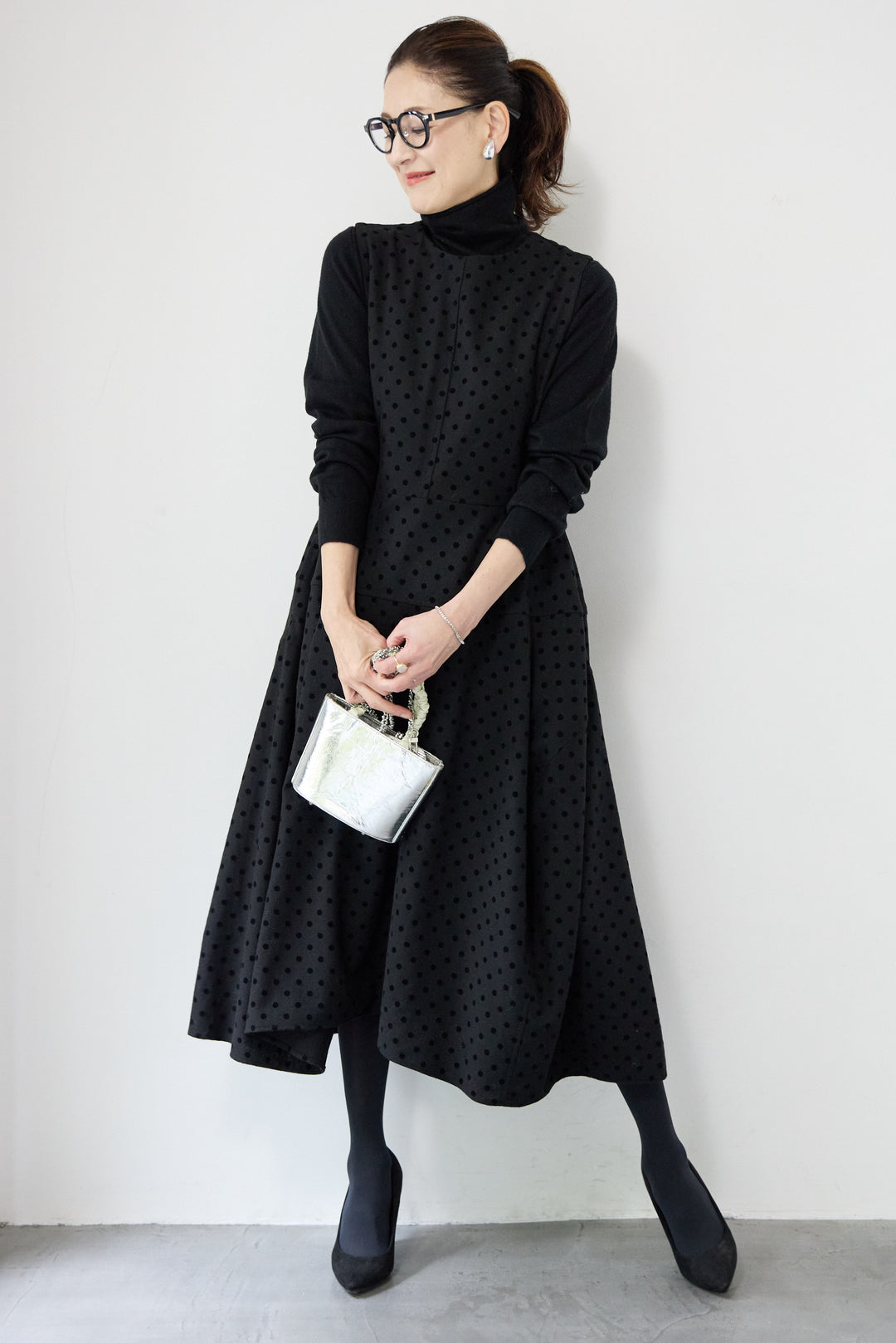 [SET]カシミヤ混 ハイネックニット+フロッキードット フレアジャンパースカート(2set)