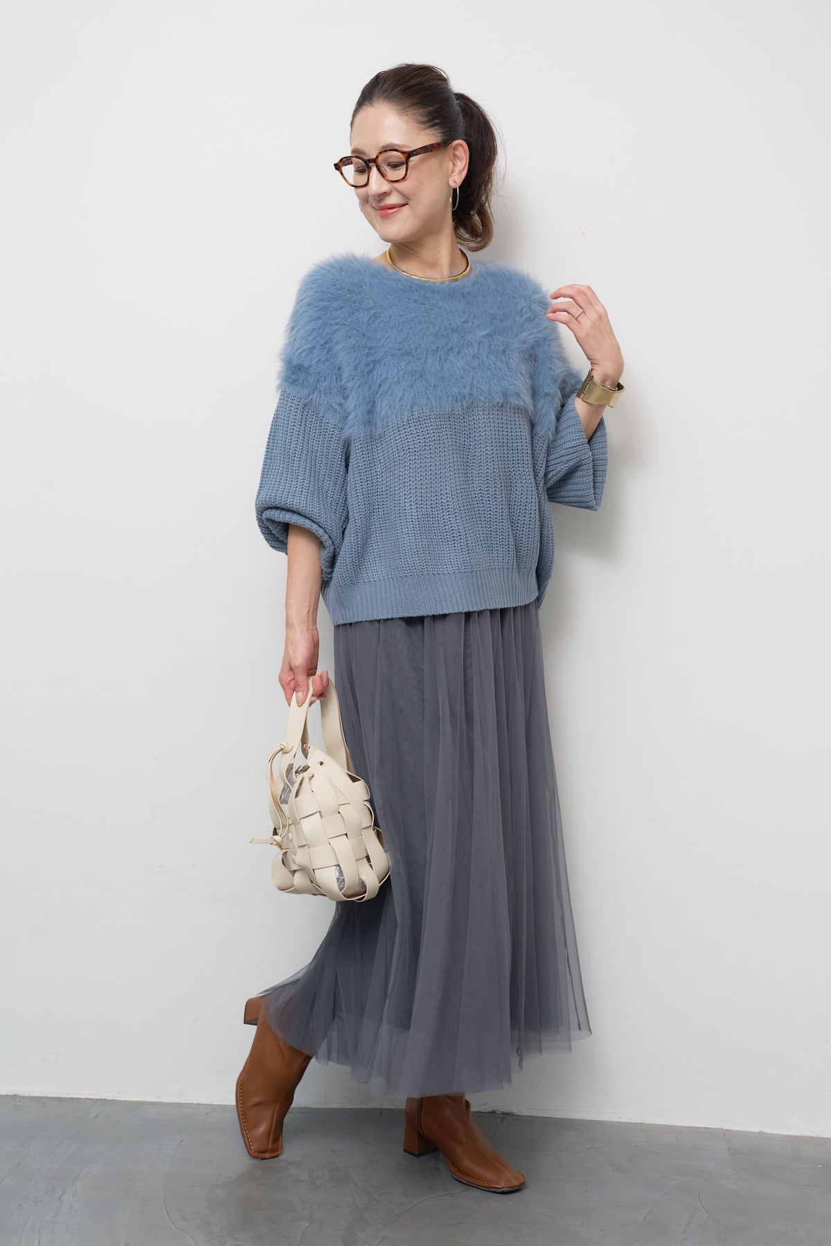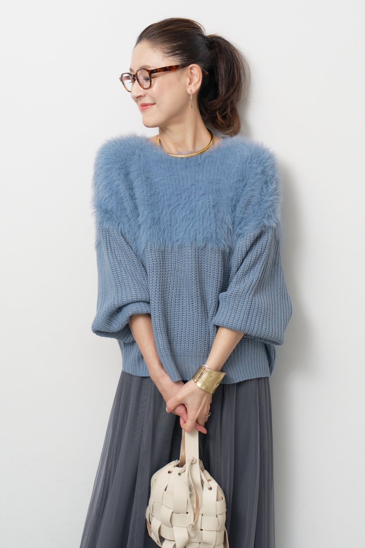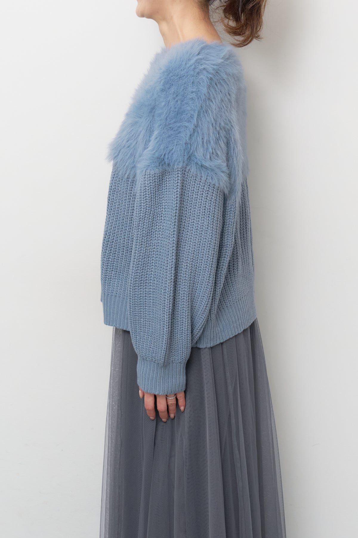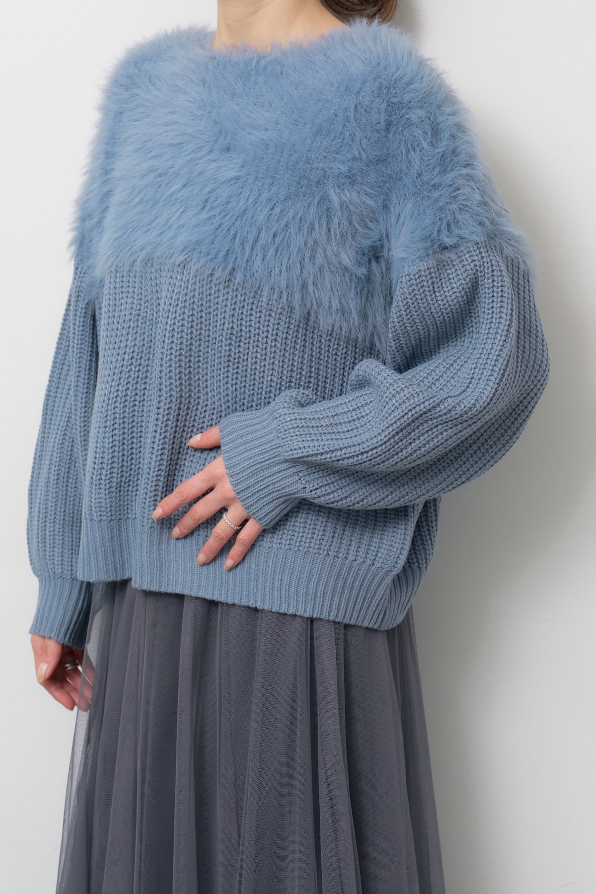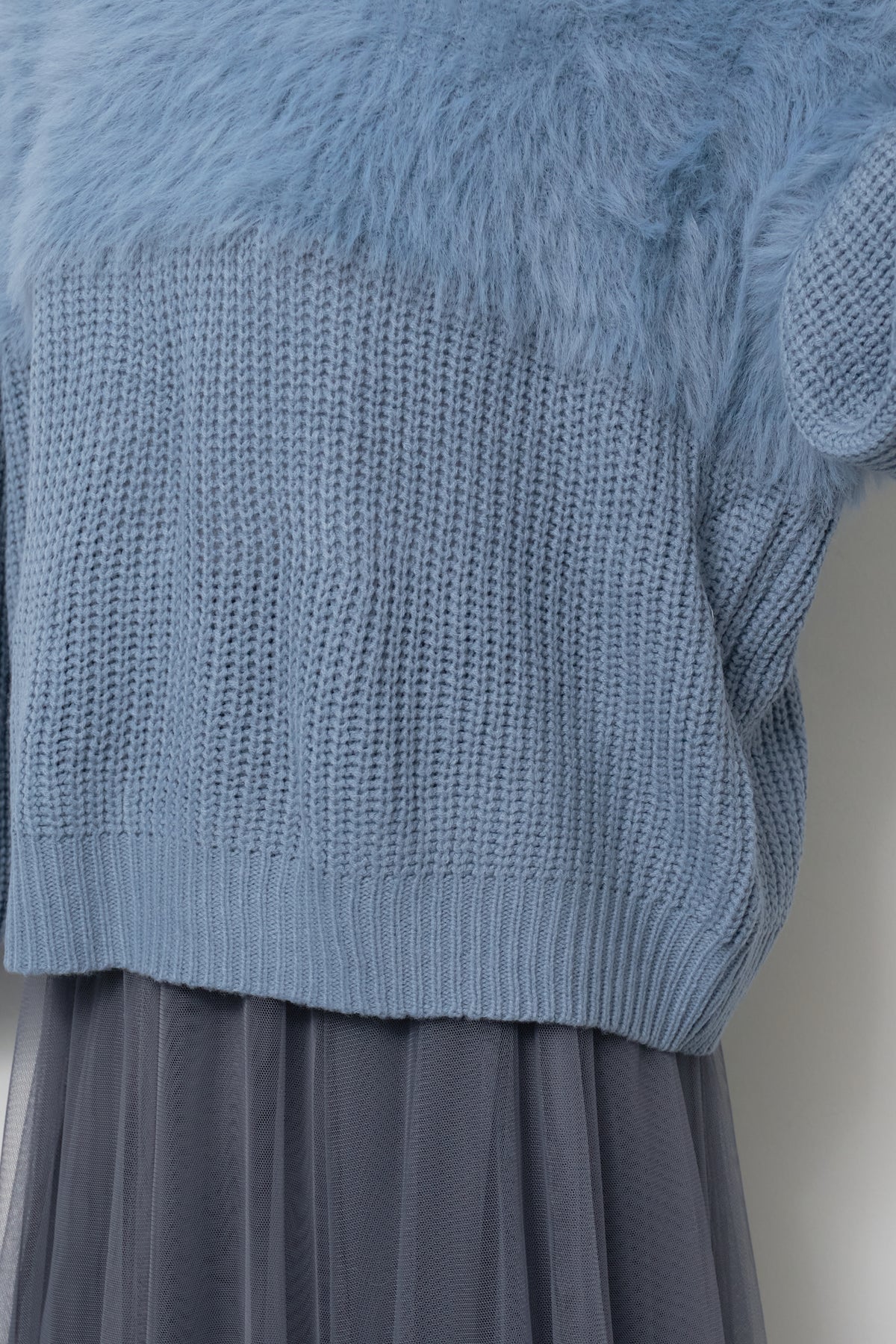 ボリュームスリーブ切替シャギーニット/チュールギャザースカート