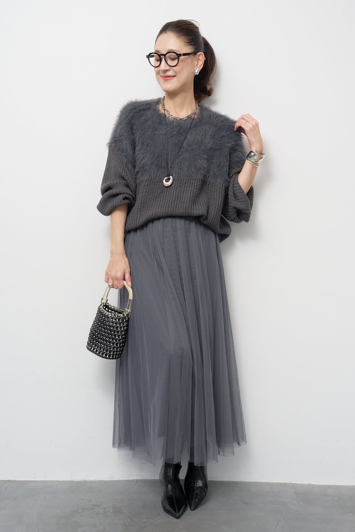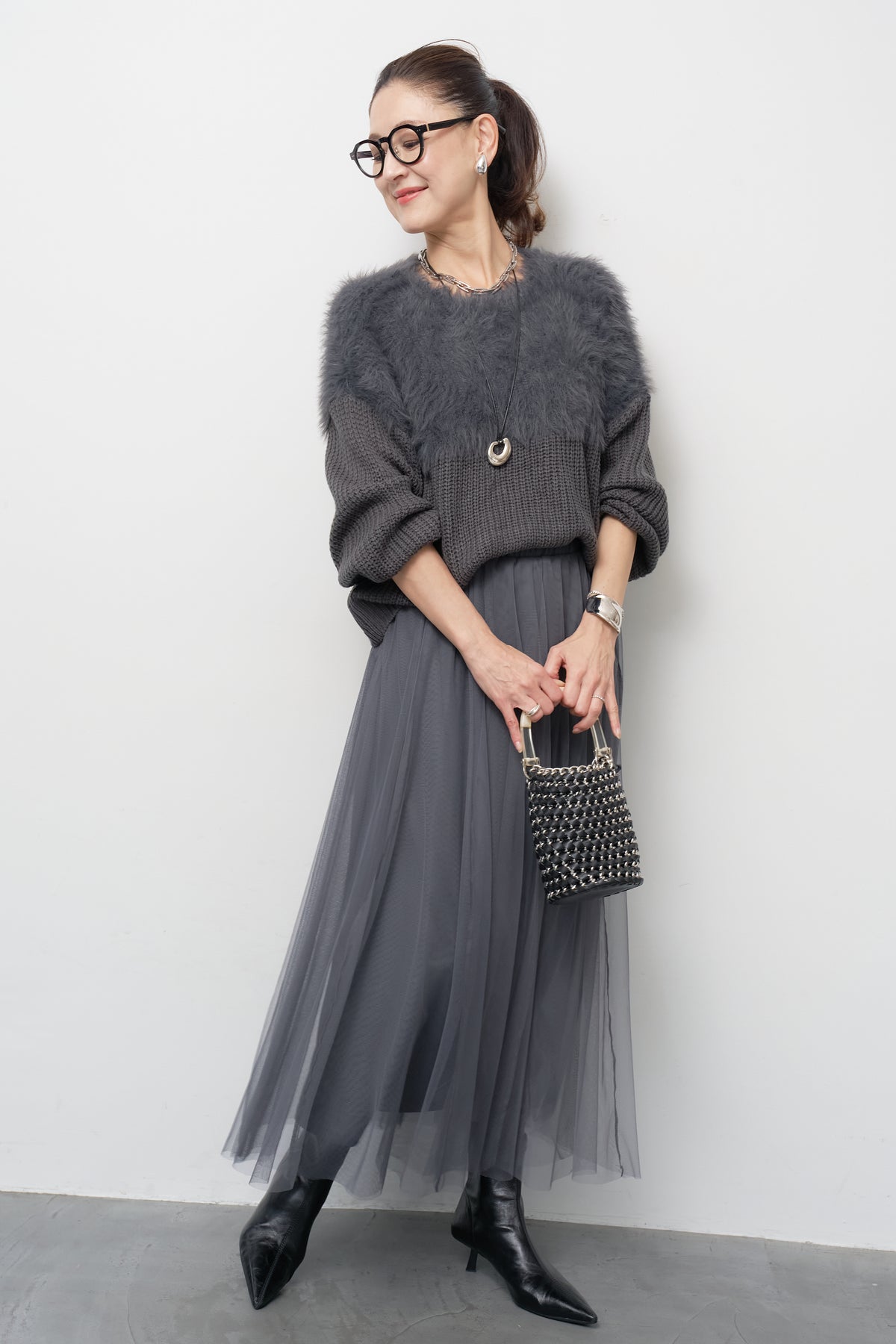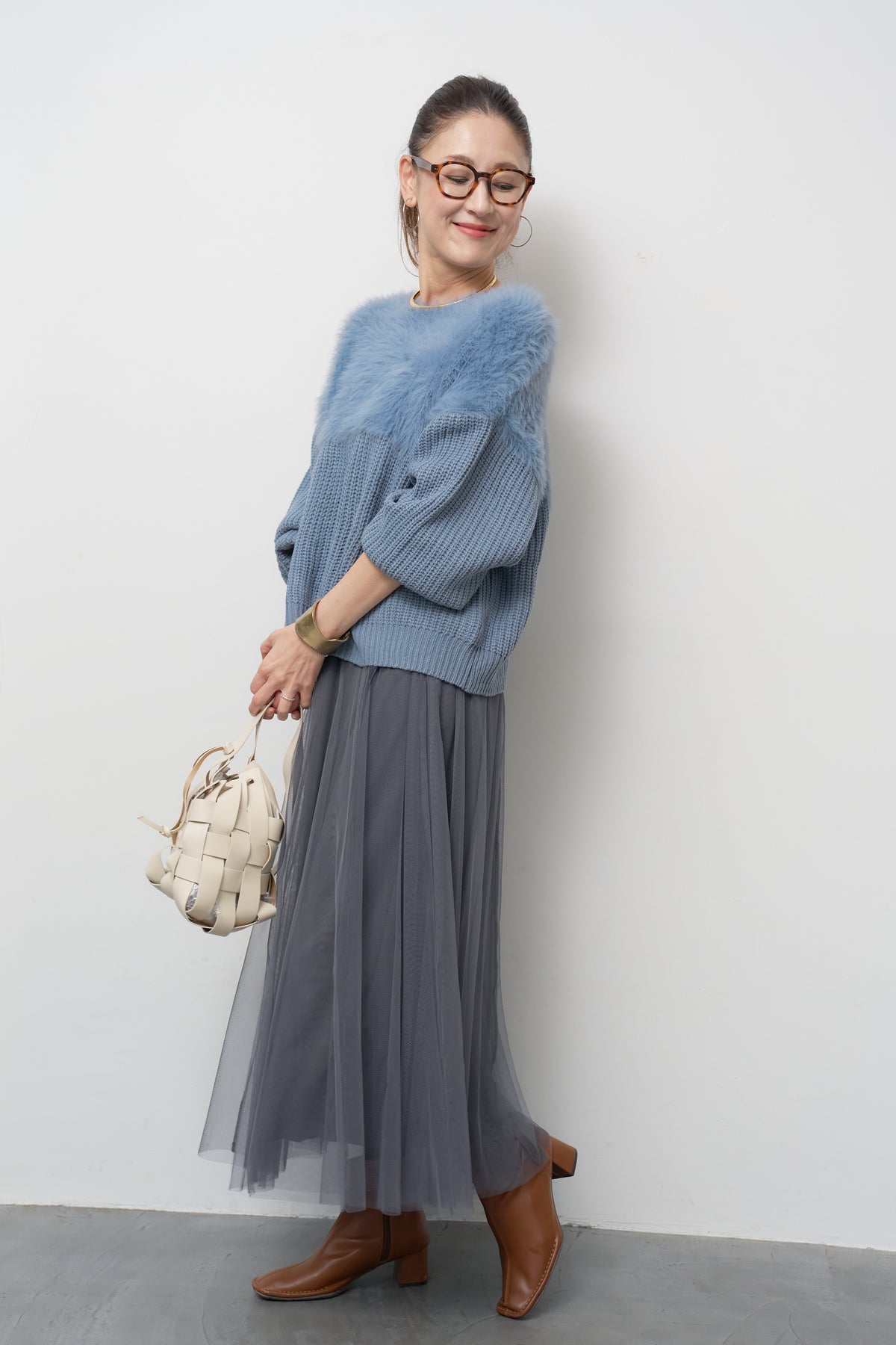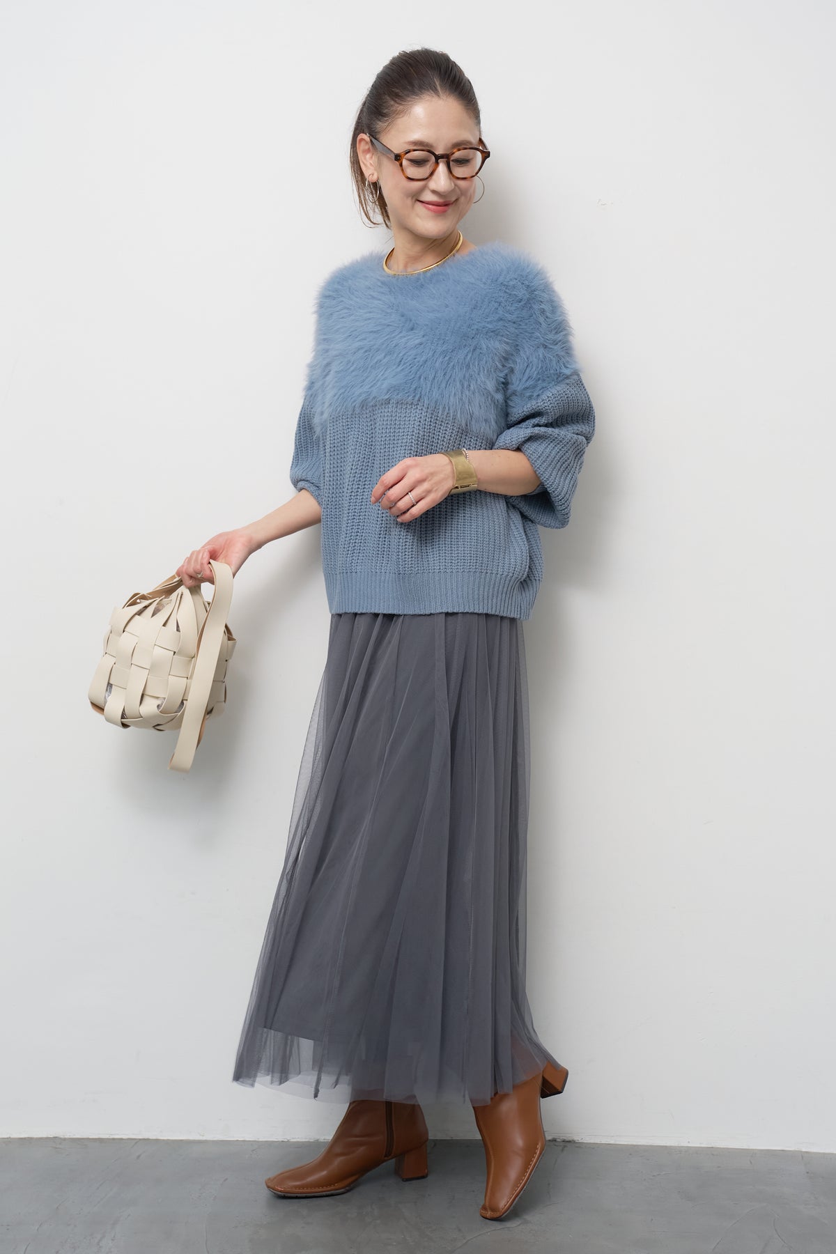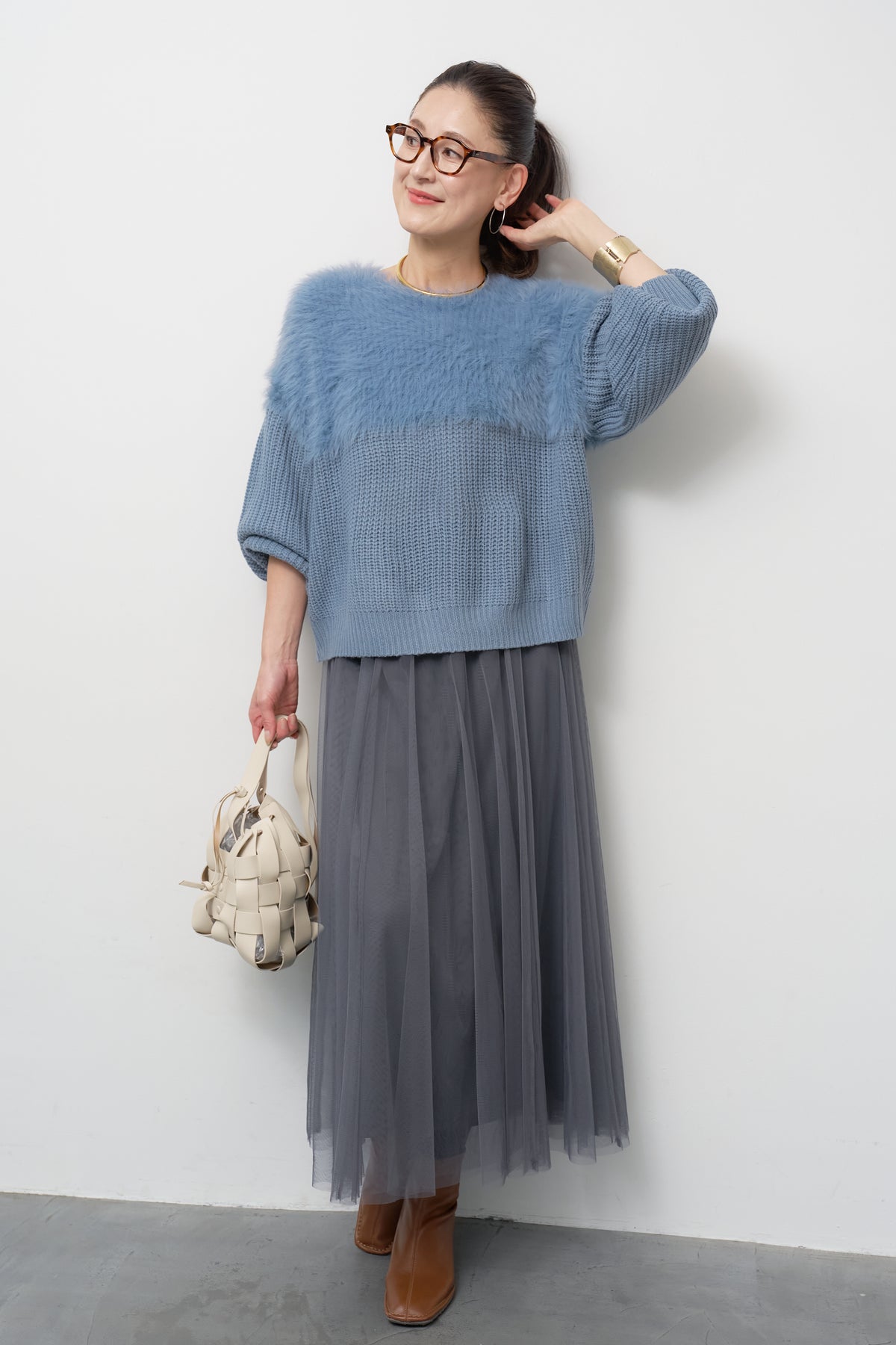 ボリュームスリーブ切替シャギーニット/チュールギャザースカート