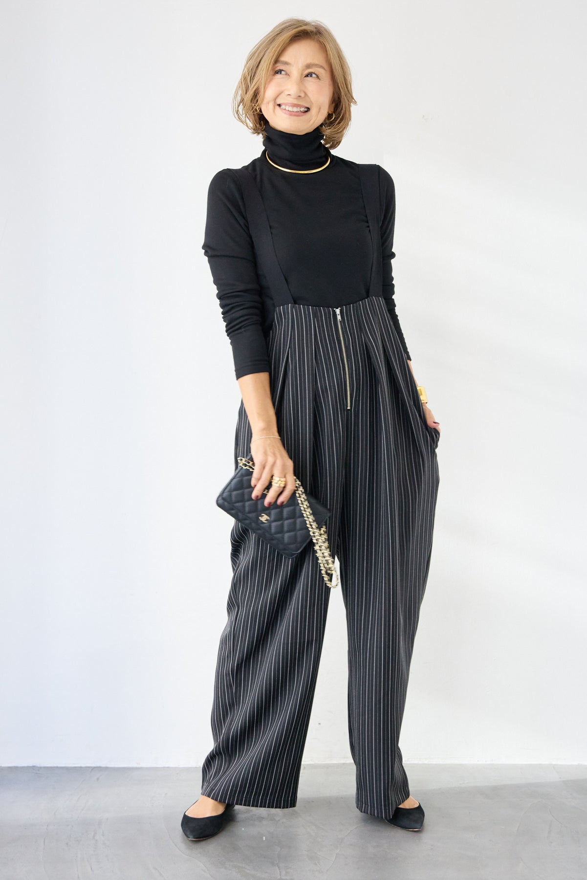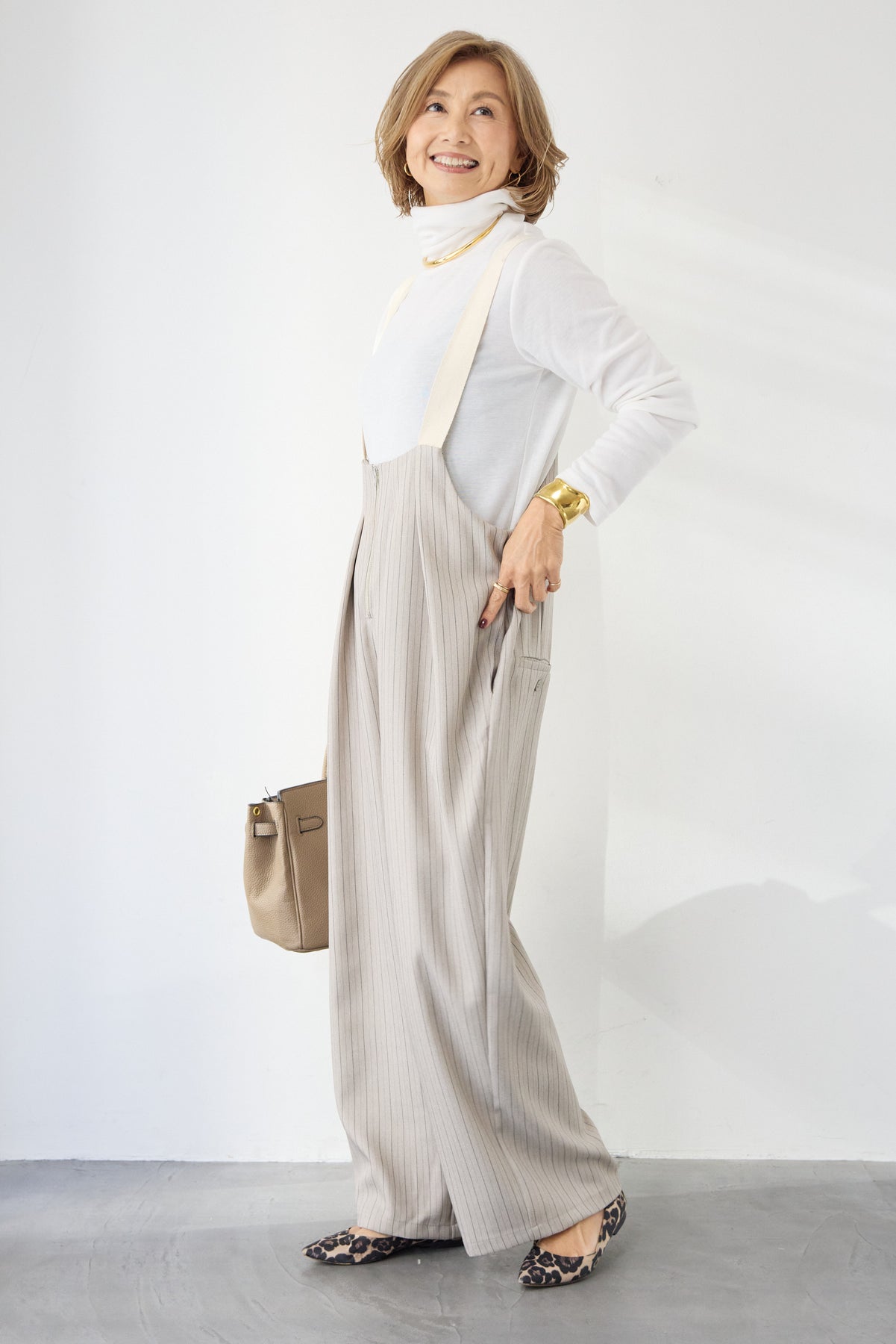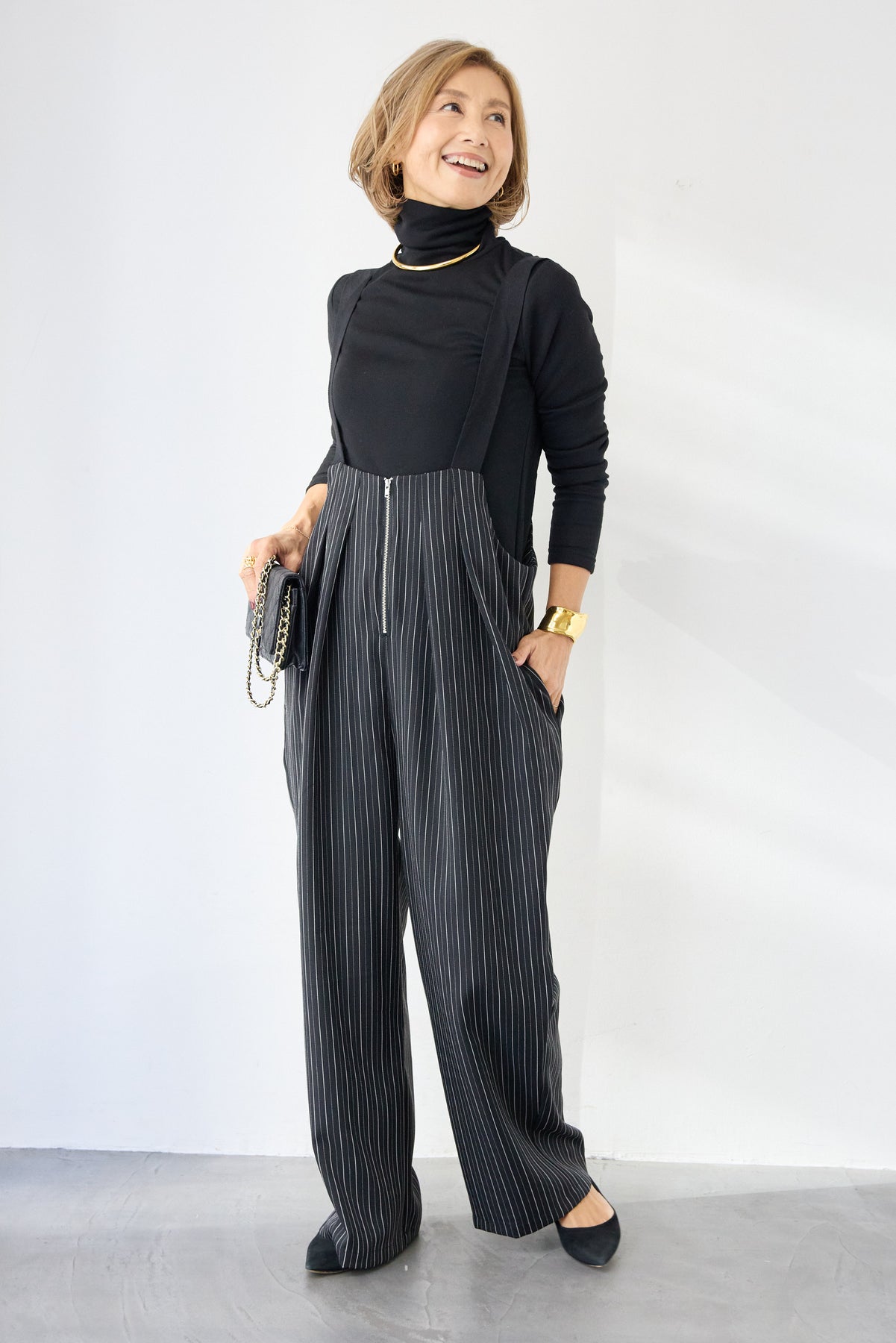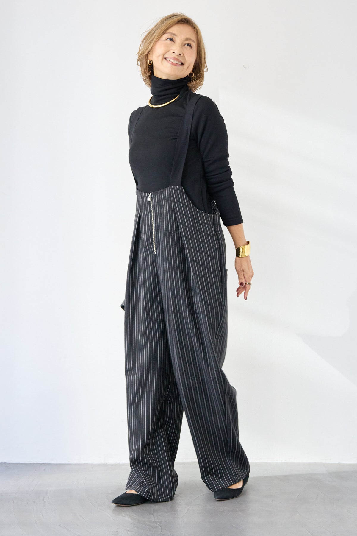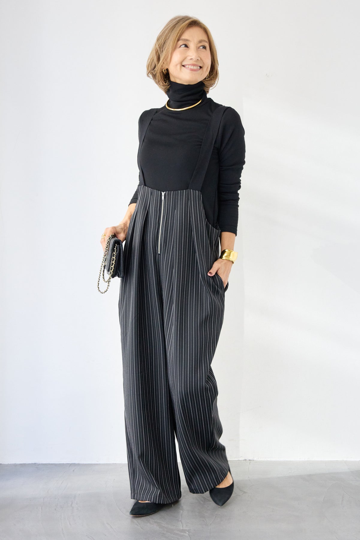 上品さとリラックス感を兼ね備えた、大人のためのストライプサロペット。縦ラインを強調する繊細なストライプ柄が、全体をすっきりと見せつつ、スタイルアップ効果も期待できます。フロントにはツータックを施し、立体感のある美しいシルエットを演出。身体のラインを拾いすぎず、程よくゆとりのある履き心地で、長時間の着用も快適です。肩紐は幅広デザインで安定感があり、バックルで長さ調整が可能。インナー次第で季節を問わず着回せるのも魅力です。バックには実用的なポケット付きで、さりげないアクセントに。フロントファスナー仕様で着脱もスムーズ。 カットソーやタートルネック、ブラウスなど合わせるトップスによって、きれいめにもカジュアルにもスタイリングを楽しめます。