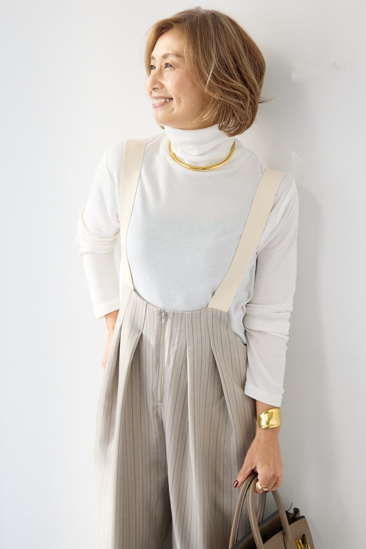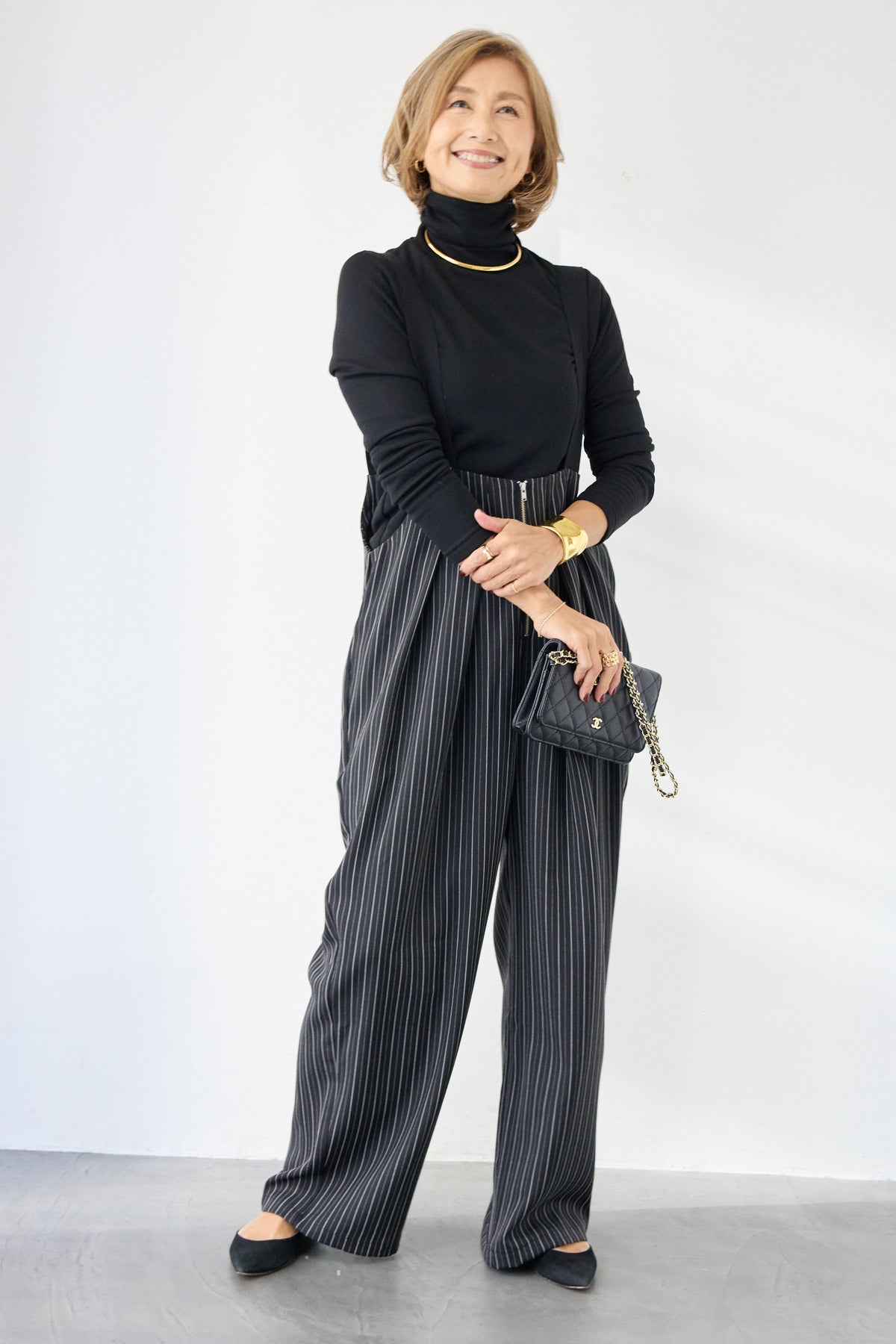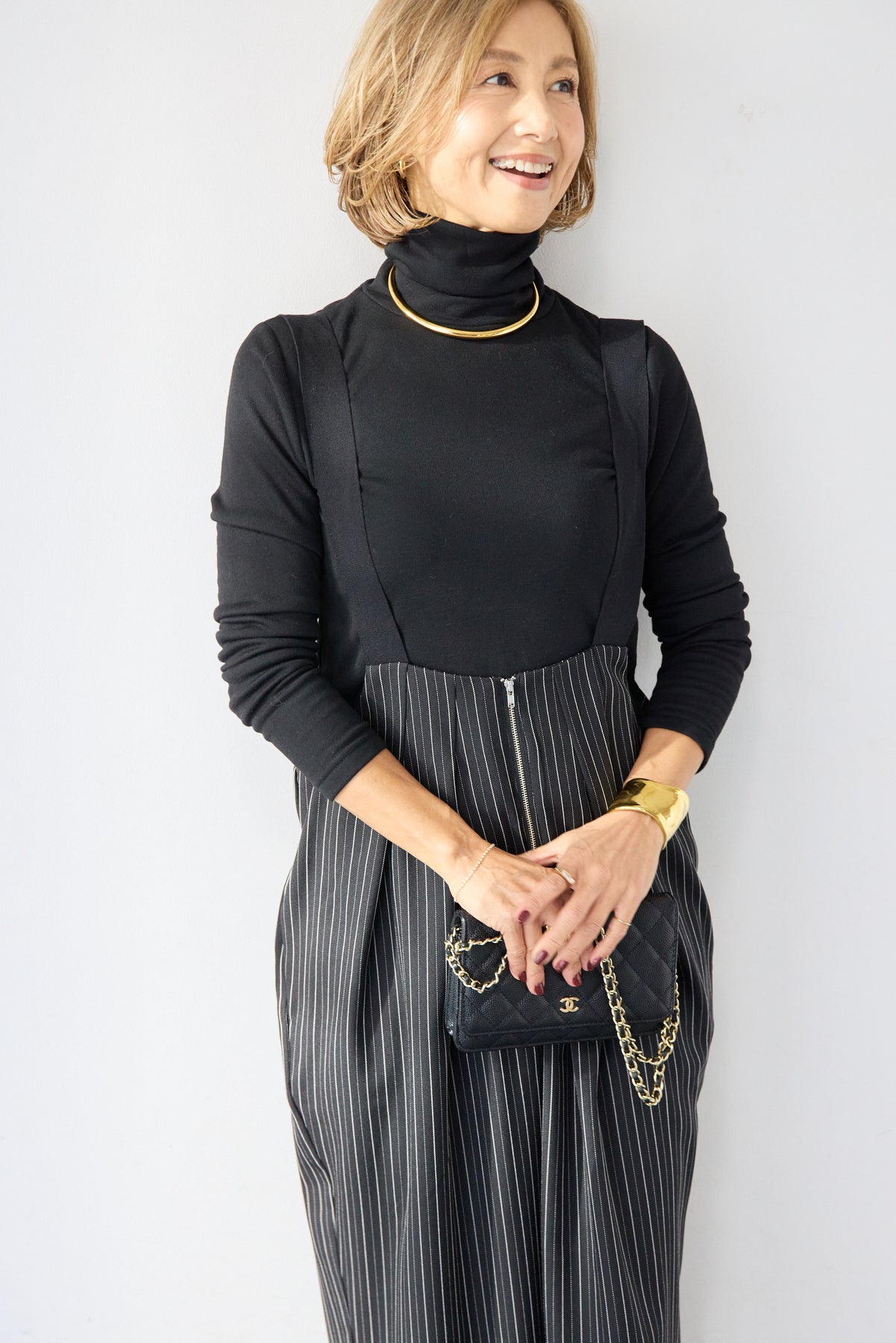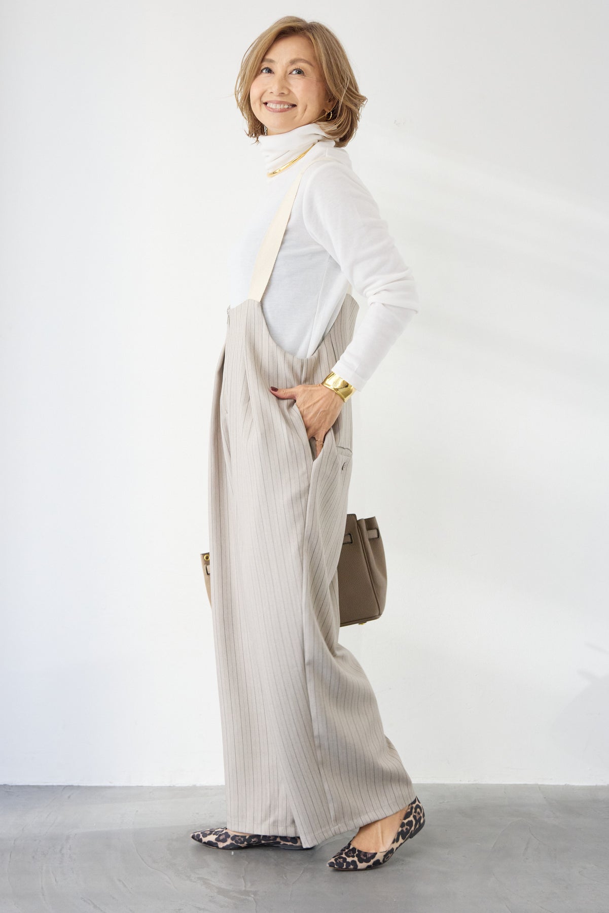 上品さとリラックス感を兼ね備えた、大人のためのストライプサロペット。縦ラインを強調する繊細なストライプ柄が、全体をすっきりと見せつつ、スタイルアップ効果も期待できます。フロントにはツータックを施し、立体感のある美しいシルエットを演出。身体のラインを拾いすぎず、程よくゆとりのある履き心地で、長時間の着用も快適です。肩紐は幅広デザインで安定感があり、バックルで長さ調整が可能。インナー次第で季節を問わず着回せるのも魅力です。バックには実用的なポケット付きで、さりげないアクセントに。フロントファスナー仕様で着脱もスムーズ。 カットソーやタートルネック、ブラウスなど合わせるトップスによって、きれいめにもカジュアルにもスタイリングを楽しめます。