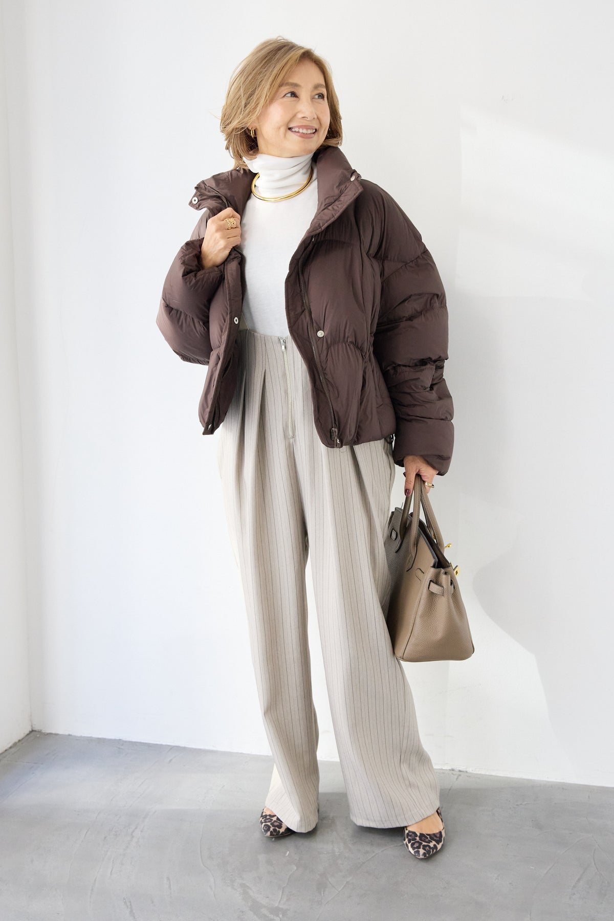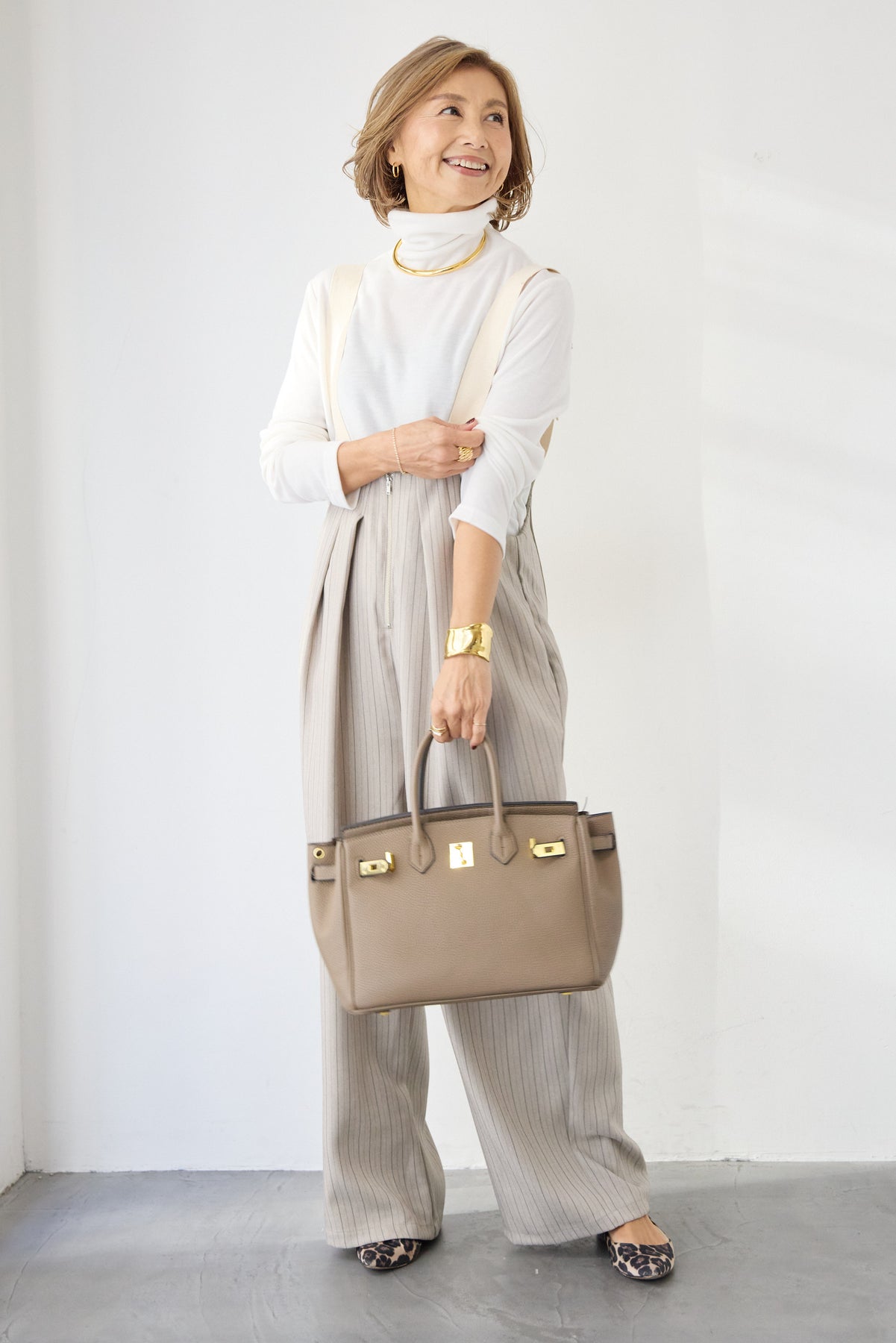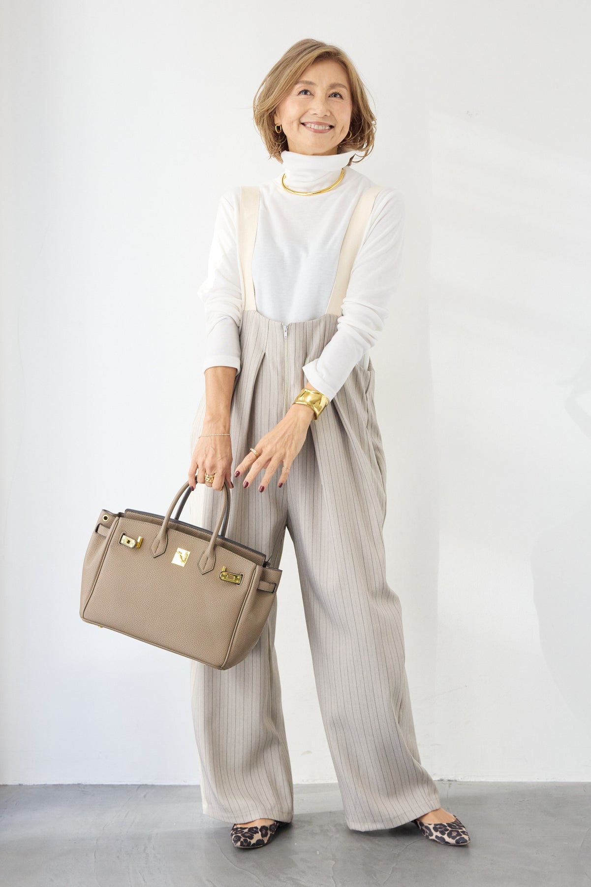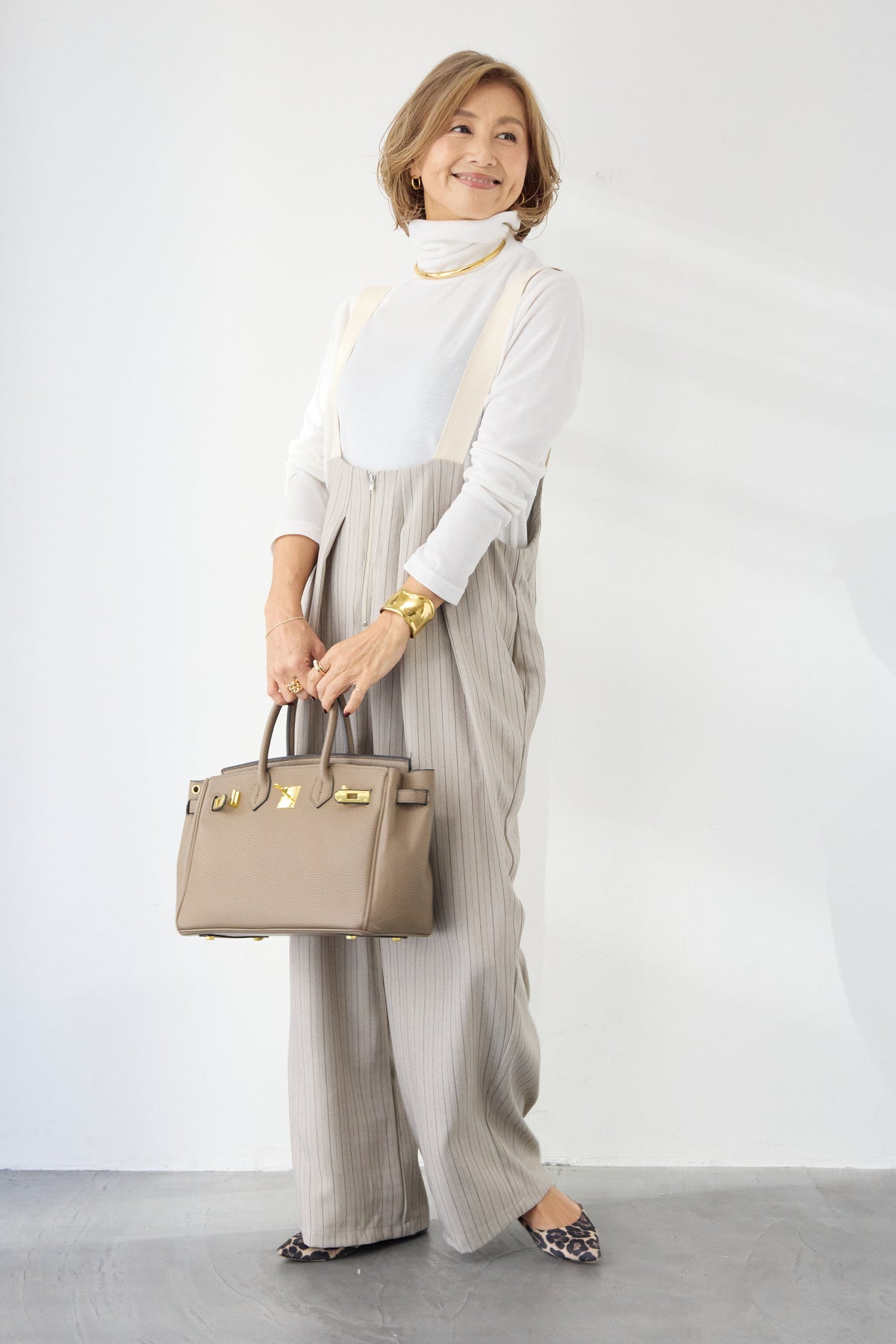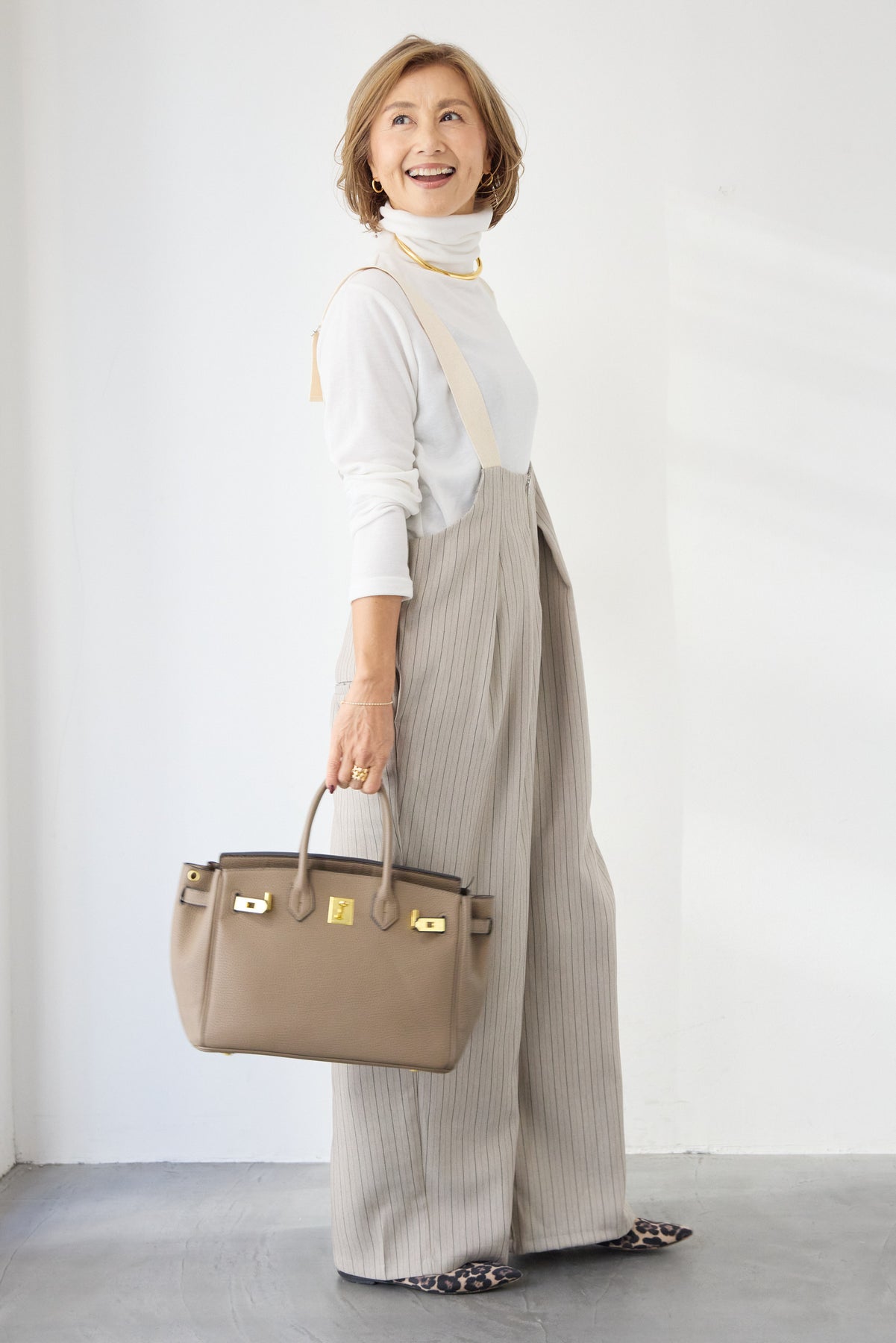上品さとリラックス感を兼ね備えた、大人のためのストライプサロペット。縦ラインを強調する繊細なストライプ柄が、全体をすっきりと見せつつ、スタイルアップ効果も期待できます。フロントにはツータックを施し、立体感のある美しいシルエットを演出。身体のラインを拾いすぎず、程よくゆとりのある履き心地で、長時間の着用も快適です。肩紐は幅広デザインで安定感があり、バックルで長さ調整が可能。インナー次第で季節を問わず着回せるのも魅力です。バックには実用的なポケット付きで、さりげないアクセントに。フロントファスナー仕様で着脱もスムーズ。 カットソーやタートルネック、ブラウスなど合わせるトップスによって、きれいめにもカジュアルにもスタイリングを楽しめます。