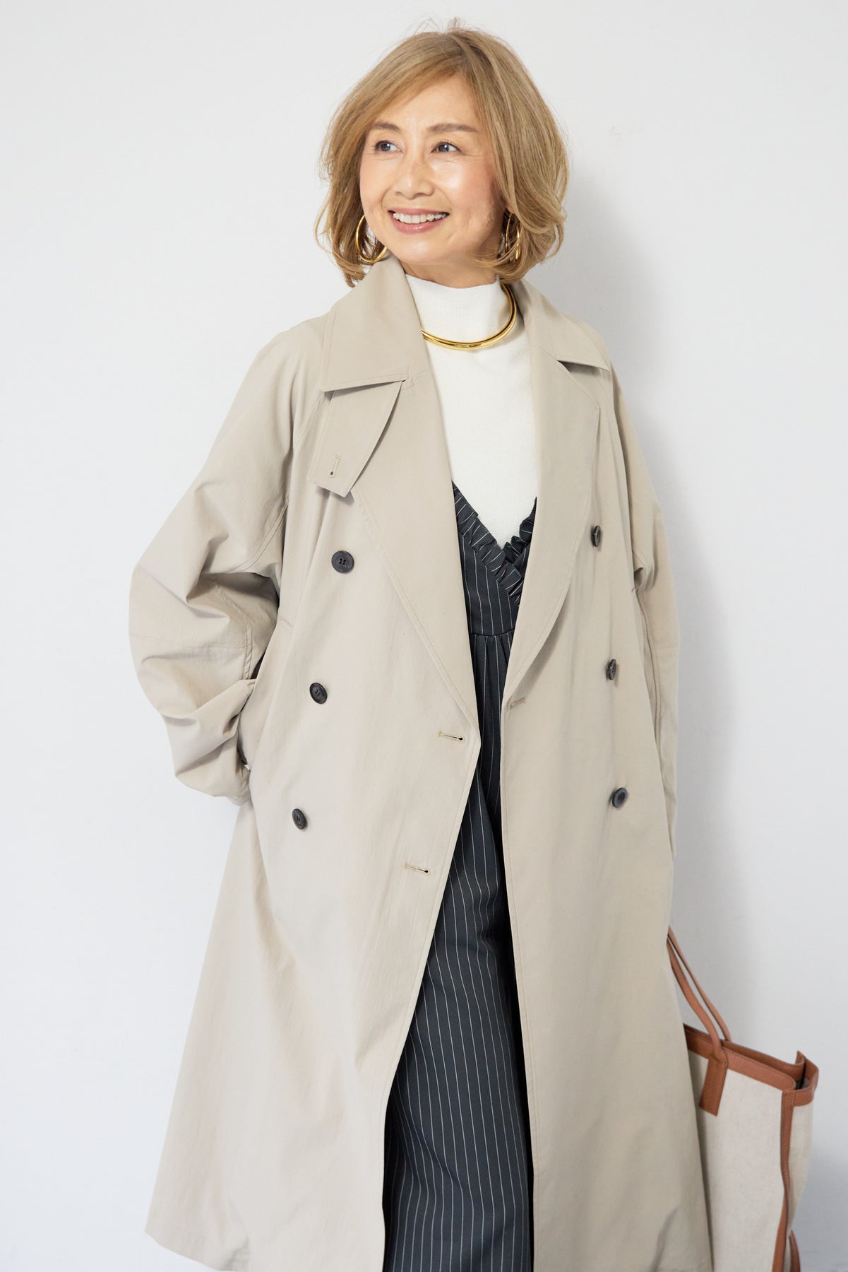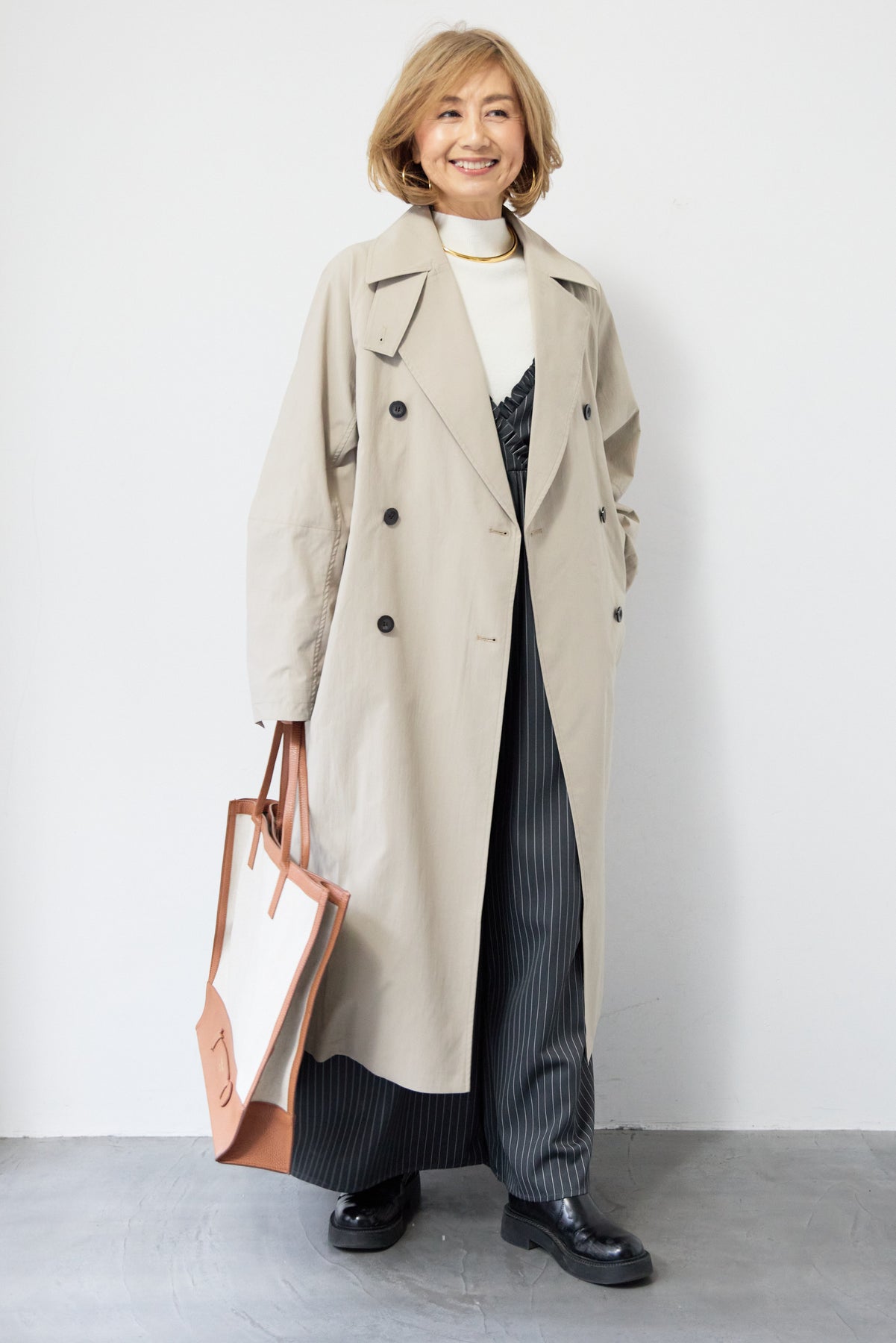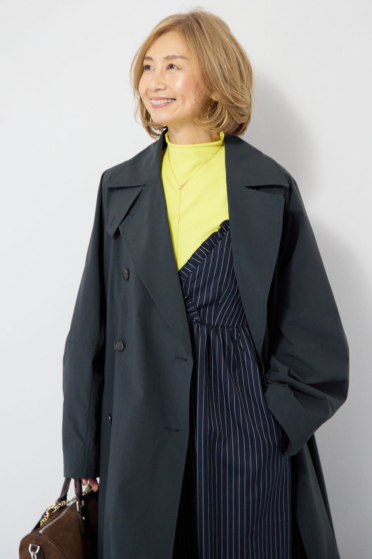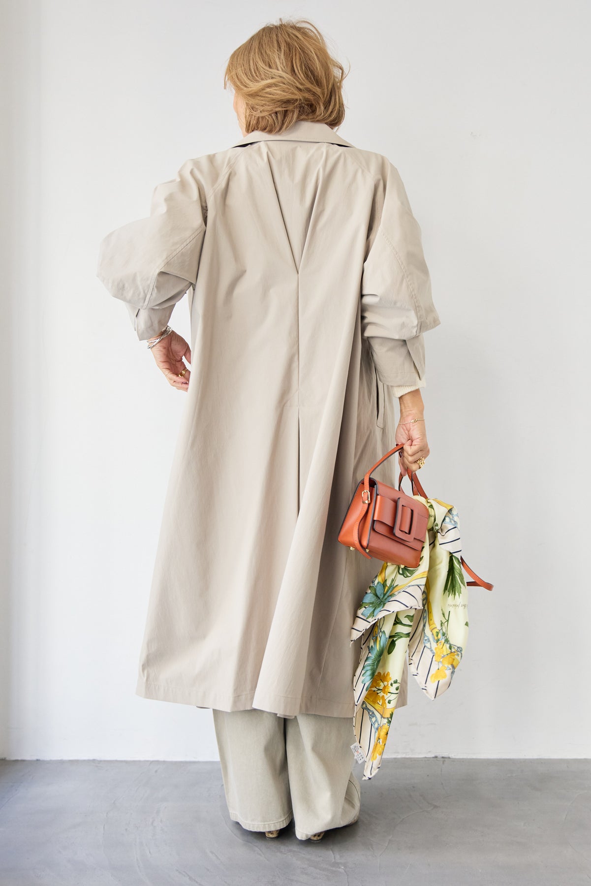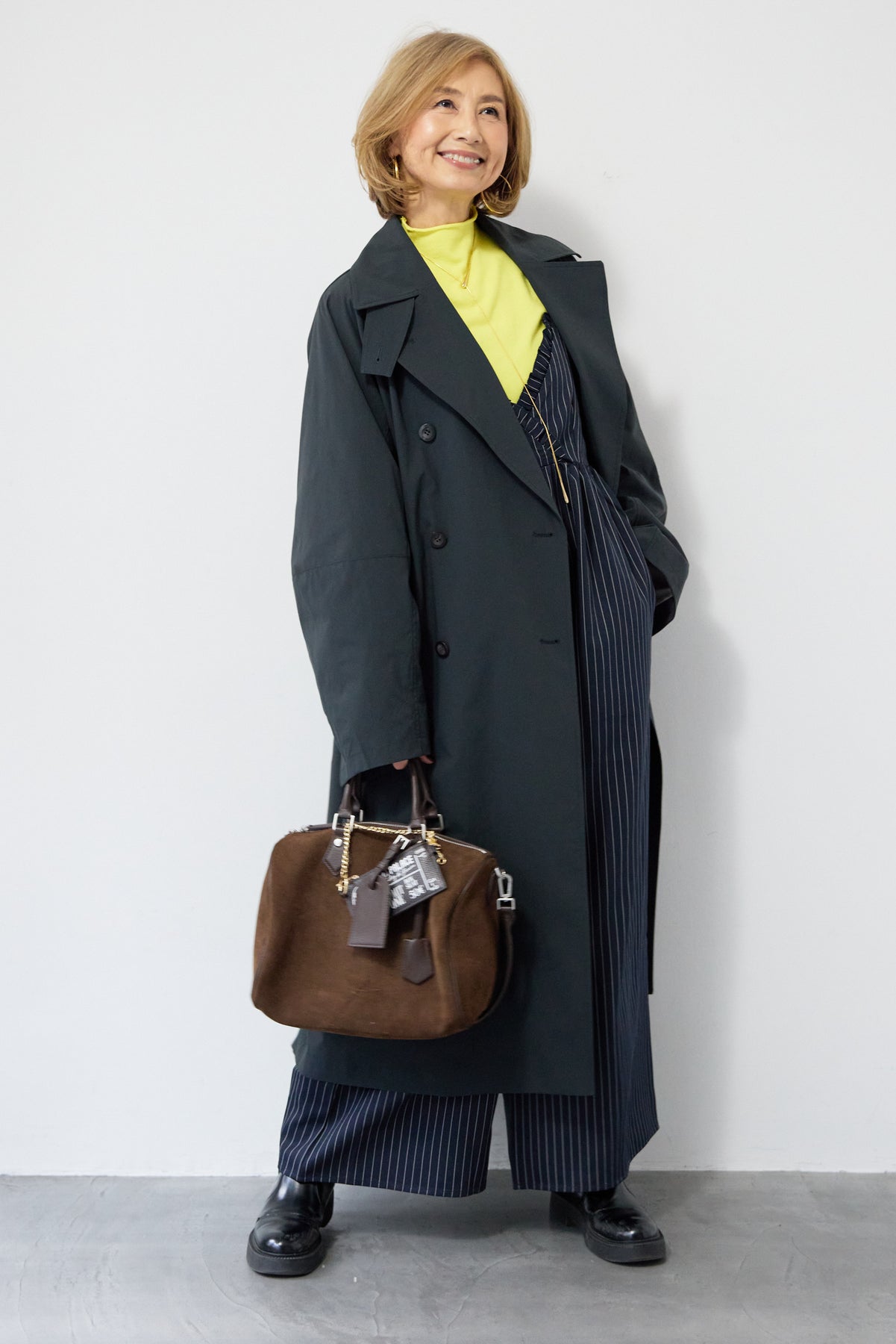 端正なフロントに対し、背面の立体的な切り替えが洗練された個性を放つ一着。大人の品格を保ちつつ、後ろ姿でさりげない遊び心を演出します。 身体を包むビッグシルエットとハリのある素材が、体型を自然にカバー。襟を立てれば都会的なスタンドカラー、袖口のゆとりで厚手のインナーもすっきりと着こなせます。 日常から少し背筋を伸ばしたい日まで、大人の日常に寄り添い、春の装いを軽やかに彩ります。