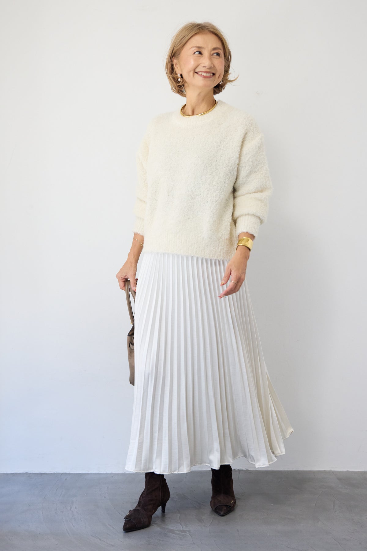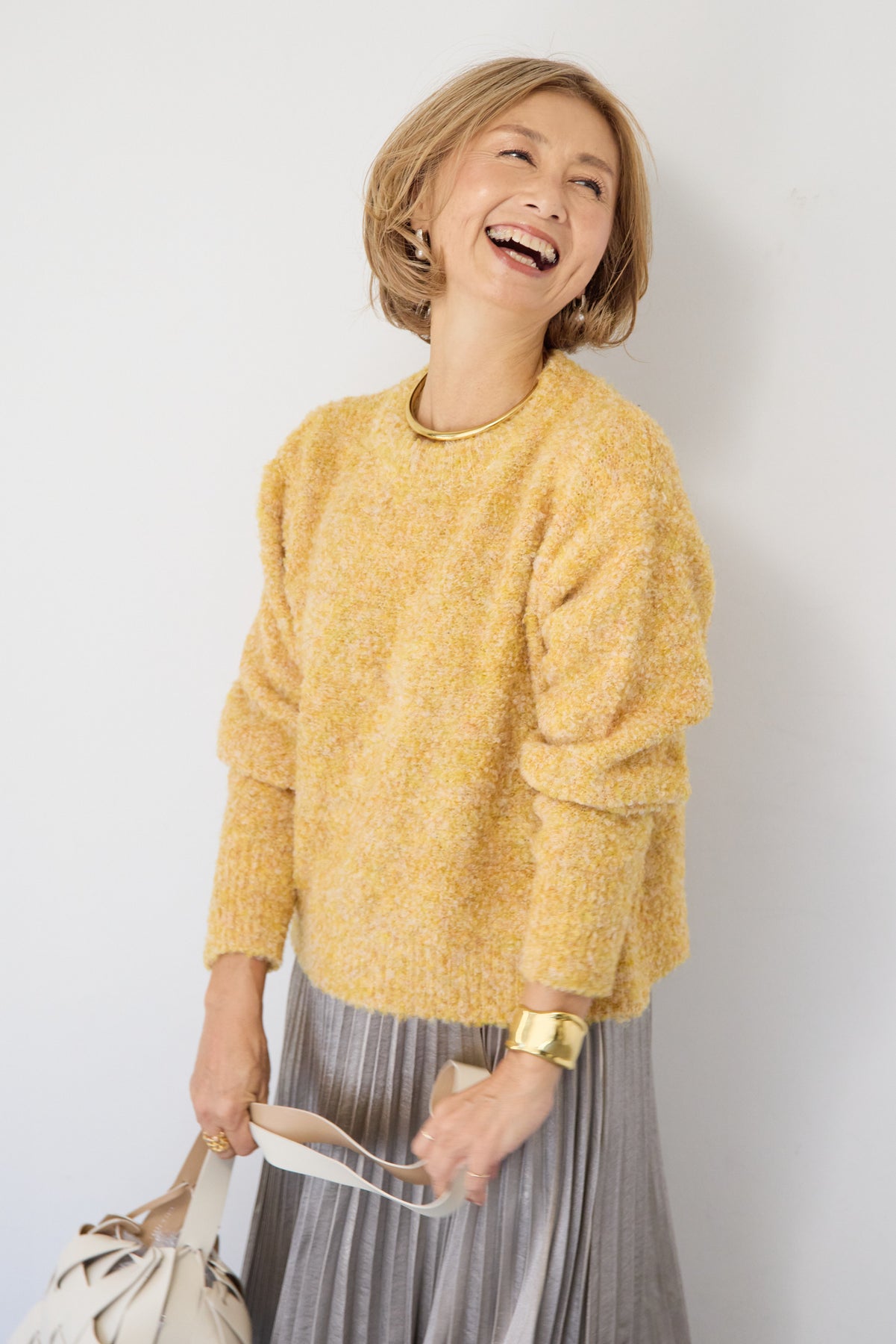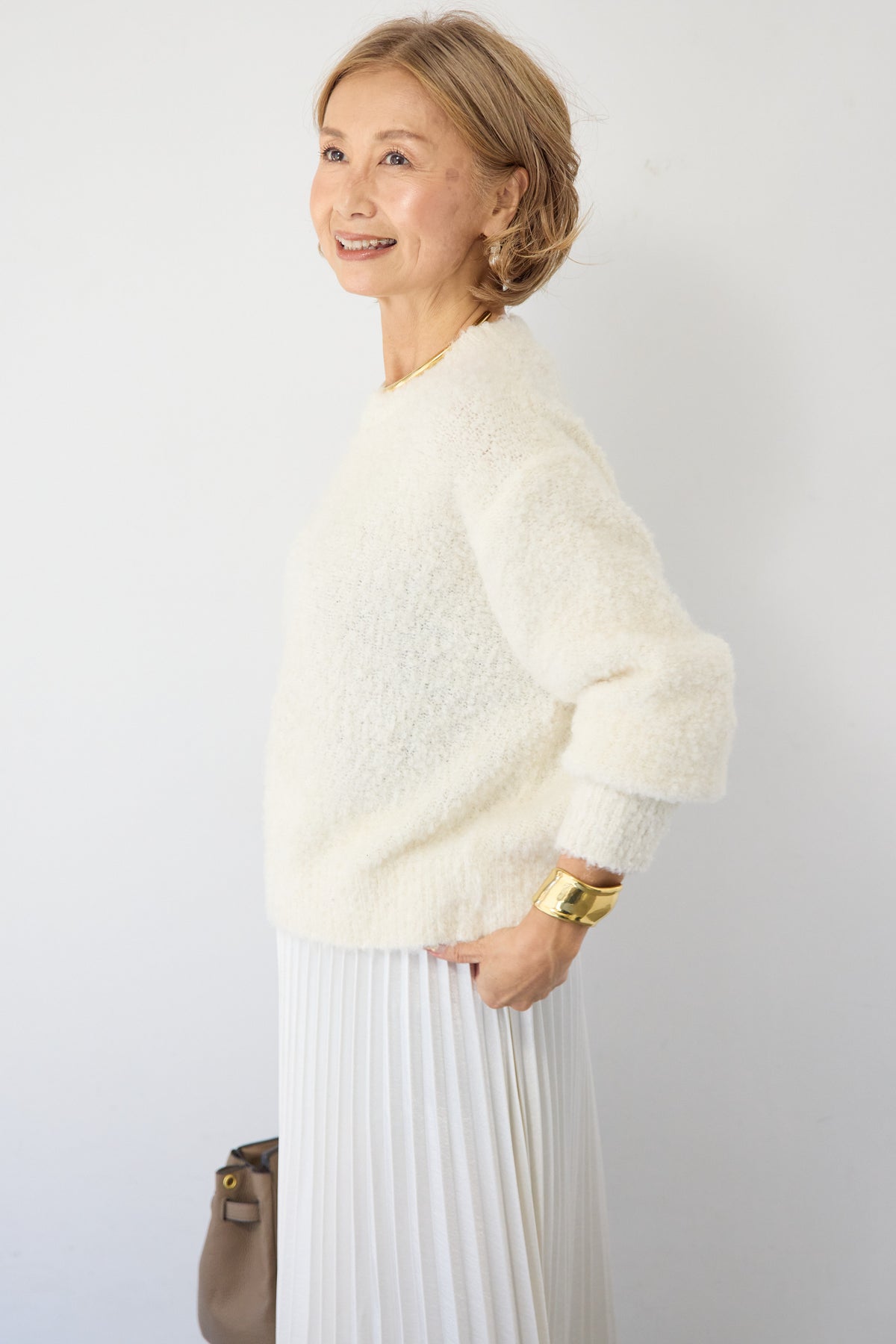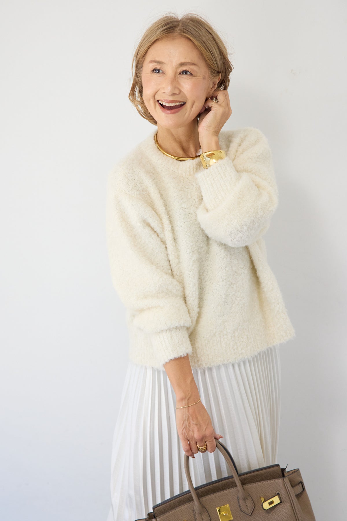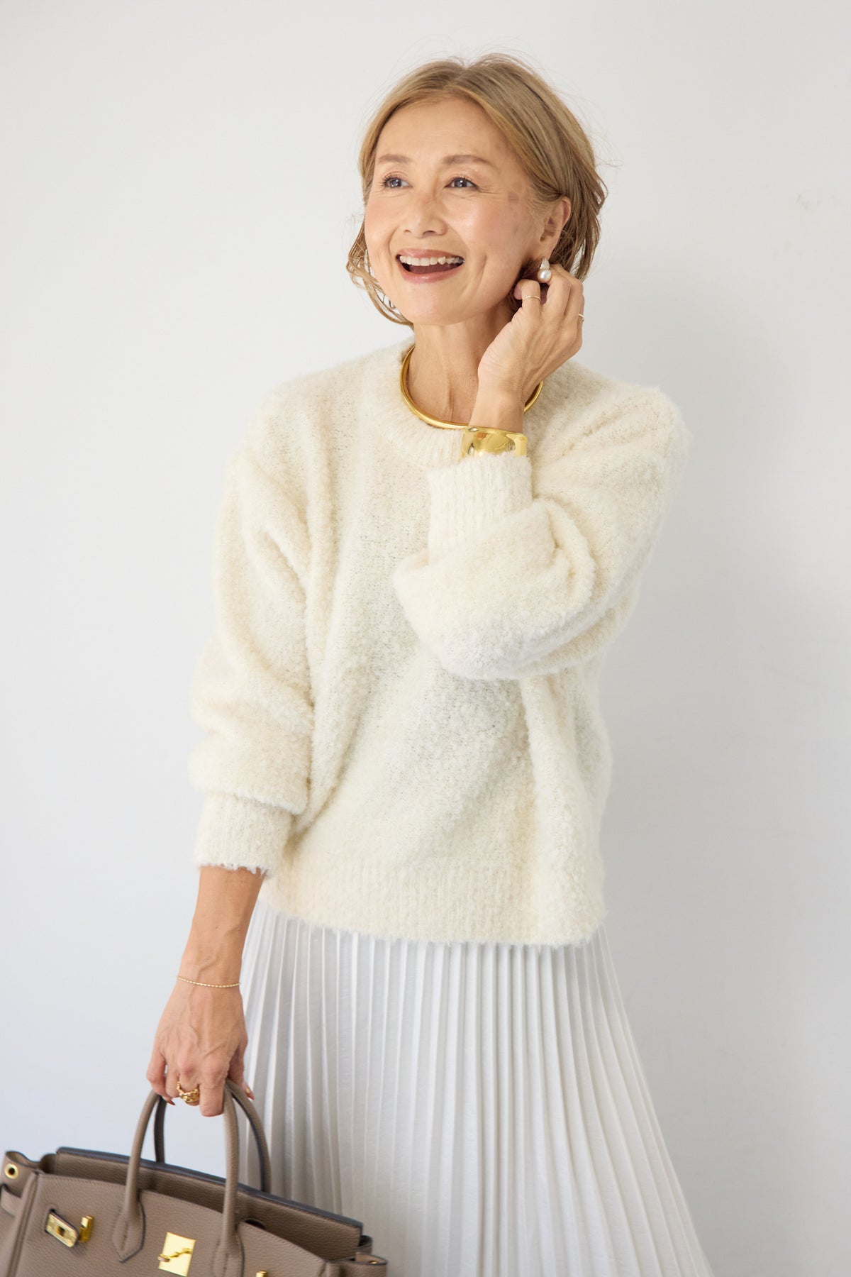 柔らかなシャギー素材が特徴のニットプルオーバー。ふわふわとした質感で、着心地も抜群。リラックス感がありながらも、シンプルで洗練されたデザインが魅力的です。ボトムスを選ばず、カジュアルにもエレガントにも対応できる優れたアイテムです。