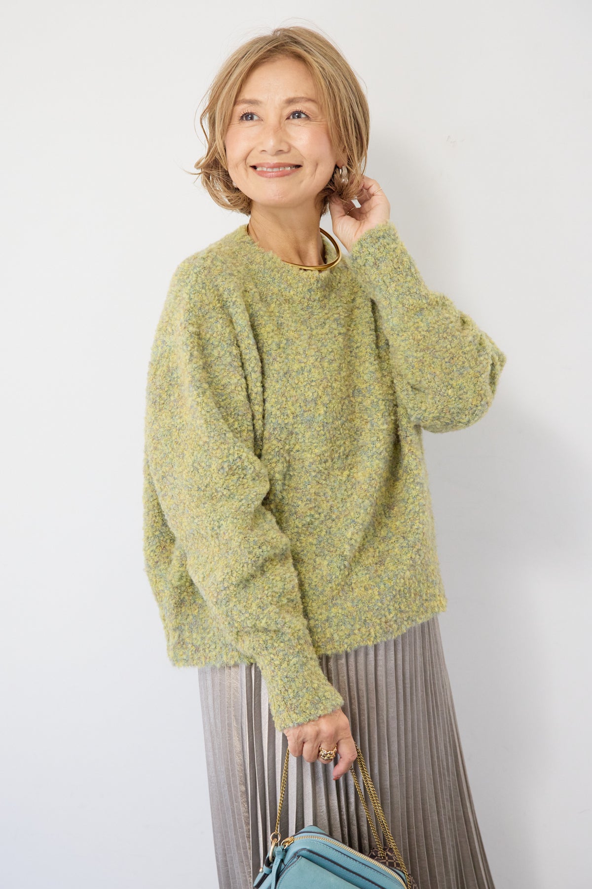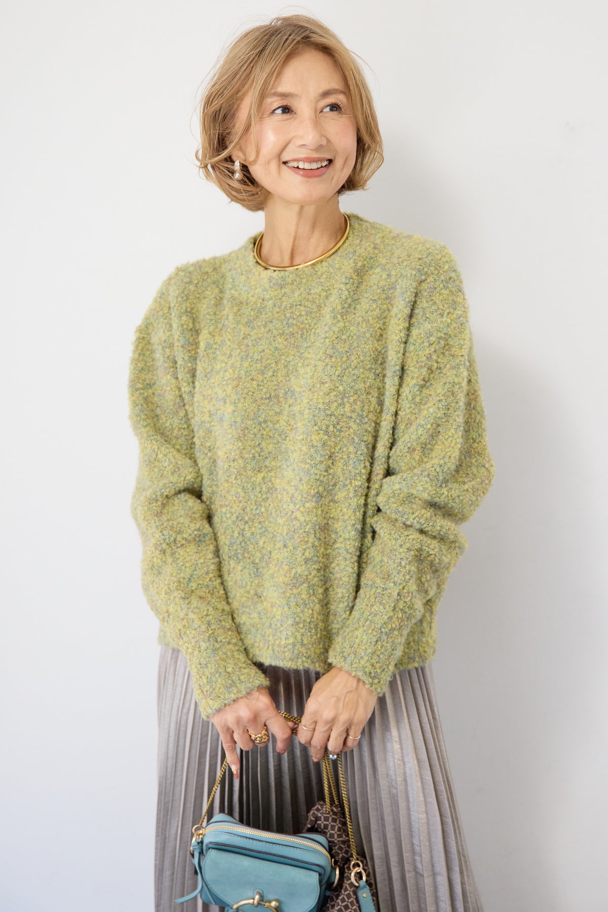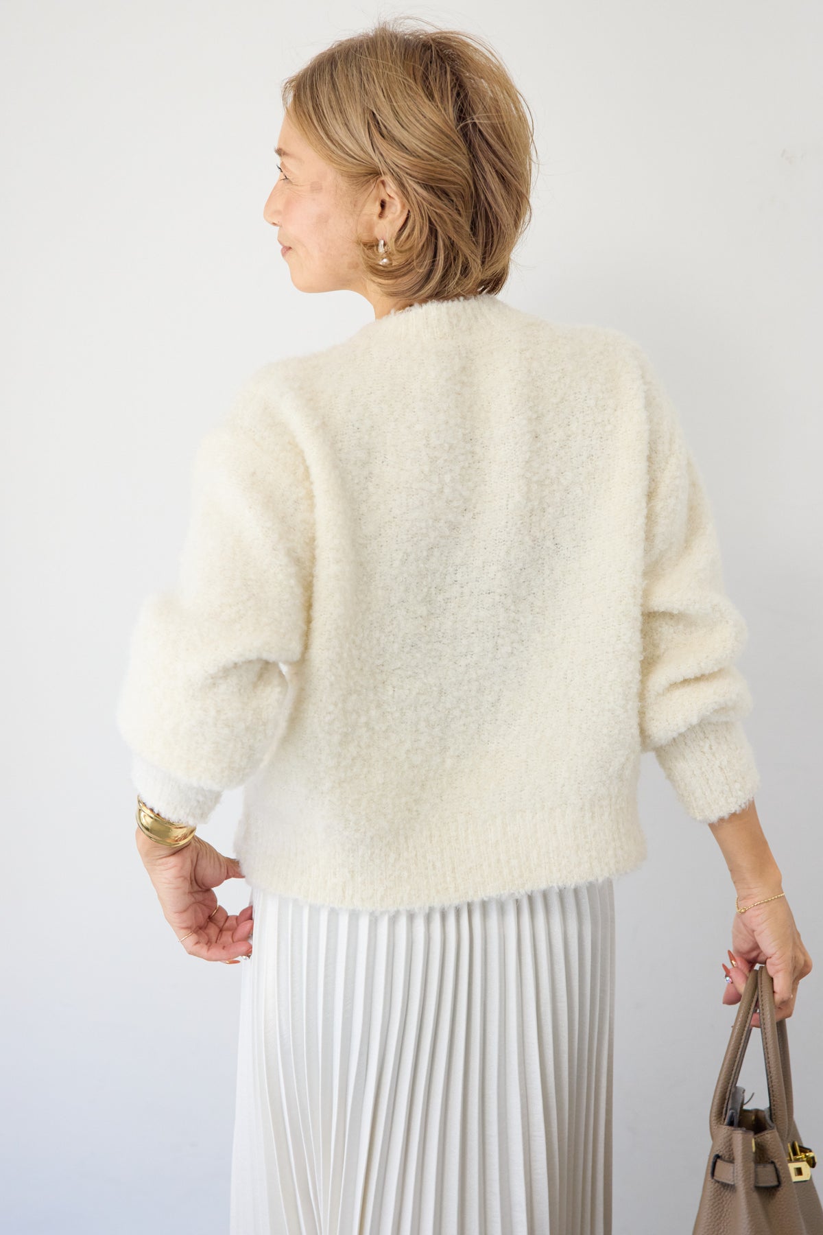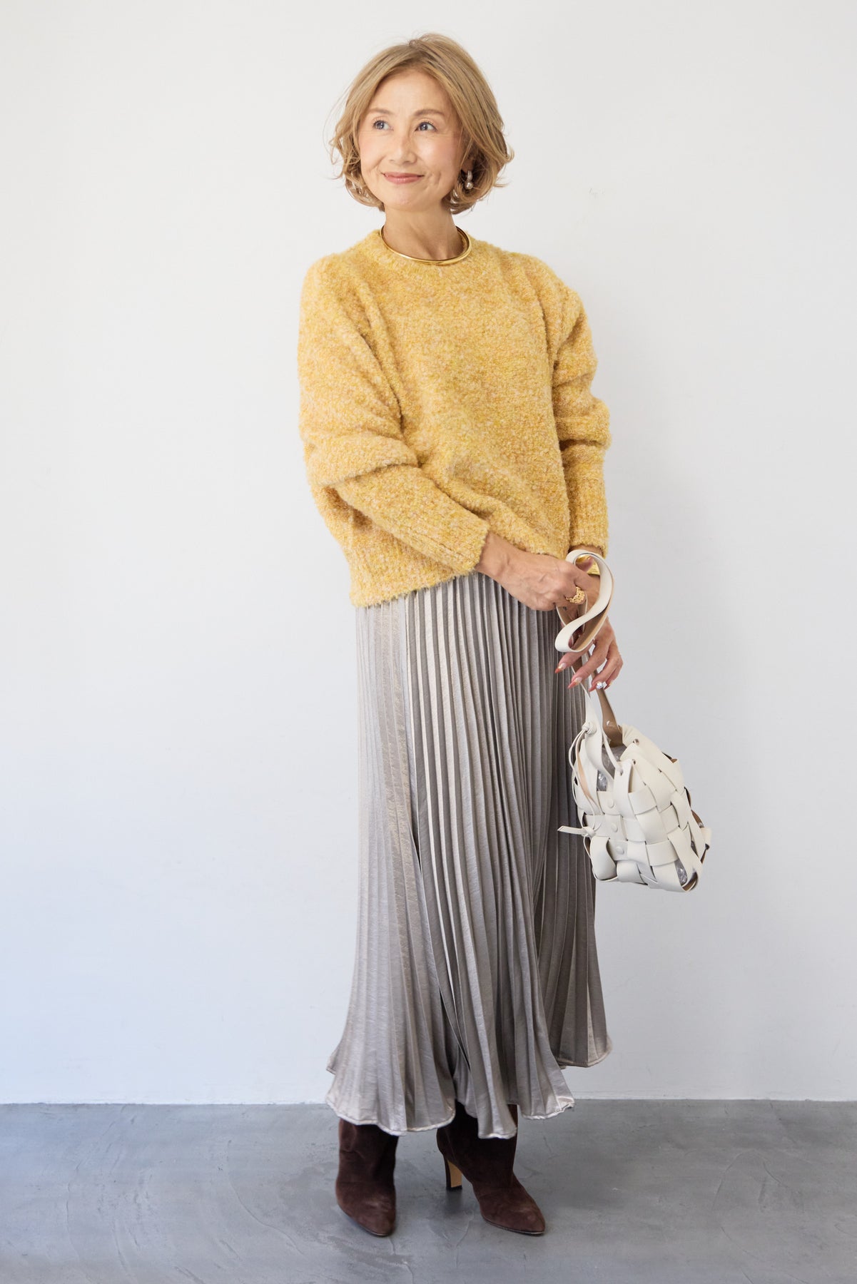 柔らかなシャギー素材が特徴のニットプルオーバー。ふわふわとした質感で、着心地も抜群。リラックス感がありながらも、シンプルで洗練されたデザインが魅力的です。ボトムスを選ばず、カジュアルにもエレガントにも対応できる優れたアイテムです。