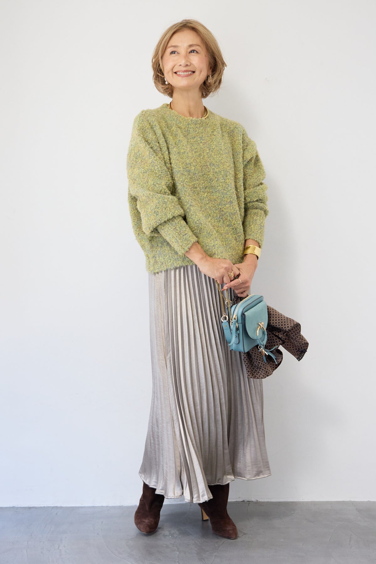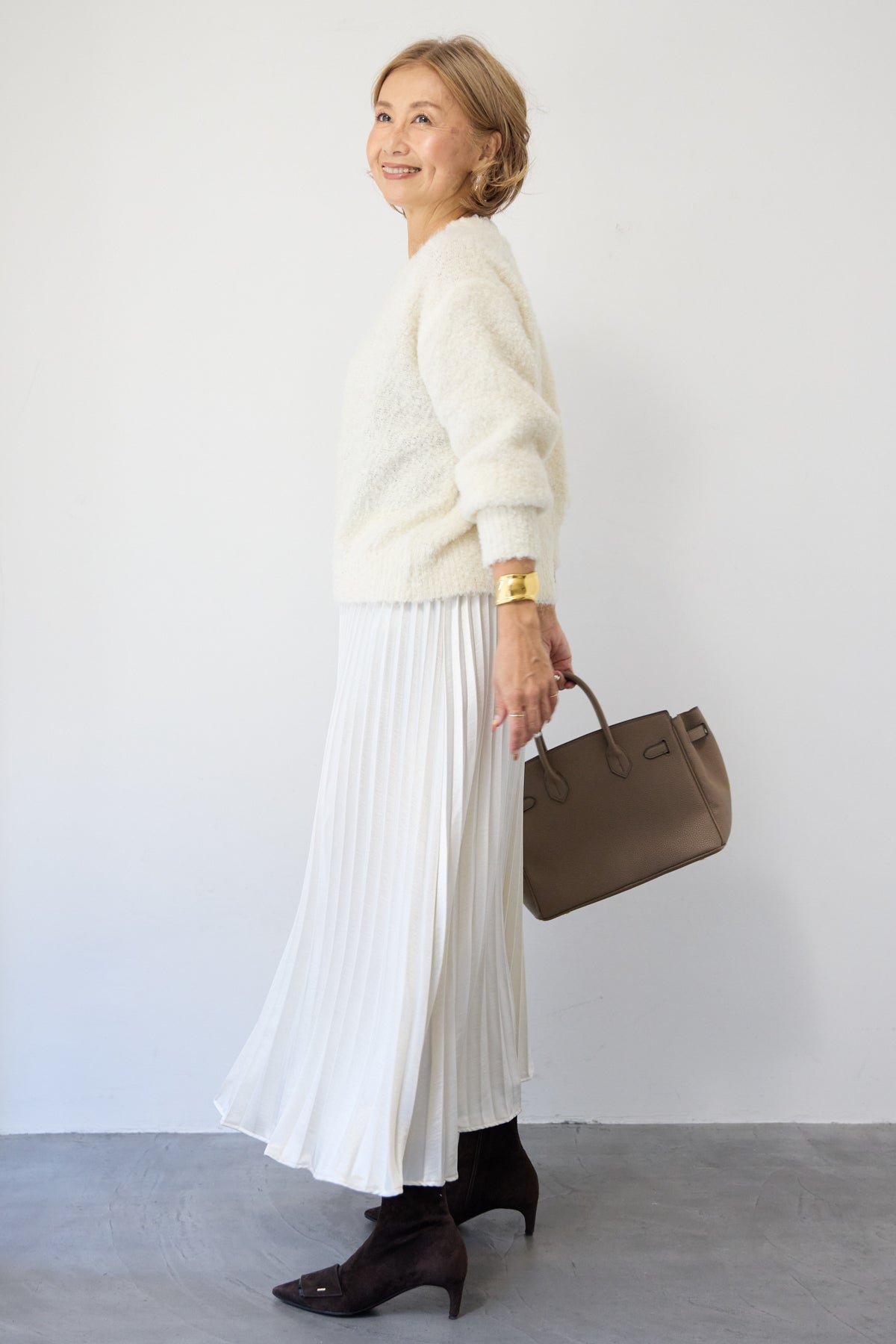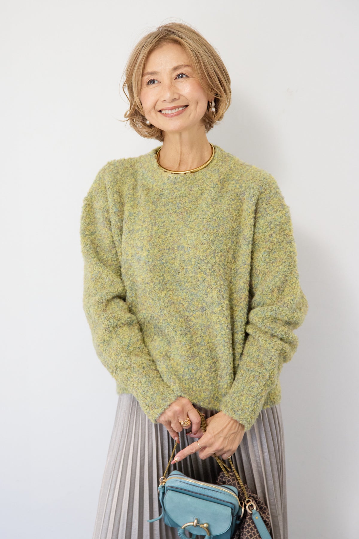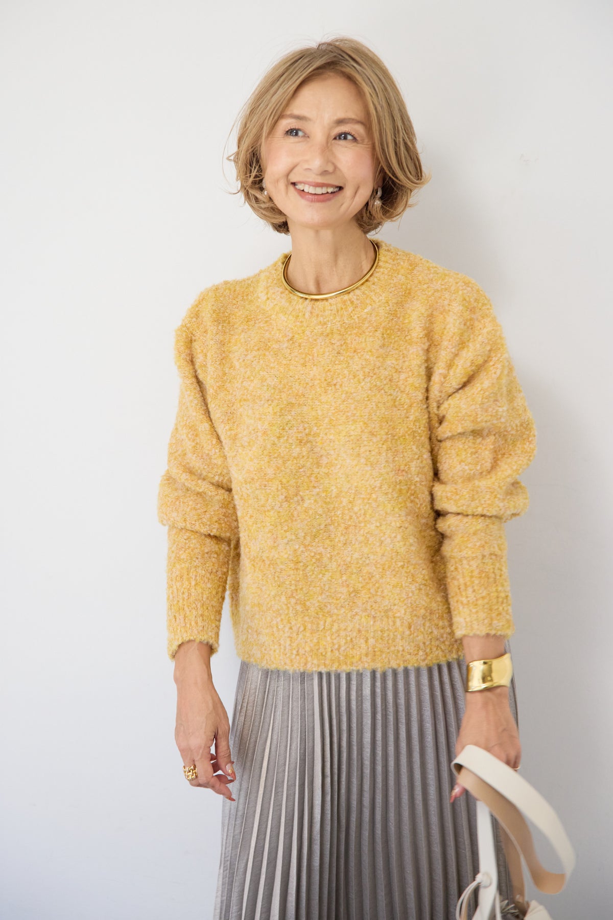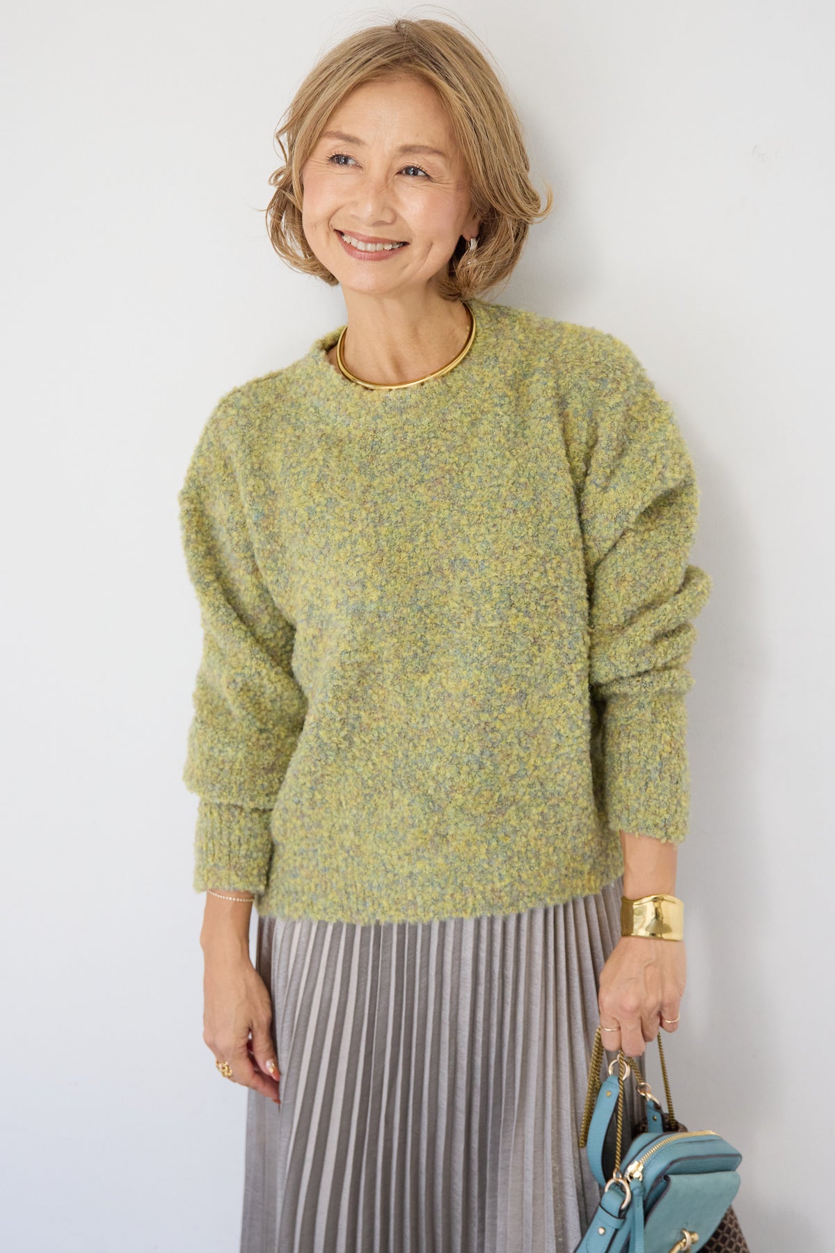 柔らかなシャギー素材が特徴のニットプルオーバー。ふわふわとした質感で、着心地も抜群。リラックス感がありながらも、シンプルで洗練されたデザインが魅力的です。ボトムスを選ばず、カジュアルにもエレガントにも対応できる優れたアイテムです。