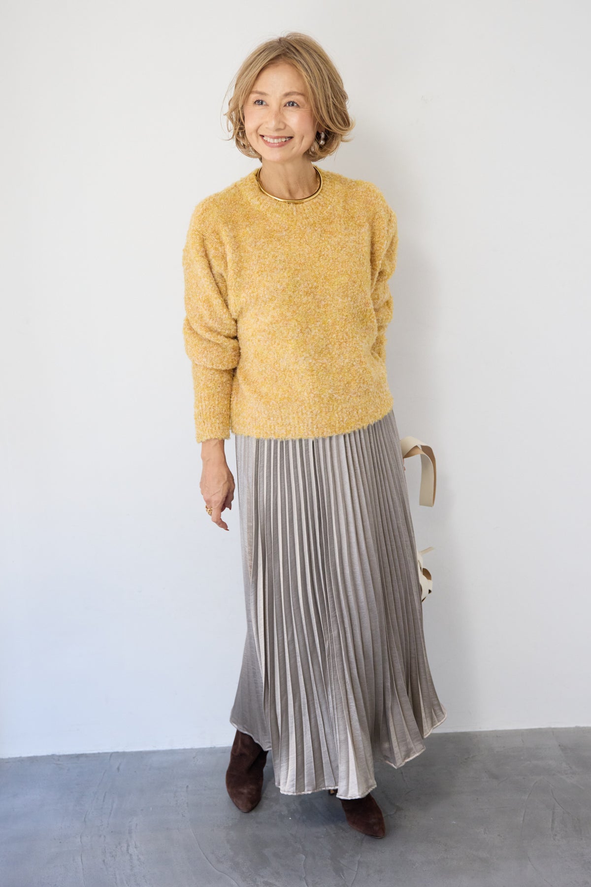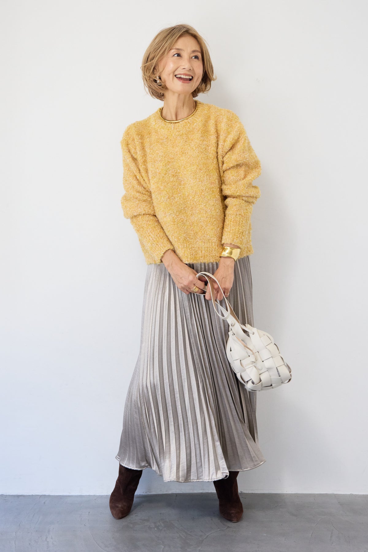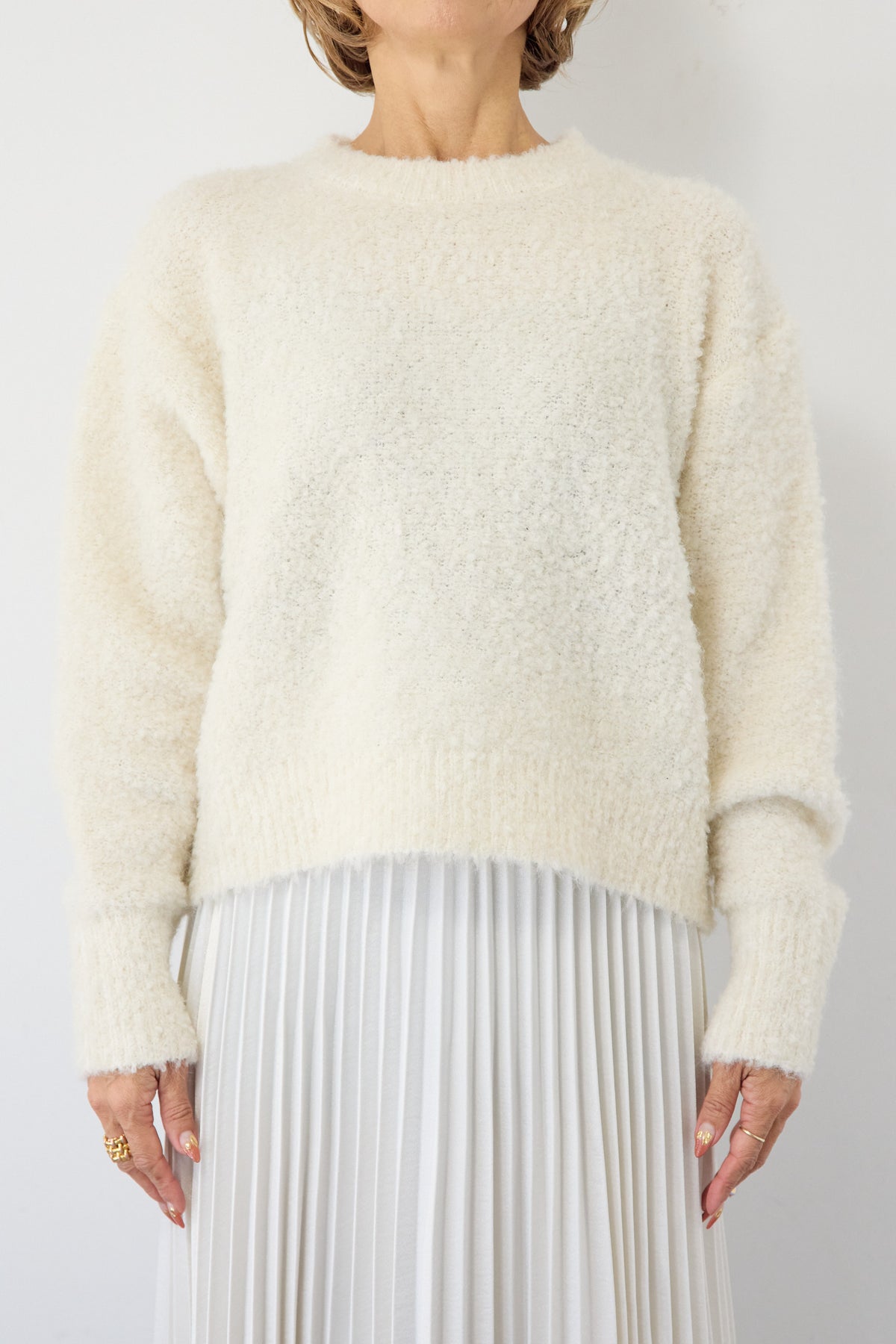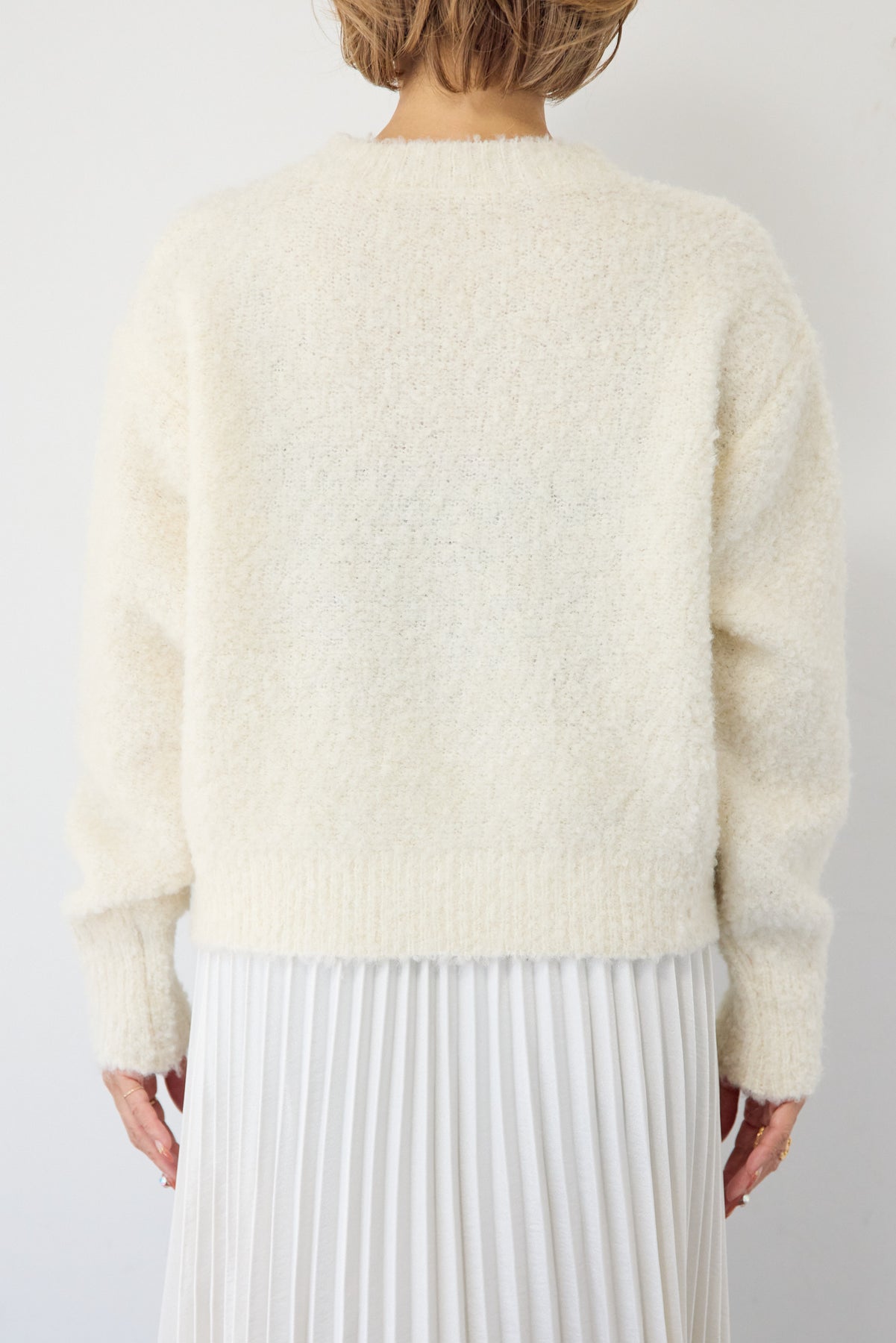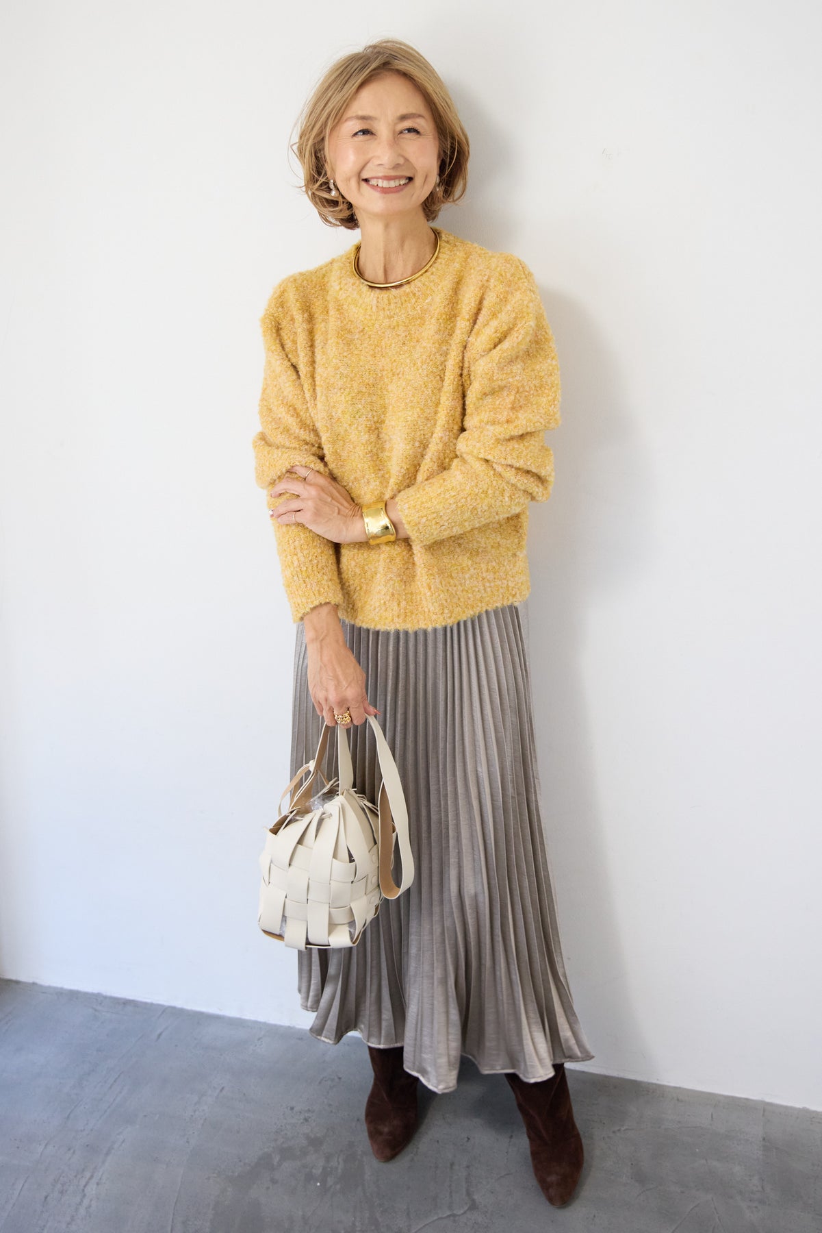 柔らかなシャギー素材が特徴のニットプルオーバー。ふわふわとした質感で、着心地も抜群。リラックス感がありながらも、シンプルで洗練されたデザインが魅力的です。ボトムスを選ばず、カジュアルにもエレガントにも対応できる優れたアイテムです。