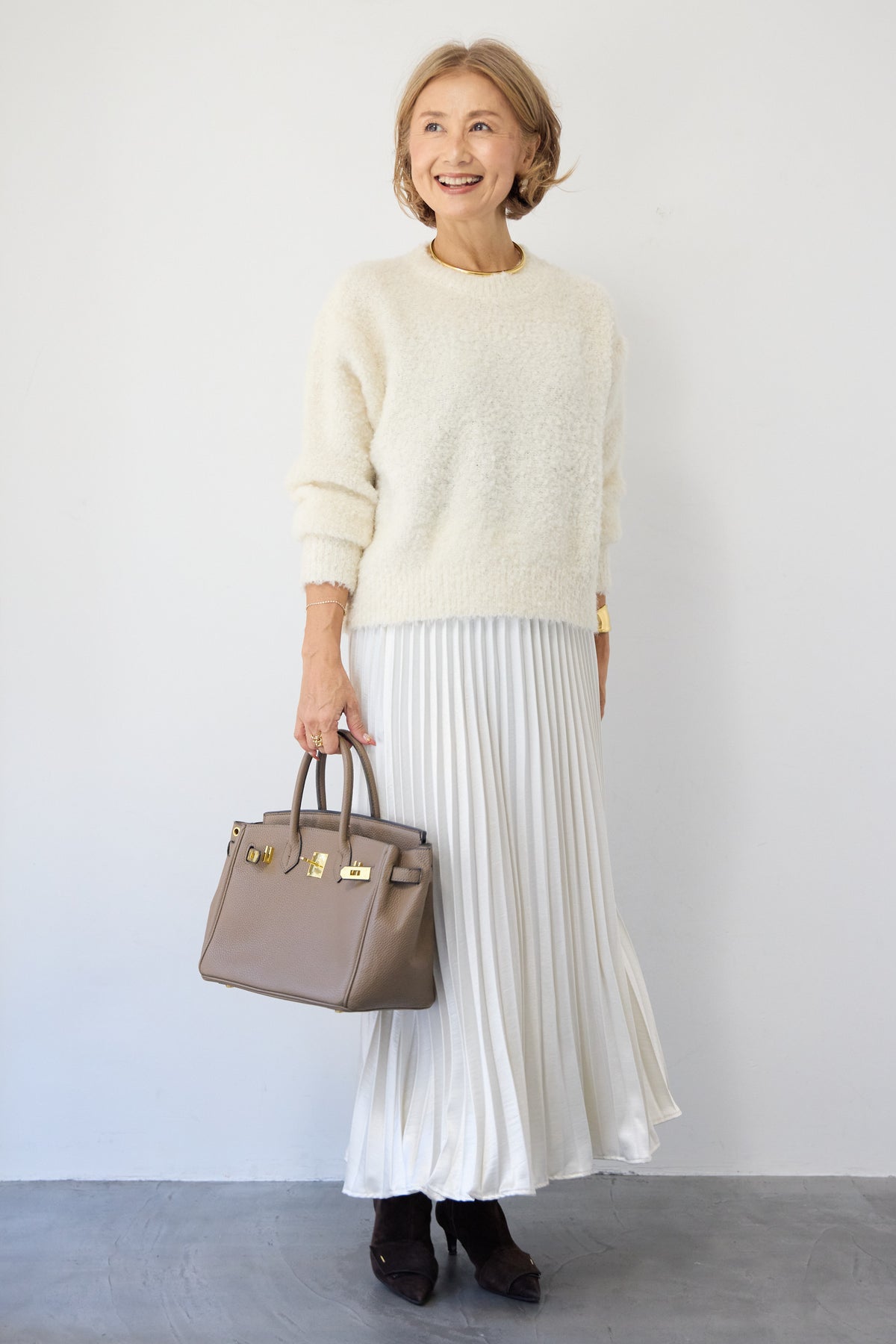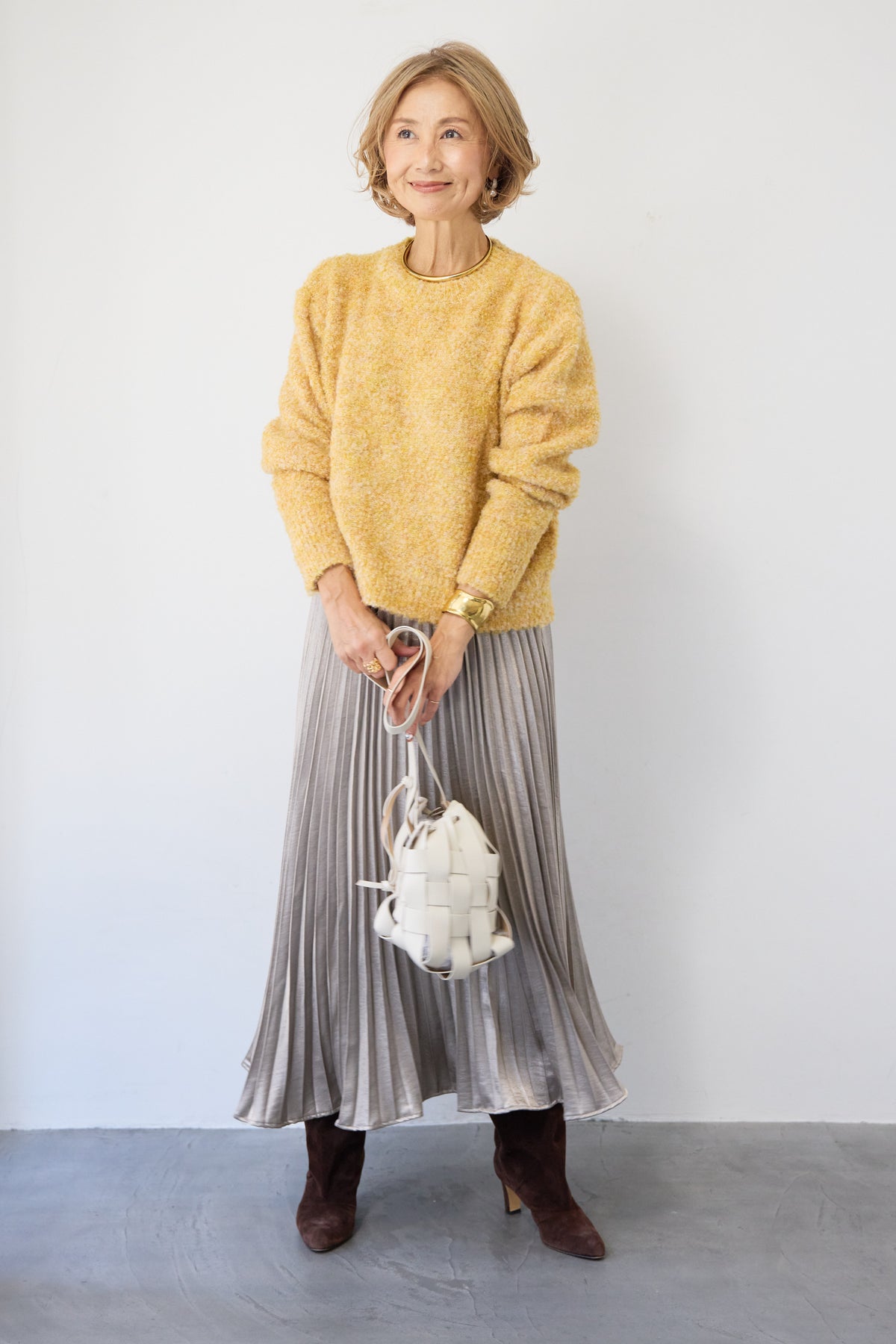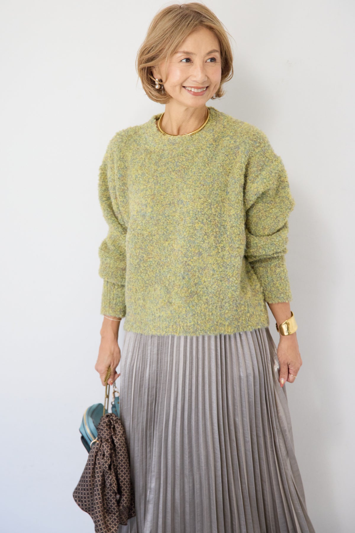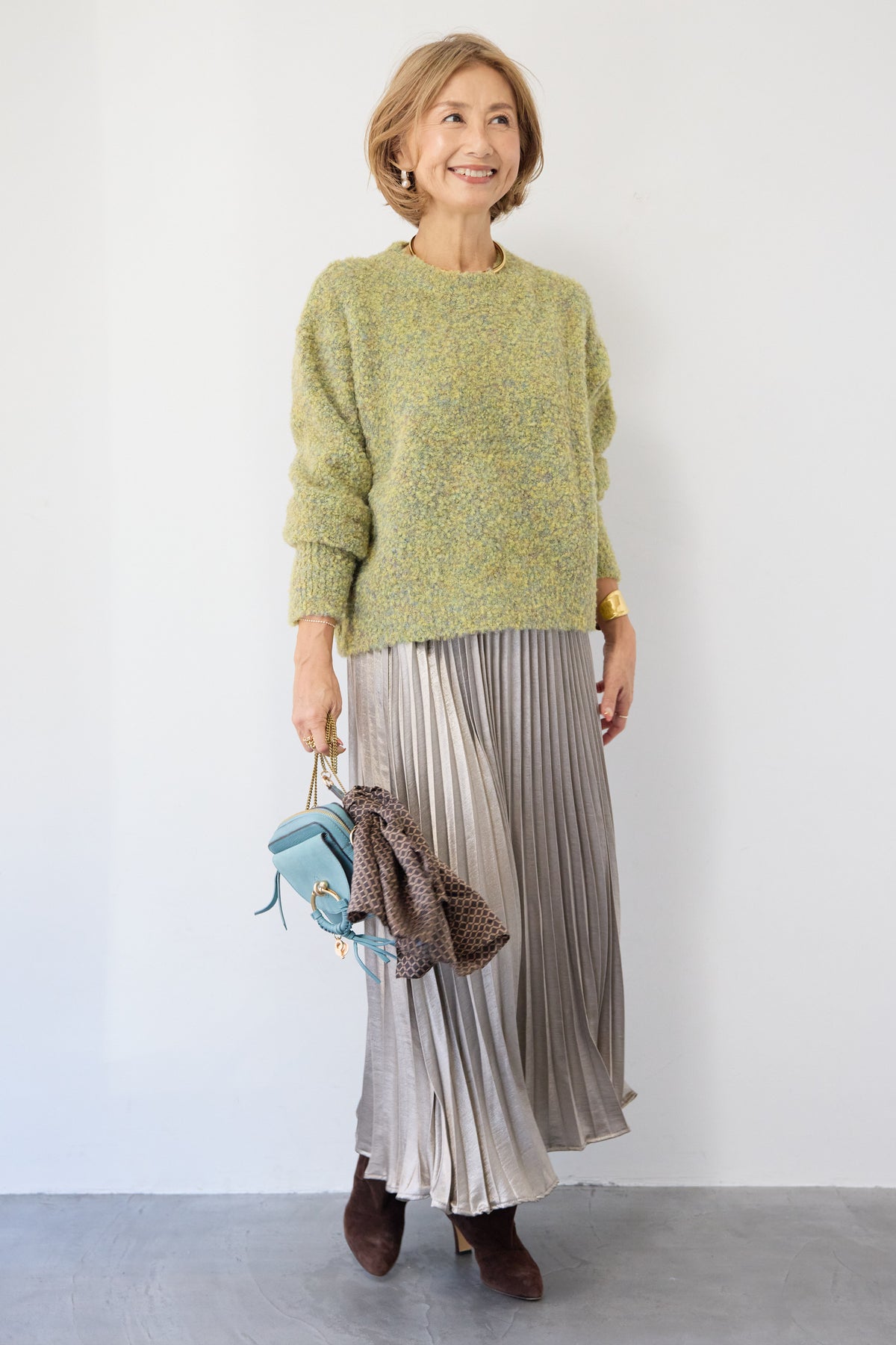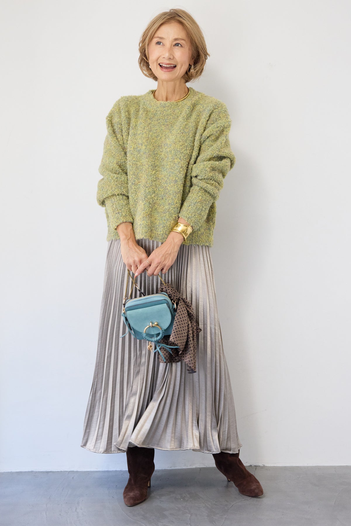 柔らかなシャギー素材が特徴のニットプルオーバー。ふわふわとした質感で、着心地も抜群。リラックス感がありながらも、シンプルで洗練されたデザインが魅力的です。ボトムスを選ばず、カジュアルにもエレガントにも対応できる優れたアイテムです。