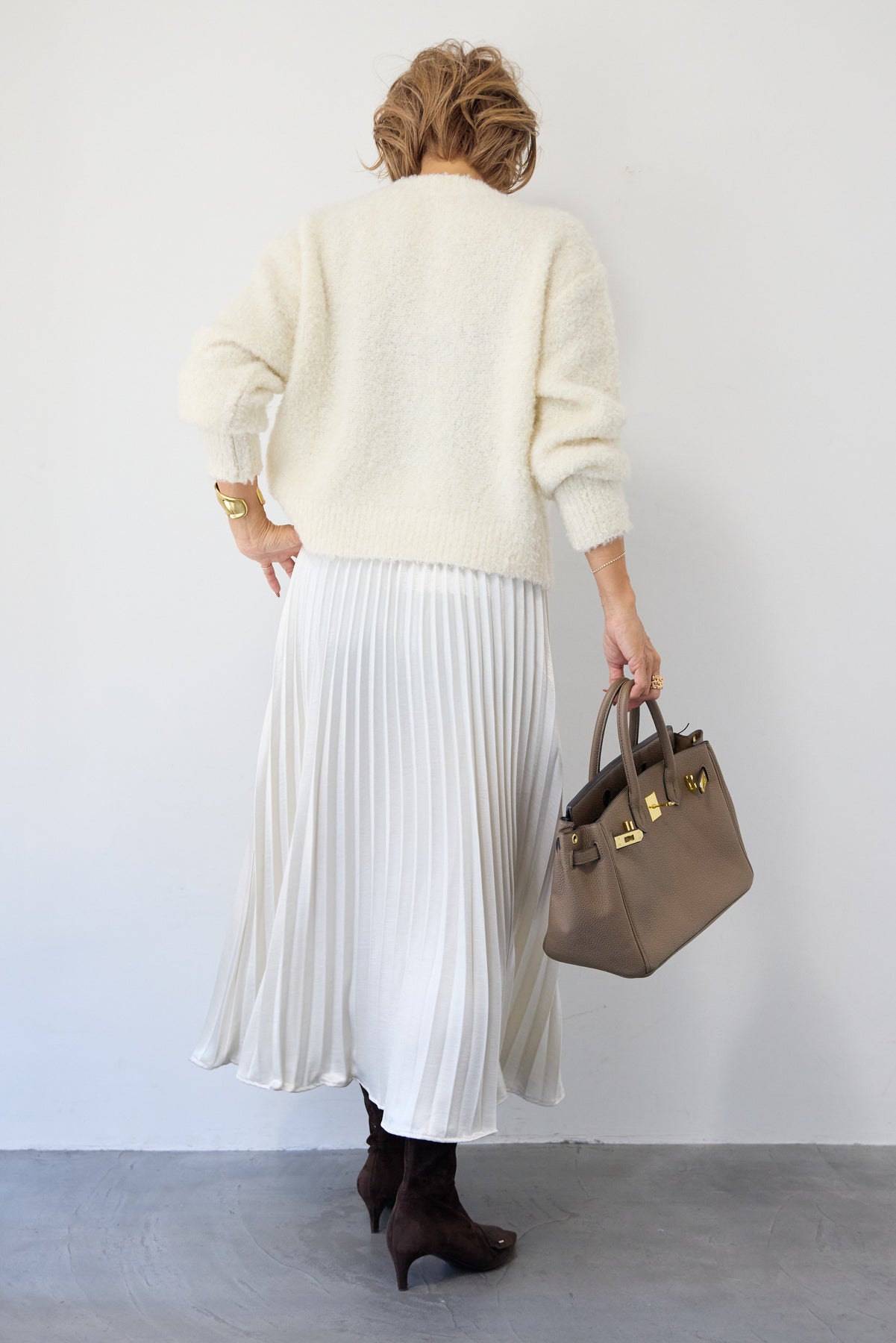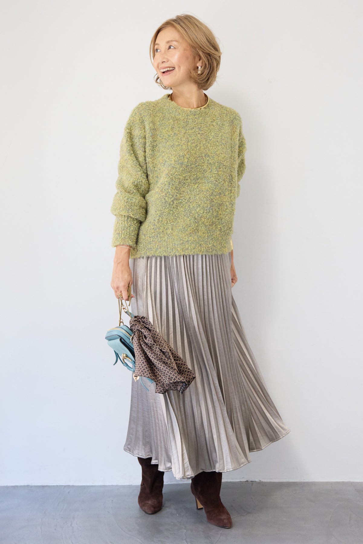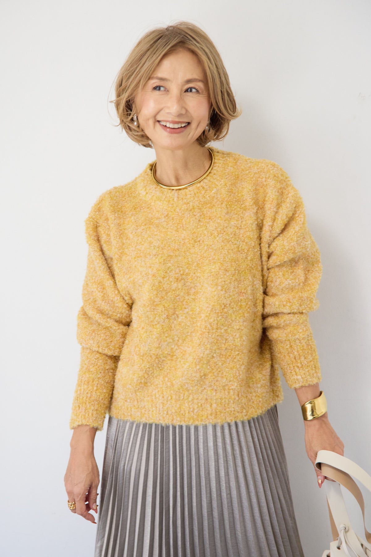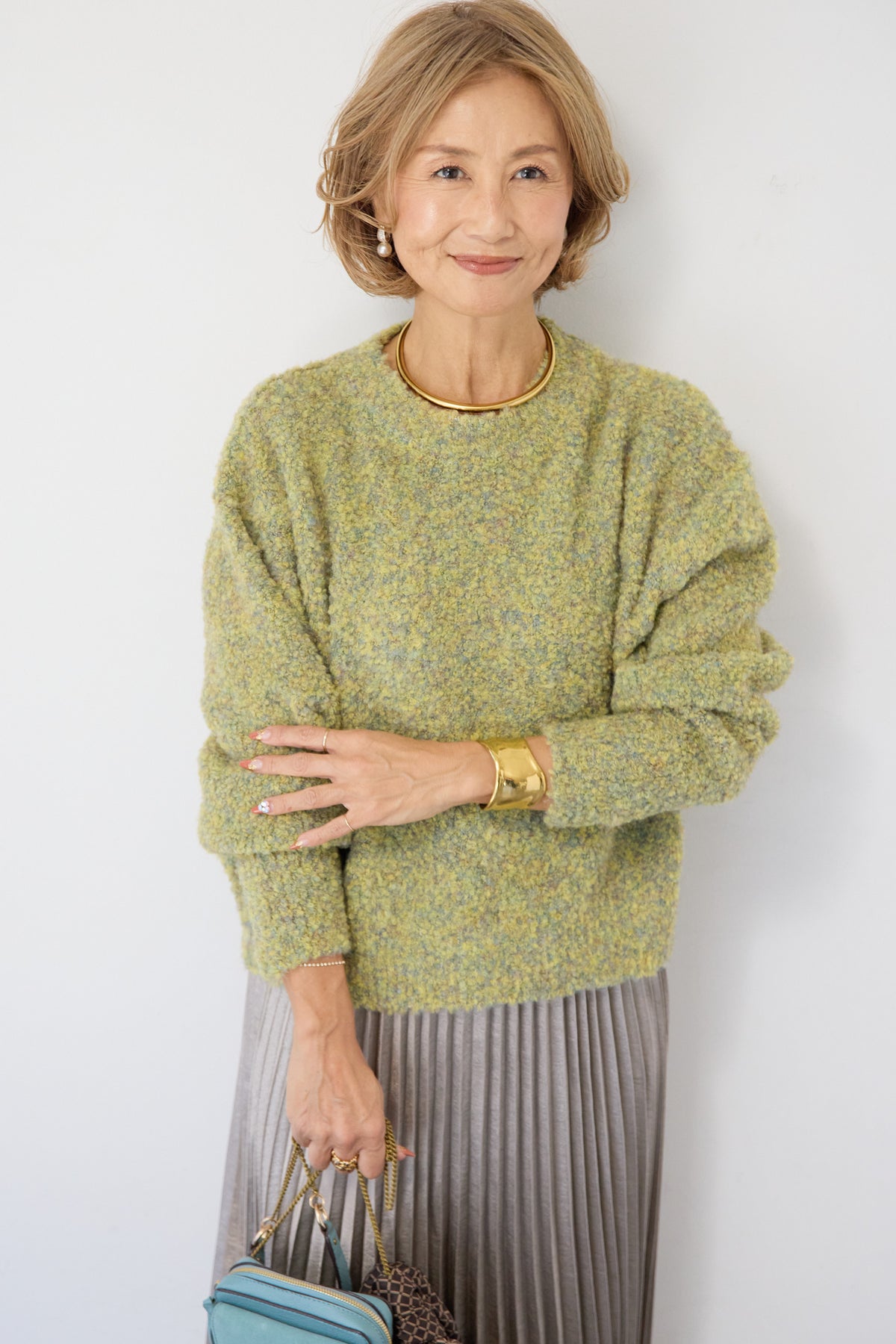 柔らかなシャギー素材が特徴のニットプルオーバー。ふわふわとした質感で、着心地も抜群。リラックス感がありながらも、シンプルで洗練されたデザインが魅力的です。ボトムスを選ばず、カジュアルにもエレガントにも対応できる優れたアイテムです。