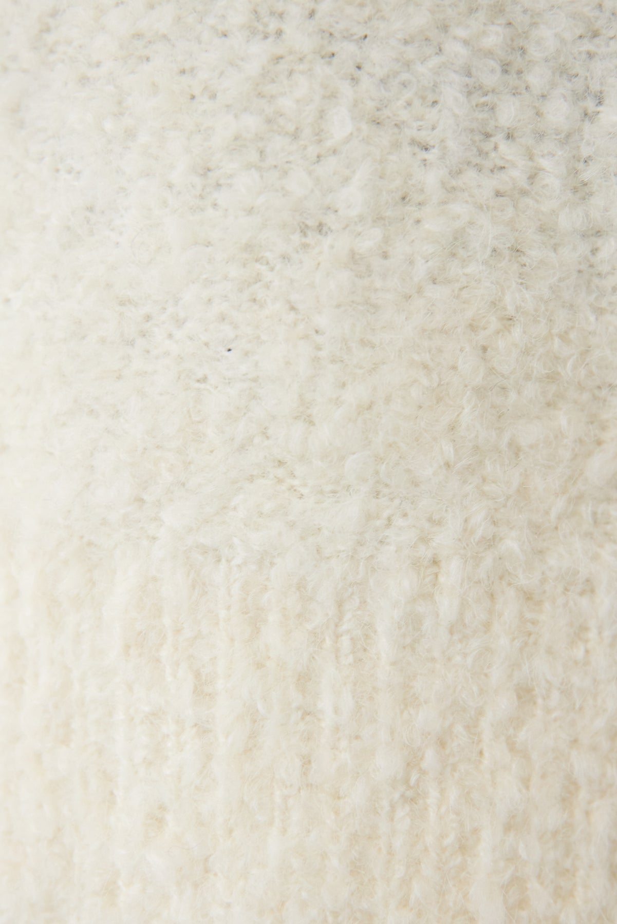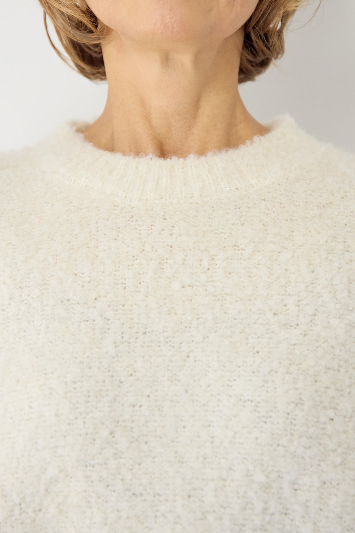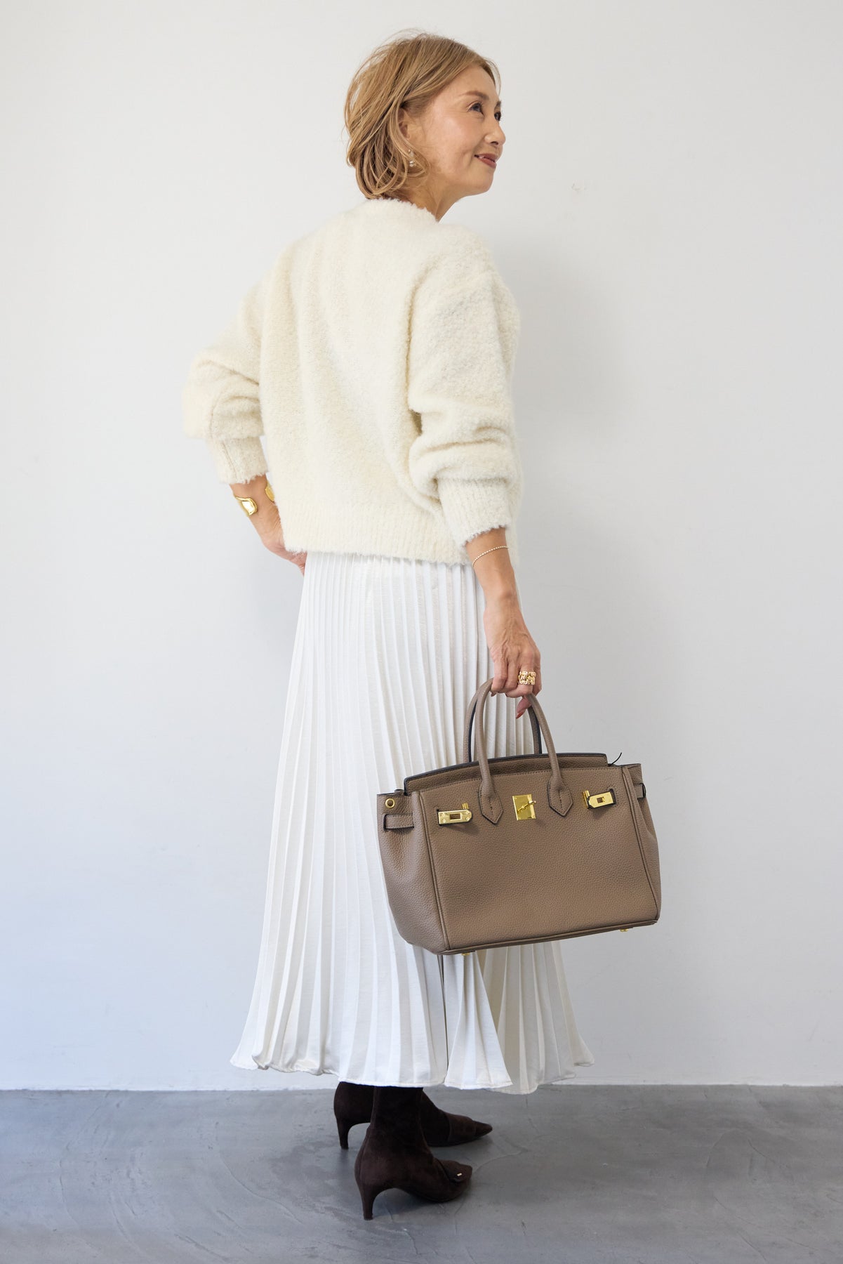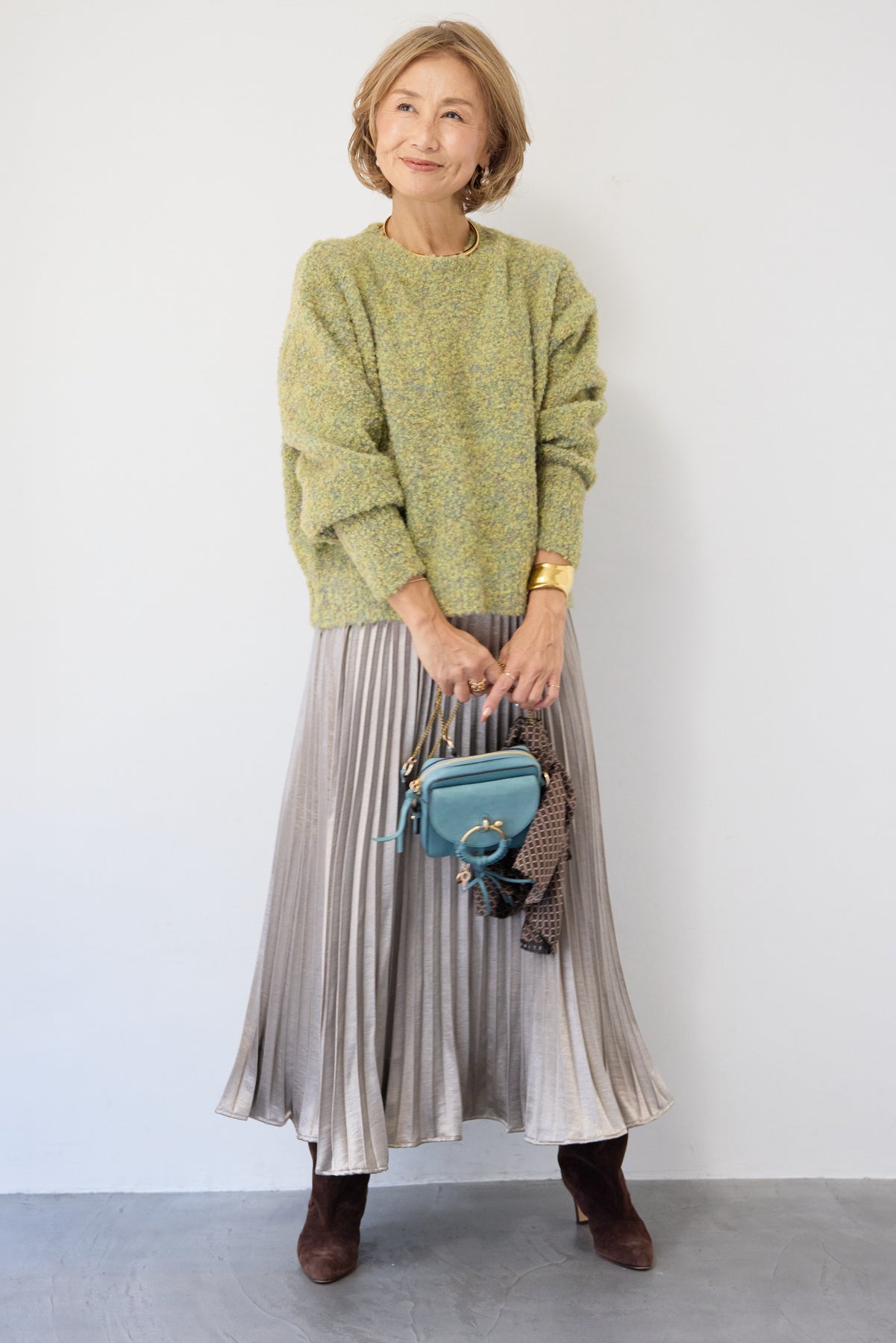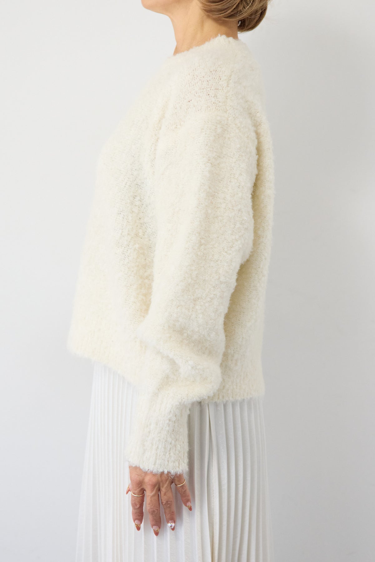 柔らかなシャギー素材が特徴のニットプルオーバー。ふわふわとした質感で、着心地も抜群。リラックス感がありながらも、シンプルで洗練されたデザインが魅力的です。ボトムスを選ばず、カジュアルにもエレガントにも対応できる優れたアイテムです。