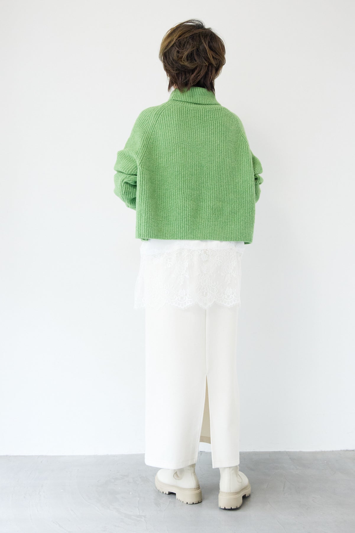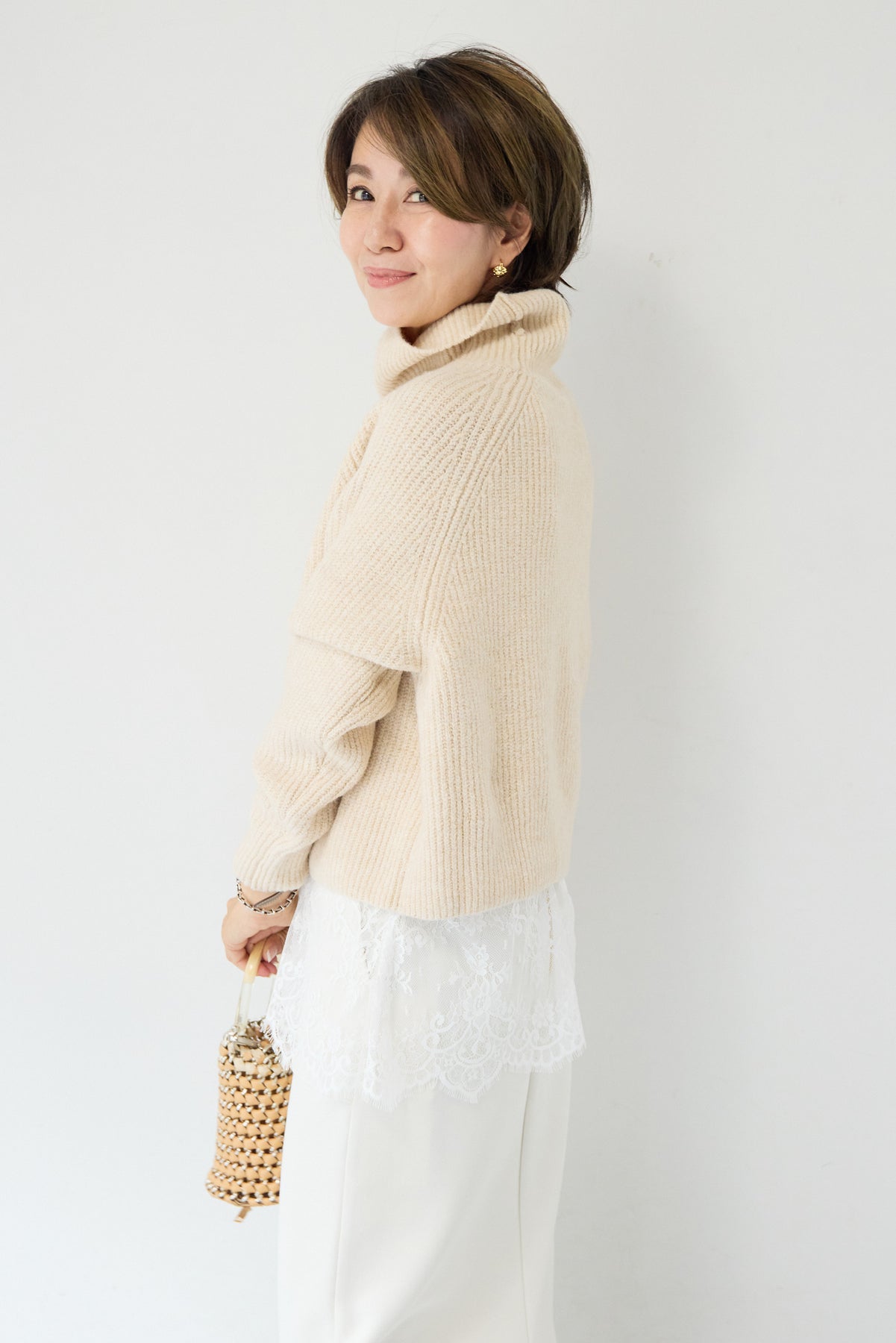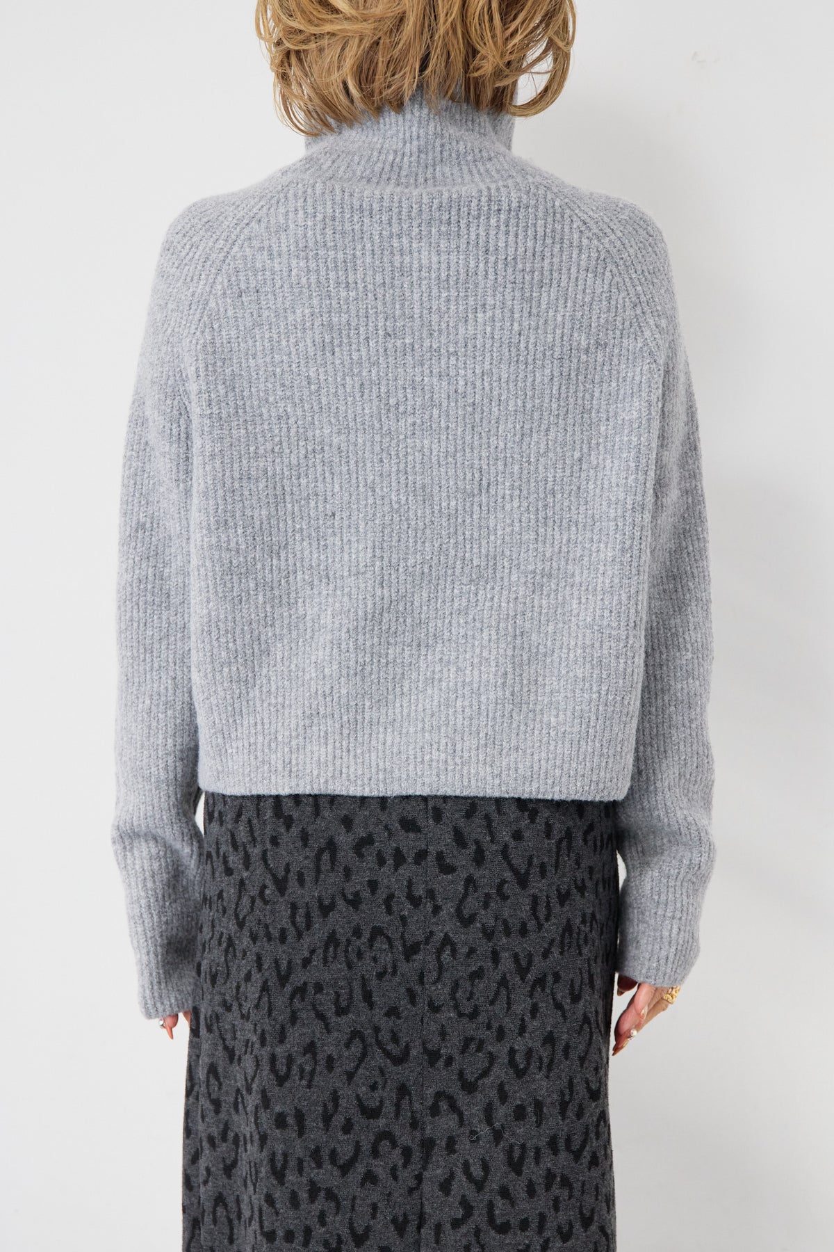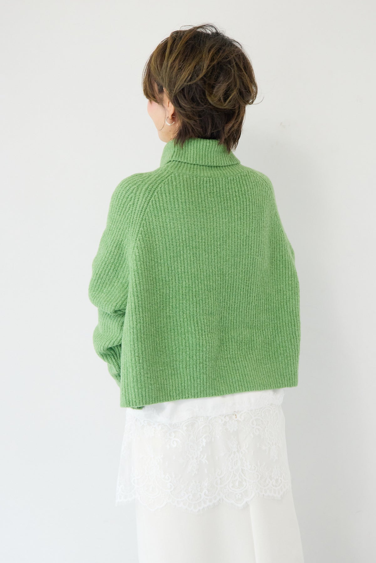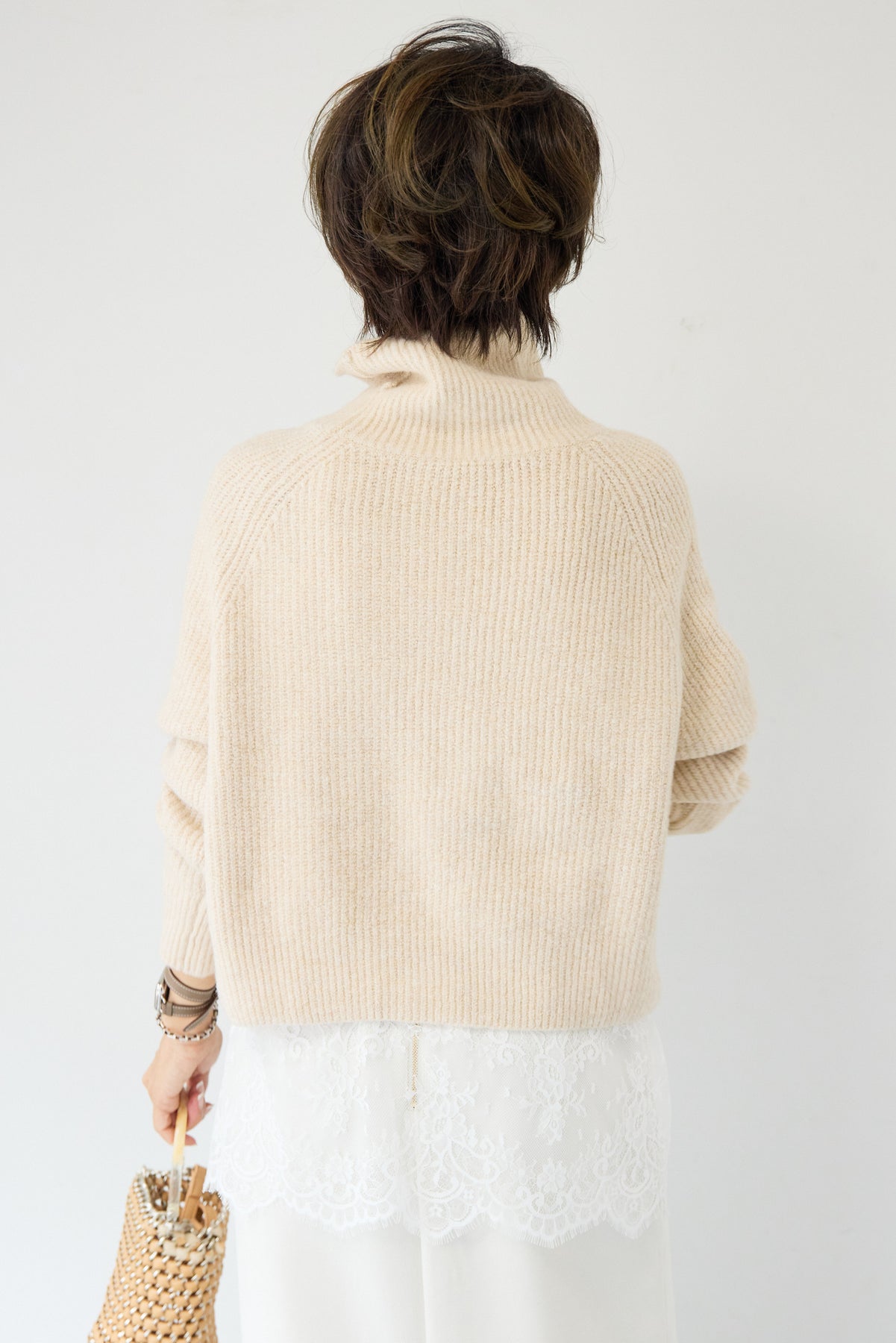 立体感のあるリブ編みと、程よい高さのタートルネックが上品な印象を演出するショート丈ニット。ウール混素材ならではのふんわりとした柔らかさと、しっかりとした肉感で、暖かさと着心地を両立しました。コンパクトなショート丈は、スカートやワイドパンツ、ワンピースとのレイヤードにも好相性。自然に肩になじむラグランスリーブ仕様で、身体のラインを拾いすぎず、リラックス感のある着用感を叶えます。首元を包み込むタートルネックは、折り返さずラフに着ても、くしゅっとニュアンスをつけても様になるデザイン。シンプルながらも素材感とシルエットで差がつく、大人のための冬ニットです。