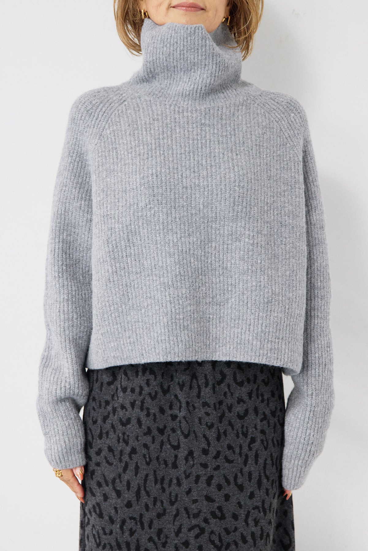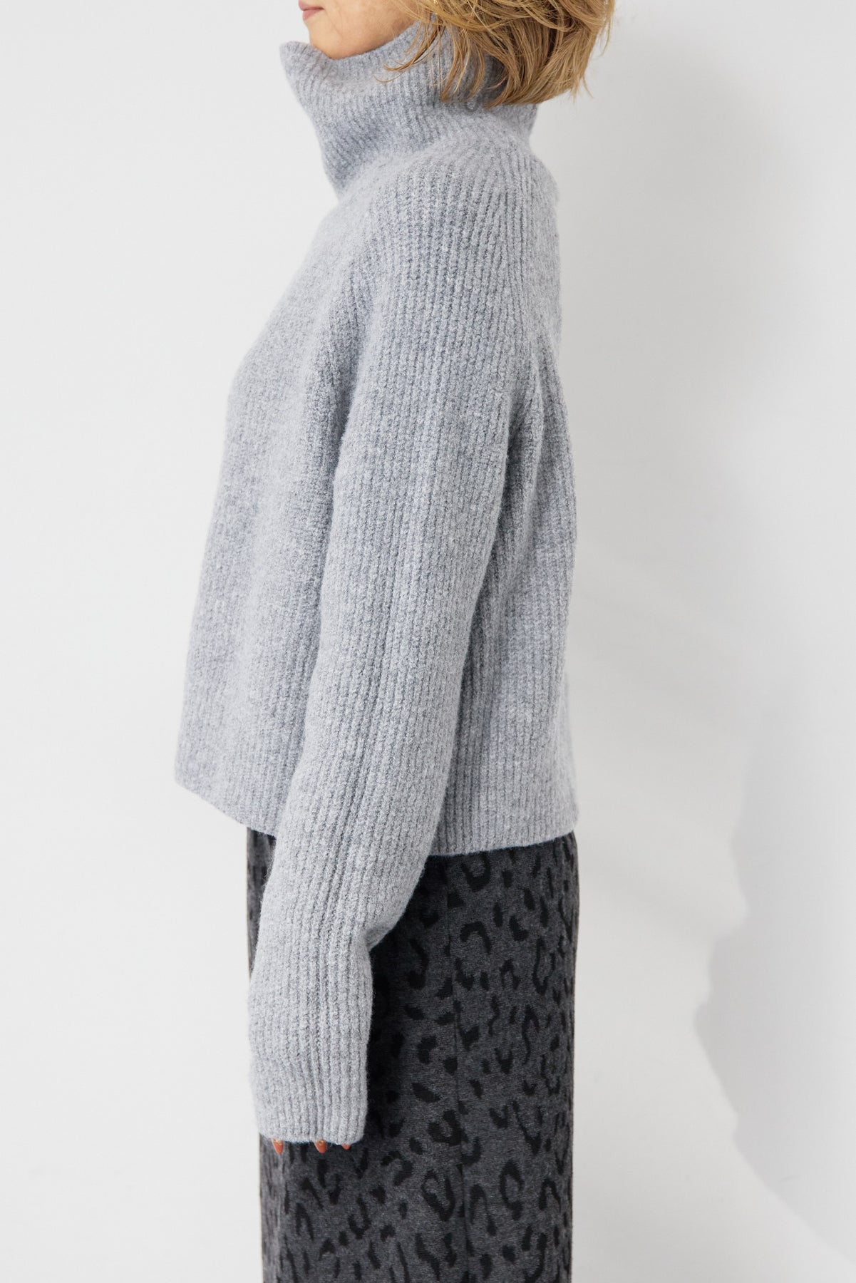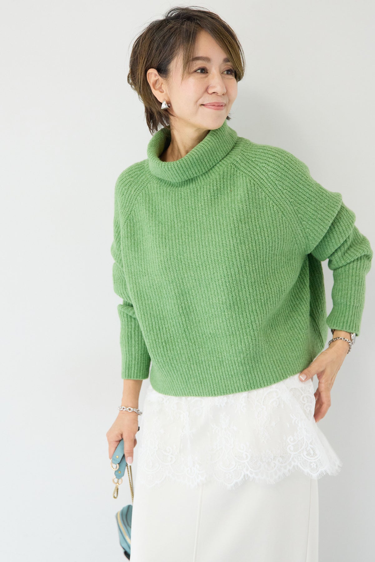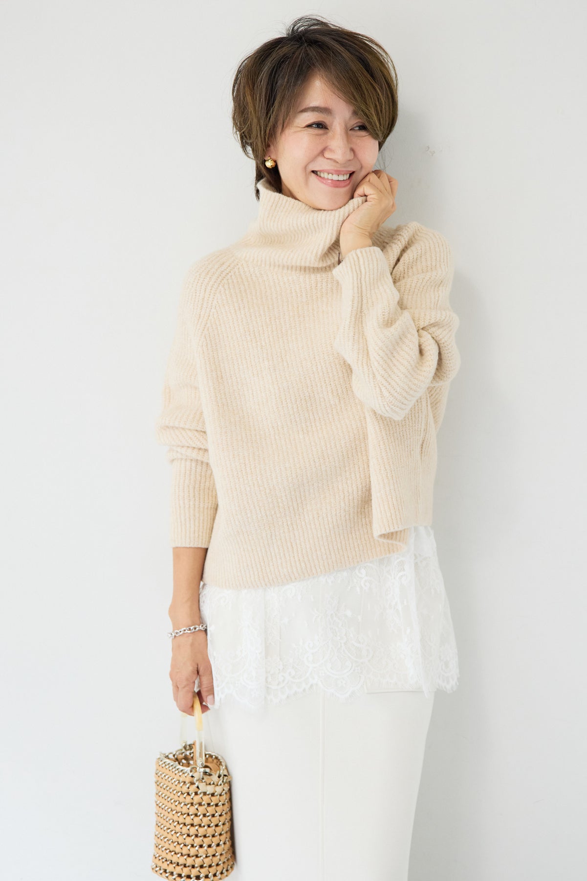立体感のあるリブ編みと、程よい高さのタートルネックが上品な印象を演出するショート丈ニット。ウール混素材ならではのふんわりとした柔らかさと、しっかりとした肉感で、暖かさと着心地を両立しました。コンパクトなショート丈は、スカートやワイドパンツ、ワンピースとのレイヤードにも好相性。自然に肩になじむラグランスリーブ仕様で、身体のラインを拾いすぎず、リラックス感のある着用感を叶えます。首元を包み込むタートルネックは、折り返さずラフに着ても、くしゅっとニュアンスをつけても様になるデザイン。シンプルながらも素材感とシルエットで差がつく、大人のための冬ニットです。