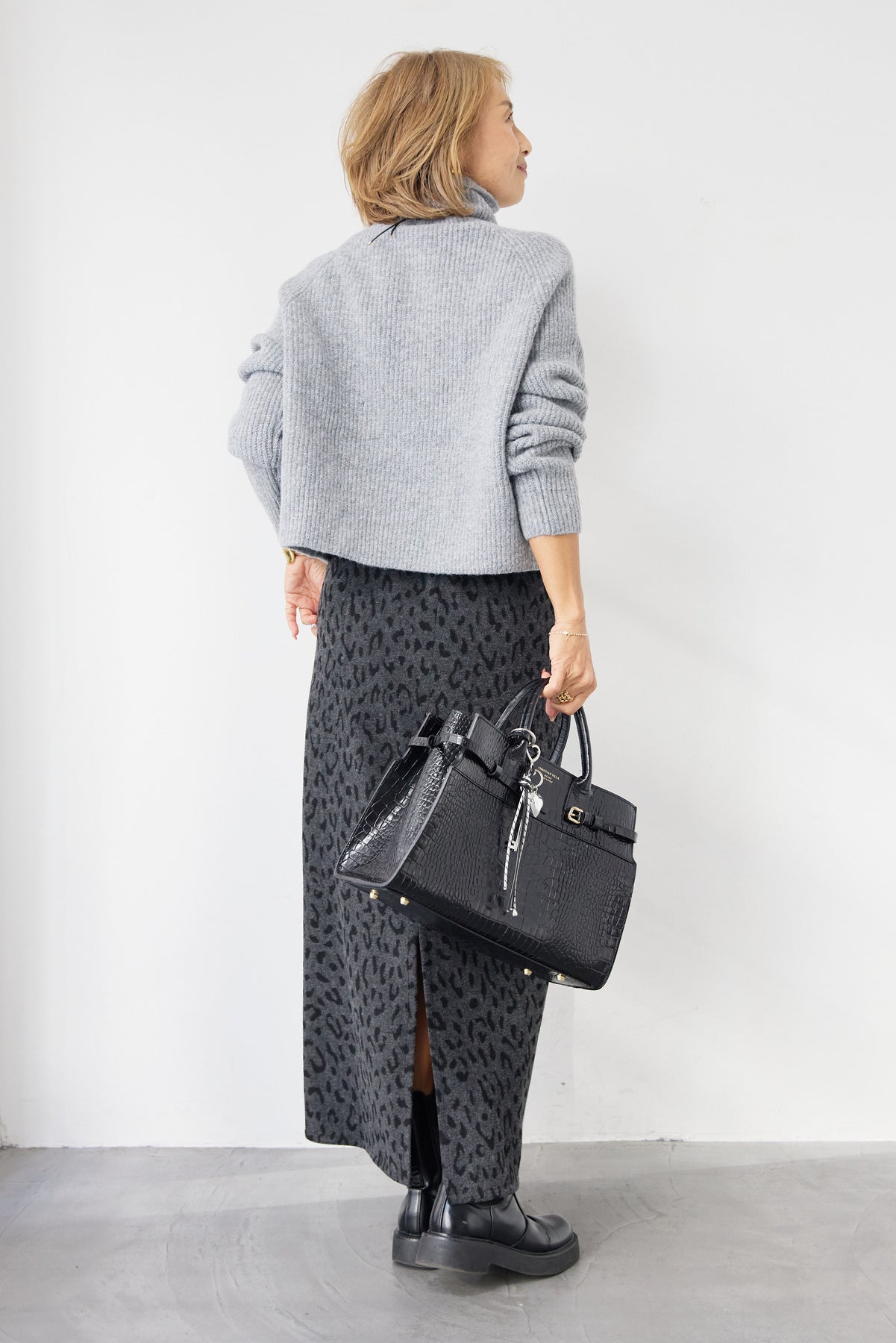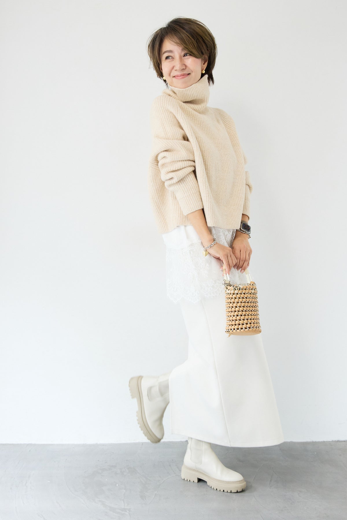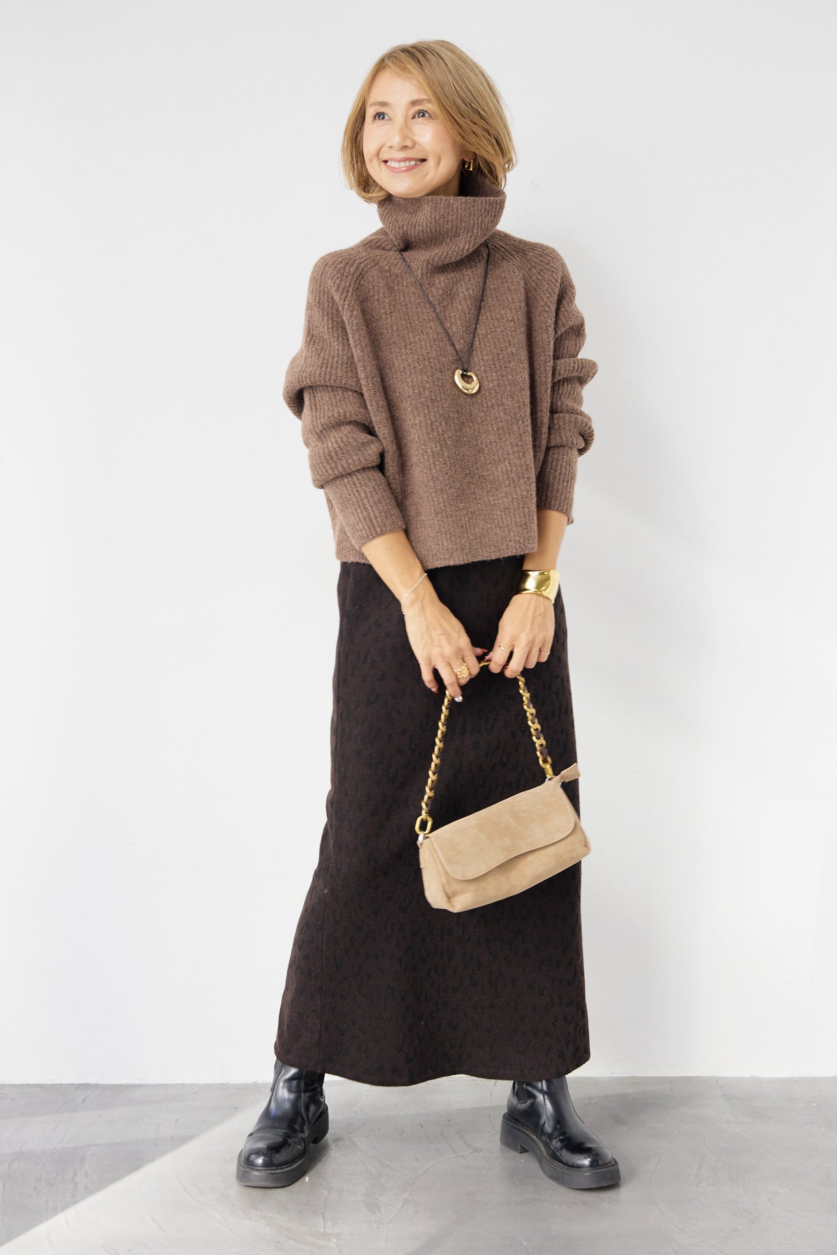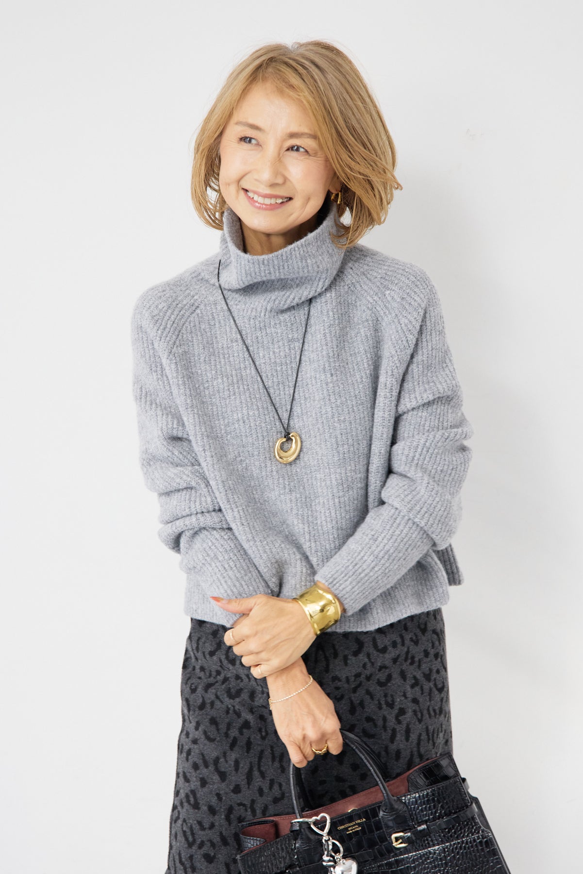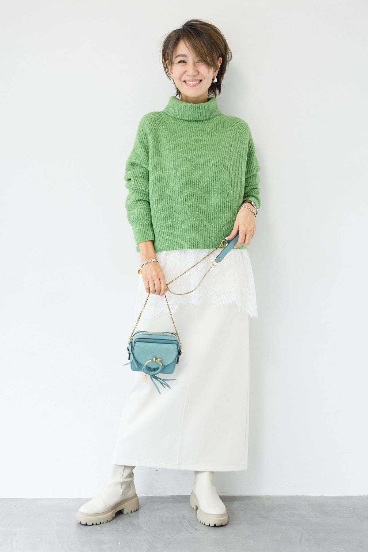 立体感のあるリブ編みと、程よい高さのタートルネックが上品な印象を演出するショート丈ニット。ウール混素材ならではのふんわりとした柔らかさと、しっかりとした肉感で、暖かさと着心地を両立しました。コンパクトなショート丈は、スカートやワイドパンツ、ワンピースとのレイヤードにも好相性。自然に肩になじむラグランスリーブ仕様で、身体のラインを拾いすぎず、リラックス感のある着用感を叶えます。首元を包み込むタートルネックは、折り返さずラフに着ても、くしゅっとニュアンスをつけても様になるデザイン。シンプルながらも素材感とシルエットで差がつく、大人のための冬ニットです。