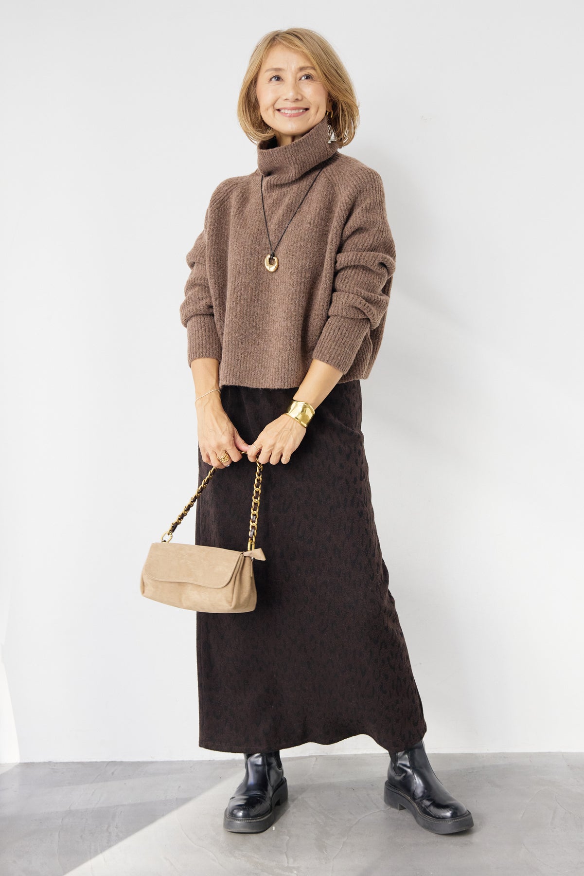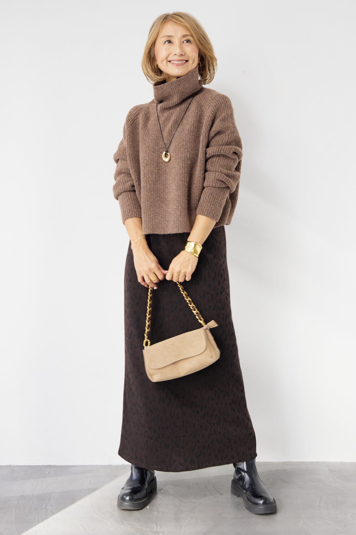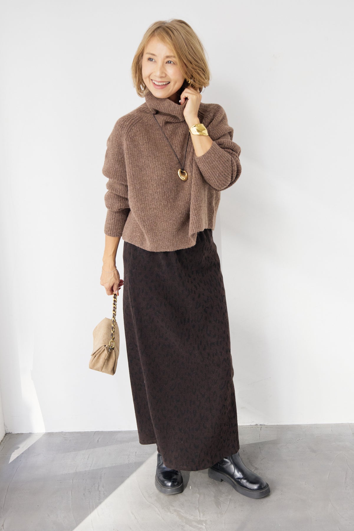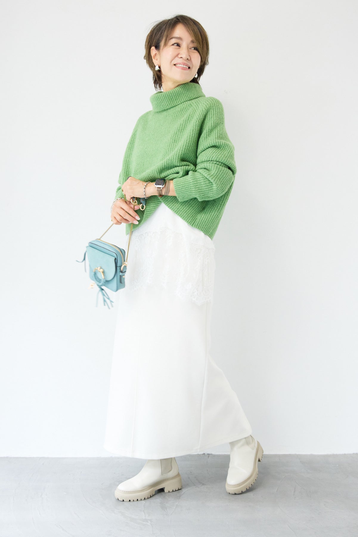 立体感のあるリブ編みと、程よい高さのタートルネックが上品な印象を演出するショート丈ニット。ウール混素材ならではのふんわりとした柔らかさと、しっかりとした肉感で、暖かさと着心地を両立しました。コンパクトなショート丈は、スカートやワイドパンツ、ワンピースとのレイヤードにも好相性。自然に肩になじむラグランスリーブ仕様で、身体のラインを拾いすぎず、リラックス感のある着用感を叶えます。首元を包み込むタートルネックは、折り返さずラフに着ても、くしゅっとニュアンスをつけても様になるデザイン。シンプルながらも素材感とシルエットで差がつく、大人のための冬ニットです。