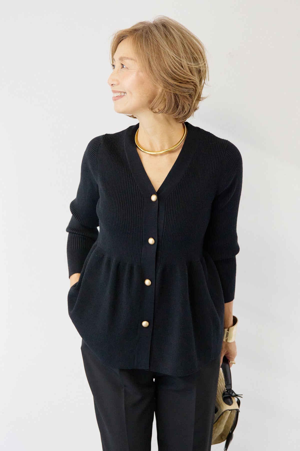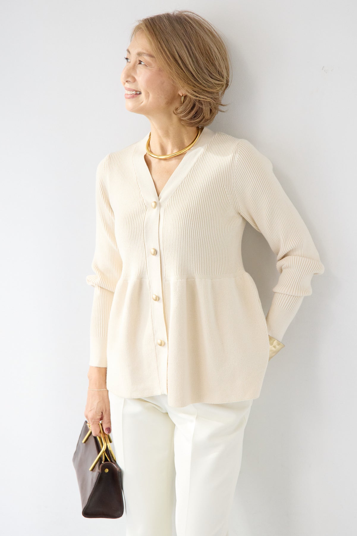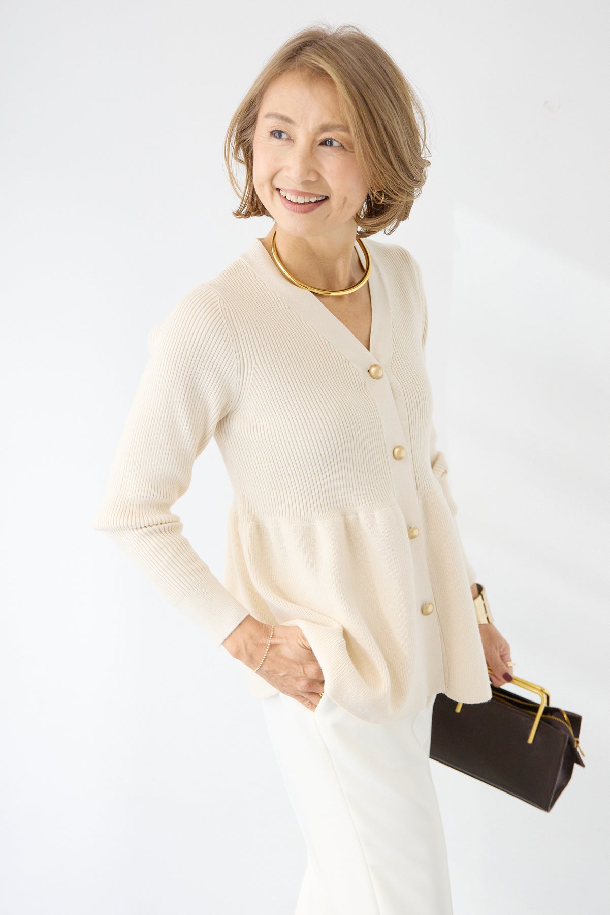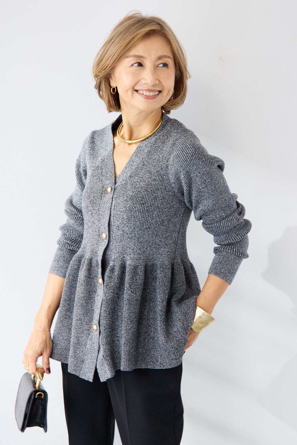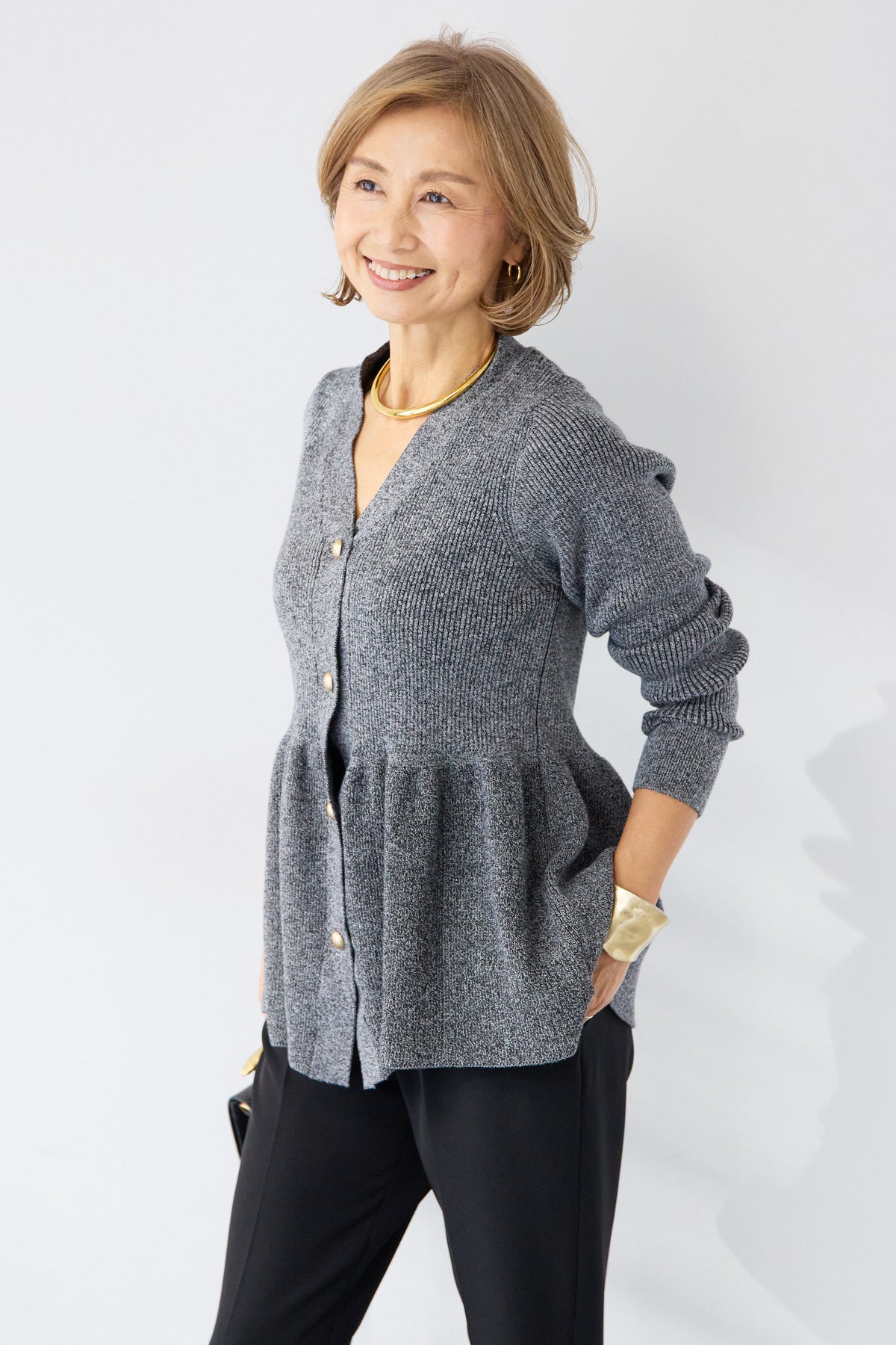 上品な華やかさと体型カバーを両立した、大人のためのペプラムニットカーディガン。縦畝のリブ編みがすっきりとした印象を与え、ウエスト切り替えから広がるペプラムシルエットが女性らしいラインを演出します。フロントには艶感のあるゴールドボタンをあしらい、シンプルながらもアクセサリー要らずの存在感。Vネックデザインで首元を美しく見せ、顔まわりをすっきりとした印象に仕上げています。程よく肉感のあるニット素材は、身体のラインを拾いにくく、ロングシーズン着用可能。パンツにもスカートにも合わせやすく、きれいめからカジュアルまで幅広いスタイリングに活躍します。