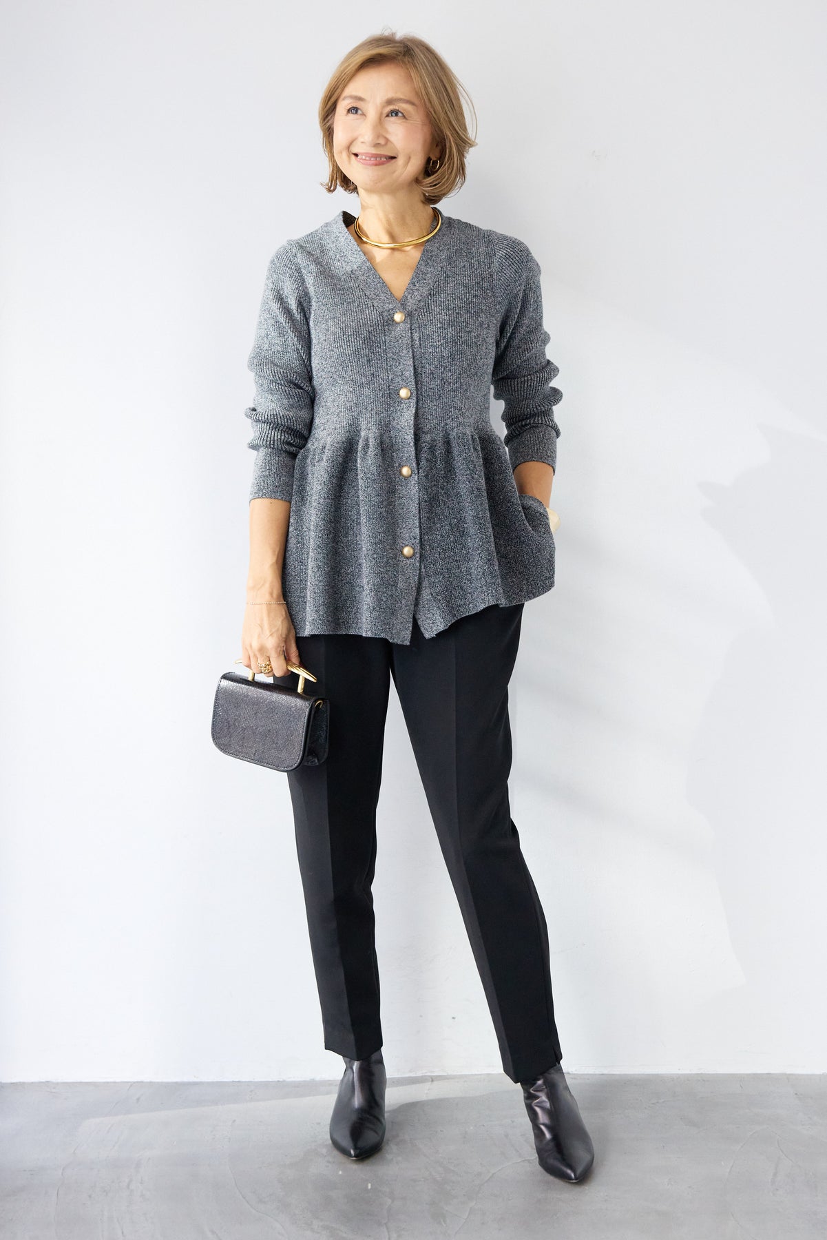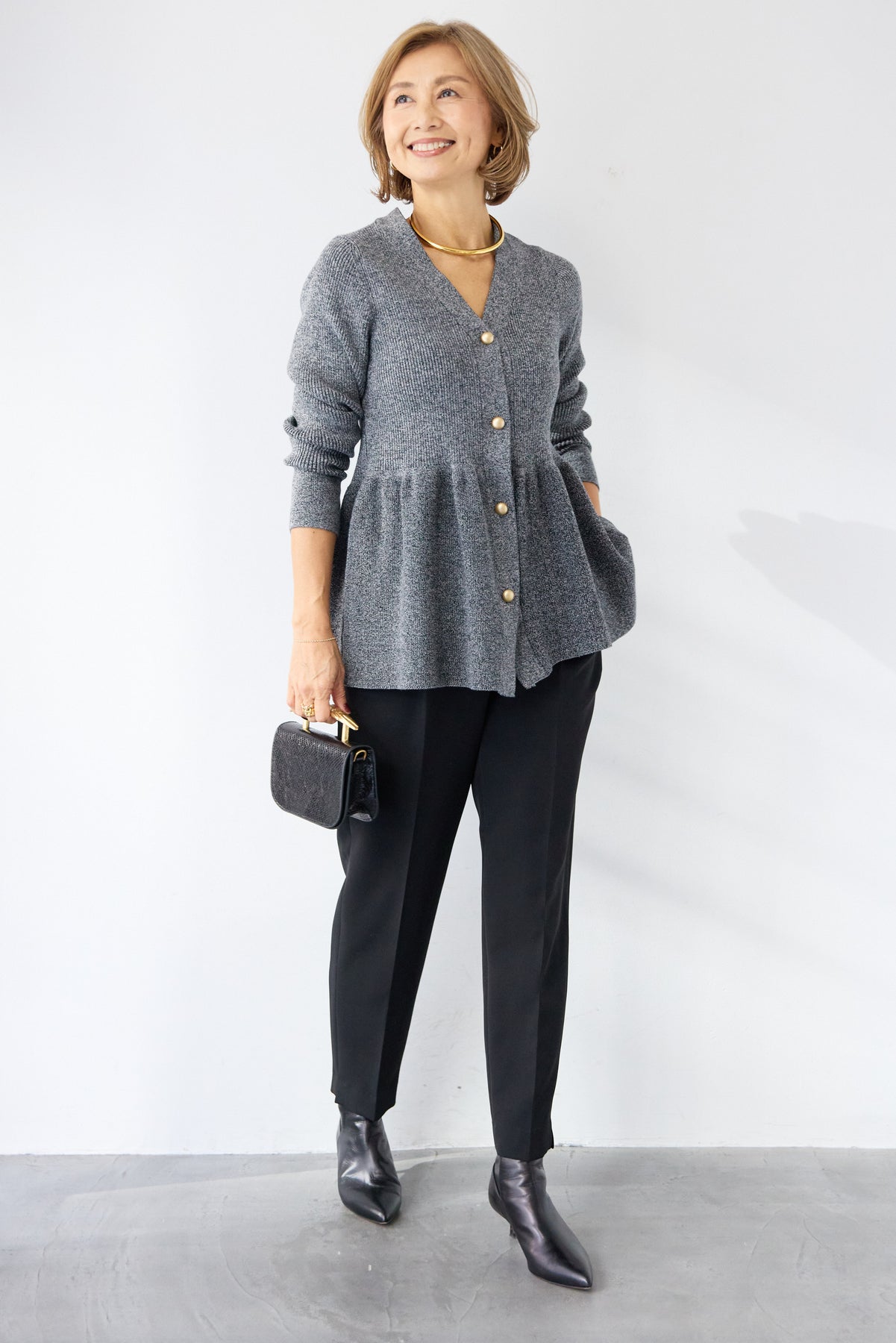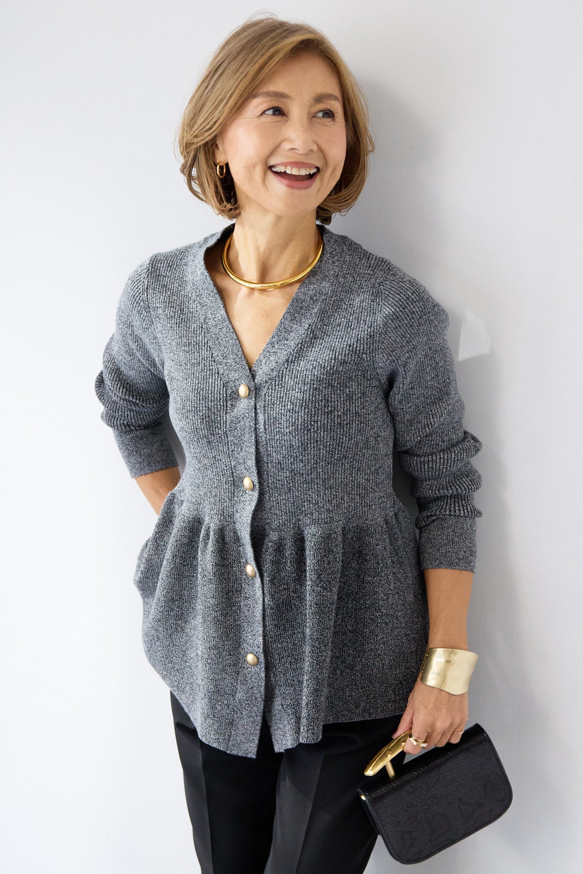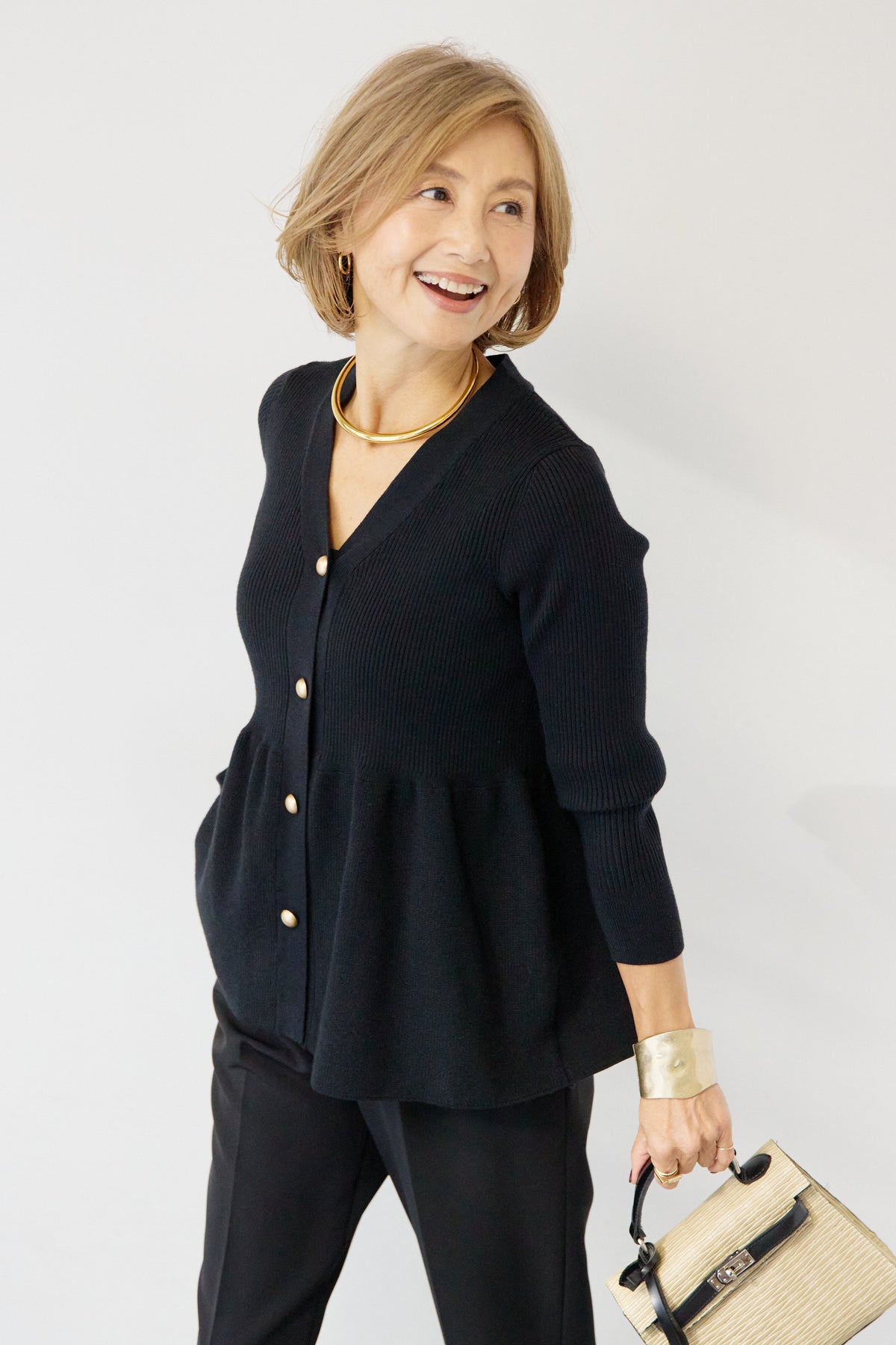 上品な華やかさと体型カバーを両立した、大人のためのペプラムニットカーディガン。縦畝のリブ編みがすっきりとした印象を与え、ウエスト切り替えから広がるペプラムシルエットが女性らしいラインを演出します。フロントには艶感のあるゴールドボタンをあしらい、シンプルながらもアクセサリー要らずの存在感。Vネックデザインで首元を美しく見せ、顔まわりをすっきりとした印象に仕上げています。程よく肉感のあるニット素材は、身体のラインを拾いにくく、ロングシーズン着用可能。パンツにもスカートにも合わせやすく、きれいめからカジュアルまで幅広いスタイリングに活躍します。