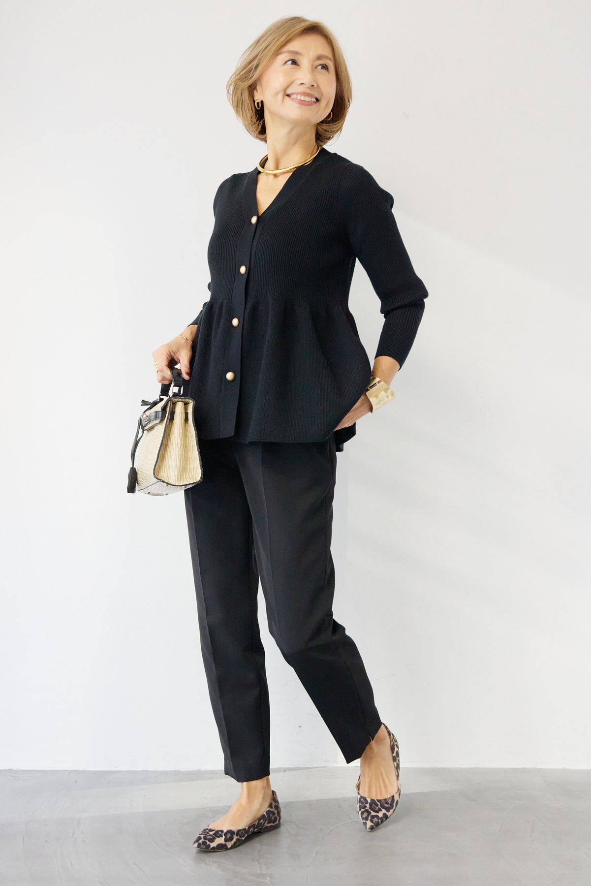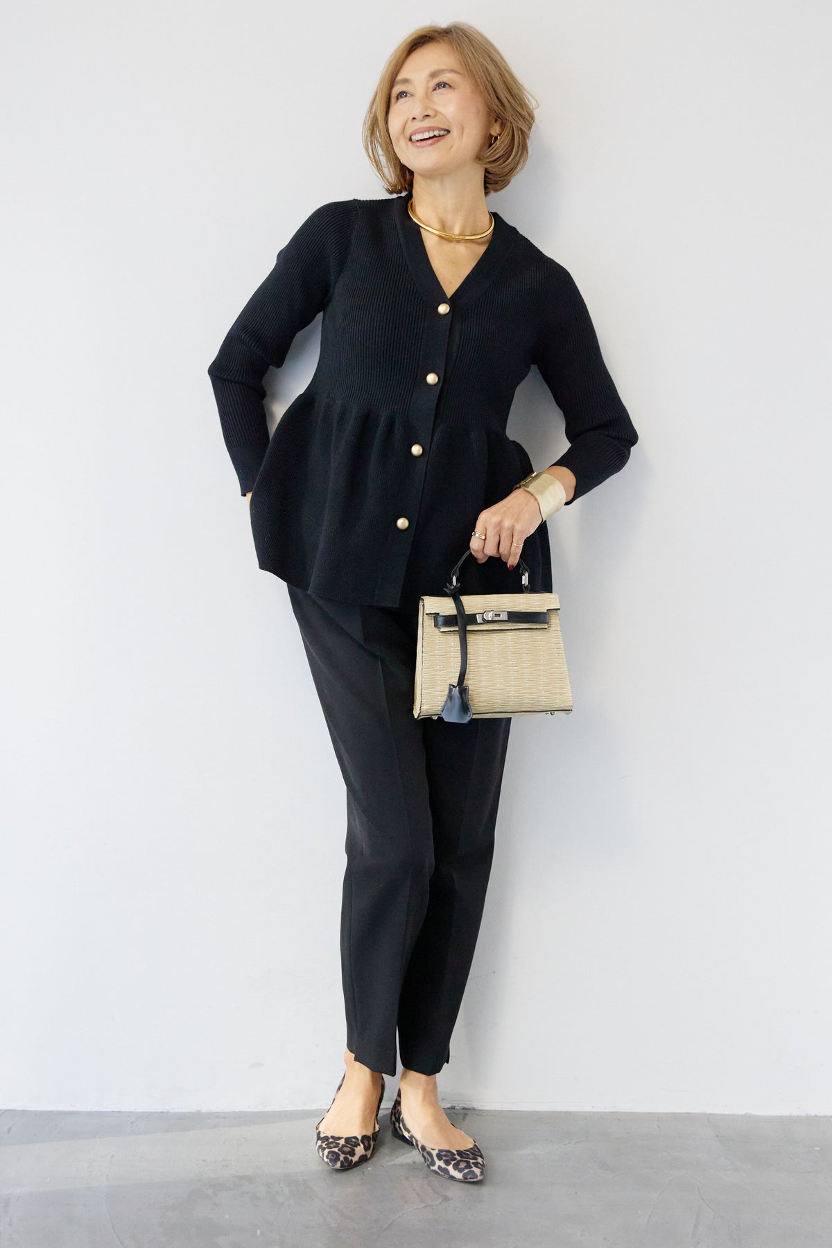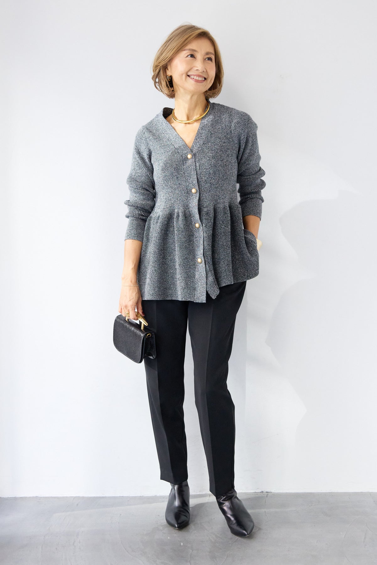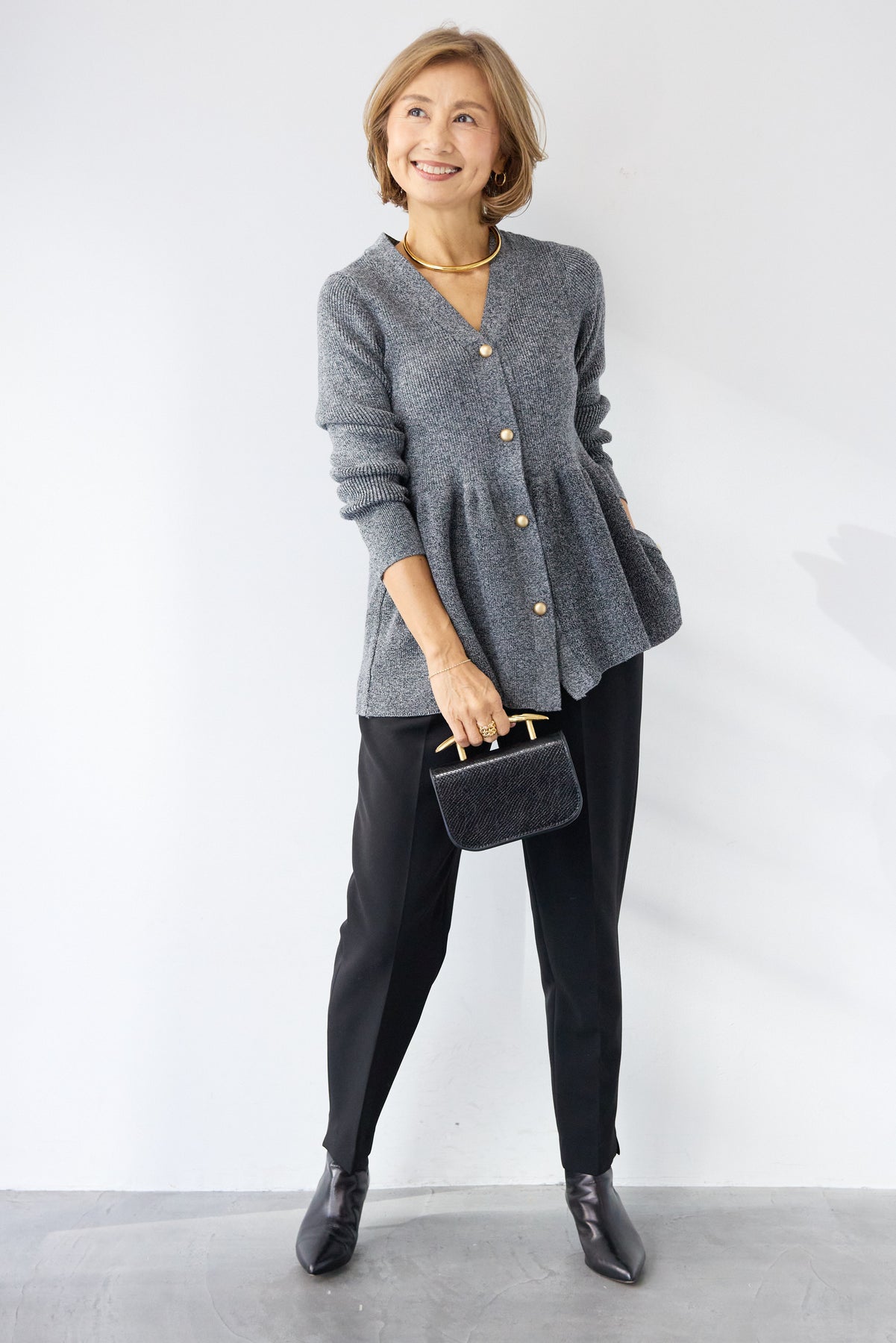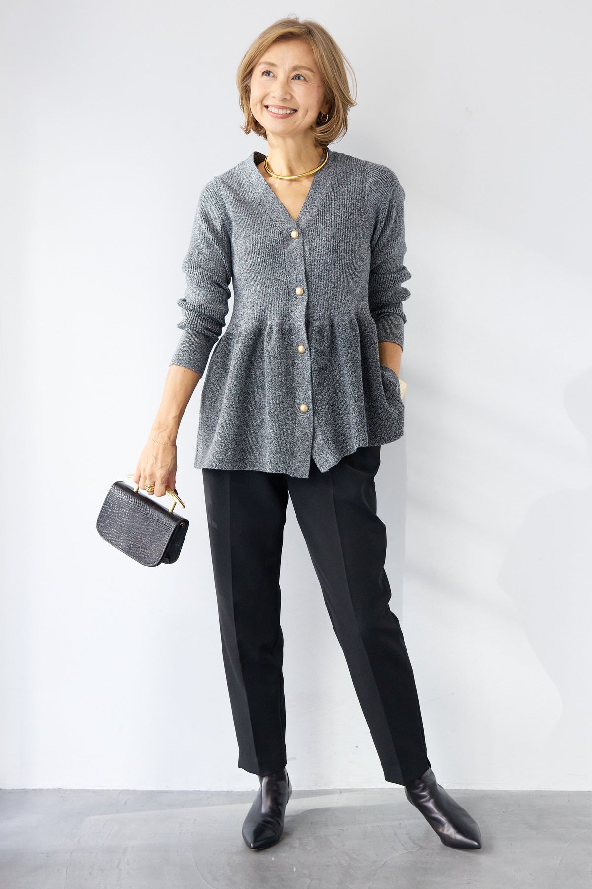 上品な華やかさと体型カバーを両立した、大人のためのペプラムニットカーディガン。縦畝のリブ編みがすっきりとした印象を与え、ウエスト切り替えから広がるペプラムシルエットが女性らしいラインを演出します。フロントには艶感のあるゴールドボタンをあしらい、シンプルながらもアクセサリー要らずの存在感。Vネックデザインで首元を美しく見せ、顔まわりをすっきりとした印象に仕上げています。程よく肉感のあるニット素材は、身体のラインを拾いにくく、ロングシーズン着用可能。パンツにもスカートにも合わせやすく、きれいめからカジュアルまで幅広いスタイリングに活躍します。