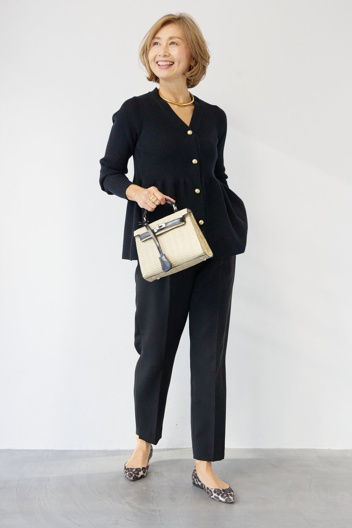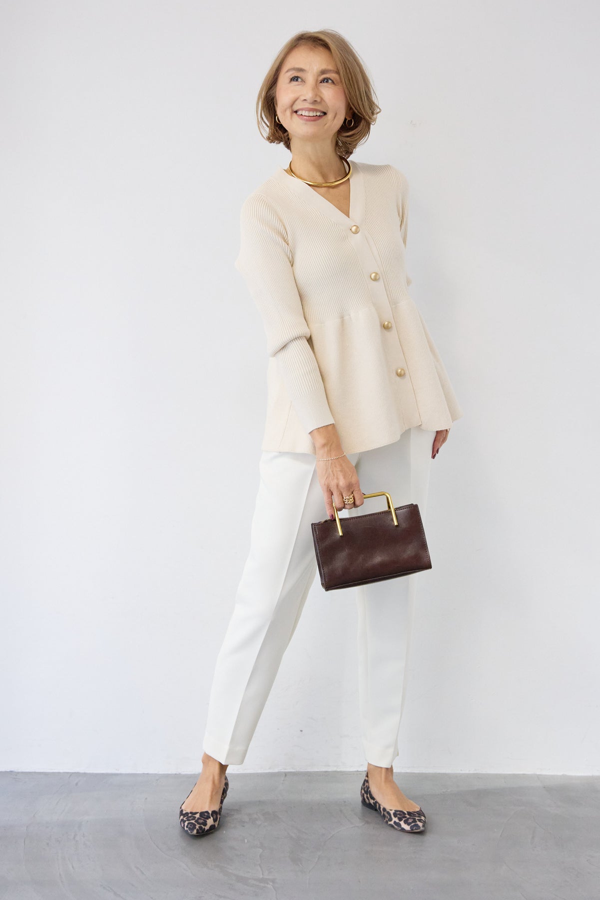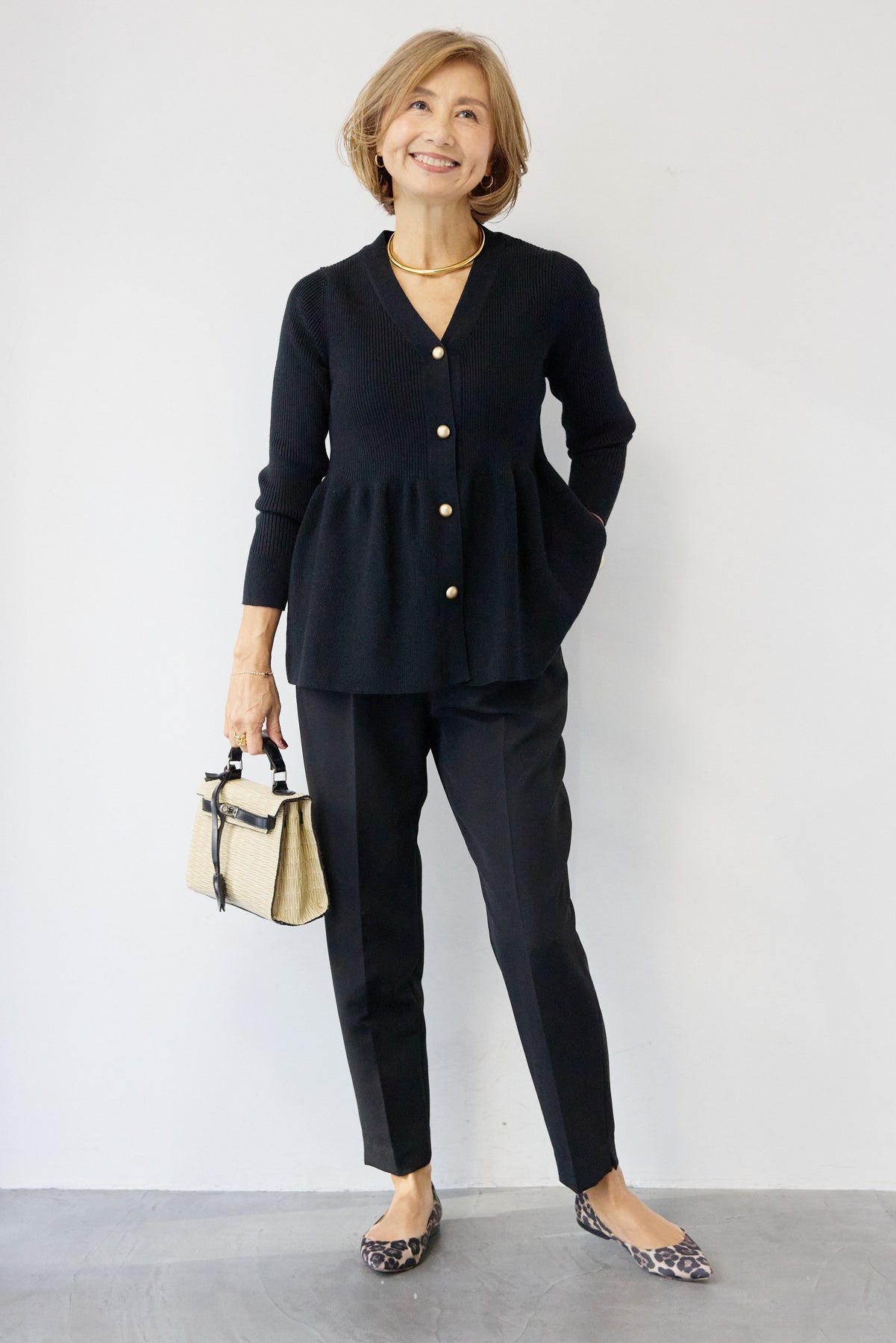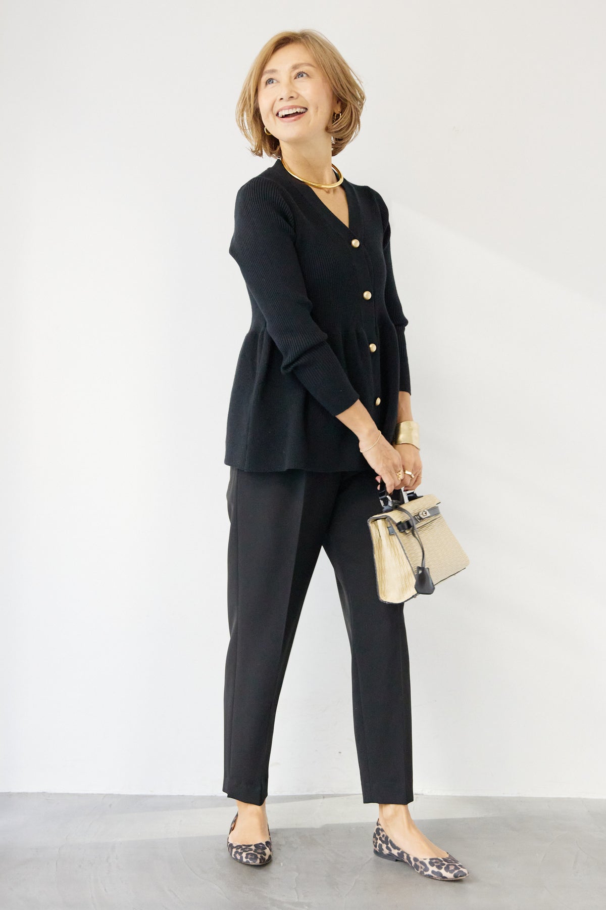 上品な華やかさと体型カバーを両立した、大人のためのペプラムニットカーディガン。縦畝のリブ編みがすっきりとした印象を与え、ウエスト切り替えから広がるペプラムシルエットが女性らしいラインを演出します。フロントには艶感のあるゴールドボタンをあしらい、シンプルながらもアクセサリー要らずの存在感。Vネックデザインで首元を美しく見せ、顔まわりをすっきりとした印象に仕上げています。程よく肉感のあるニット素材は、身体のラインを拾いにくく、ロングシーズン着用可能。パンツにもスカートにも合わせやすく、きれいめからカジュアルまで幅広いスタイリングに活躍します。