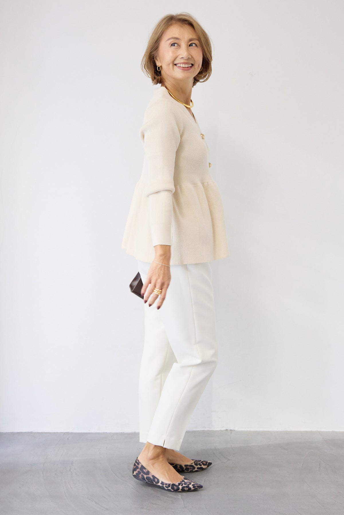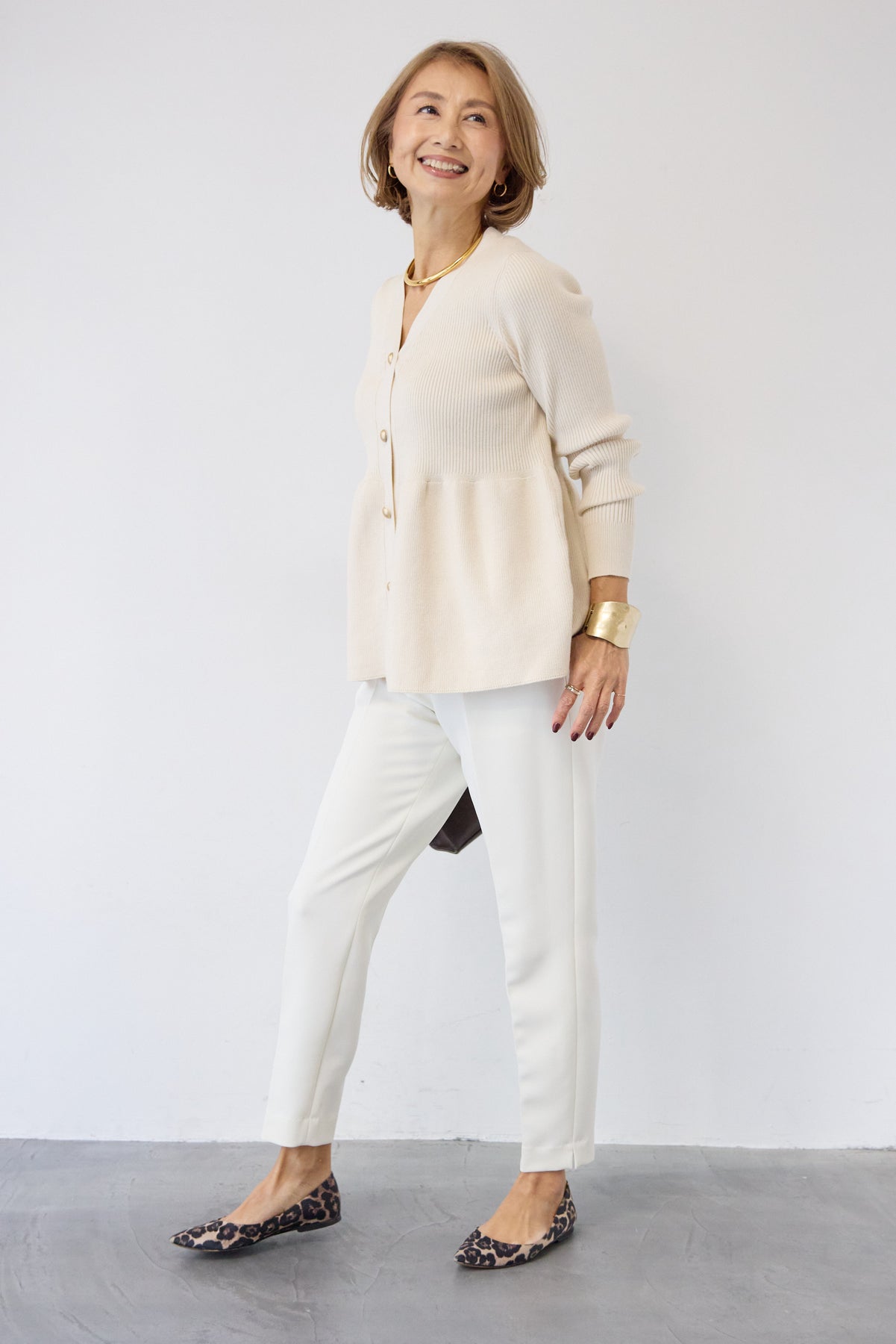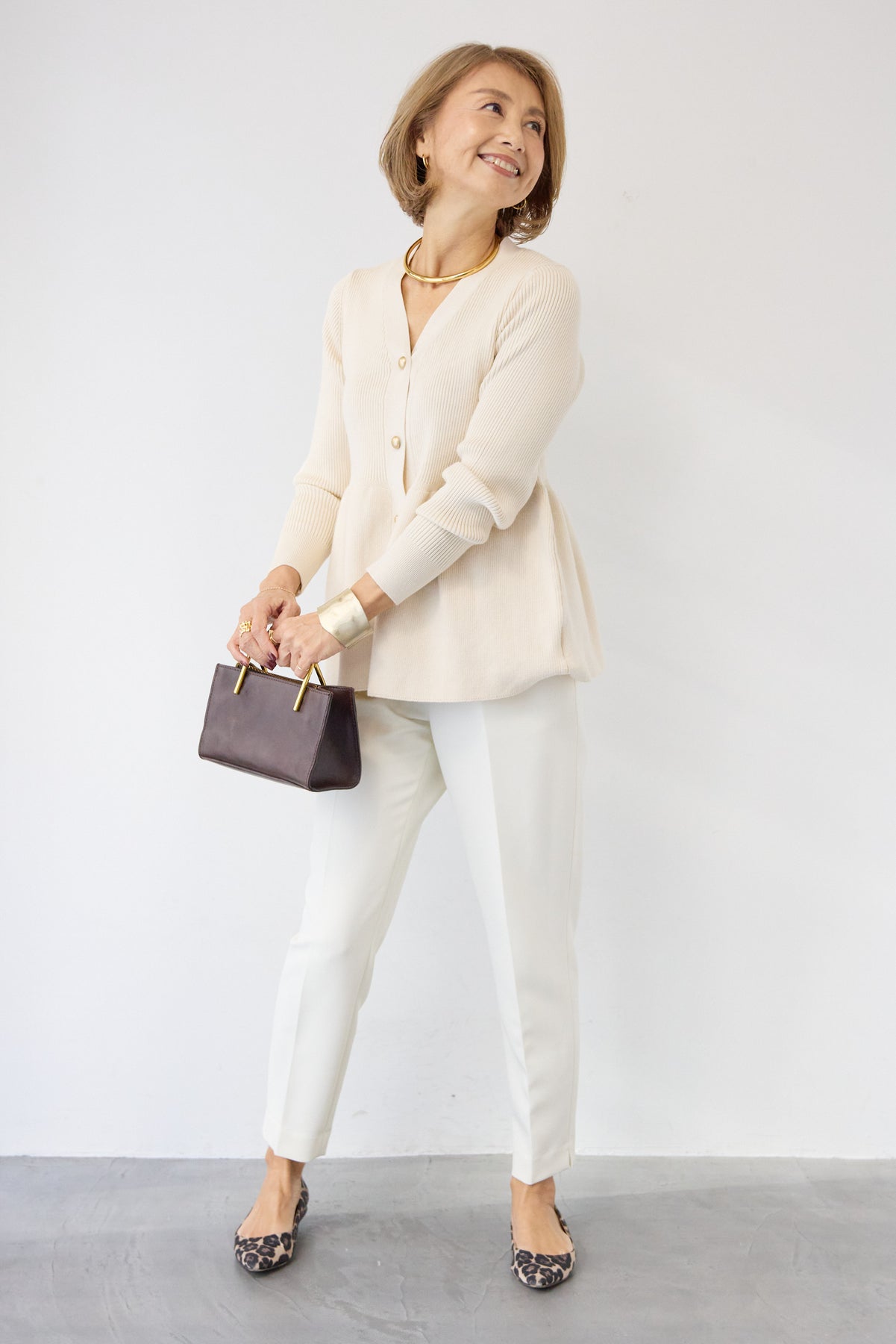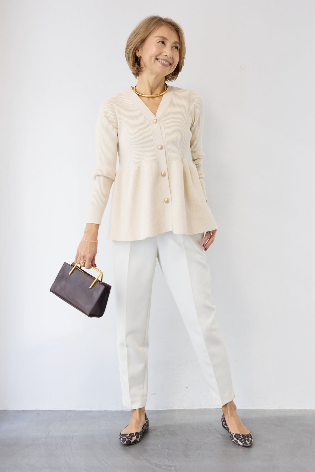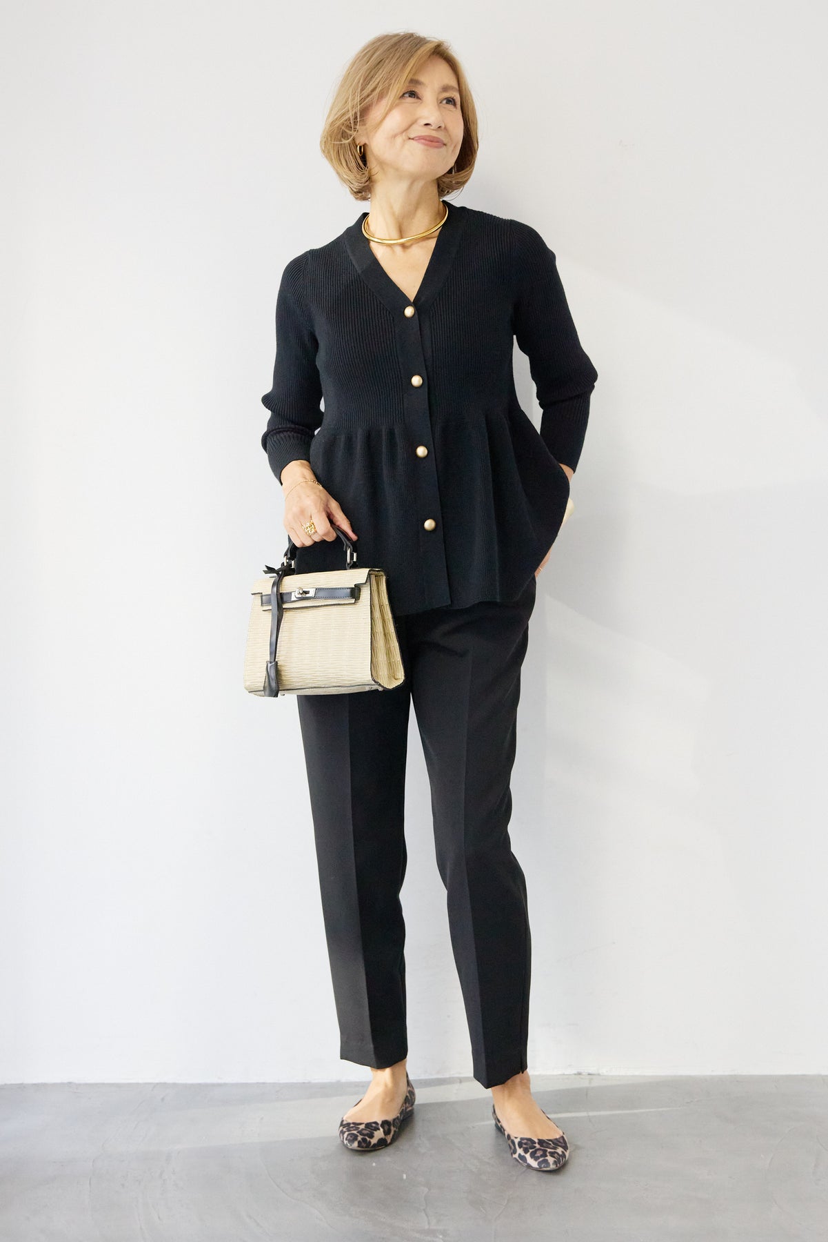 上品な華やかさと体型カバーを両立した、大人のためのペプラムニットカーディガン。縦畝のリブ編みがすっきりとした印象を与え、ウエスト切り替えから広がるペプラムシルエットが女性らしいラインを演出します。フロントには艶感のあるゴールドボタンをあしらい、シンプルながらもアクセサリー要らずの存在感。Vネックデザインで首元を美しく見せ、顔まわりをすっきりとした印象に仕上げています。程よく肉感のあるニット素材は、身体のラインを拾いにくく、ロングシーズン着用可能。パンツにもスカートにも合わせやすく、きれいめからカジュアルまで幅広いスタイリングに活躍します。