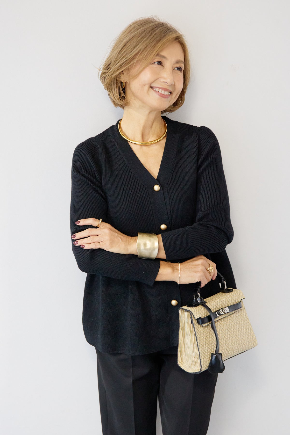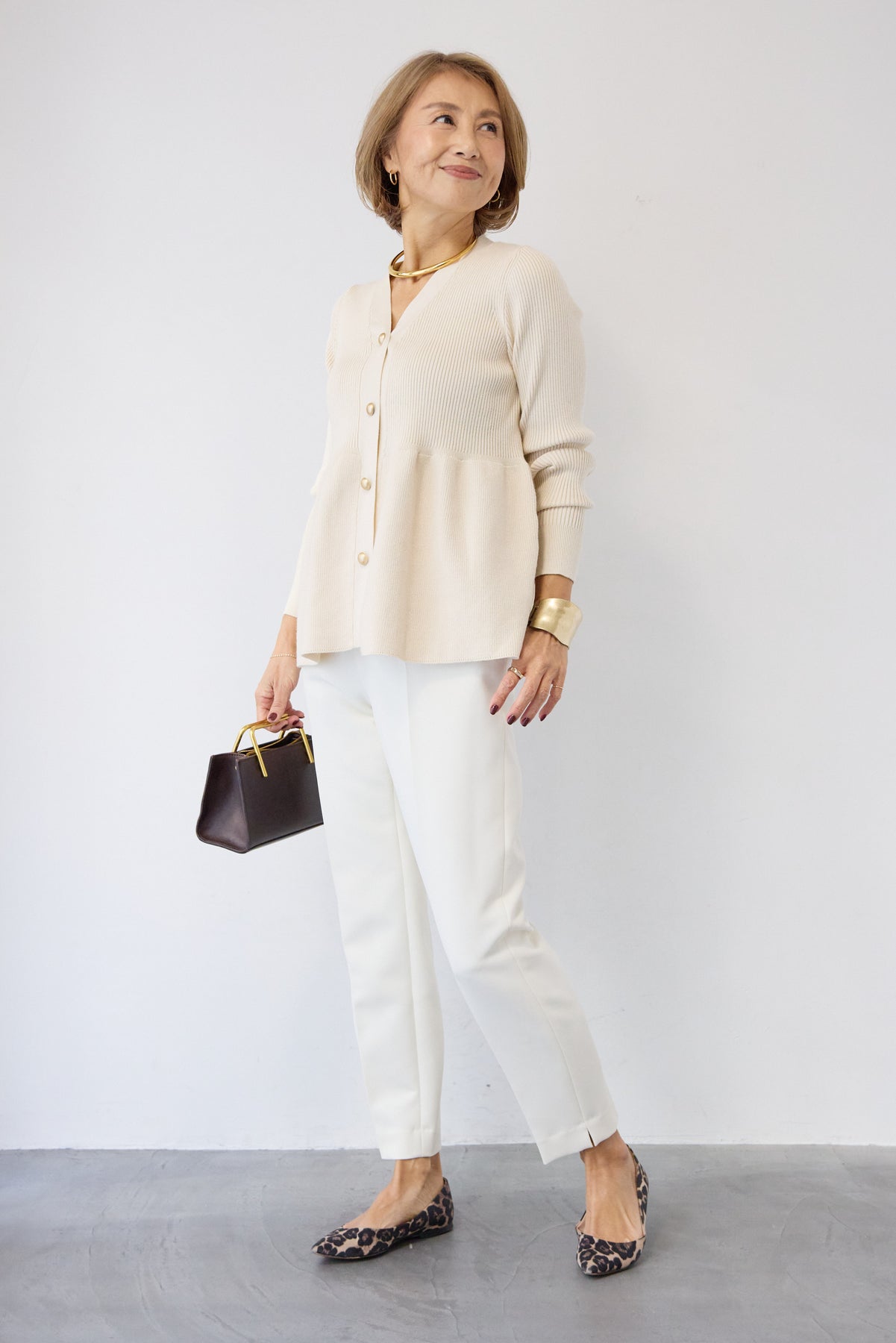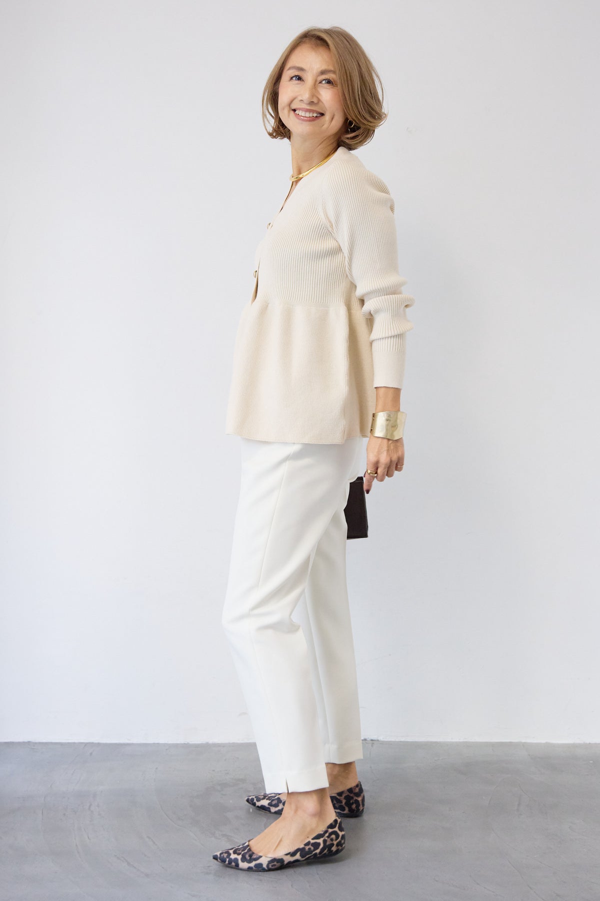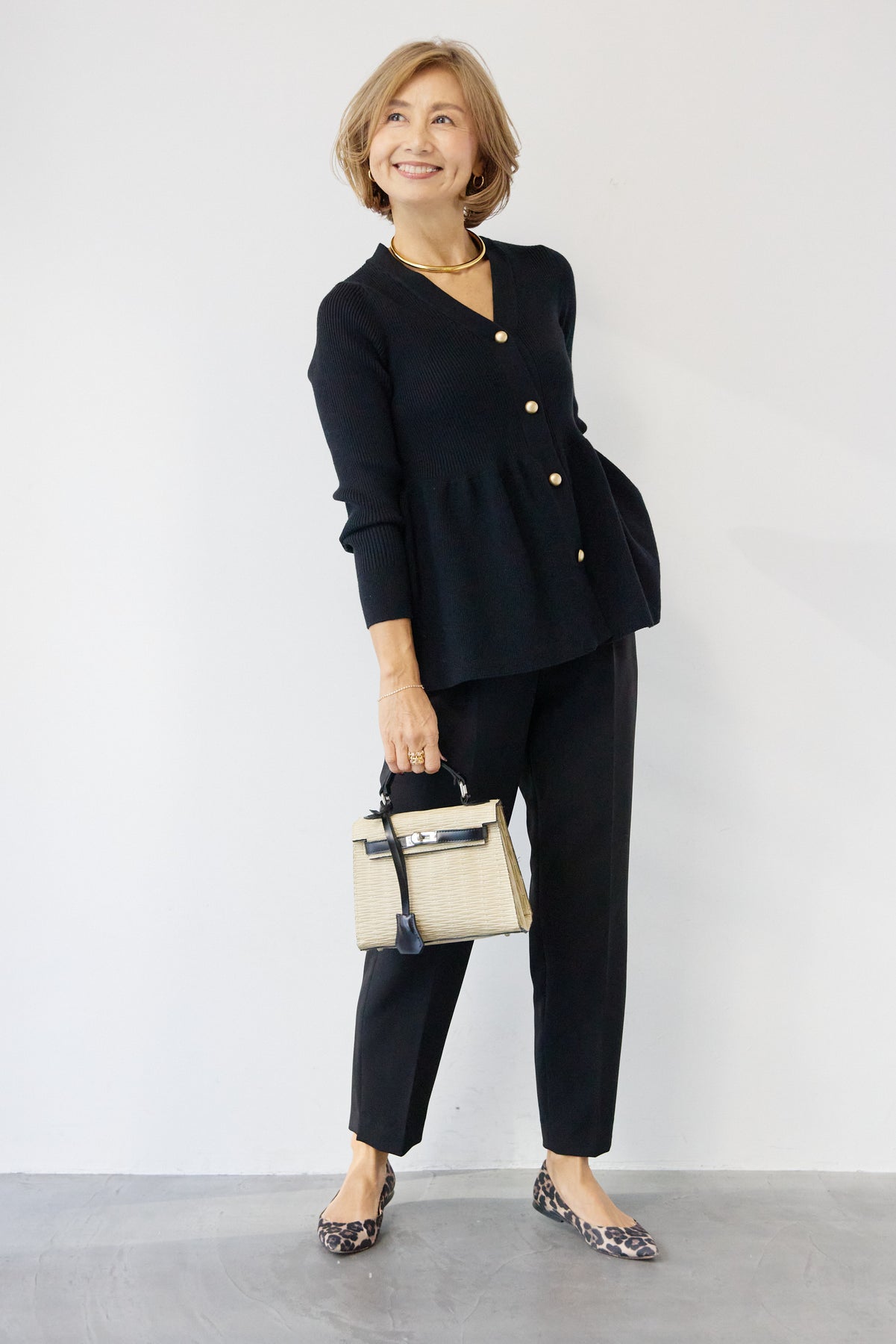 上品な華やかさと体型カバーを両立した、大人のためのペプラムニットカーディガン。縦畝のリブ編みがすっきりとした印象を与え、ウエスト切り替えから広がるペプラムシルエットが女性らしいラインを演出します。フロントには艶感のあるゴールドボタンをあしらい、シンプルながらもアクセサリー要らずの存在感。Vネックデザインで首元を美しく見せ、顔まわりをすっきりとした印象に仕上げています。程よく肉感のあるニット素材は、身体のラインを拾いにくく、ロングシーズン着用可能。パンツにもスカートにも合わせやすく、きれいめからカジュアルまで幅広いスタイリングに活躍します。