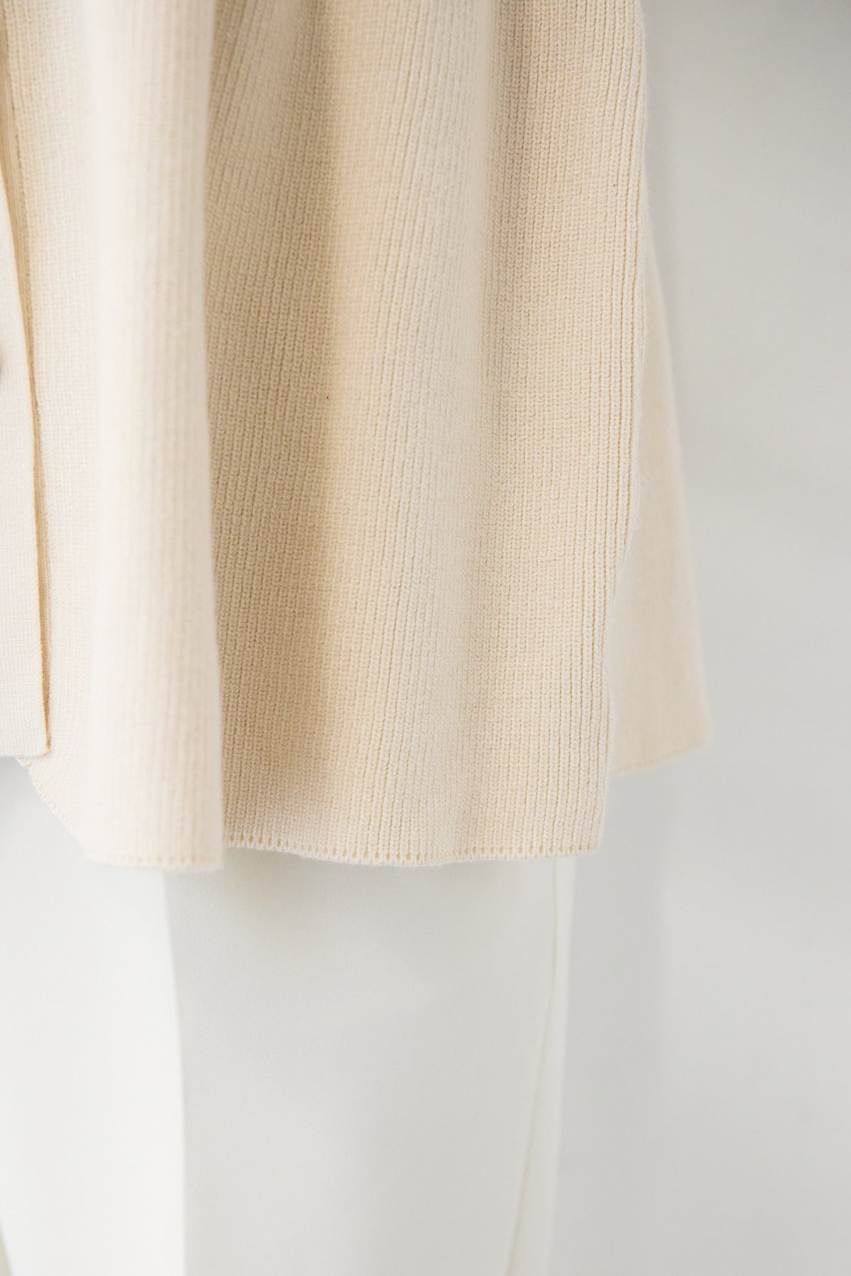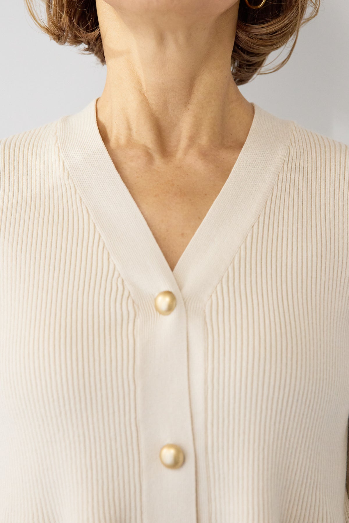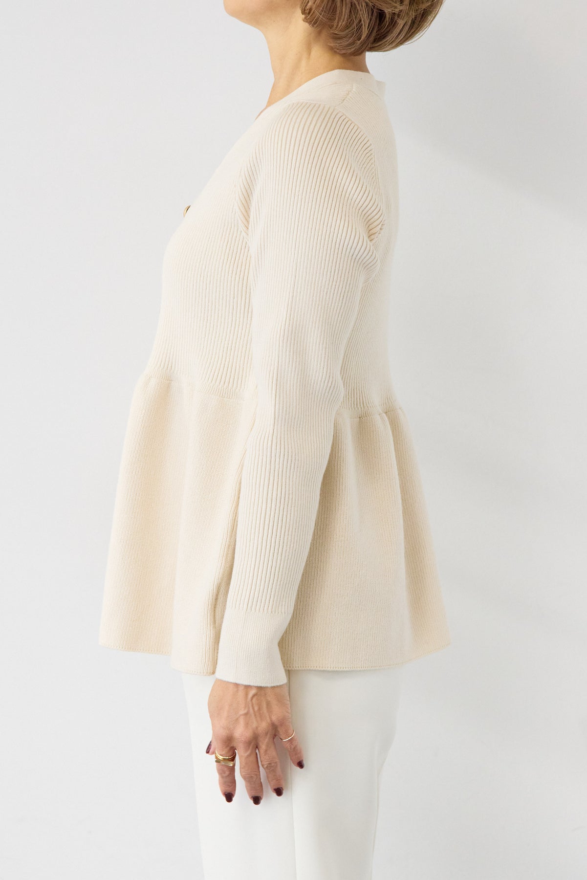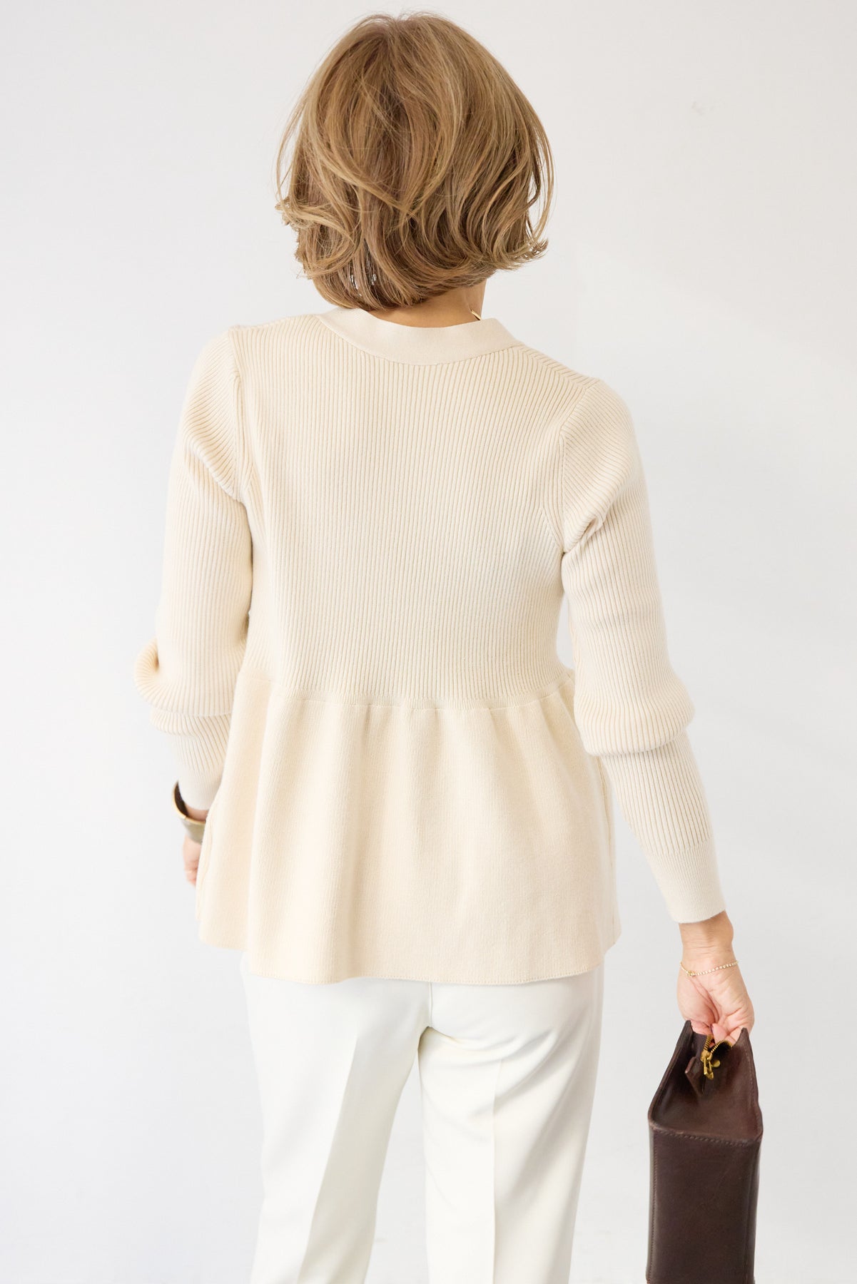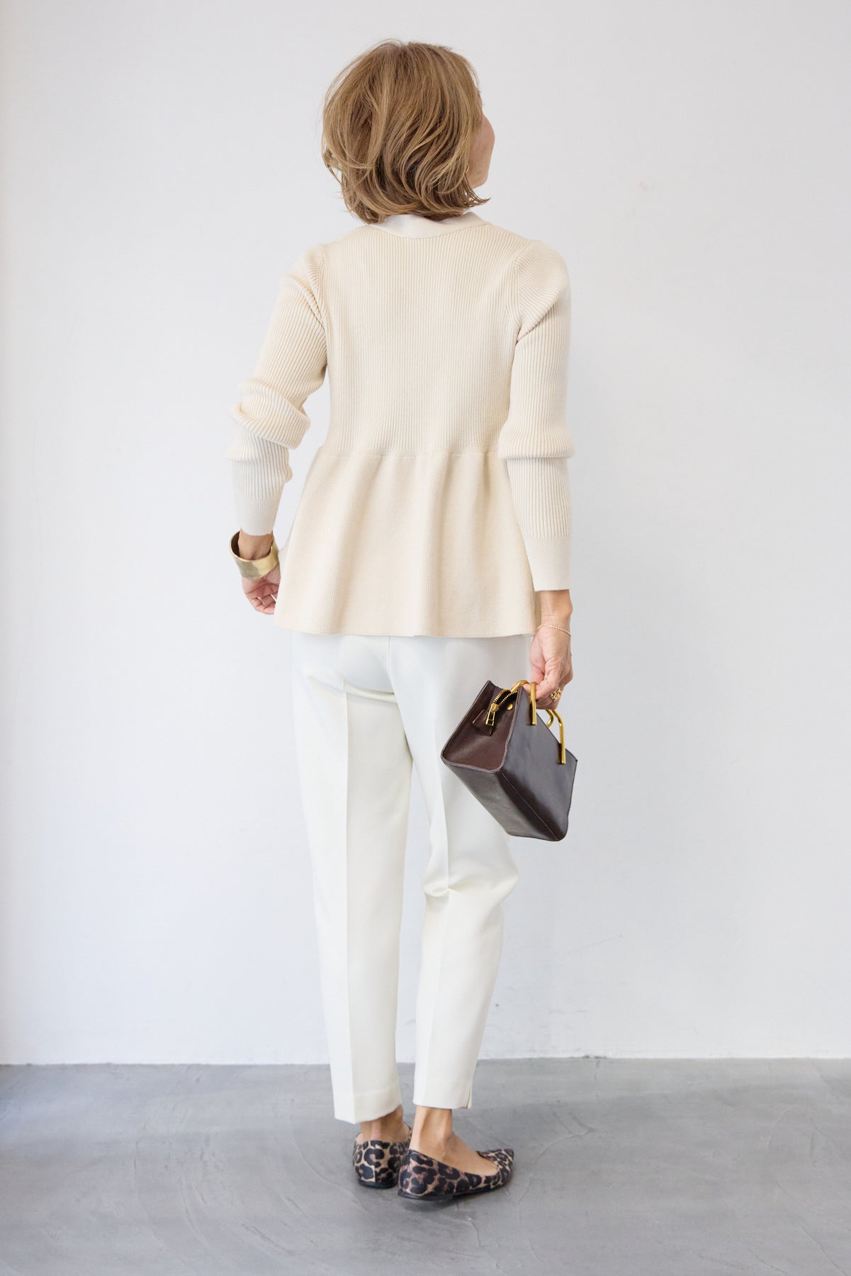 上品な華やかさと体型カバーを両立した、大人のためのペプラムニットカーディガン。縦畝のリブ編みがすっきりとした印象を与え、ウエスト切り替えから広がるペプラムシルエットが女性らしいラインを演出します。フロントには艶感のあるゴールドボタンをあしらい、シンプルながらもアクセサリー要らずの存在感。Vネックデザインで首元を美しく見せ、顔まわりをすっきりとした印象に仕上げています。程よく肉感のあるニット素材は、身体のラインを拾いにくく、ロングシーズン着用可能。パンツにもスカートにも合わせやすく、きれいめからカジュアルまで幅広いスタイリングに活躍します。