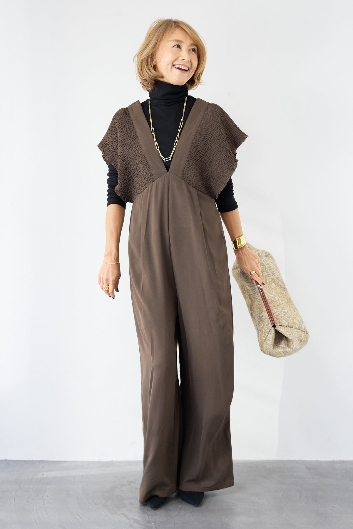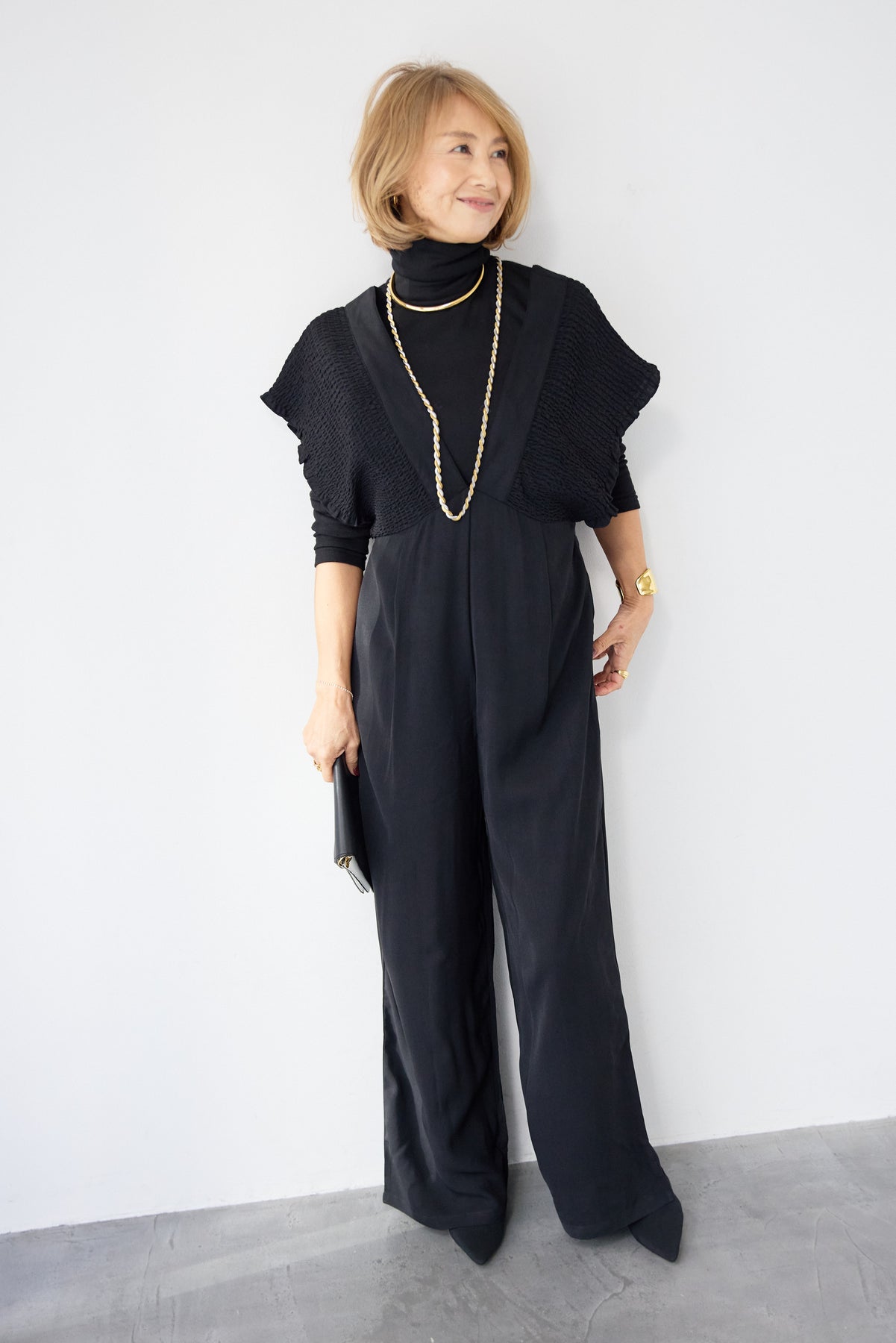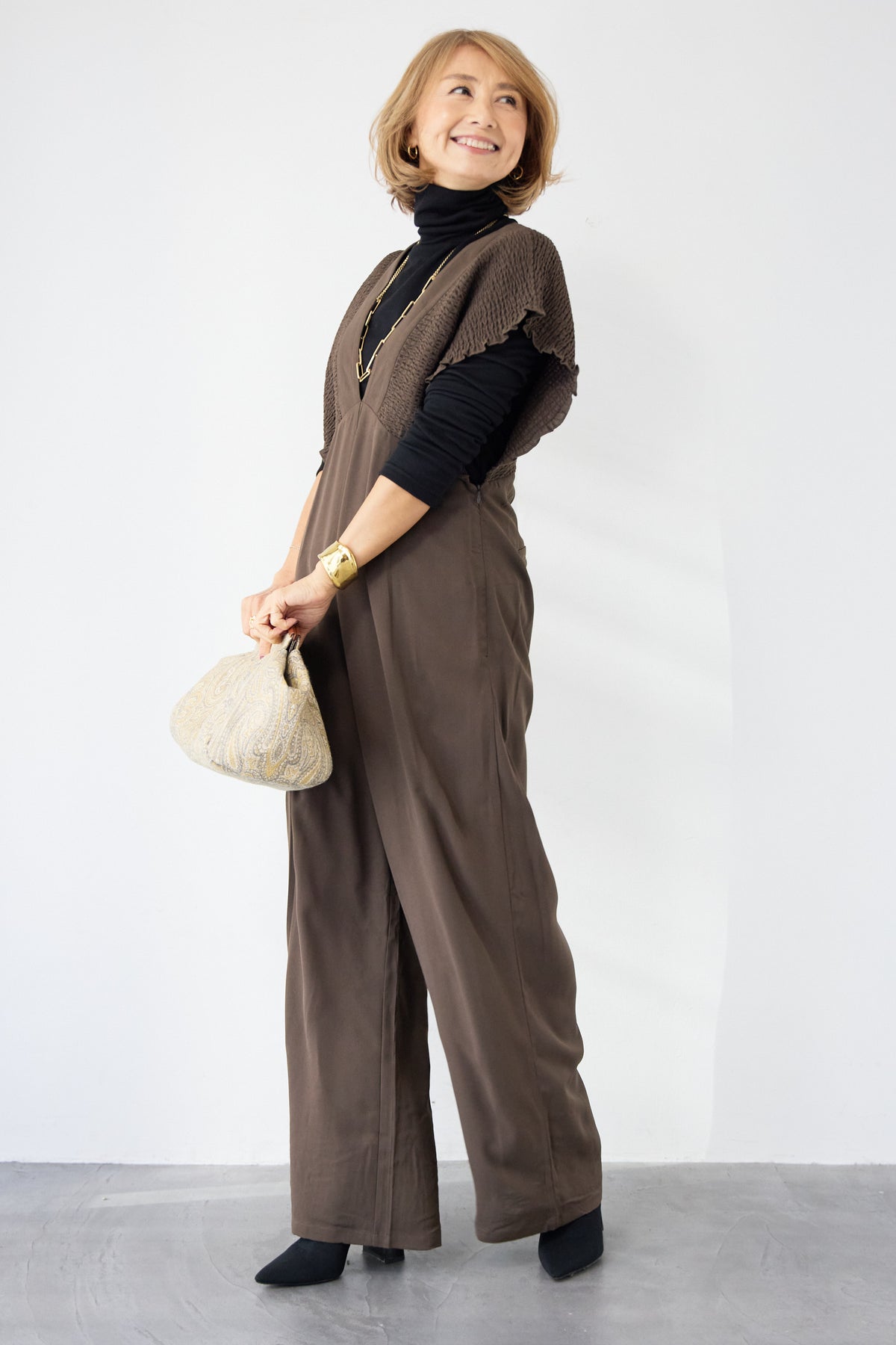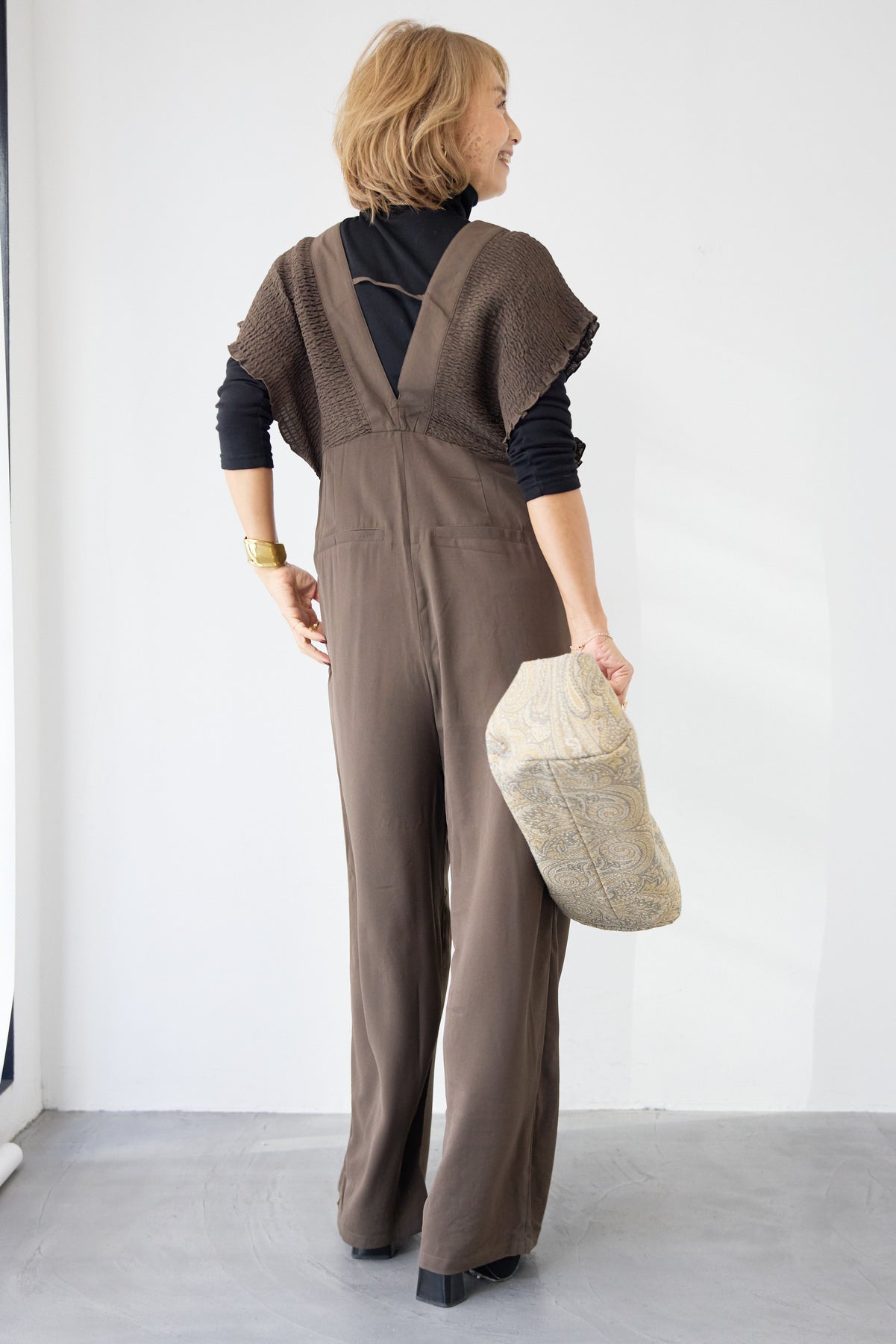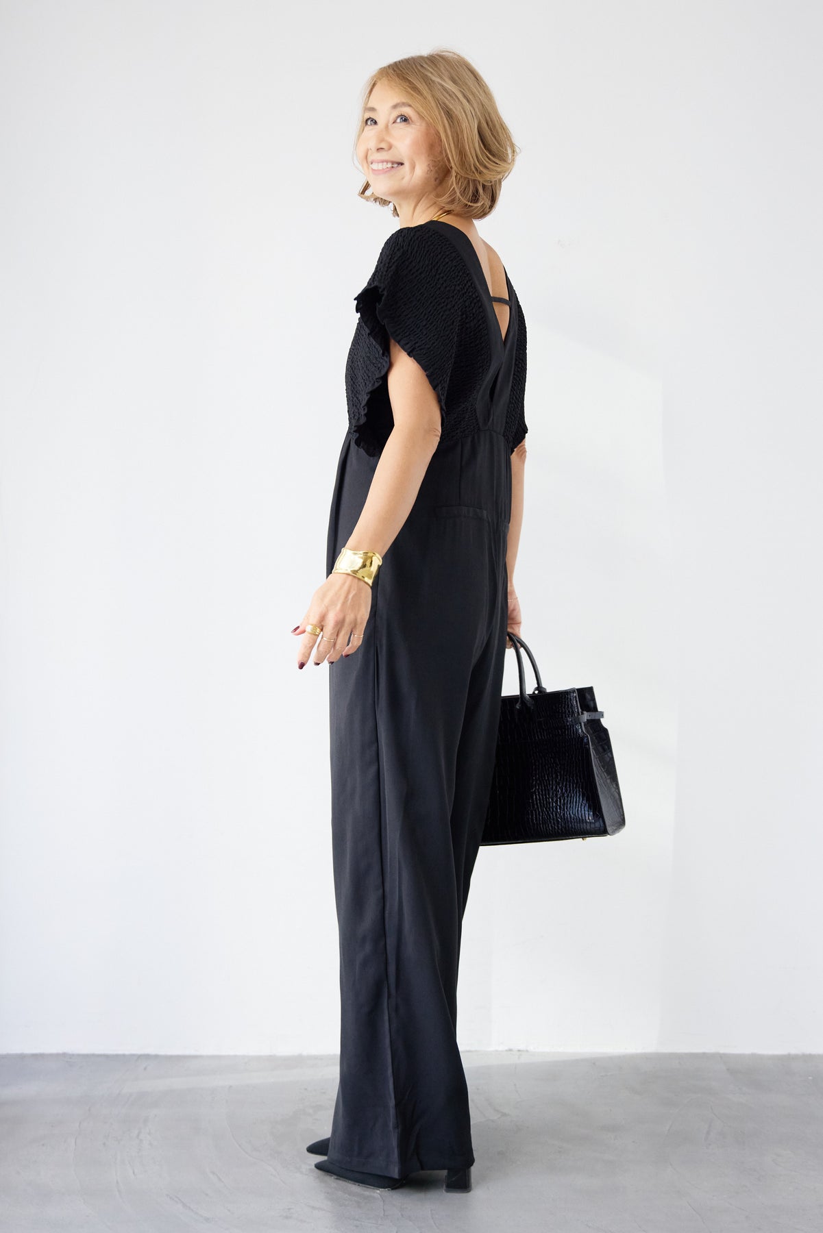 立体感のあるシャーリングデザインで華やかな印象の深Vネックサロペット。 深めVネックデザインが顔周りをすっきりと見せ、ドライタッチで落ち感のある薄手の素材にすとんと落ちるシルエットが大人っぽく演出してくれます。 ヒップやパンツ部分はゆとりがあり、ラインを拾わず締め付けられないのでリラックスした着心地です◎ フレンチスリーブで、気になる二の腕もカバーしてくれるのも嬉しいポイントです。 ショルダー部分が落ちにくい様、シルエットを保つために背中にバンド付きなので安心して着用できます。 後ろはフェイクポケットでシンプルな見た目に立体感をプラスしました。