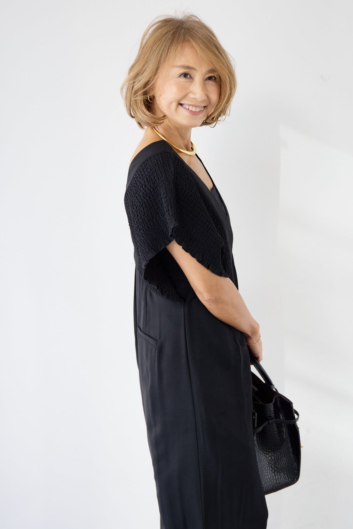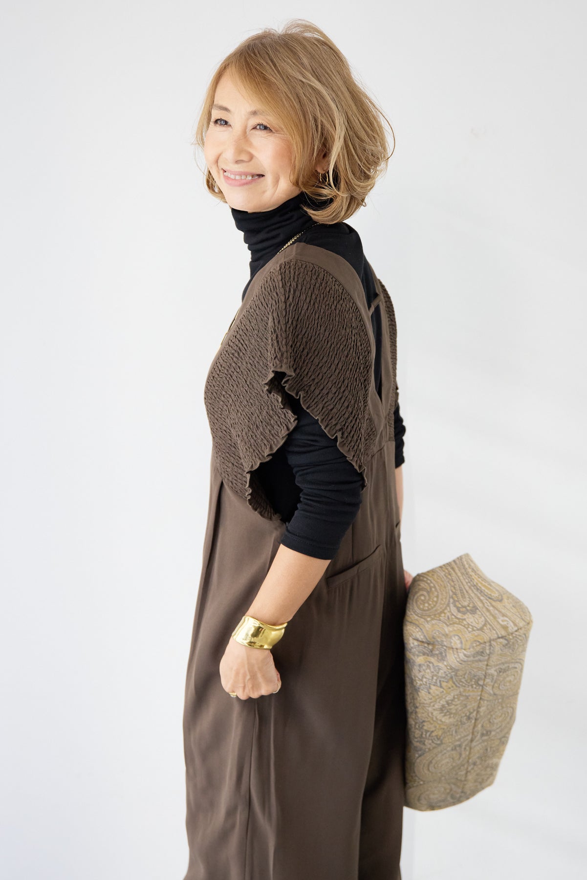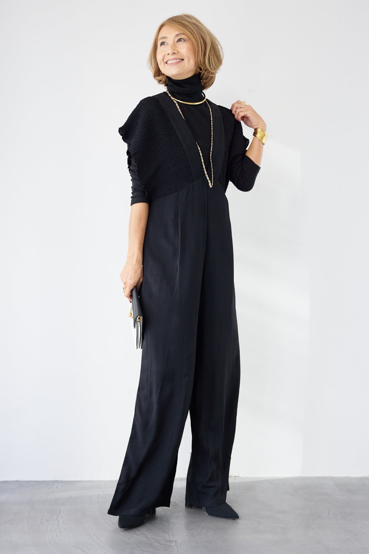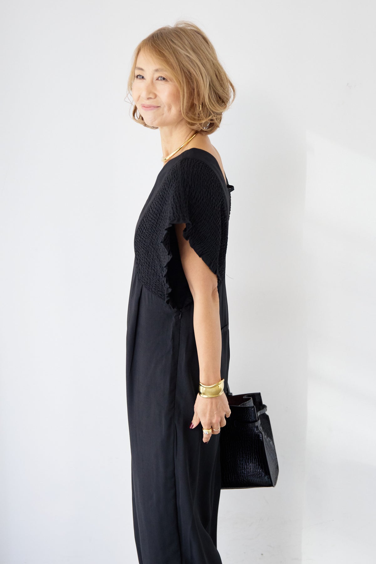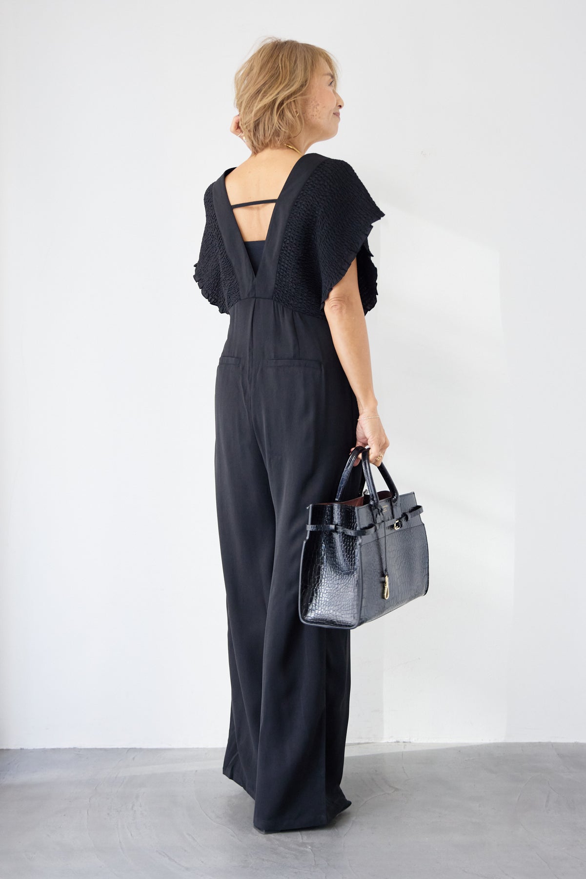 立体感のあるシャーリングデザインで華やかな印象の深Vネックサロペット。 深めVネックデザインが顔周りをすっきりと見せ、ドライタッチで落ち感のある薄手の素材にすとんと落ちるシルエットが大人っぽく演出してくれます。 ヒップやパンツ部分はゆとりがあり、ラインを拾わず締め付けられないのでリラックスした着心地です◎ フレンチスリーブで、気になる二の腕もカバーしてくれるのも嬉しいポイントです。 ショルダー部分が落ちにくい様、シルエットを保つために背中にバンド付きなので安心して着用できます。 後ろはフェイクポケットでシンプルな見た目に立体感をプラスしました。