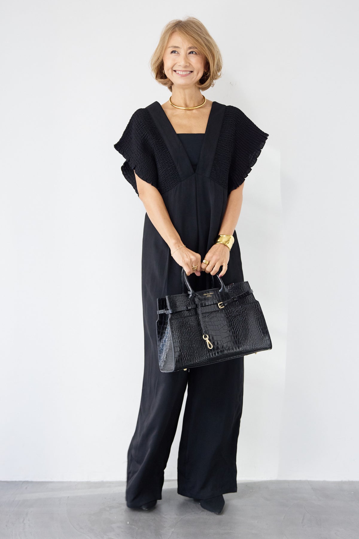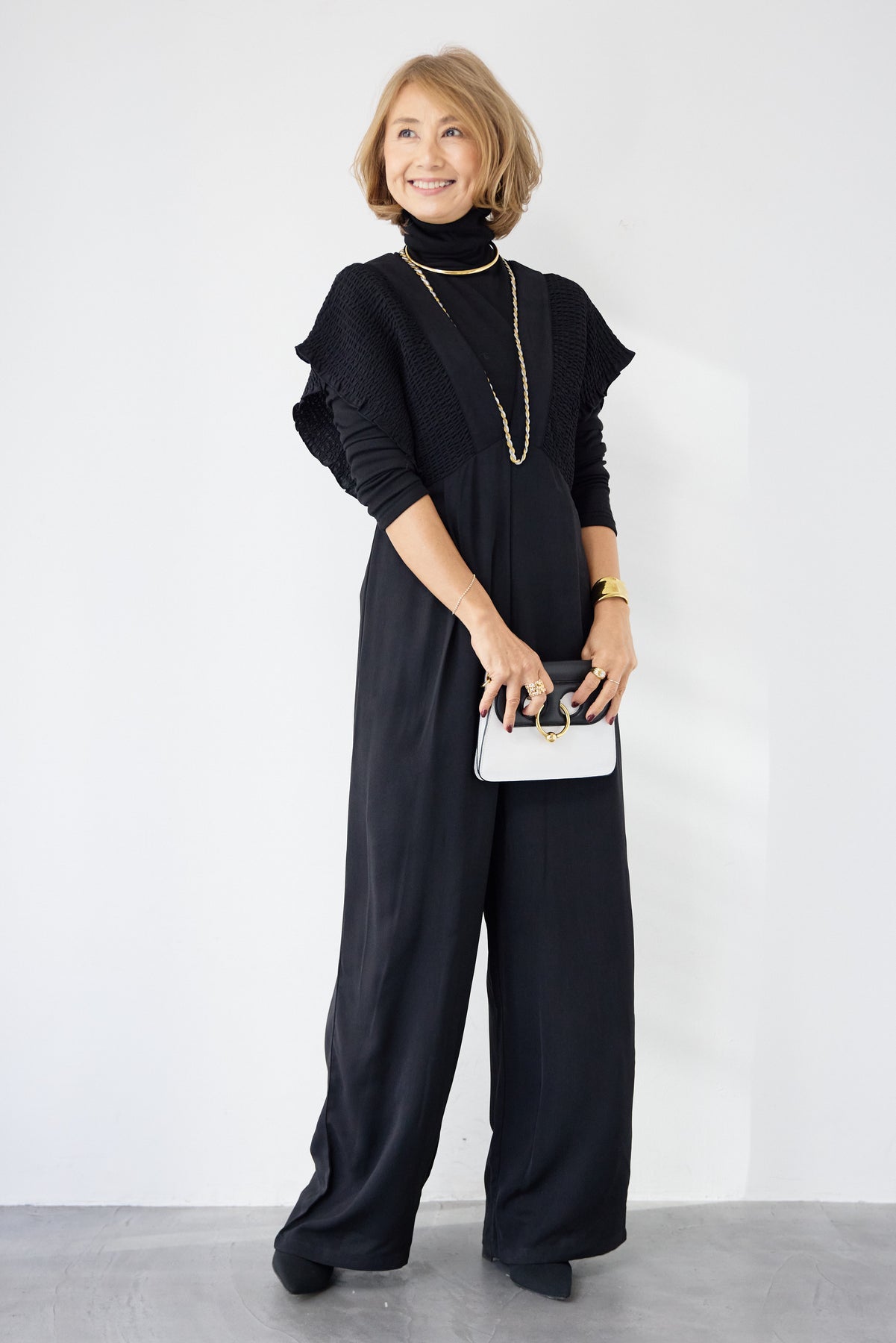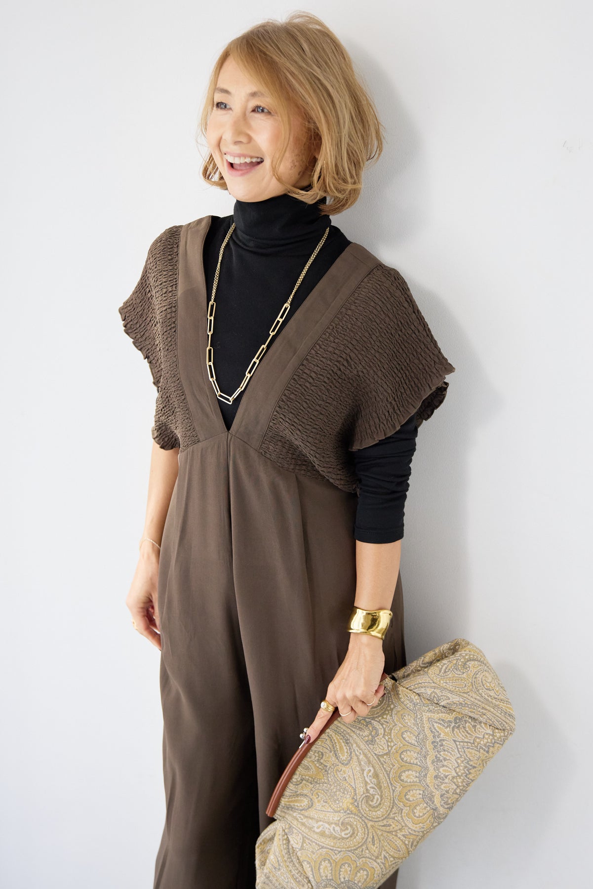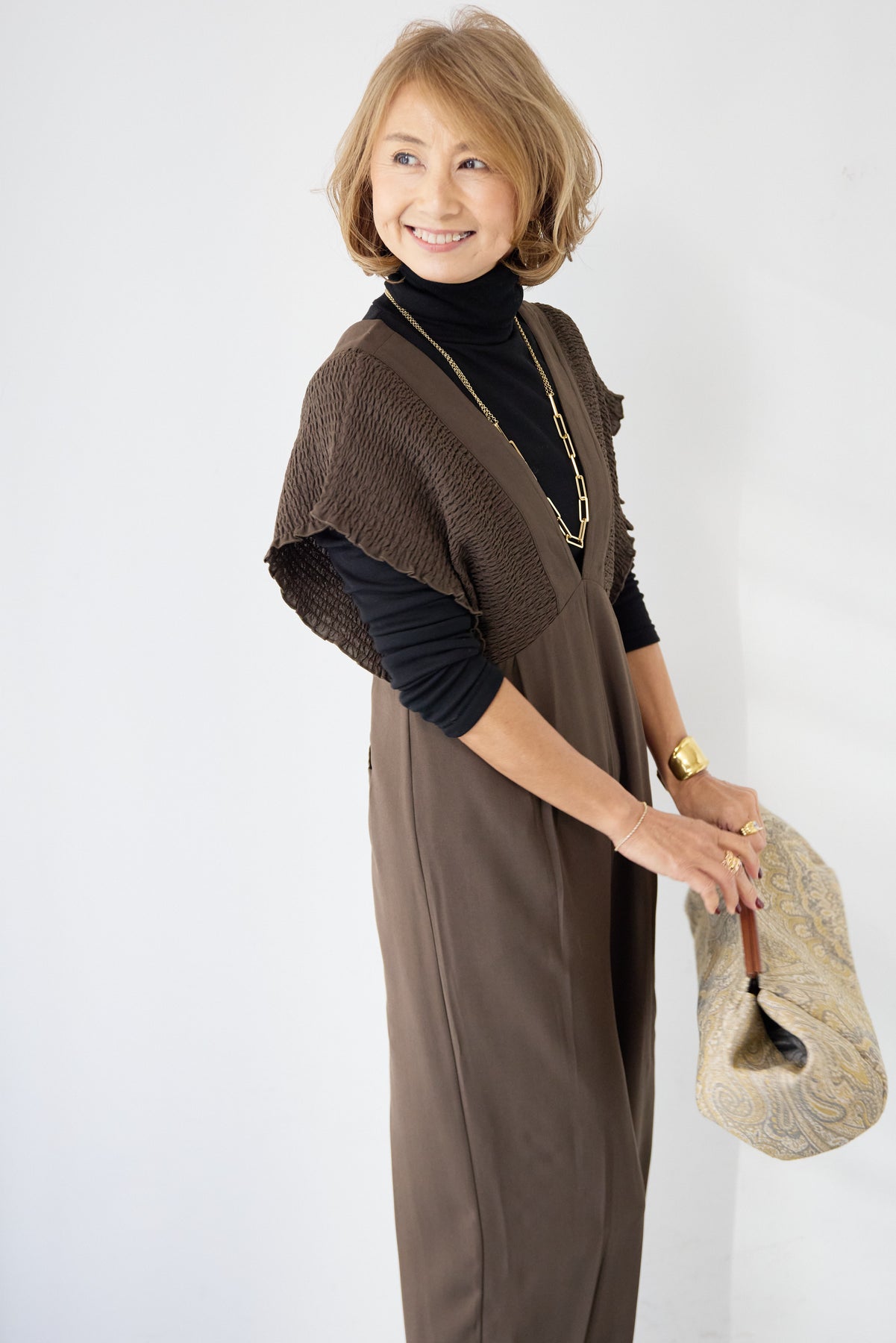 立体感のあるシャーリングデザインで華やかな印象の深Vネックサロペット。 深めVネックデザインが顔周りをすっきりと見せ、ドライタッチで落ち感のある薄手の素材にすとんと落ちるシルエットが大人っぽく演出してくれます。 ヒップやパンツ部分はゆとりがあり、ラインを拾わず締め付けられないのでリラックスした着心地です◎ フレンチスリーブで、気になる二の腕もカバーしてくれるのも嬉しいポイントです。 ショルダー部分が落ちにくい様、シルエットを保つために背中にバンド付きなので安心して着用できます。 後ろはフェイクポケットでシンプルな見た目に立体感をプラスしました。