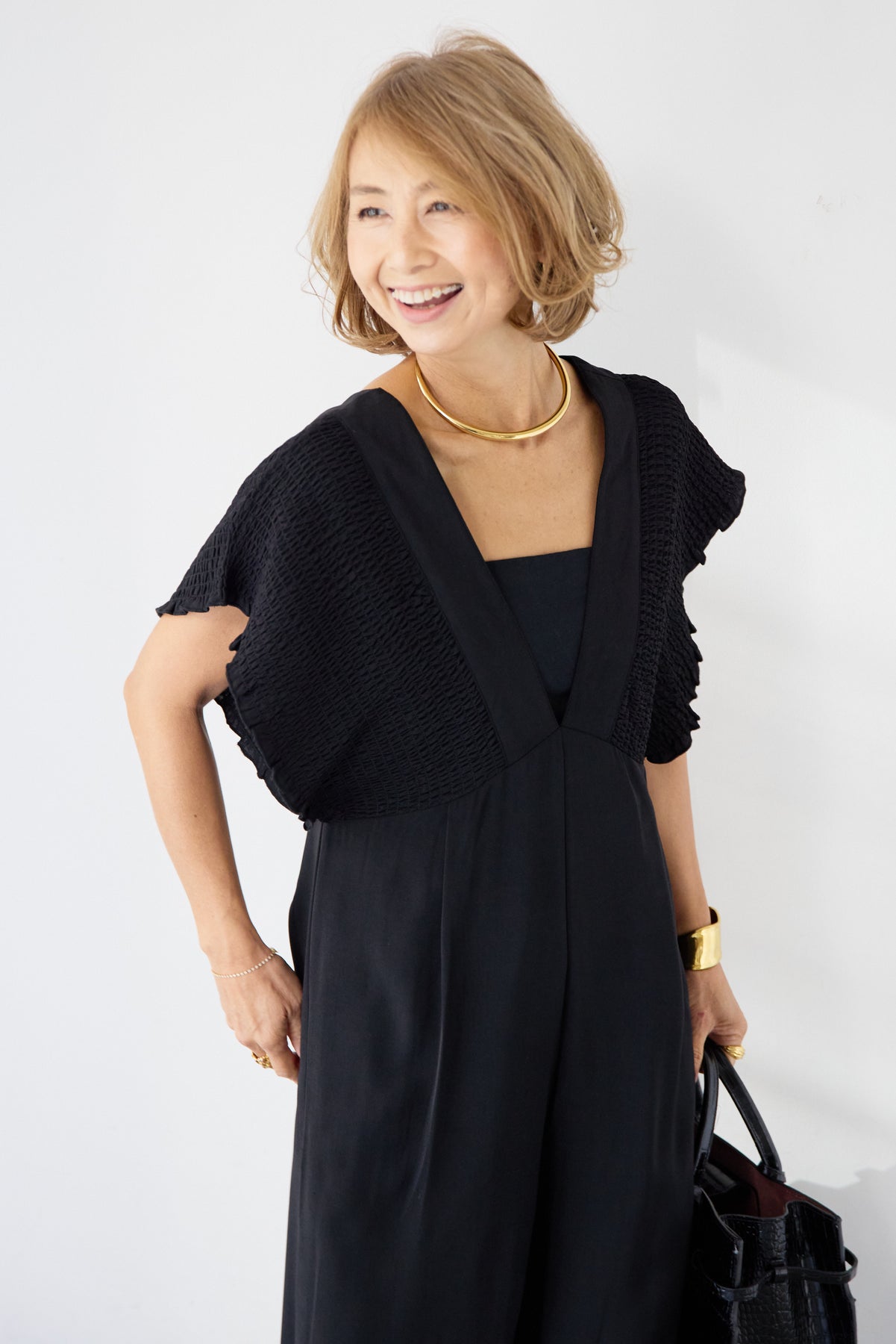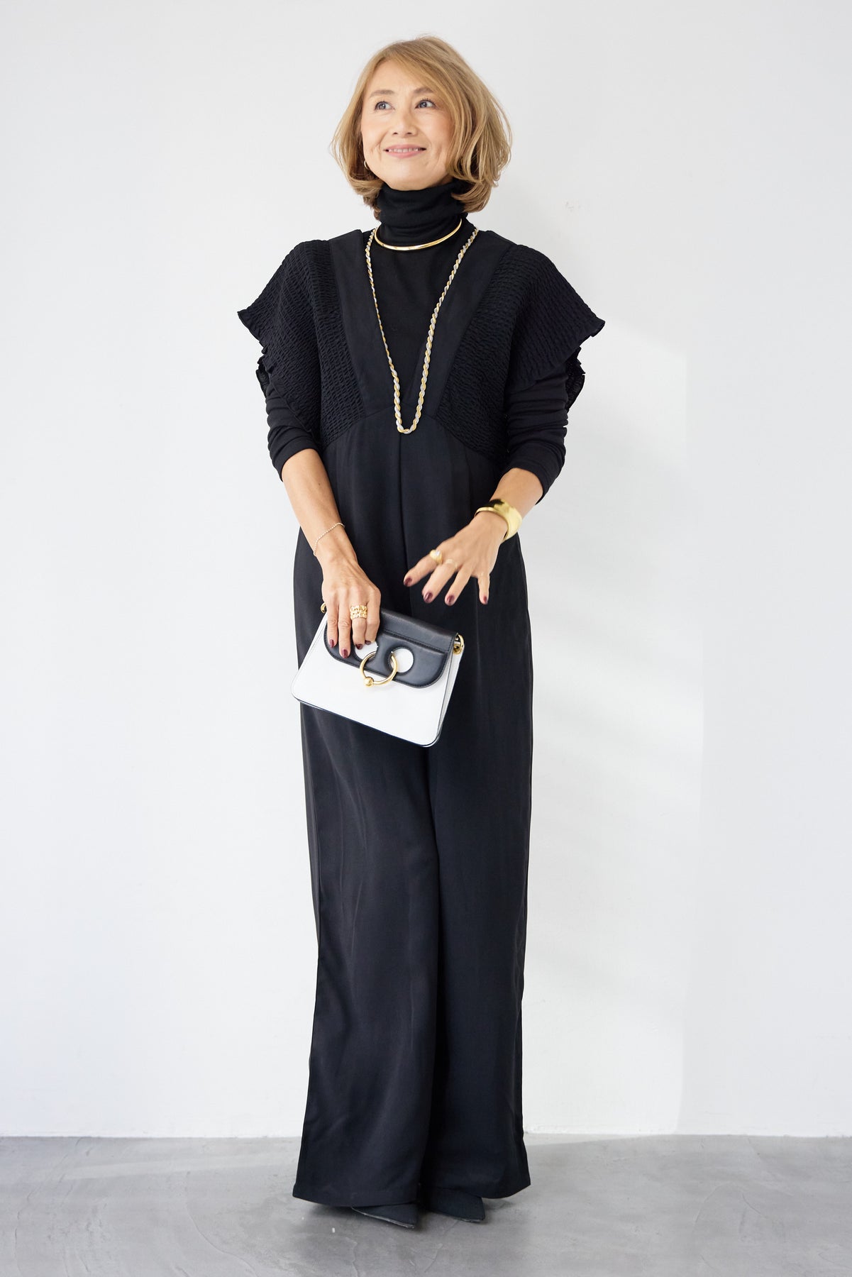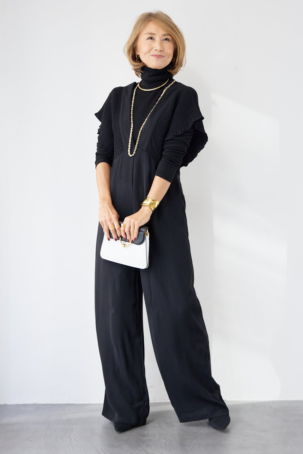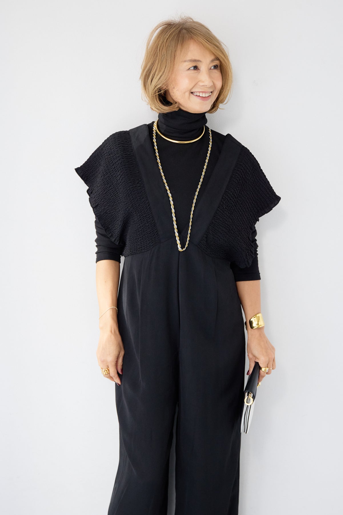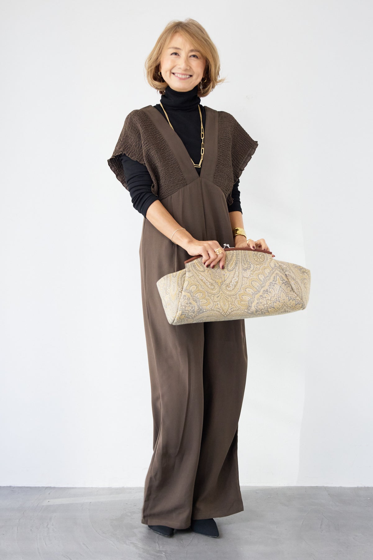 立体感のあるシャーリングデザインで華やかな印象の深Vネックサロペット。 深めVネックデザインが顔周りをすっきりと見せ、ドライタッチで落ち感のある薄手の素材にすとんと落ちるシルエットが大人っぽく演出してくれます。 ヒップやパンツ部分はゆとりがあり、ラインを拾わず締め付けられないのでリラックスした着心地です◎ フレンチスリーブで、気になる二の腕もカバーしてくれるのも嬉しいポイントです。 ショルダー部分が落ちにくい様、シルエットを保つために背中にバンド付きなので安心して着用できます。 後ろはフェイクポケットでシンプルな見た目に立体感をプラスしました。