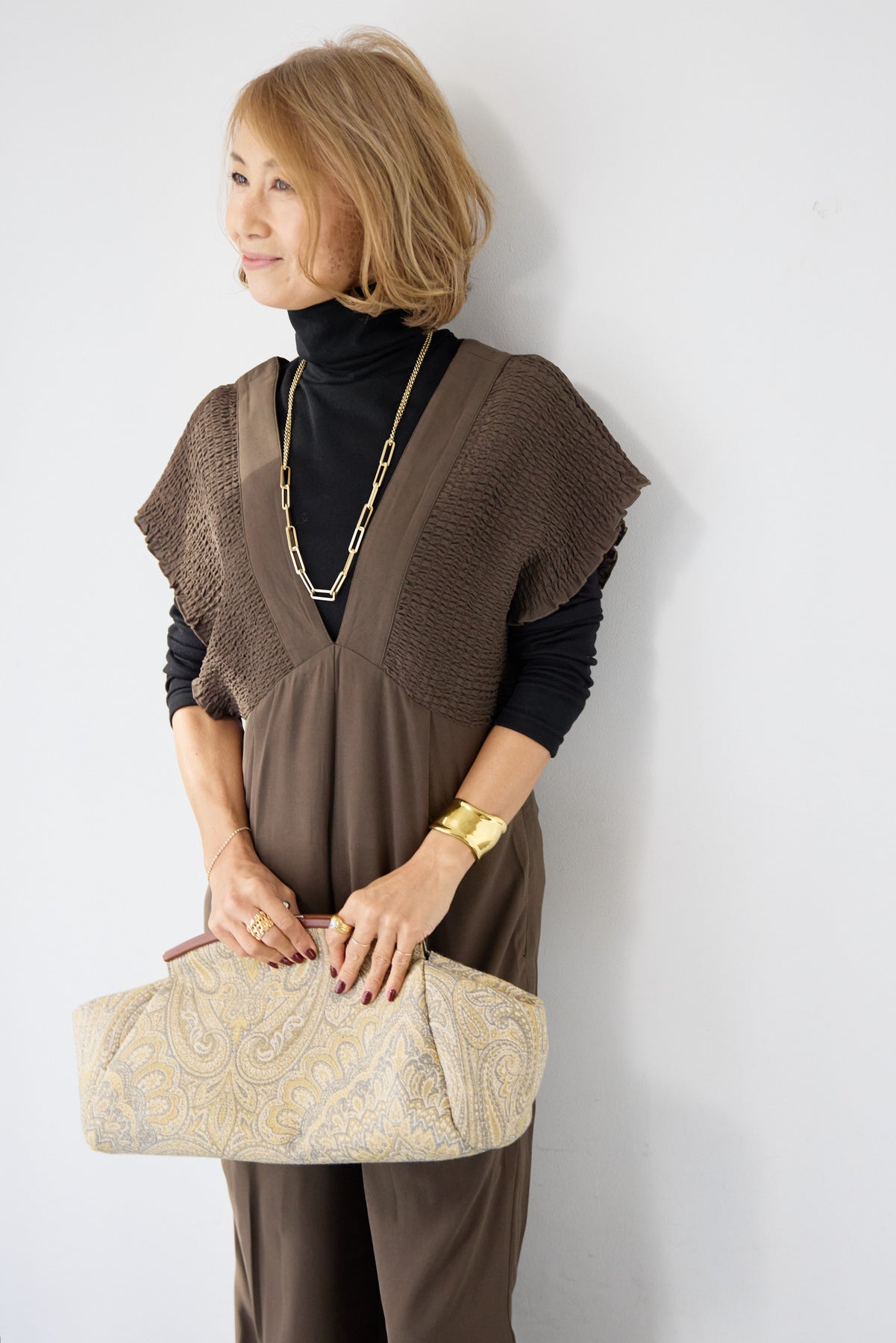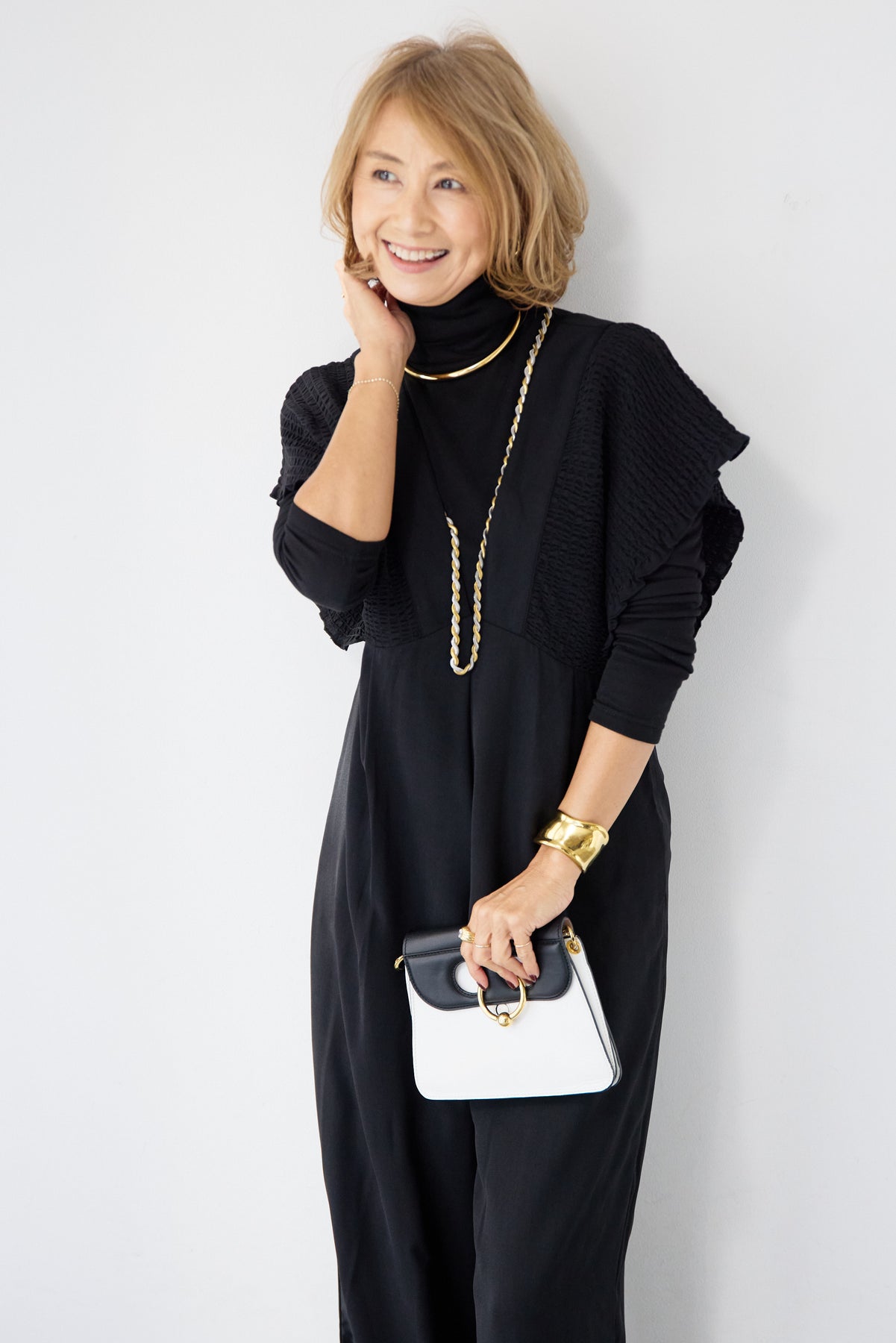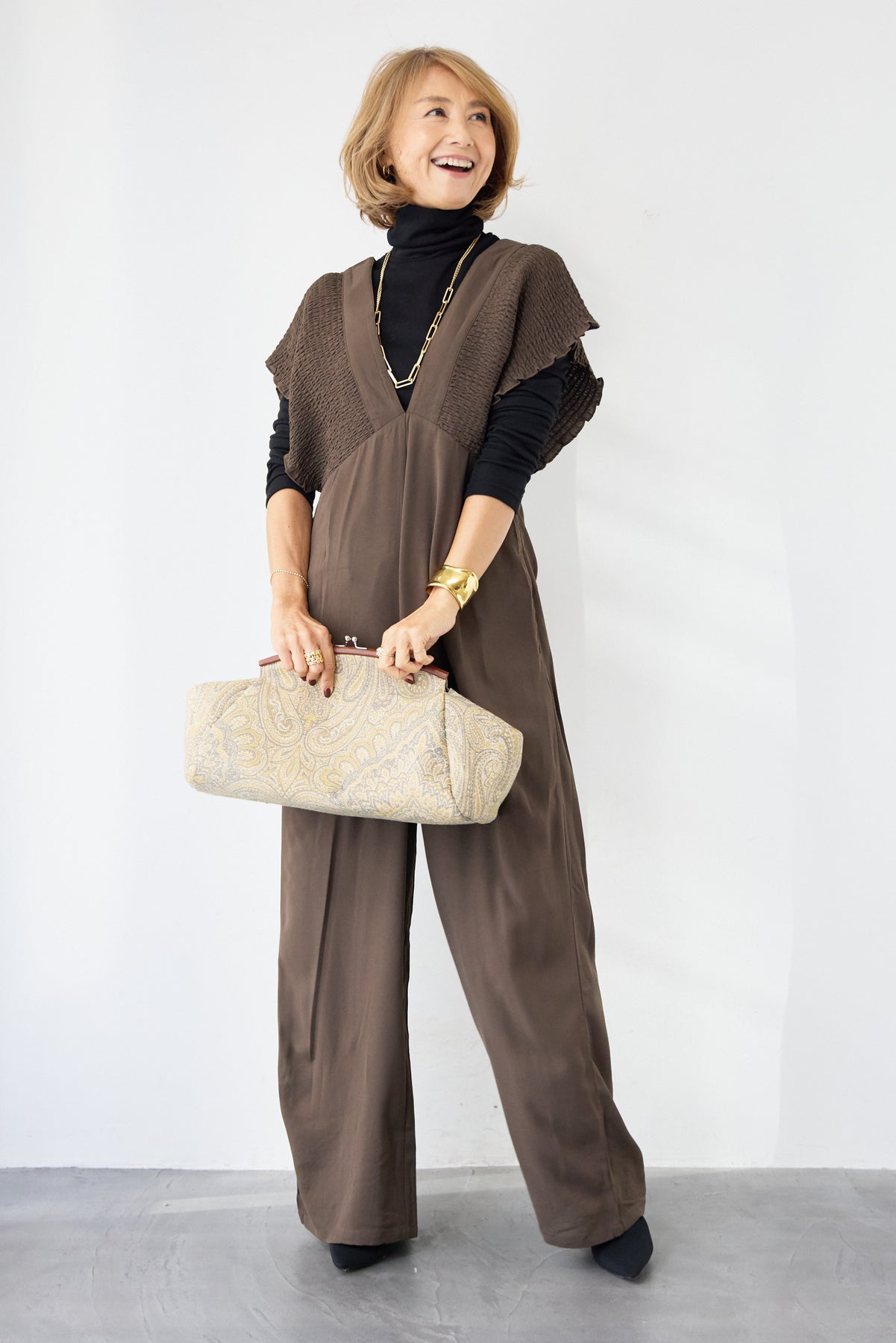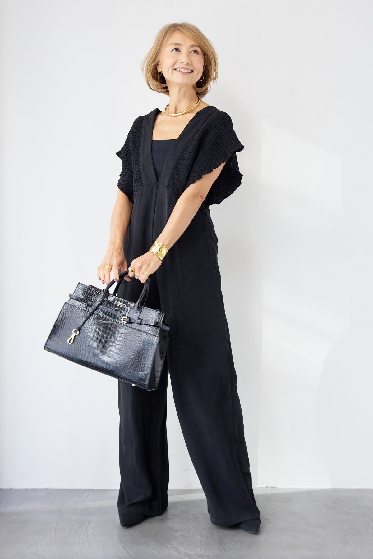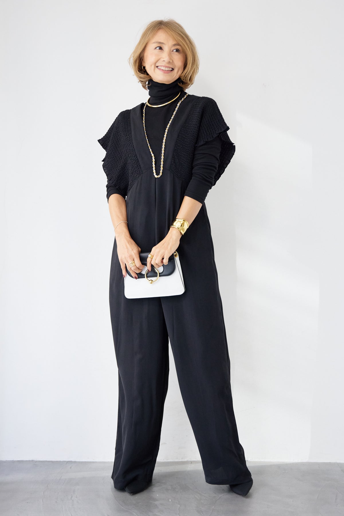 立体感のあるシャーリングデザインで華やかな印象の深Vネックサロペット。 深めVネックデザインが顔周りをすっきりと見せ、ドライタッチで落ち感のある薄手の素材にすとんと落ちるシルエットが大人っぽく演出してくれます。 ヒップやパンツ部分はゆとりがあり、ラインを拾わず締め付けられないのでリラックスした着心地です◎ フレンチスリーブで、気になる二の腕もカバーしてくれるのも嬉しいポイントです。 ショルダー部分が落ちにくい様、シルエットを保つために背中にバンド付きなので安心して着用できます。 後ろはフェイクポケットでシンプルな見た目に立体感をプラスしました。