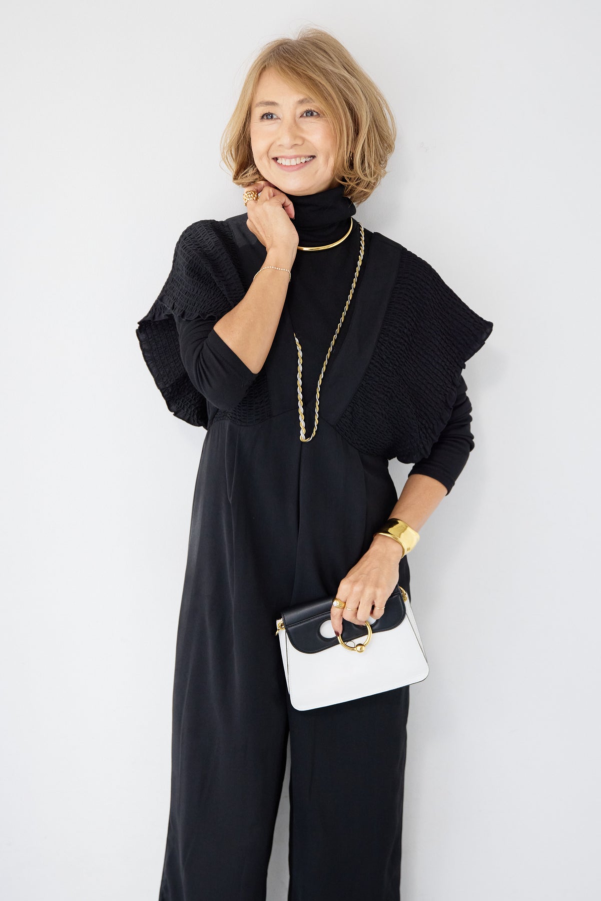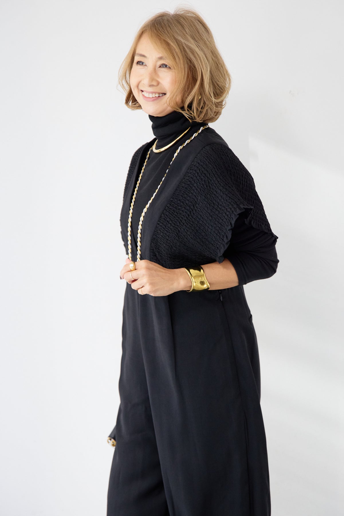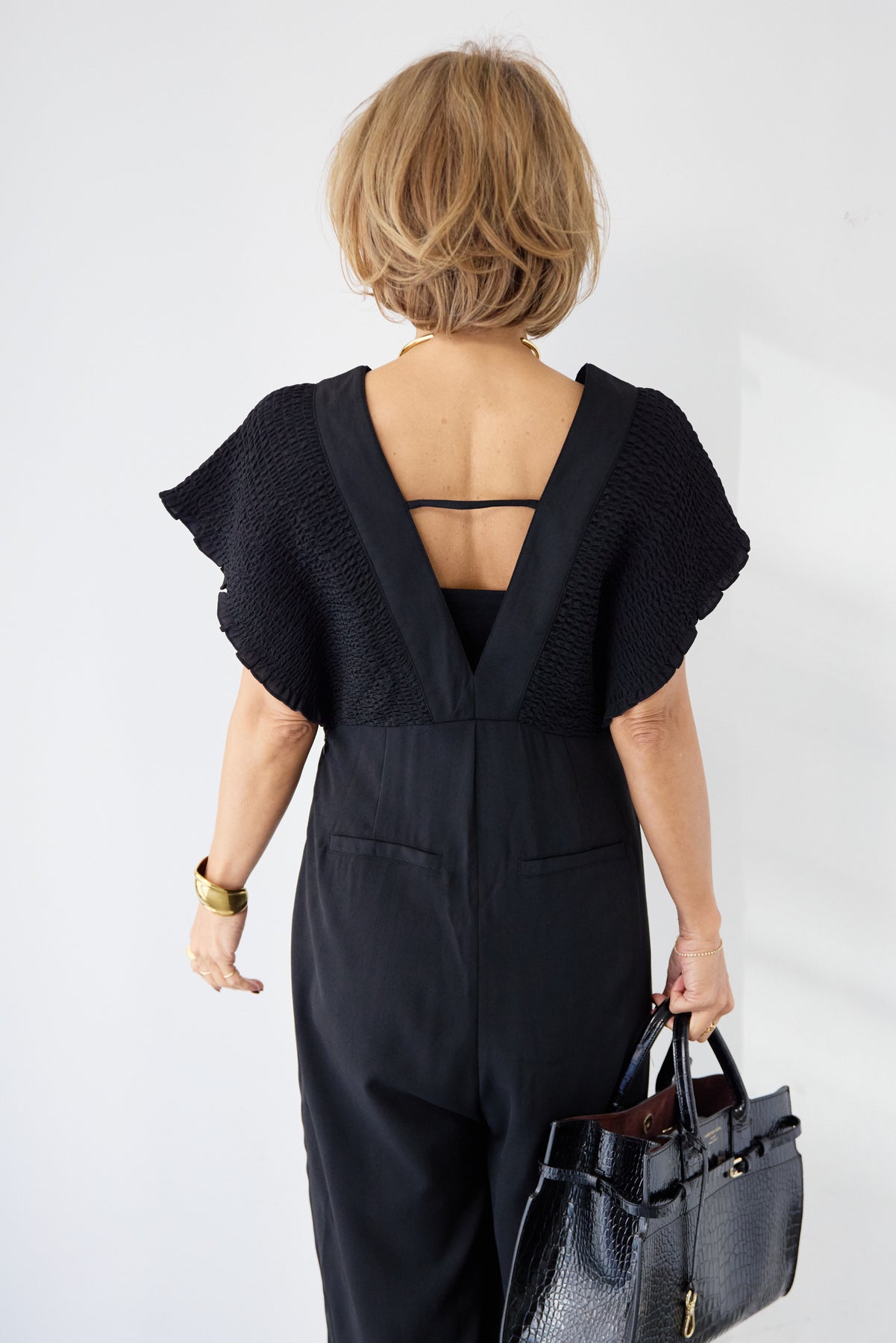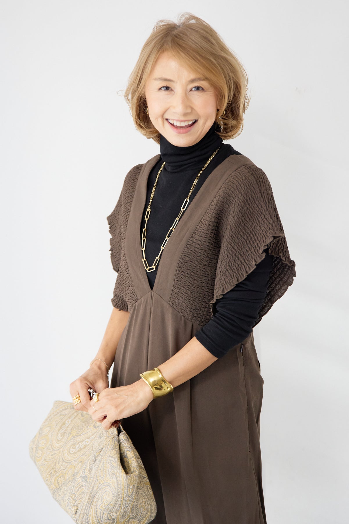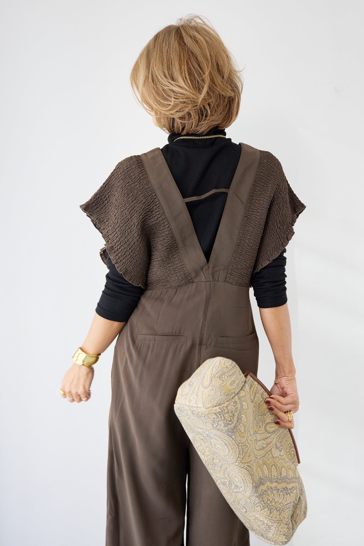 立体感のあるシャーリングデザインで華やかな印象の深Vネックサロペット。 深めVネックデザインが顔周りをすっきりと見せ、ドライタッチで落ち感のある薄手の素材にすとんと落ちるシルエットが大人っぽく演出してくれます。 ヒップやパンツ部分はゆとりがあり、ラインを拾わず締め付けられないのでリラックスした着心地です◎ フレンチスリーブで、気になる二の腕もカバーしてくれるのも嬉しいポイントです。 ショルダー部分が落ちにくい様、シルエットを保つために背中にバンド付きなので安心して着用できます。 後ろはフェイクポケットでシンプルな見た目に立体感をプラスしました。