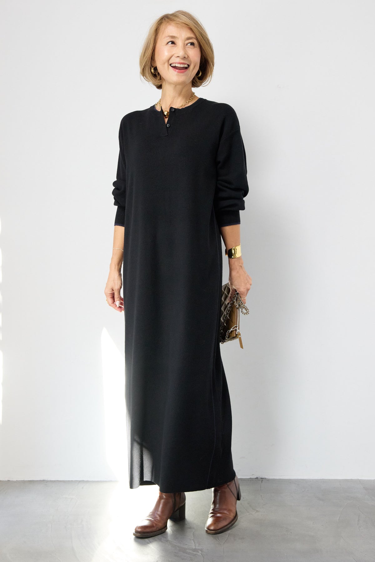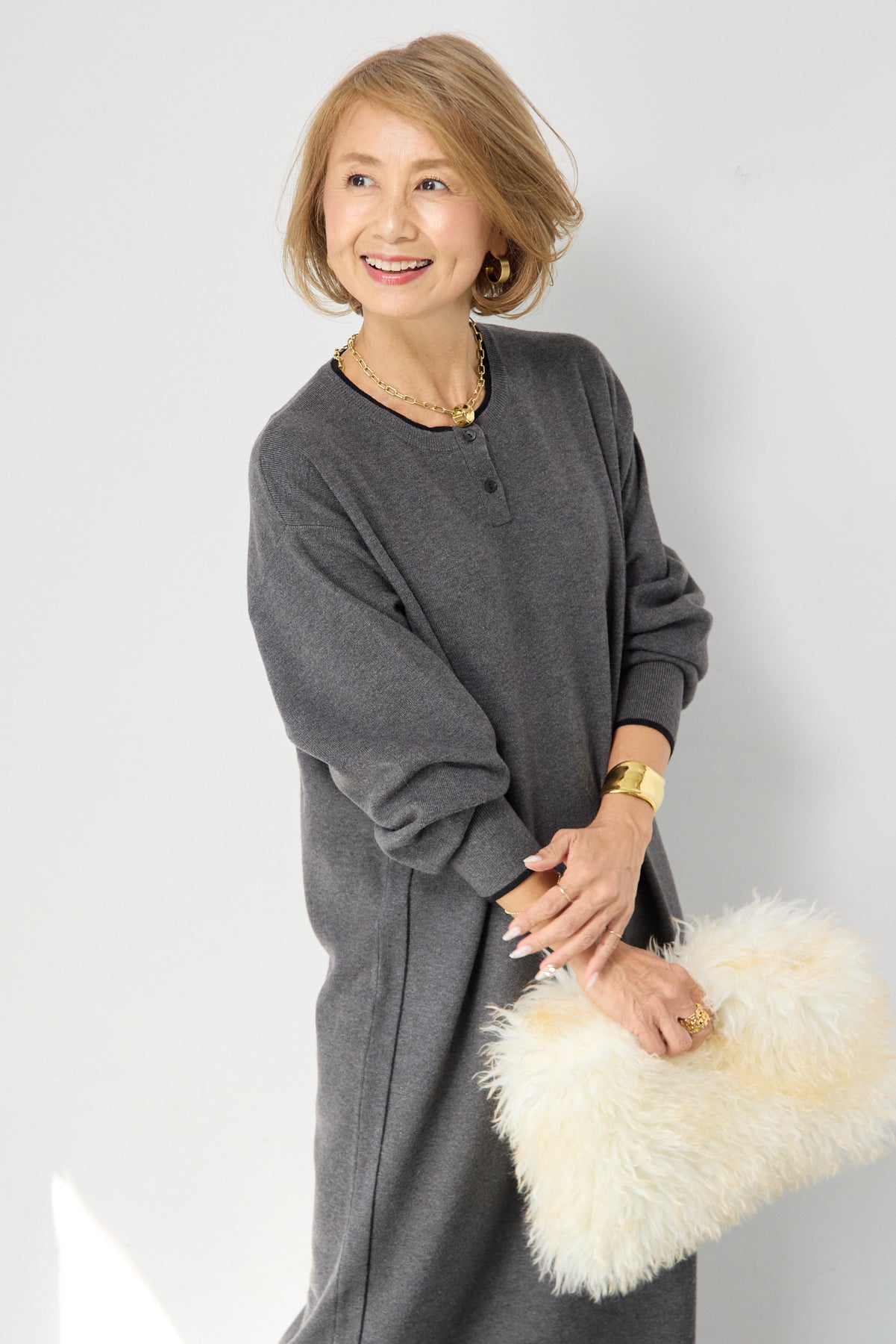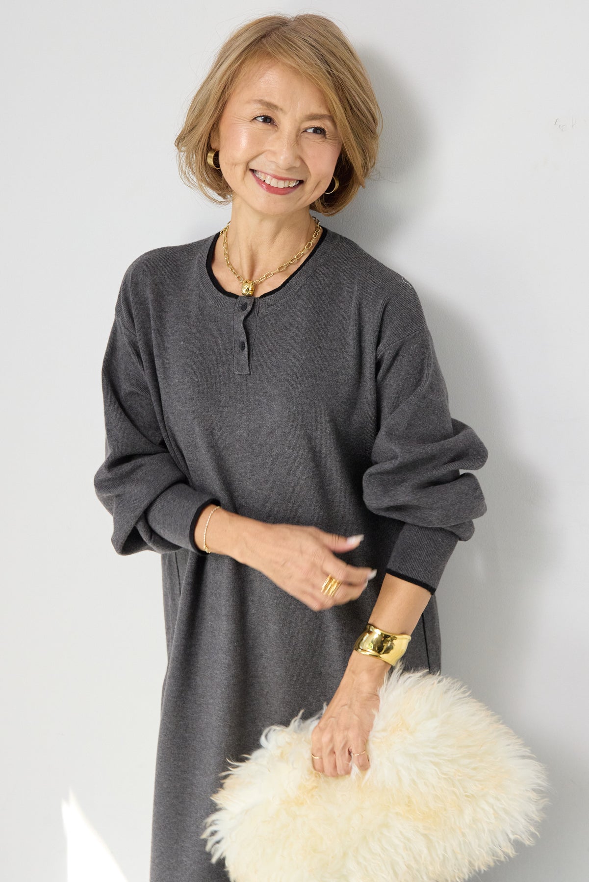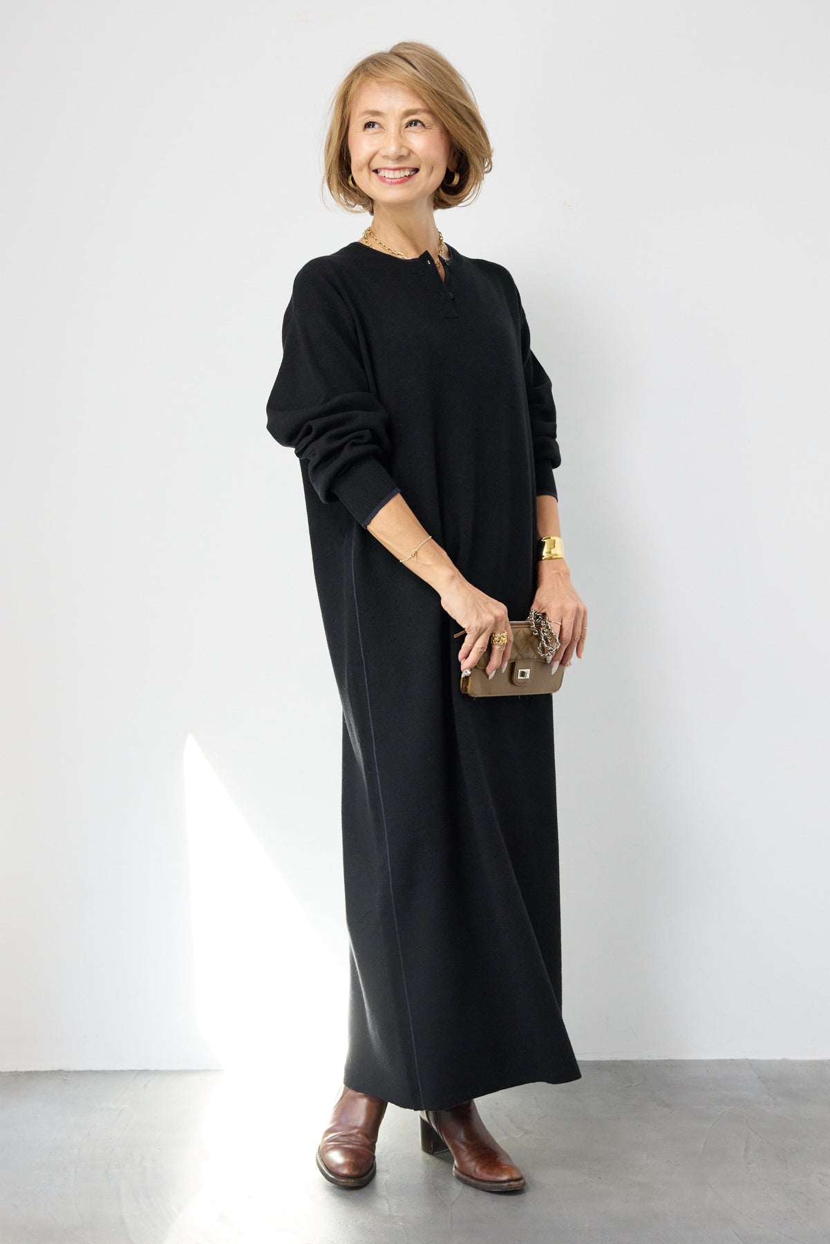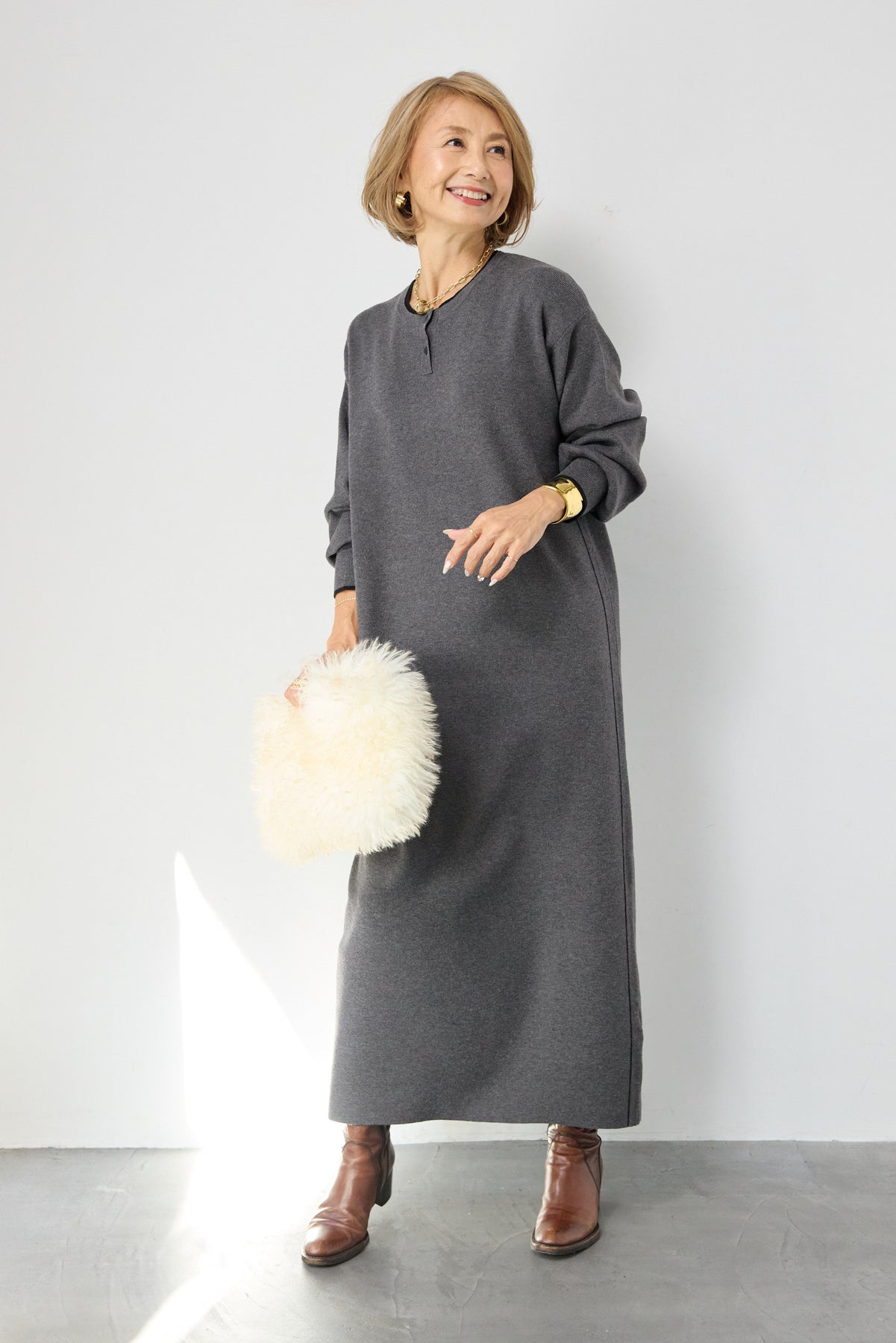 もちもちした肌触りと、防静電気機能を兼ね備えた、暖かく快適な着心地のロングワンピースです。 縦長効果を生むサイド〜フロントの配色ラインが、身体のラインを拾いすぎないIラインシルエットをすっきり見せます。 首元はカジュアルなヘンリーネックで、抜け感を演出。袖口の配色もさりげないアクセントに。 一枚でサマになりブーツやアクセサリーを合わせるだけで、洗練された大人のリラックススタイルが完成します。寒い季節に活躍する優秀なアイテムです。