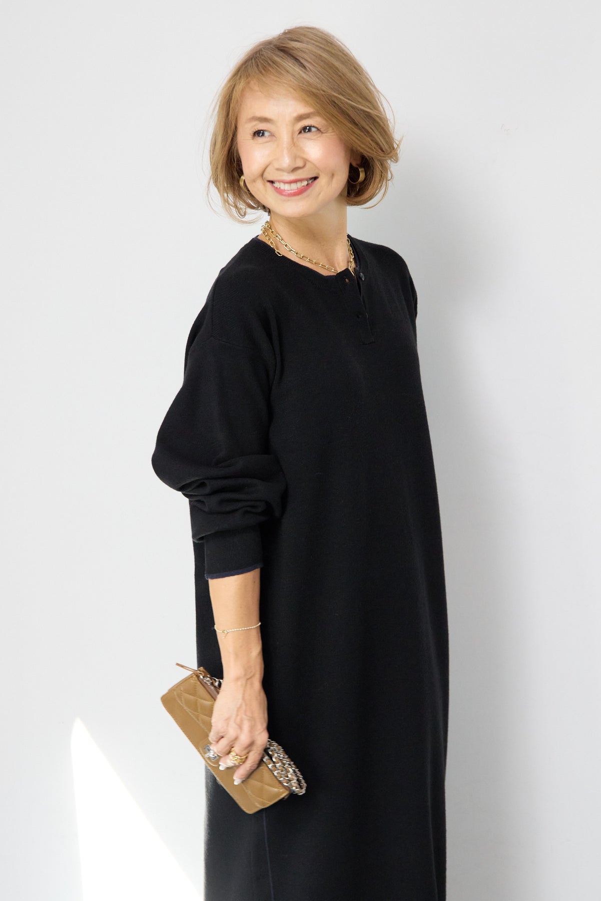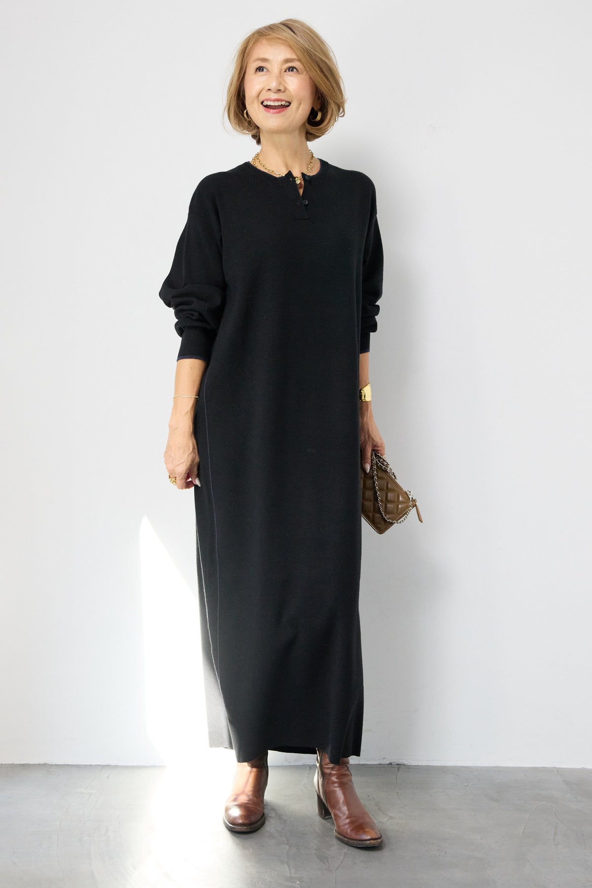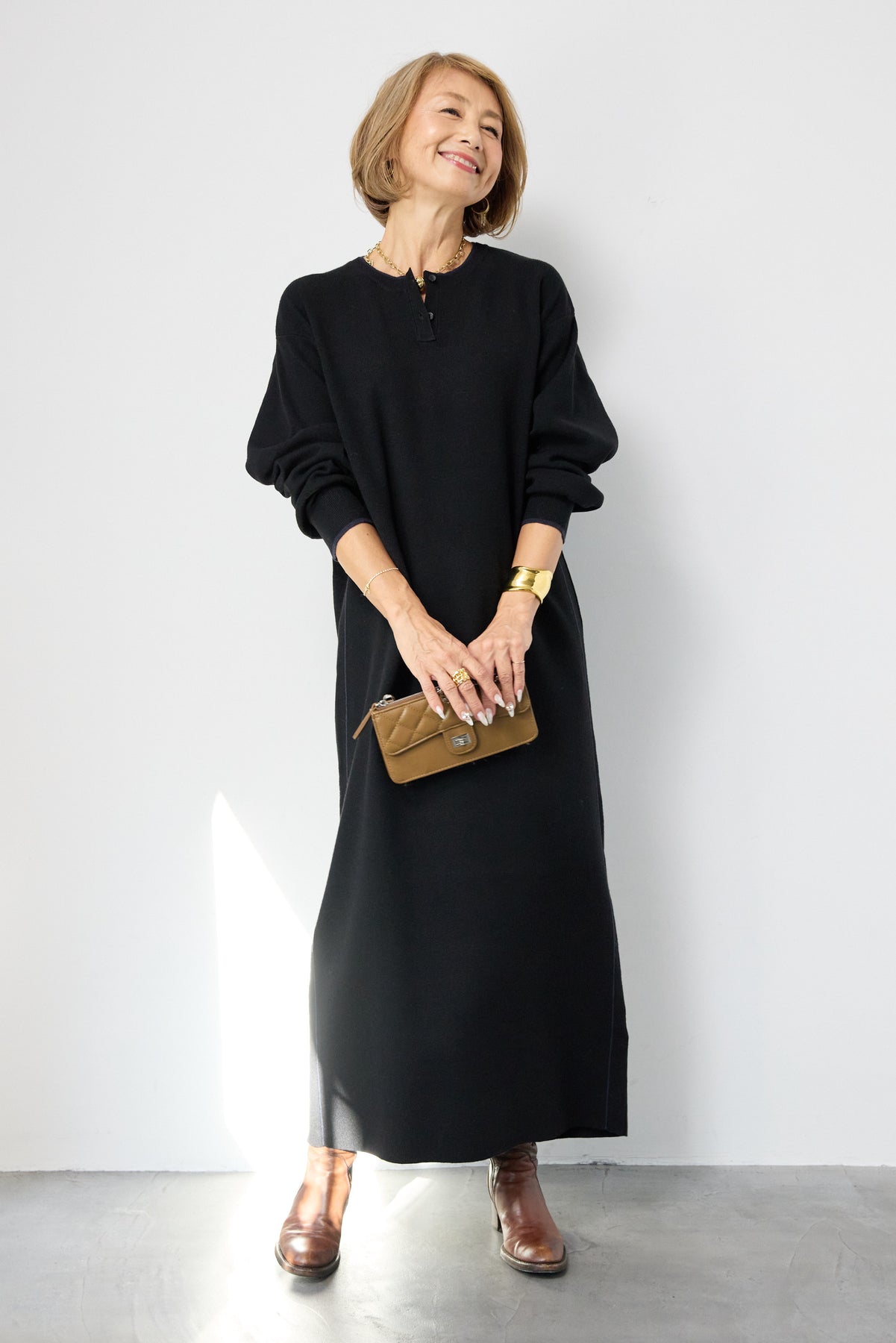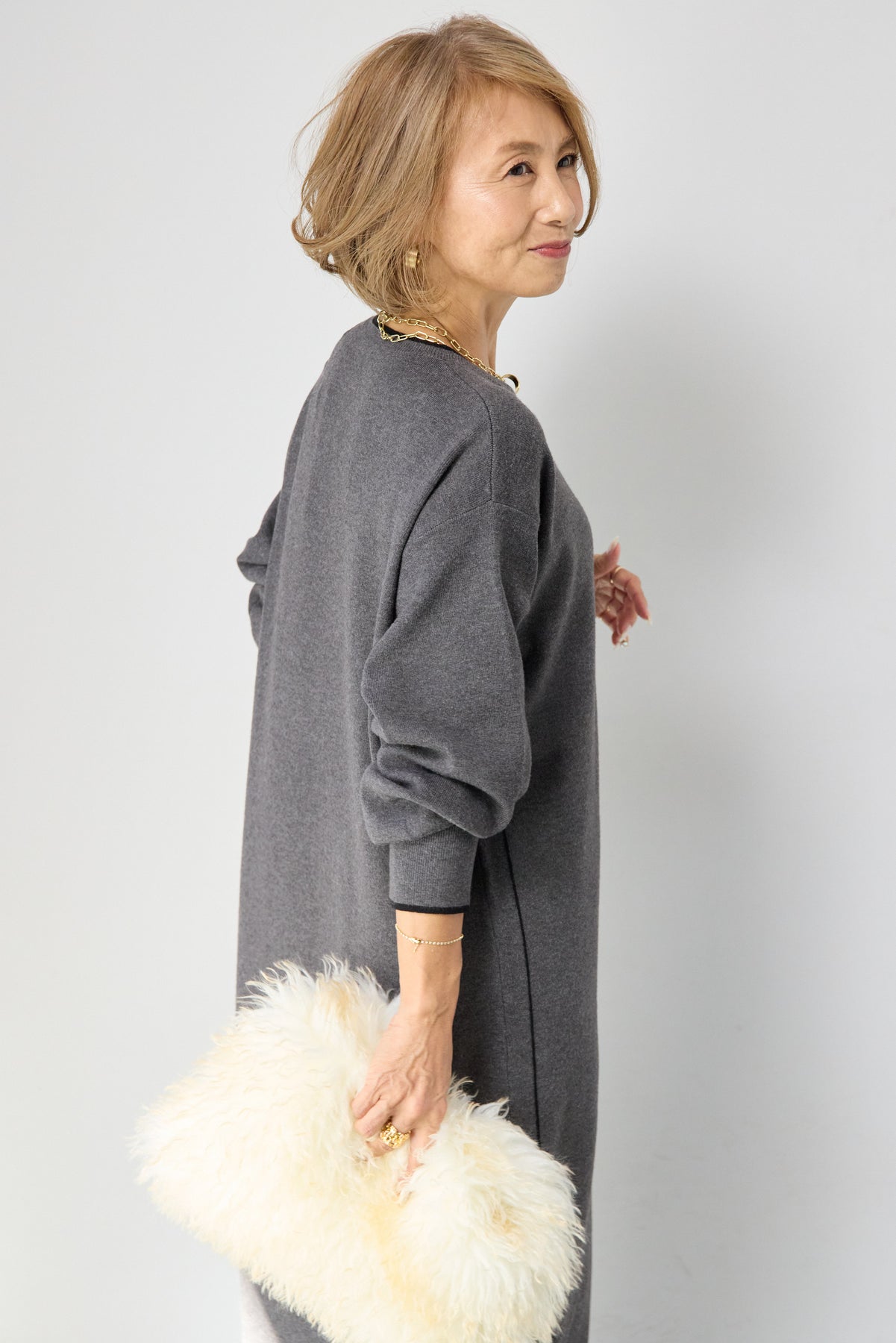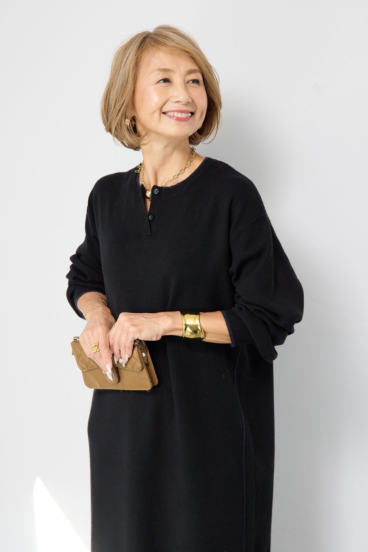 もちもちした肌触りと、防静電気機能を兼ね備えた、暖かく快適な着心地のロングワンピースです。 縦長効果を生むサイド〜フロントの配色ラインが、身体のラインを拾いすぎないIラインシルエットをすっきり見せます。 首元はカジュアルなヘンリーネックで、抜け感を演出。袖口の配色もさりげないアクセントに。 一枚でサマになりブーツやアクセサリーを合わせるだけで、洗練された大人のリラックススタイルが完成します。寒い季節に活躍する優秀なアイテムです。