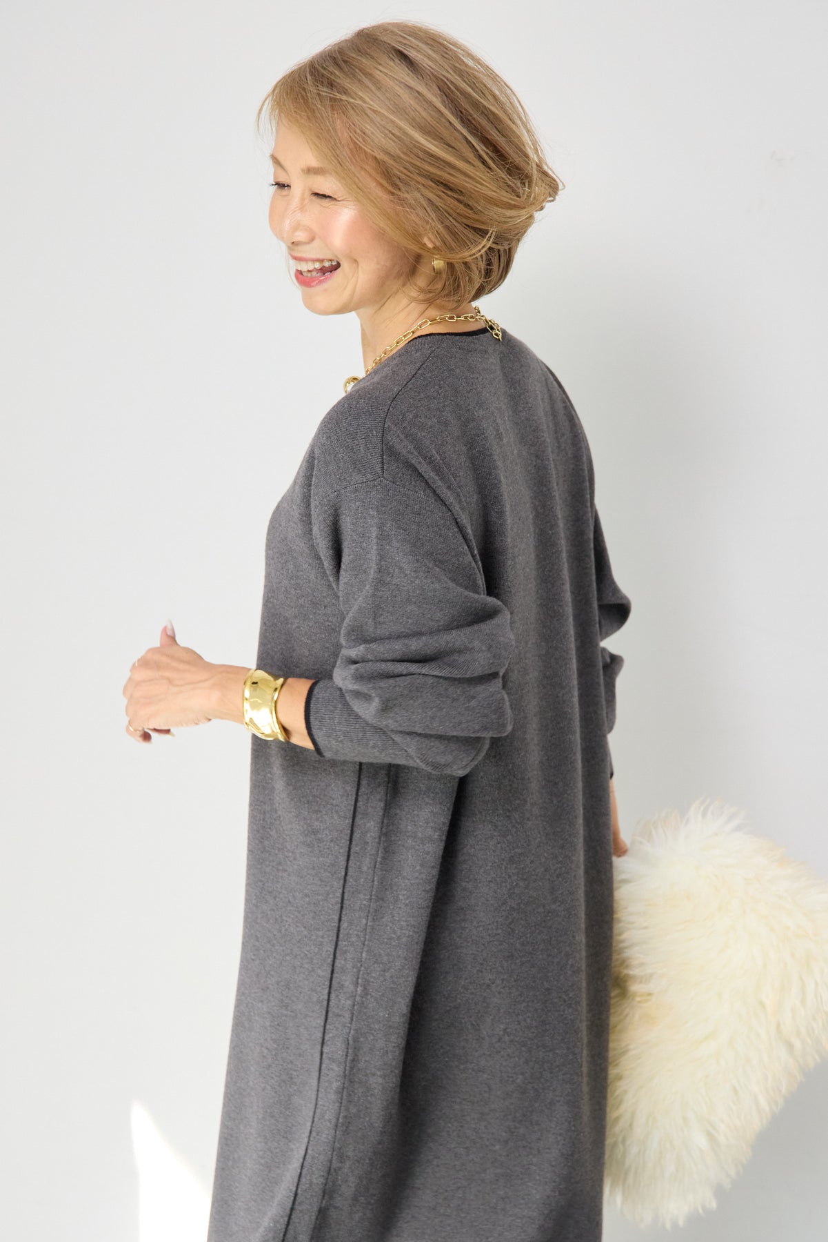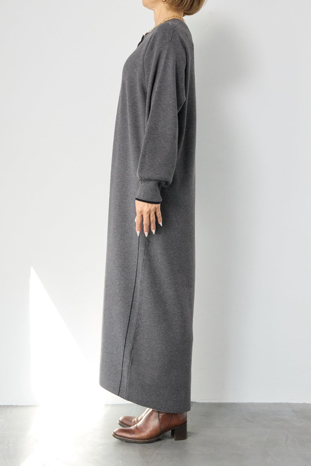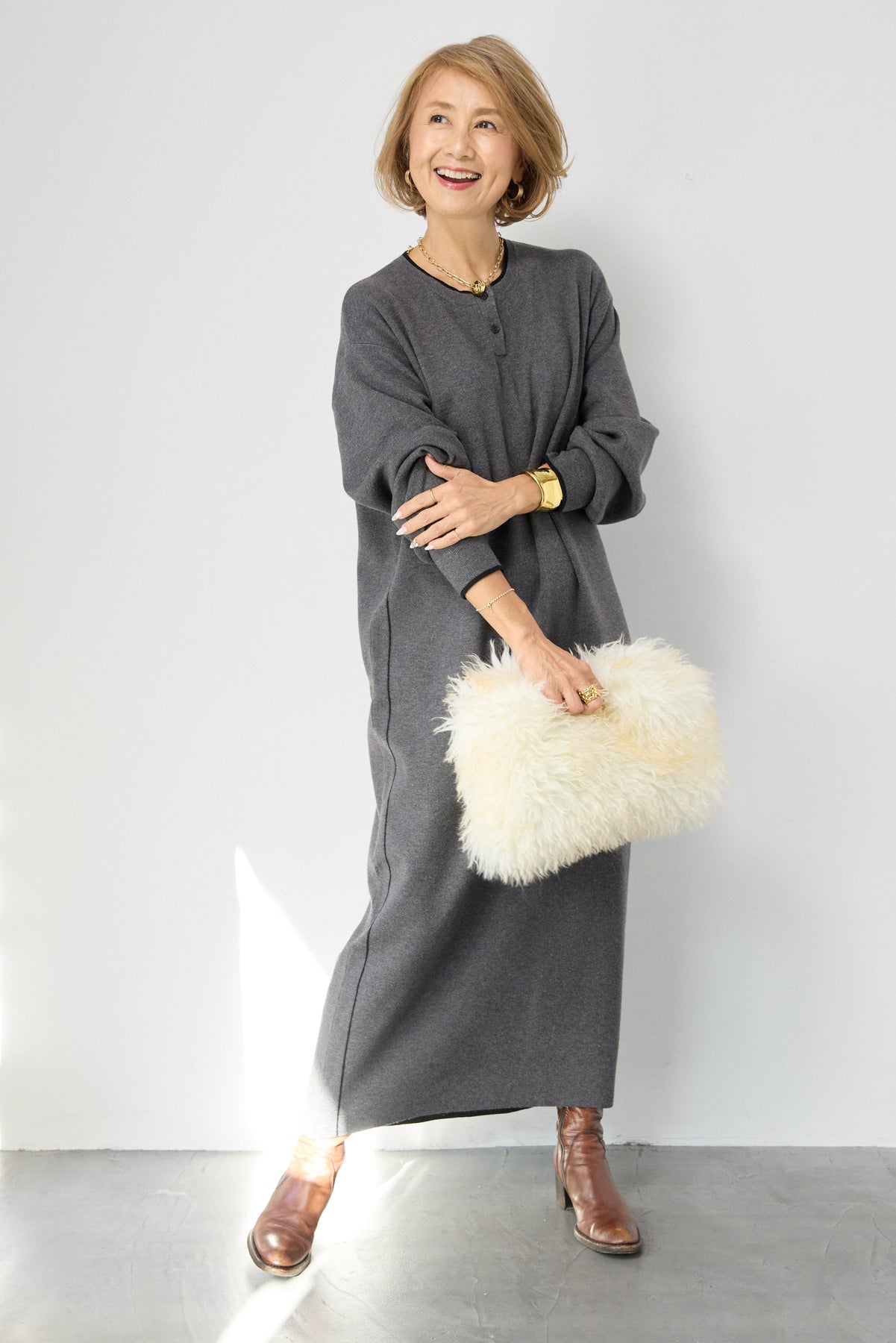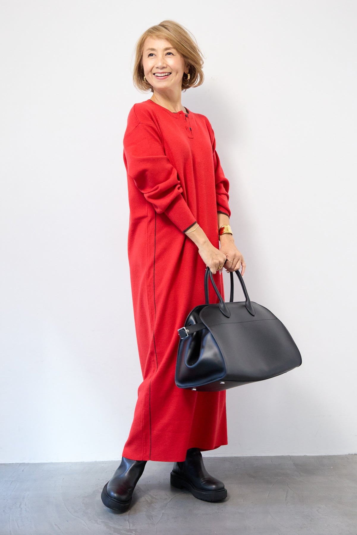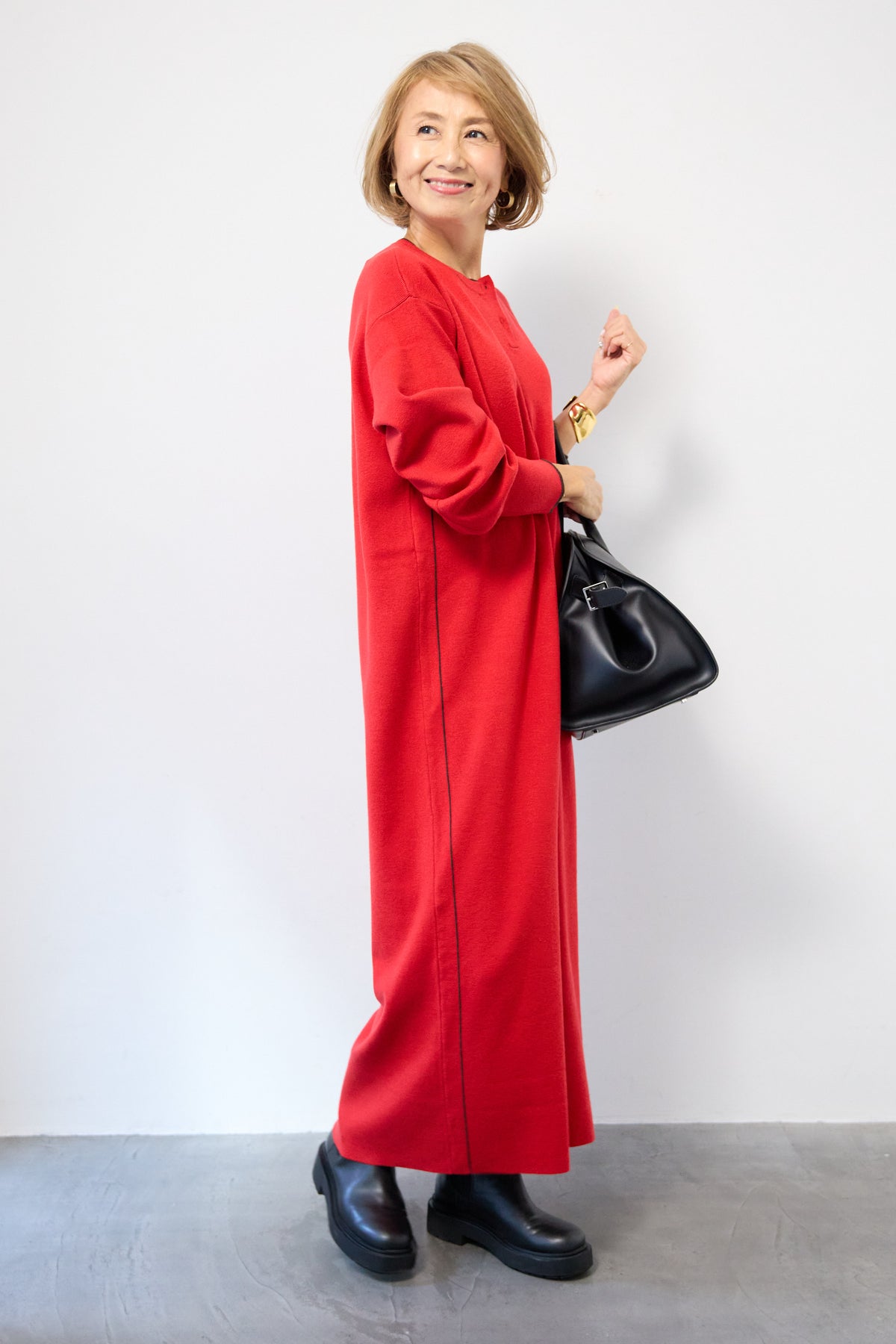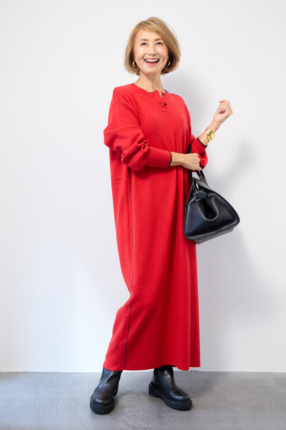 もちもちした肌触りと、防静電気機能を兼ね備えた、暖かく快適な着心地のロングワンピースです。 縦長効果を生むサイド〜フロントの配色ラインが、身体のラインを拾いすぎないIラインシルエットをすっきり見せます。 首元はカジュアルなヘンリーネックで、抜け感を演出。袖口の配色もさりげないアクセントに。 一枚でサマになりブーツやアクセサリーを合わせるだけで、洗練された大人のリラックススタイルが完成します。寒い季節に活躍する優秀なアイテムです。