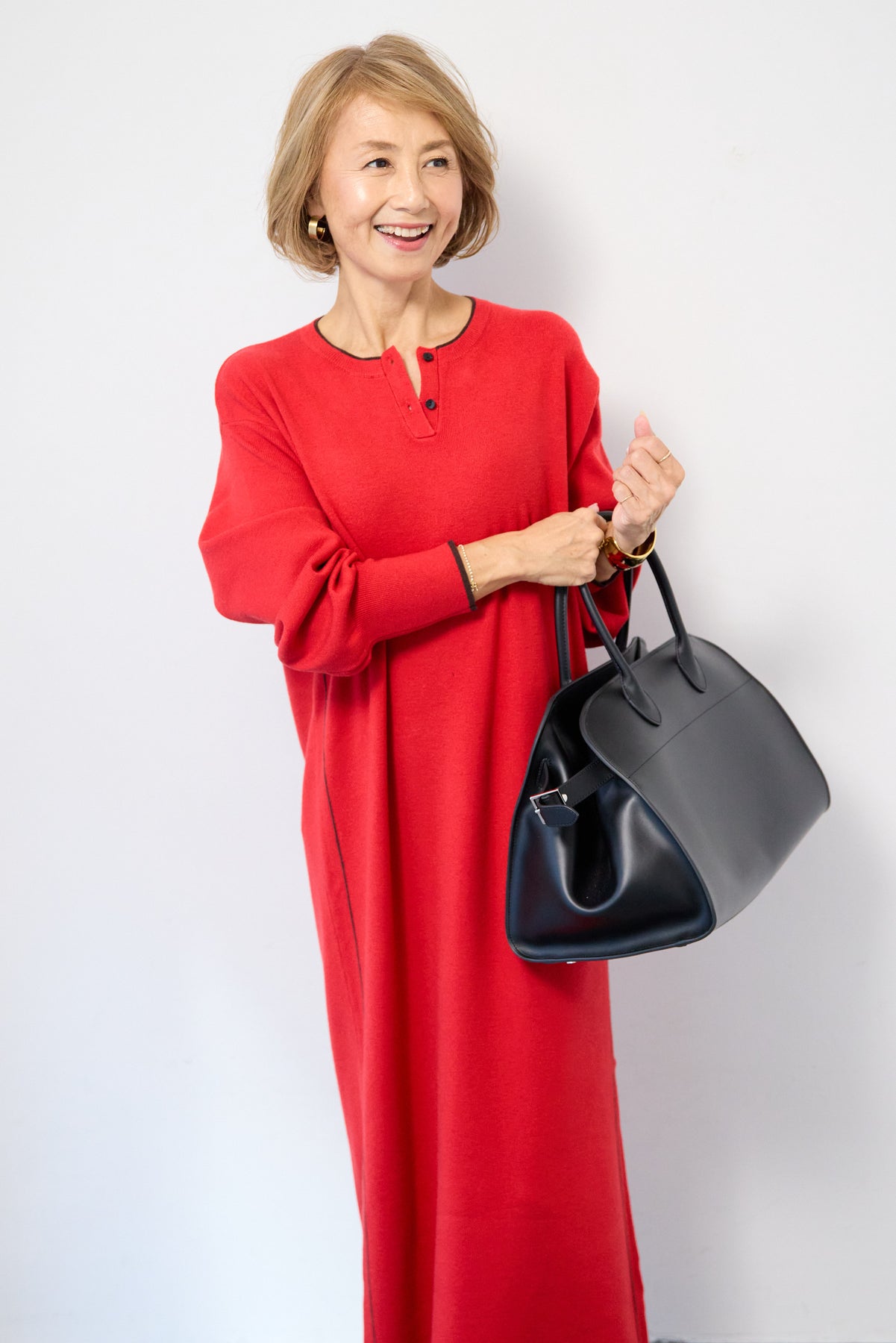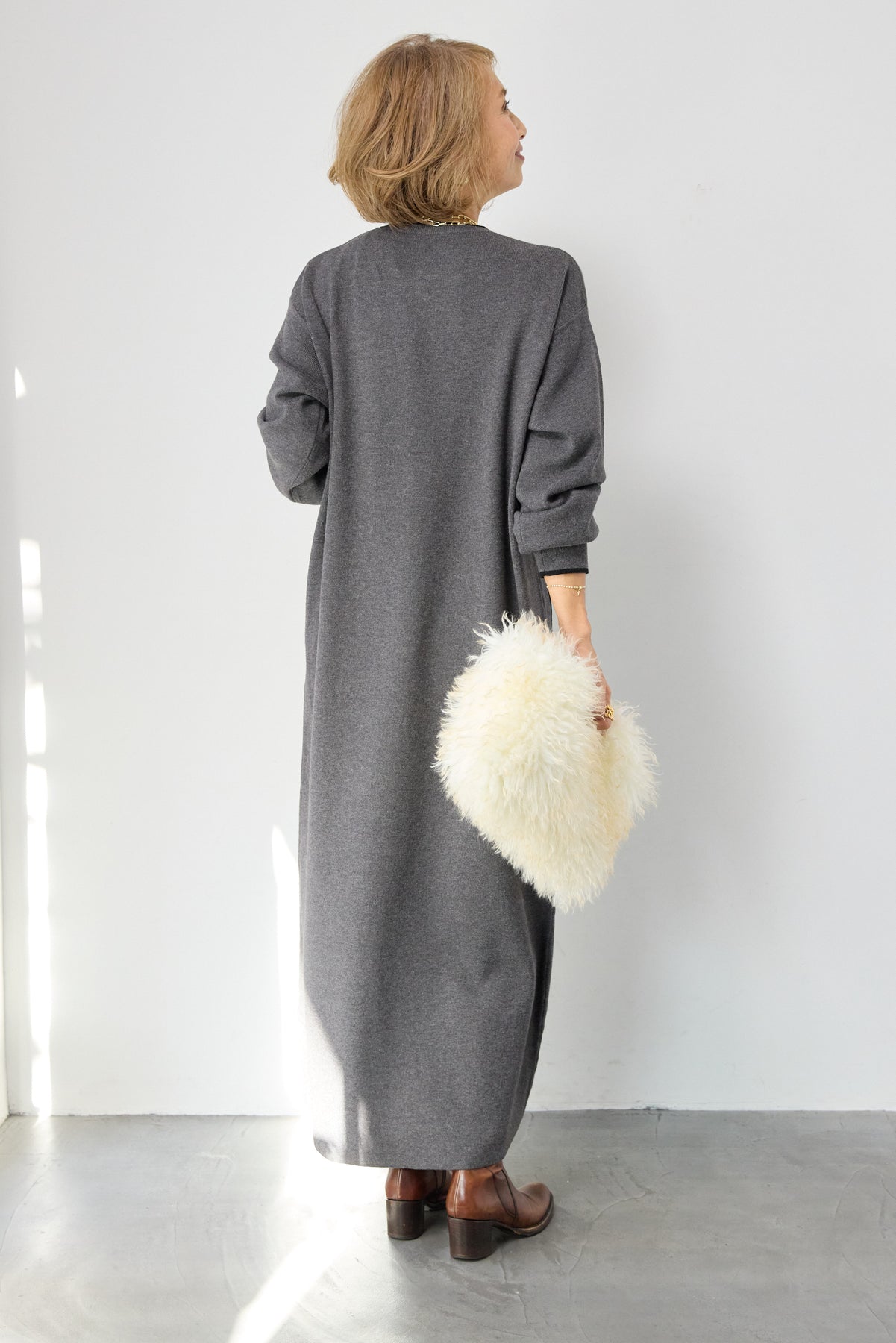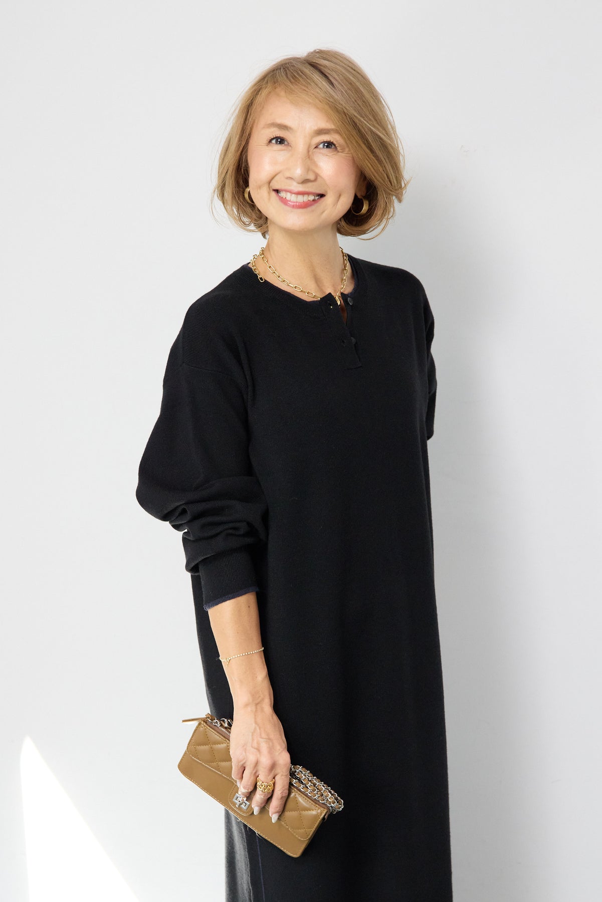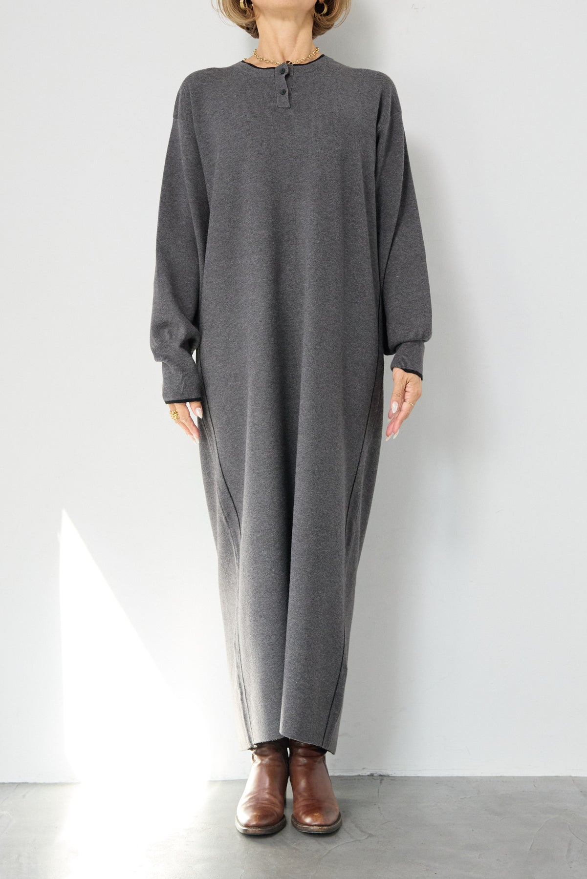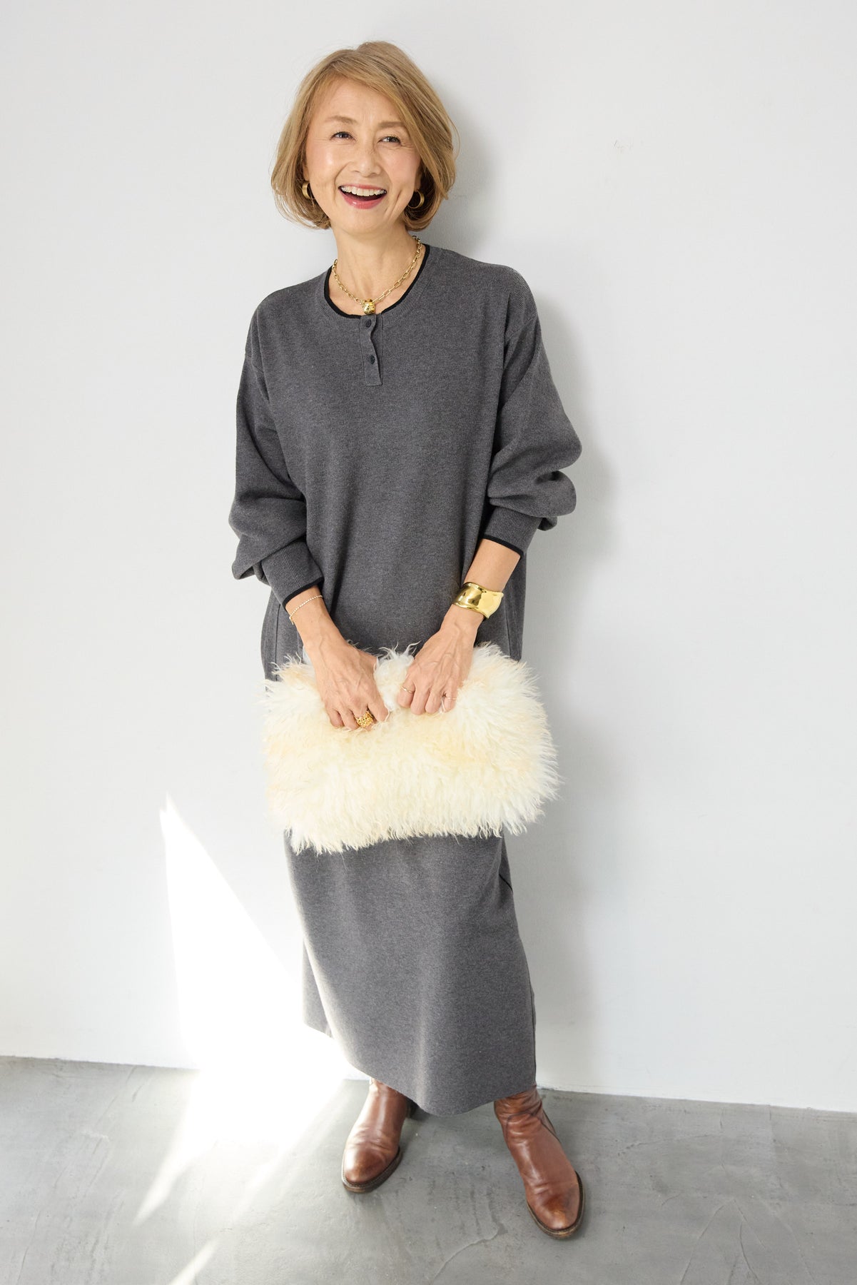 もちもちした肌触りと、防静電気機能を兼ね備えた、暖かく快適な着心地のロングワンピースです。 縦長効果を生むサイド〜フロントの配色ラインが、身体のラインを拾いすぎないIラインシルエットをすっきり見せます。 首元はカジュアルなヘンリーネックで、抜け感を演出。袖口の配色もさりげないアクセントに。 一枚でサマになりブーツやアクセサリーを合わせるだけで、洗練された大人のリラックススタイルが完成します。寒い季節に活躍する優秀なアイテムです。