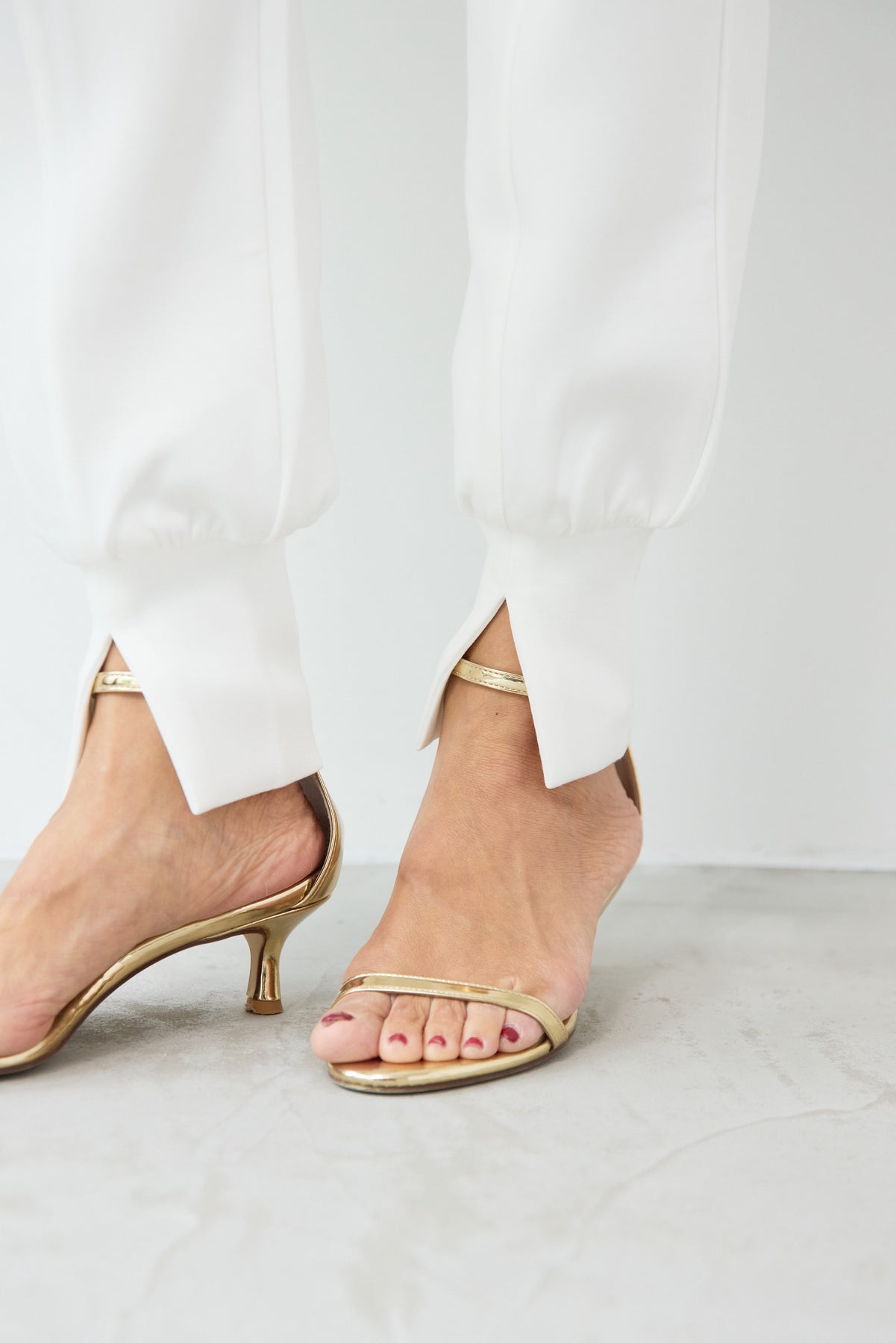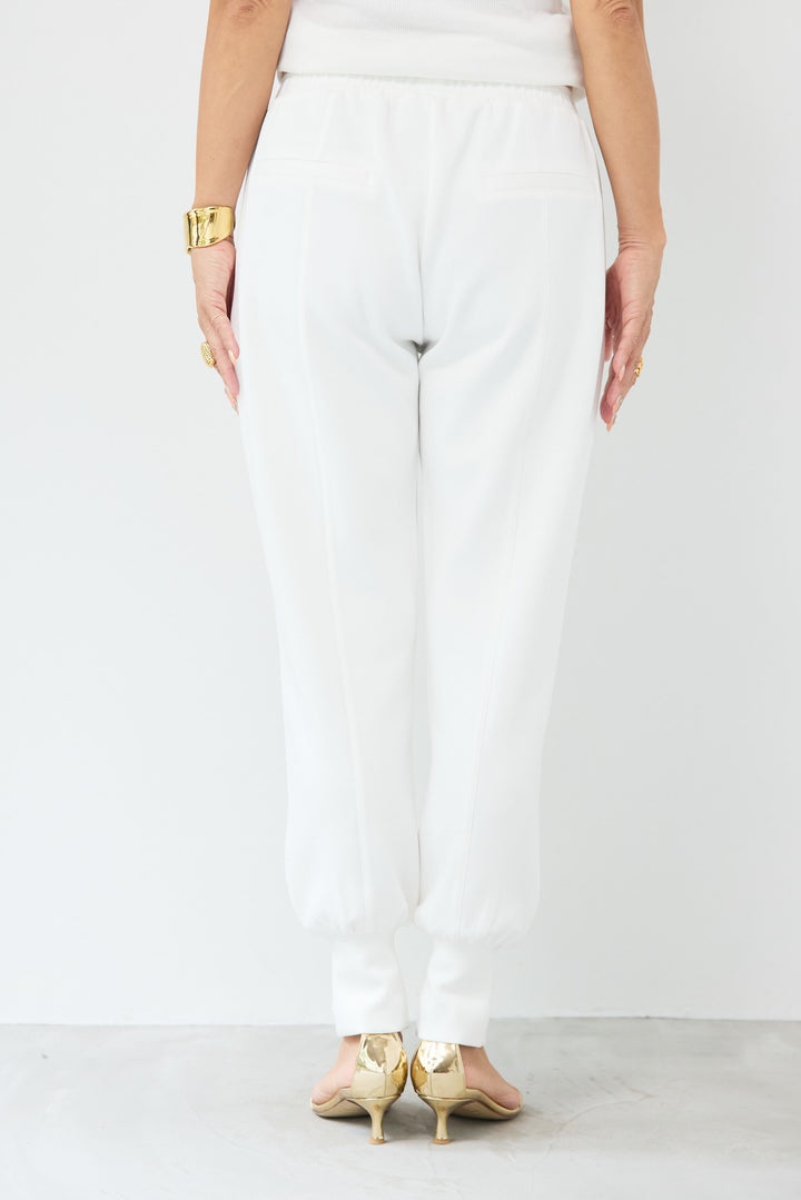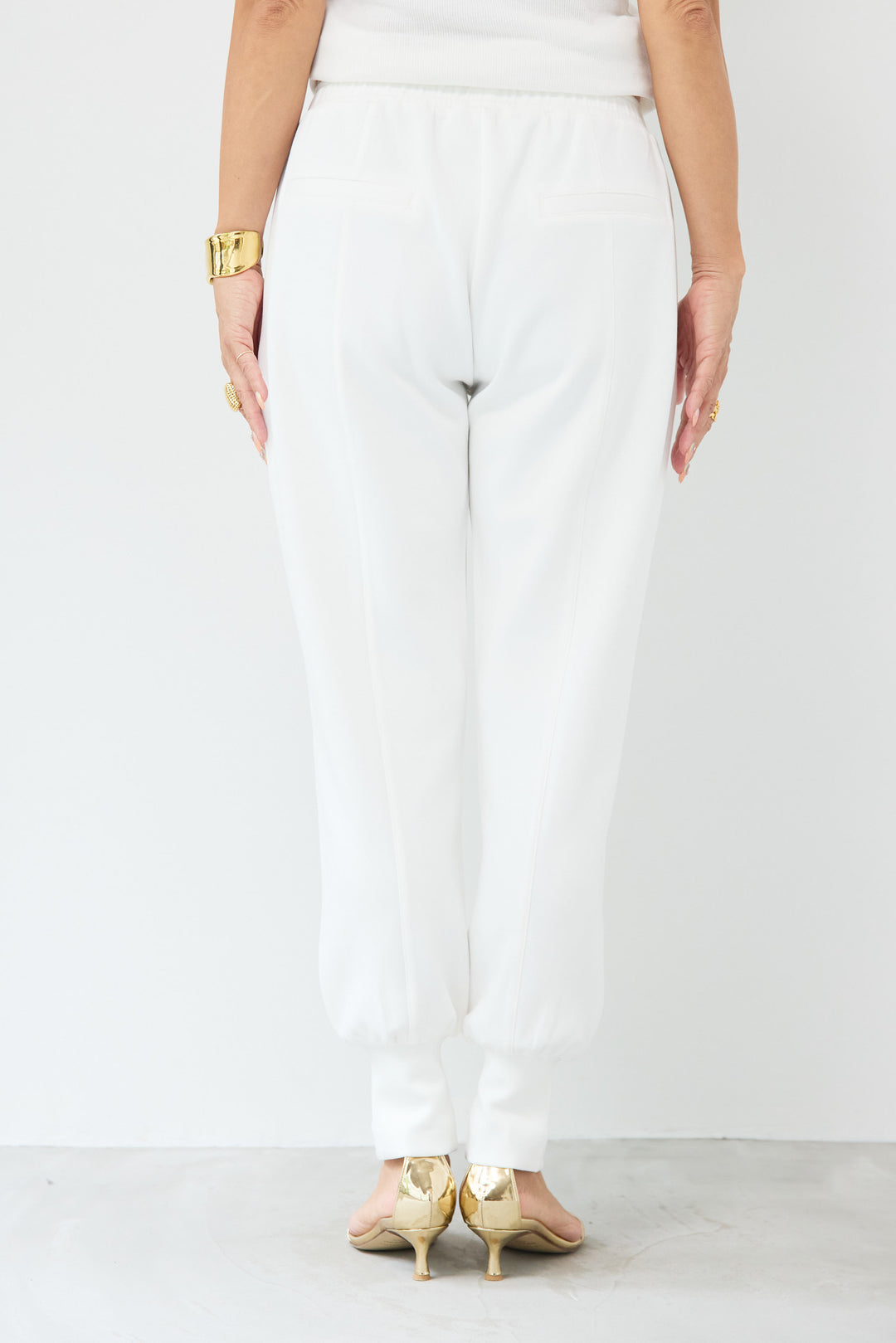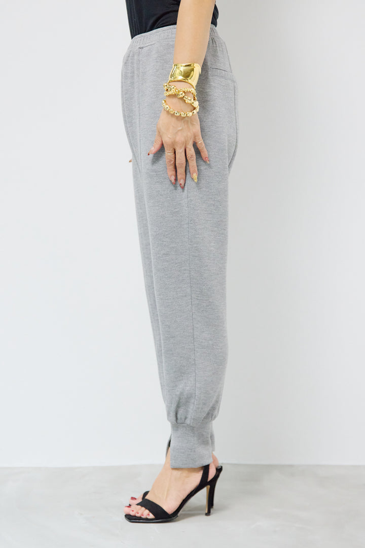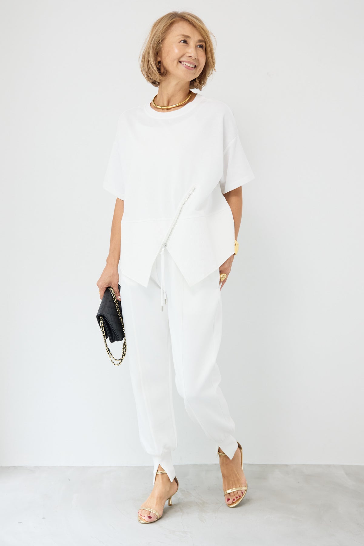 裾のスリットがさりげない抜け感を添える、表面感のあるダンボール素材のジョガーパンツ。センターライン入りで縦のラインを強調し、すっきりとした印象に。ソフトでモチっとした生地感が肌当たりも優しく、ストレスフリーな穿き心地です。カジュアルなデザインながらも洗練された雰囲気を演出できる1本。