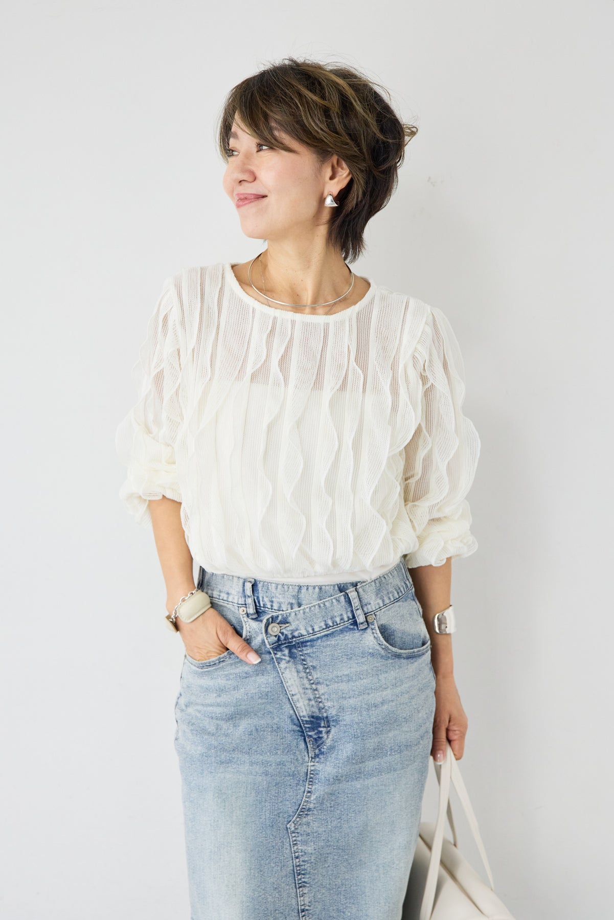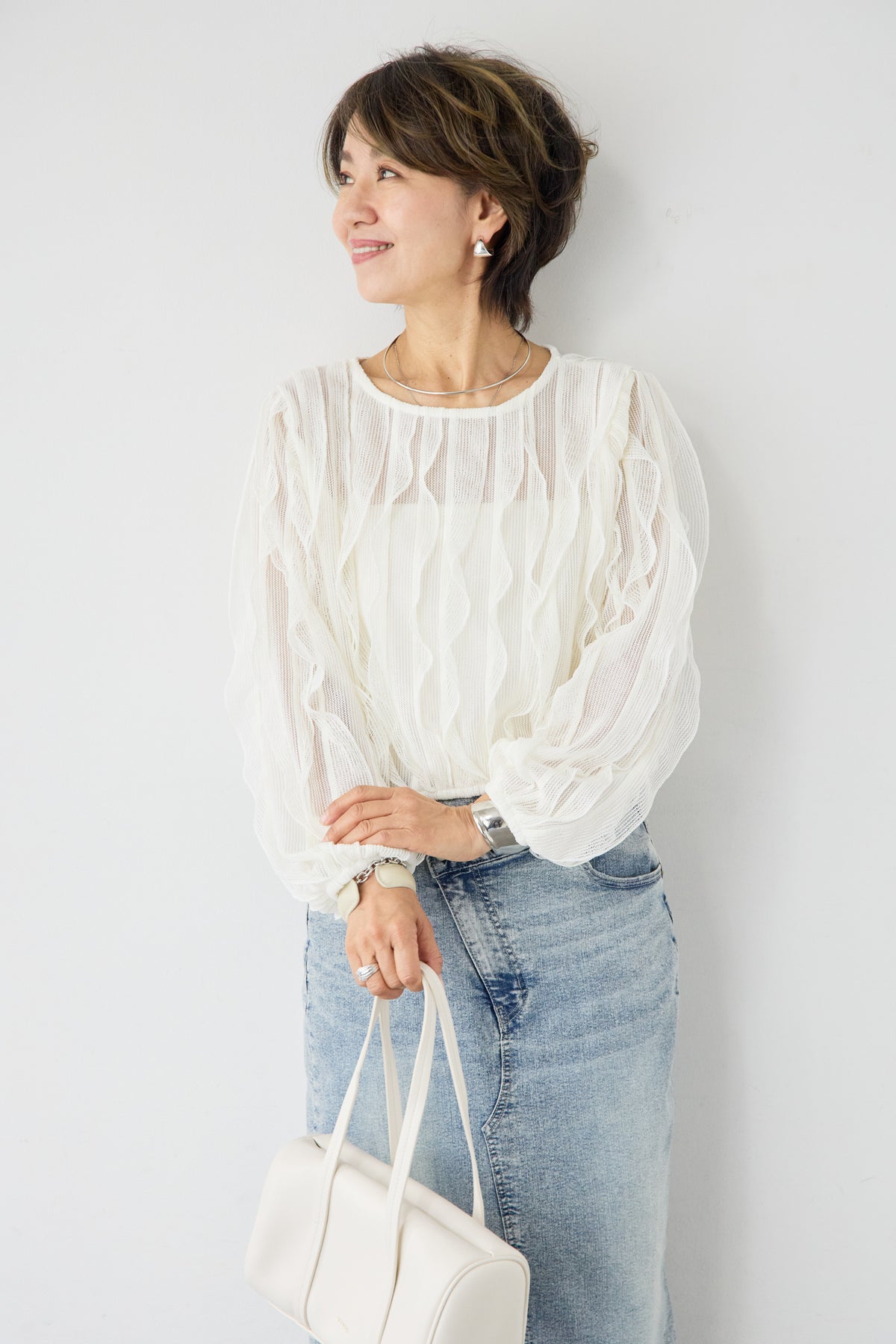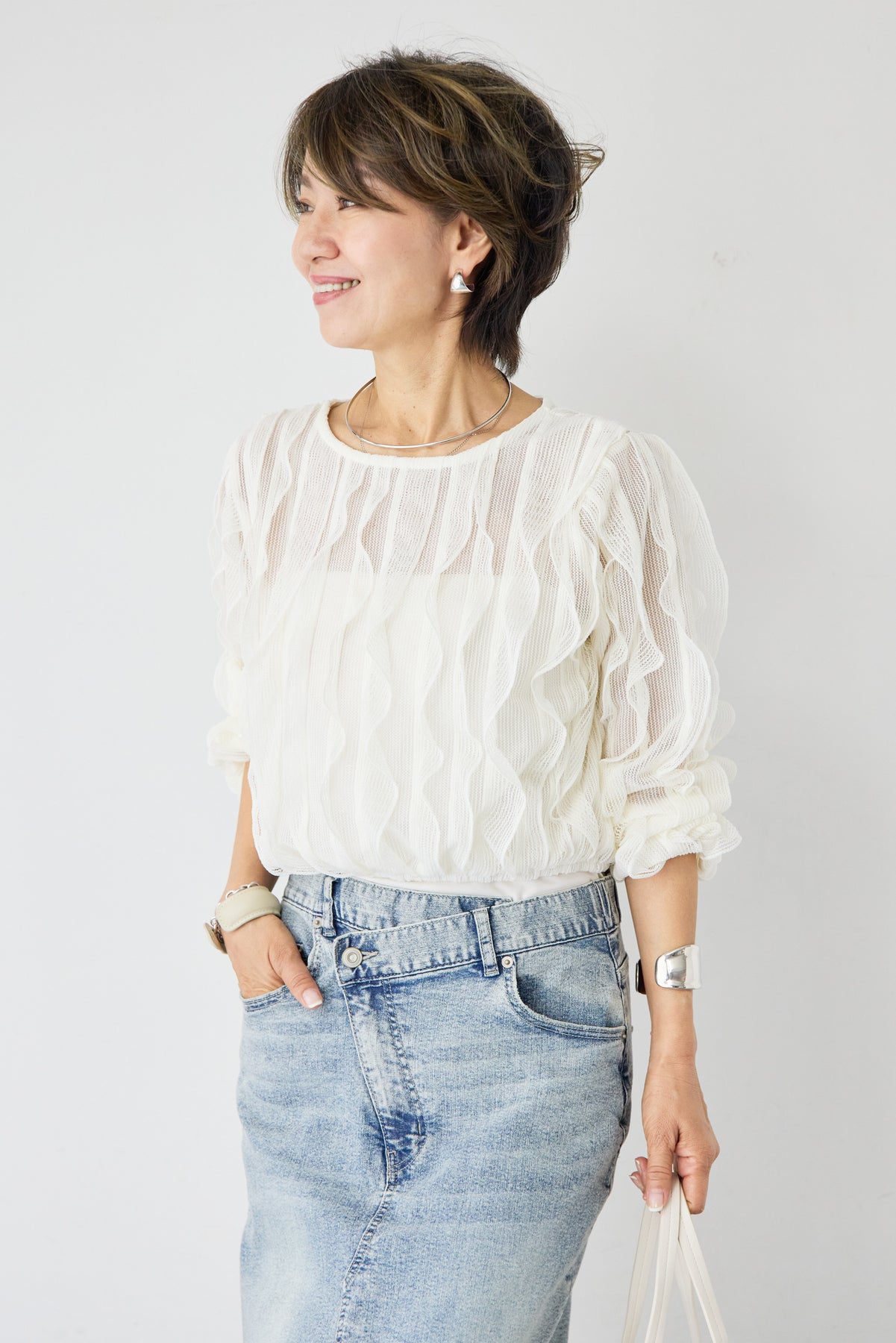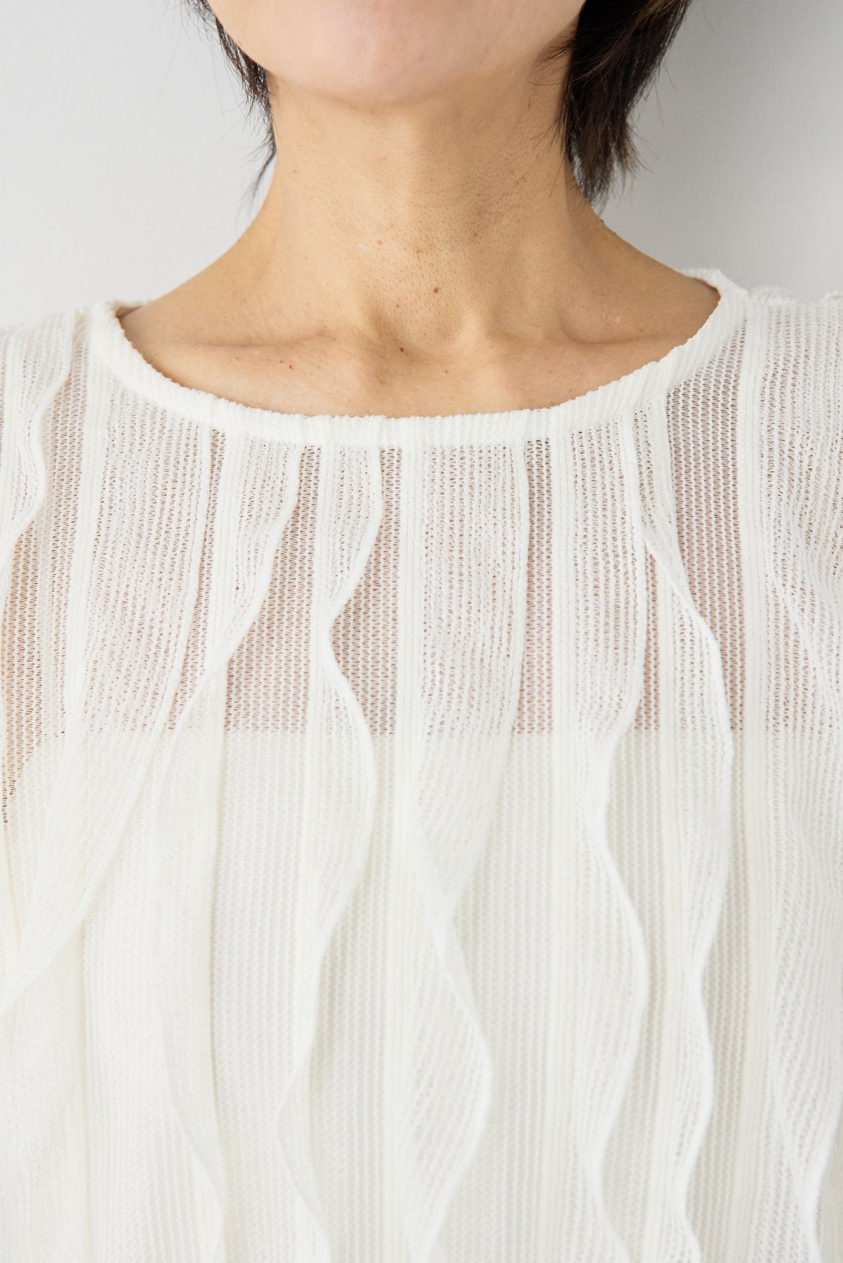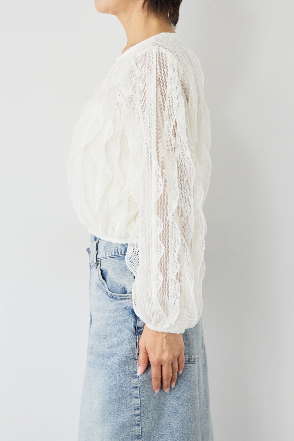 立体感のあるウェーブ柄レースが印象的な、軽やかで女性らしいブラウス。表情豊かな編み柄が縦のラインを美しく見せ、シンプルながらも存在感のある一枚に仕上げました。透け感のある繊細なレース素材が、涼しげで柔らかな印象を演出。インナーとのレイヤードを楽しめるデザインで、スタイリングに奥行きをプラスします。ふんわりとしたボリュームスリーブと袖口のギャザーが、女性らしいやさしいシルエットを作り出します。ネックラインはすっきりとしたクルーネックで上品な印象に。背面には涙開きのボタン仕様を施し、後ろ姿にもさりげないアクセントを添えています。 デニムやスカートと合わせたカジュアルスタイルはもちろん、きれいめボトムと合わせた上品なコーディネートにもおすすめ。