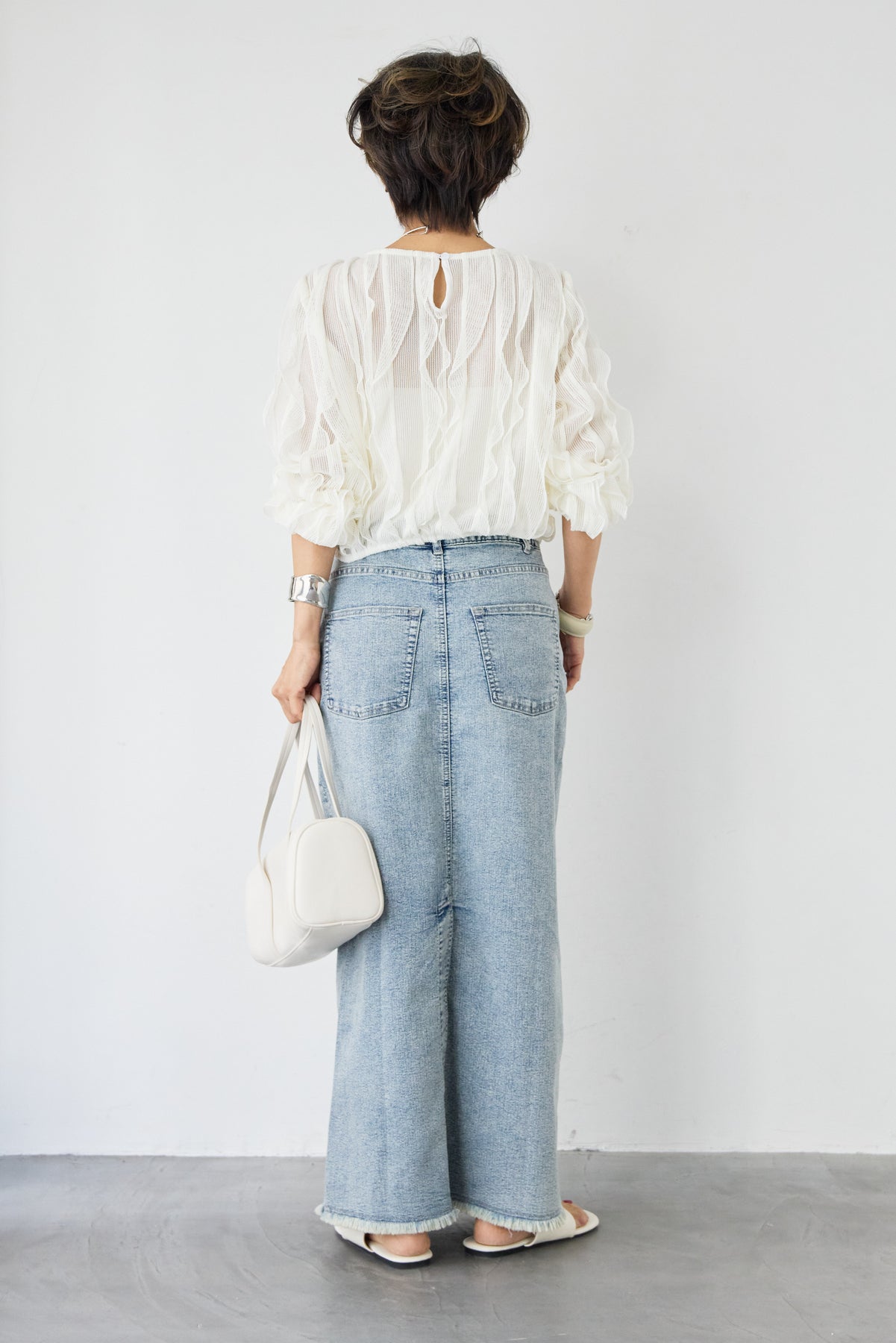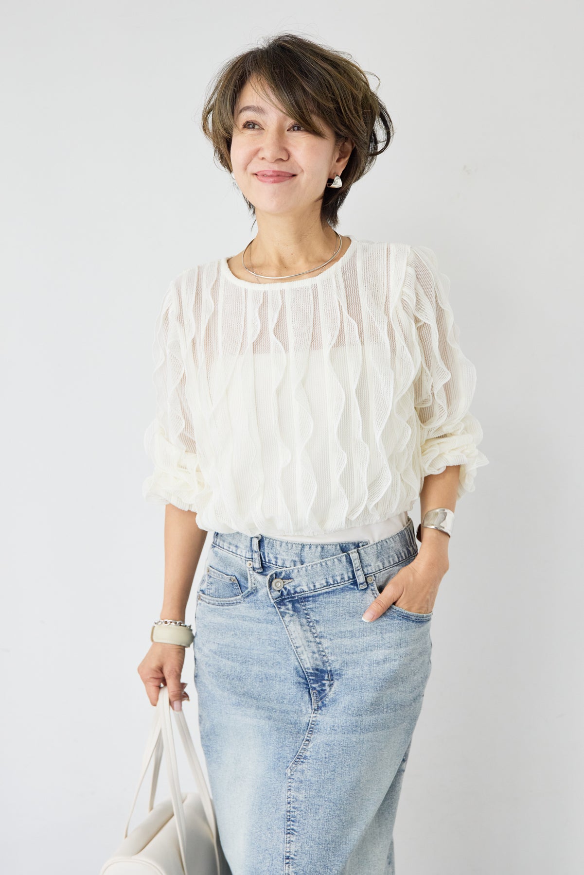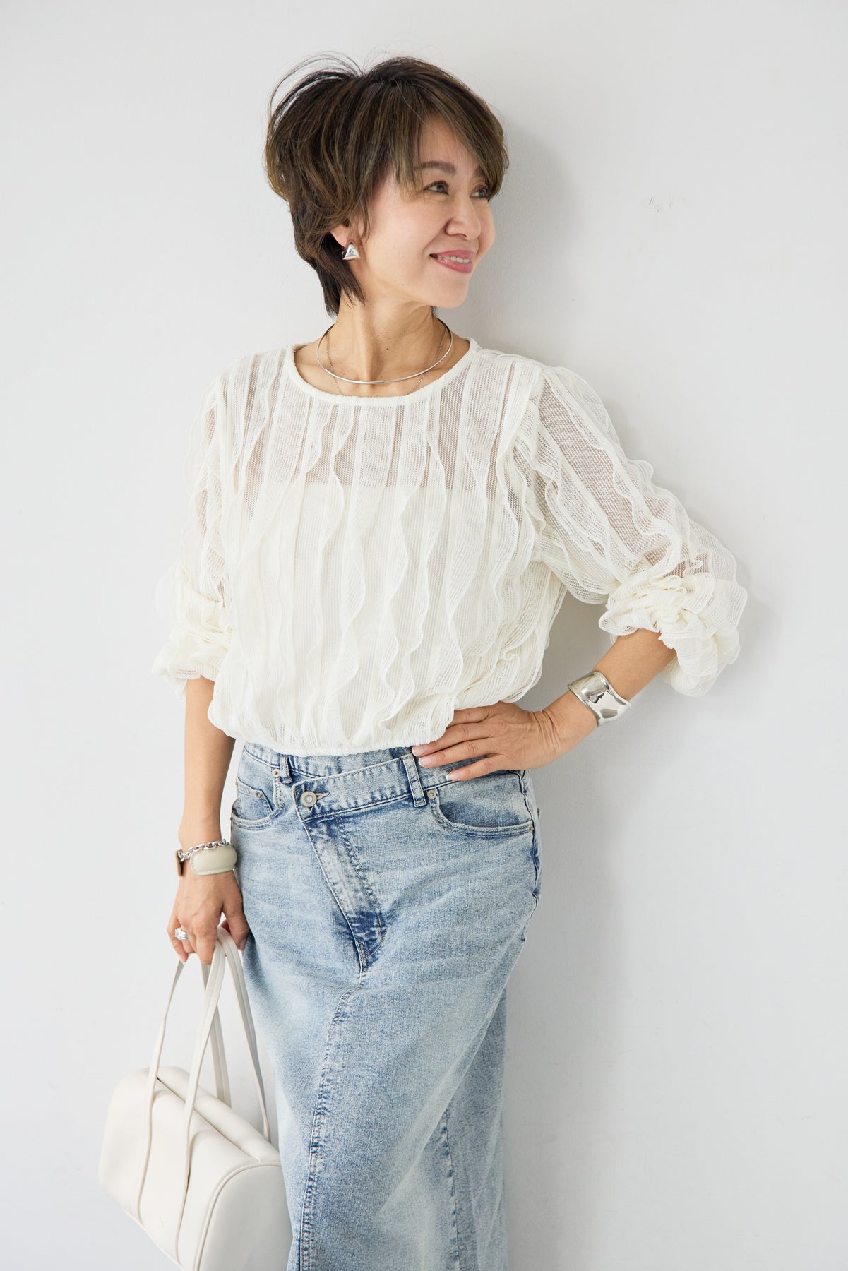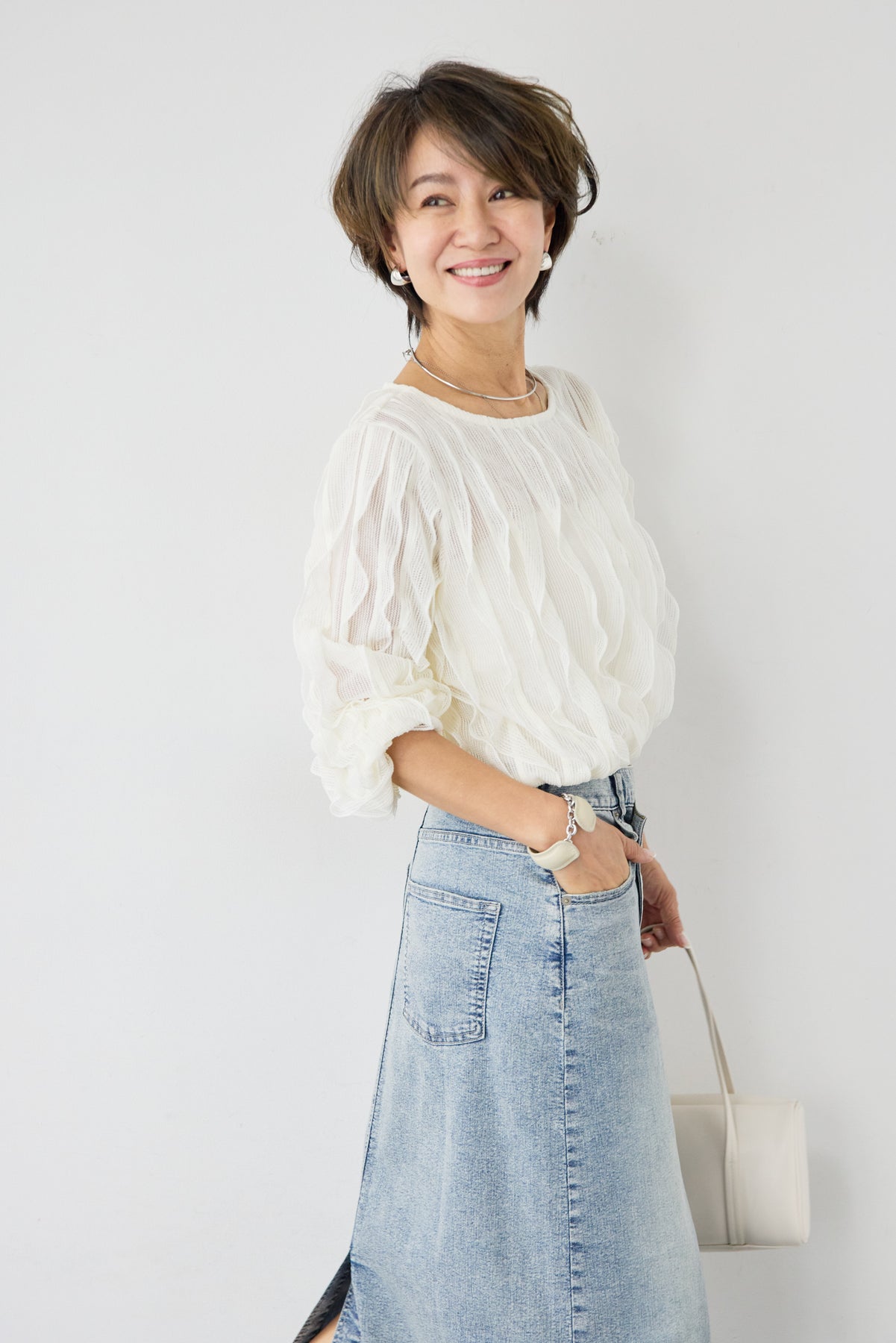立体感のあるウェーブ柄レースが印象的な、軽やかで女性らしいブラウス。表情豊かな編み柄が縦のラインを美しく見せ、シンプルながらも存在感のある一枚に仕上げました。透け感のある繊細なレース素材が、涼しげで柔らかな印象を演出。インナーとのレイヤードを楽しめるデザインで、スタイリングに奥行きをプラスします。ふんわりとしたボリュームスリーブと袖口のギャザーが、女性らしいやさしいシルエットを作り出します。ネックラインはすっきりとしたクルーネックで上品な印象に。背面には涙開きのボタン仕様を施し、後ろ姿にもさりげないアクセントを添えています。 デニムやスカートと合わせたカジュアルスタイルはもちろん、きれいめボトムと合わせた上品なコーディネートにもおすすめ。