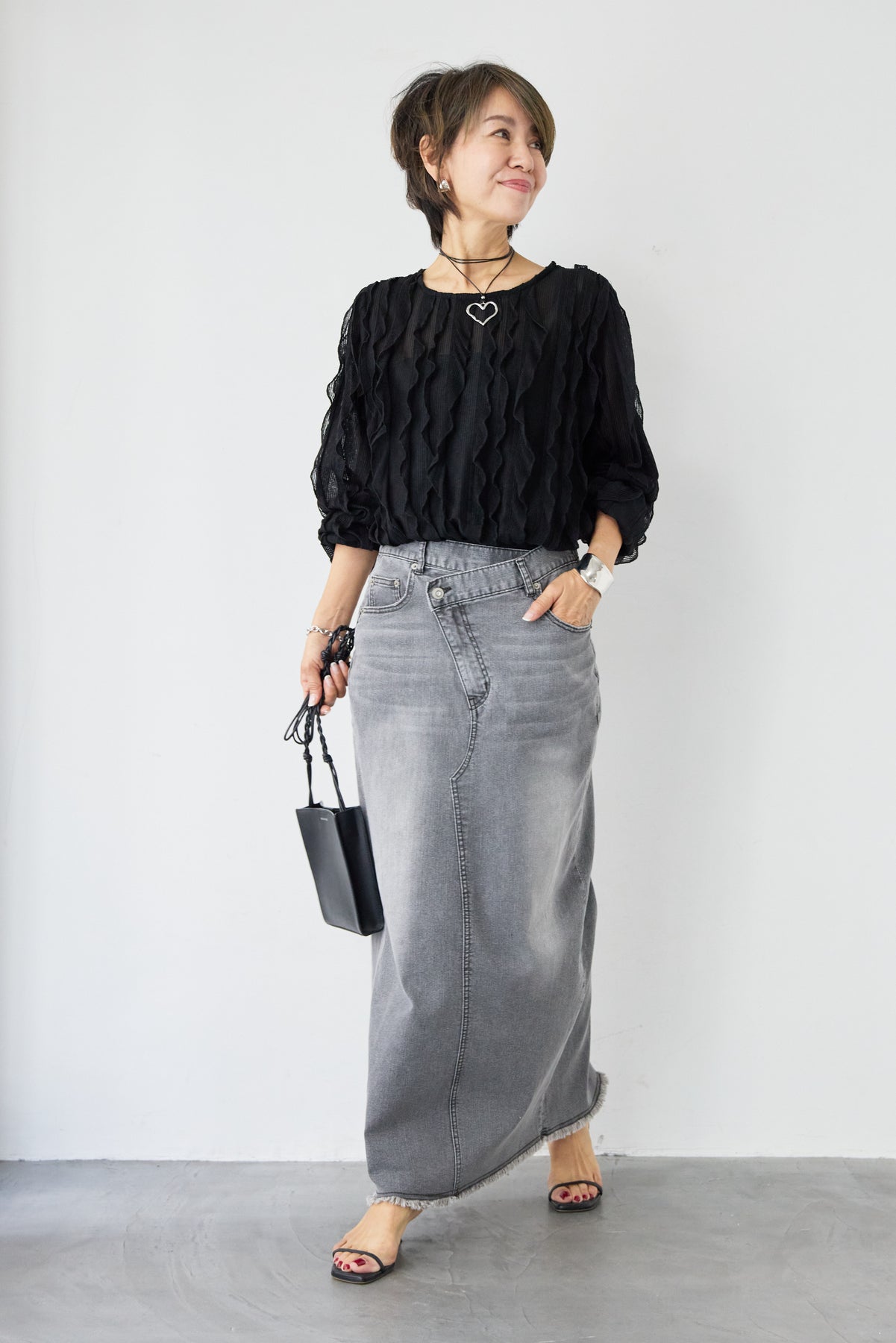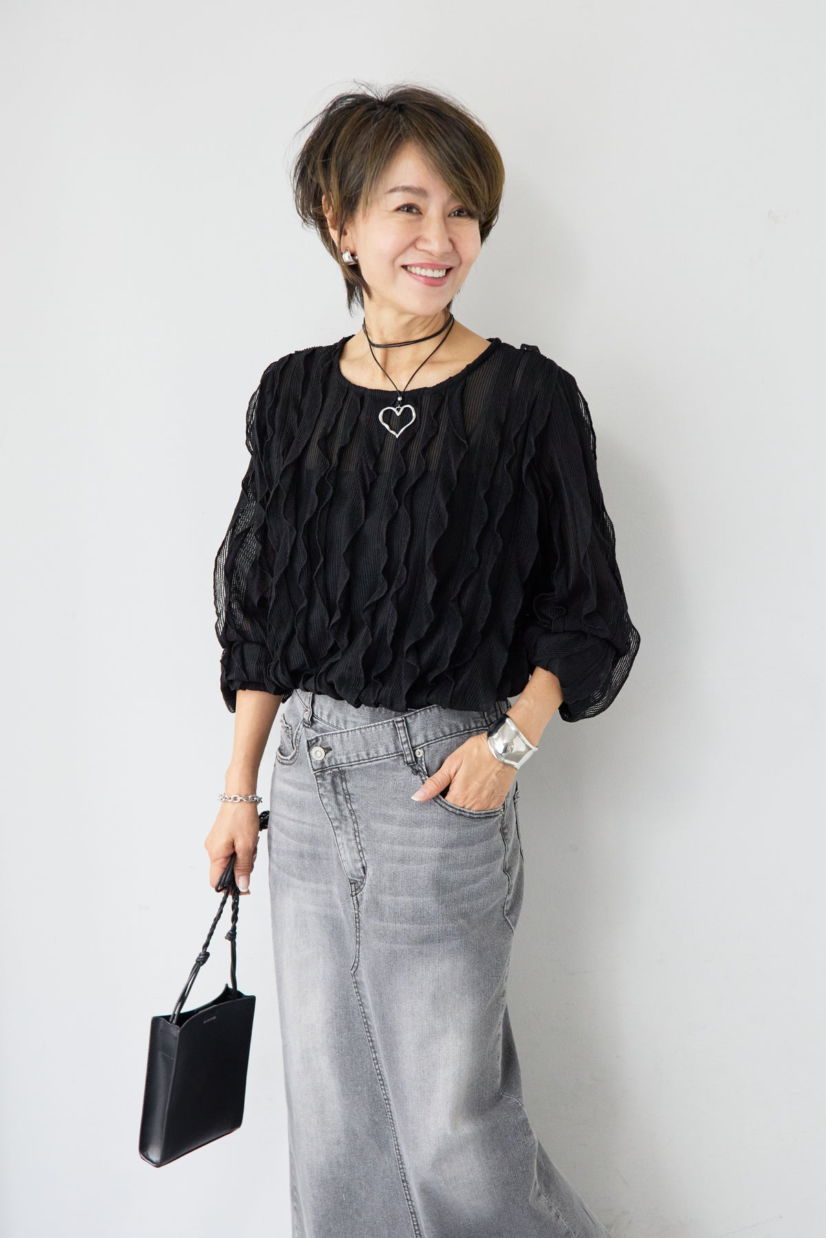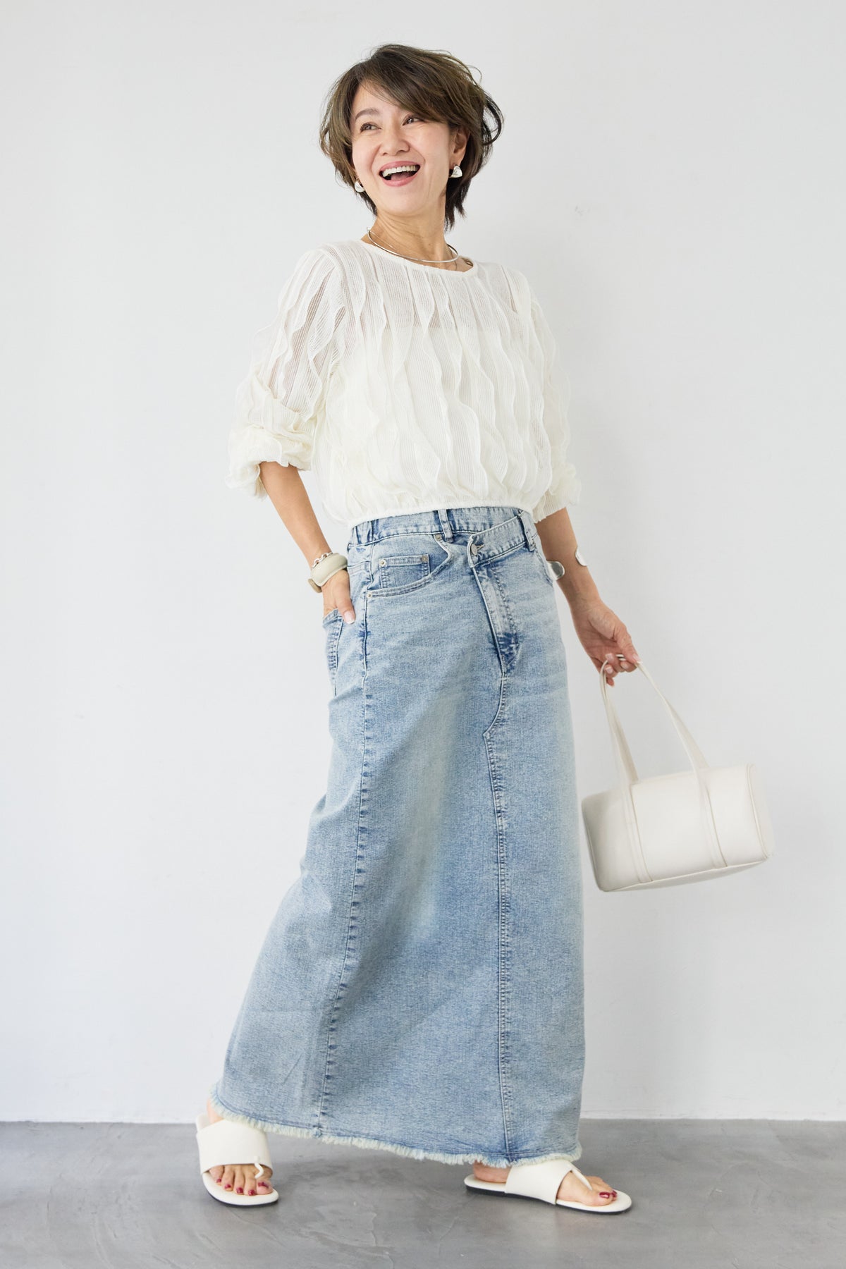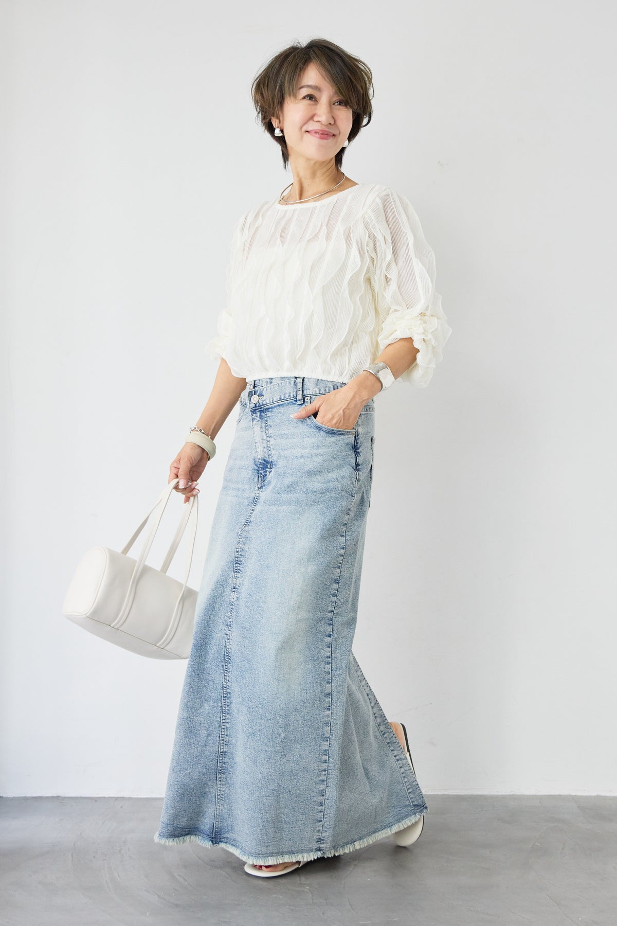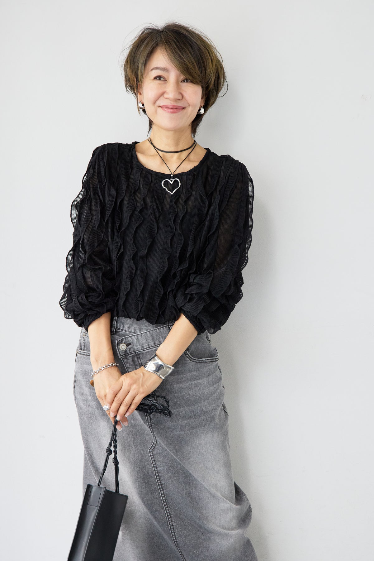 立体感のあるウェーブ柄レースが印象的な、軽やかで女性らしいブラウス。表情豊かな編み柄が縦のラインを美しく見せ、シンプルながらも存在感のある一枚に仕上げました。透け感のある繊細なレース素材が、涼しげで柔らかな印象を演出。インナーとのレイヤードを楽しめるデザインで、スタイリングに奥行きをプラスします。ふんわりとしたボリュームスリーブと袖口のギャザーが、女性らしいやさしいシルエットを作り出します。ネックラインはすっきりとしたクルーネックで上品な印象に。背面には涙開きのボタン仕様を施し、後ろ姿にもさりげないアクセントを添えています。 デニムやスカートと合わせたカジュアルスタイルはもちろん、きれいめボトムと合わせた上品なコーディネートにもおすすめ。