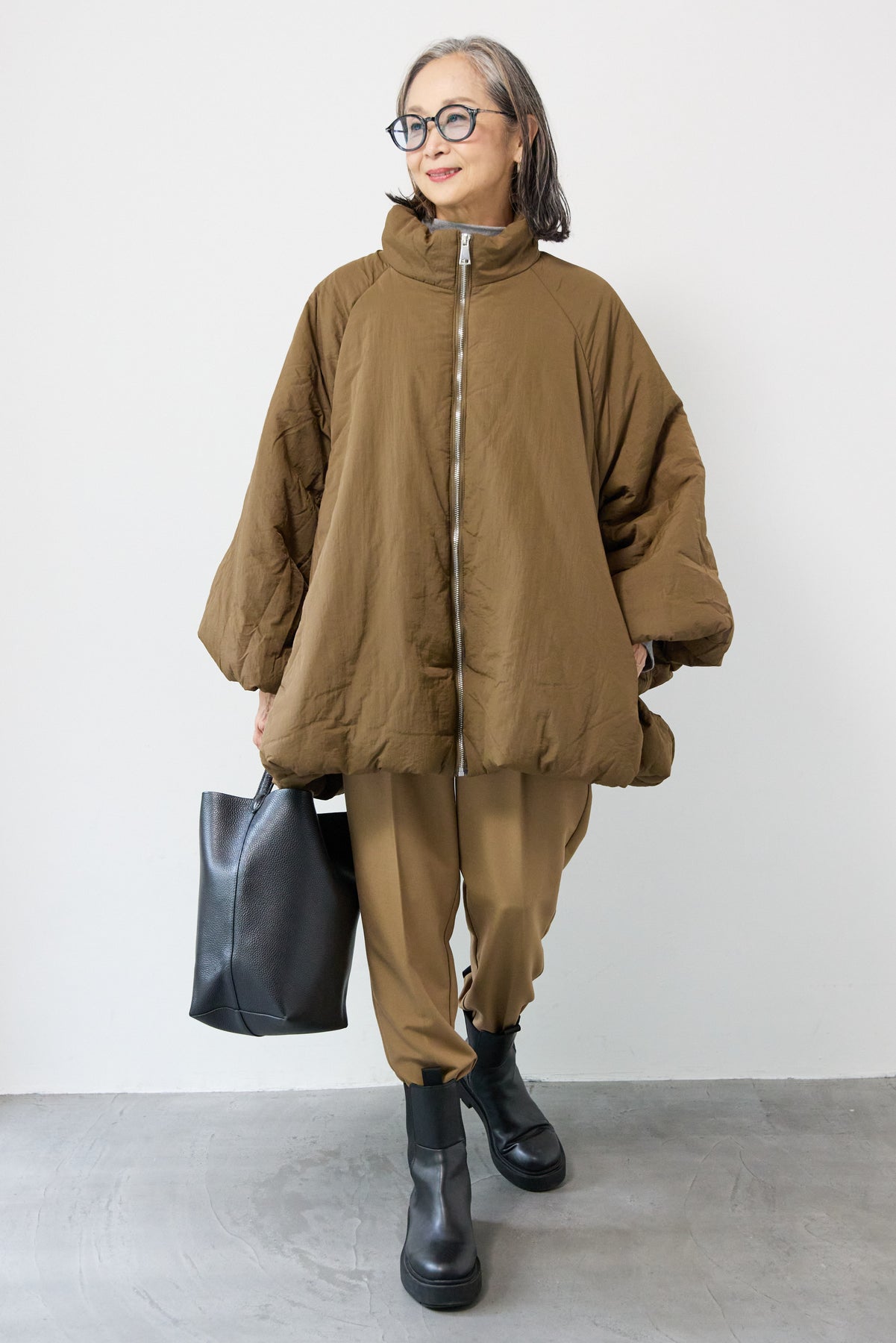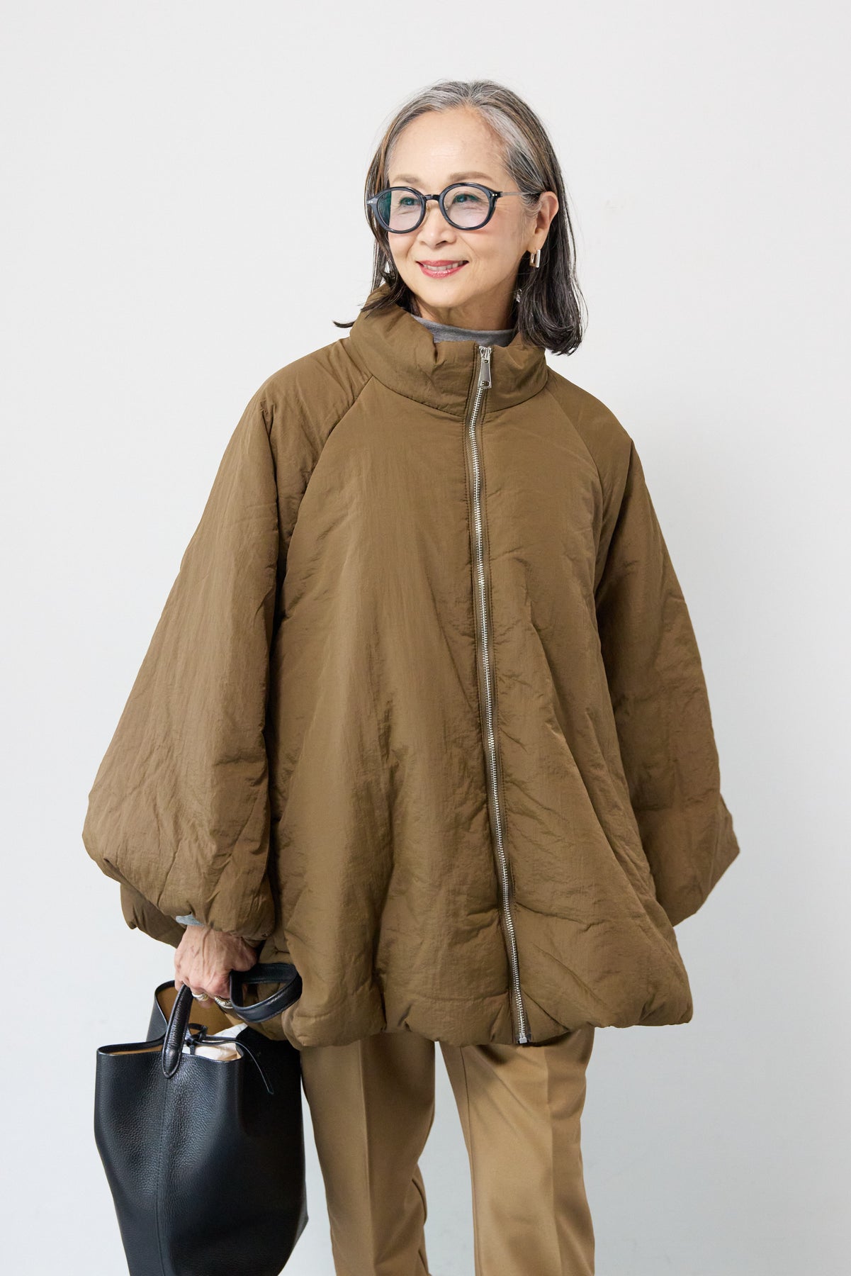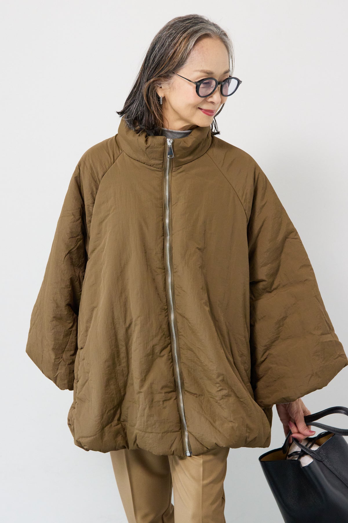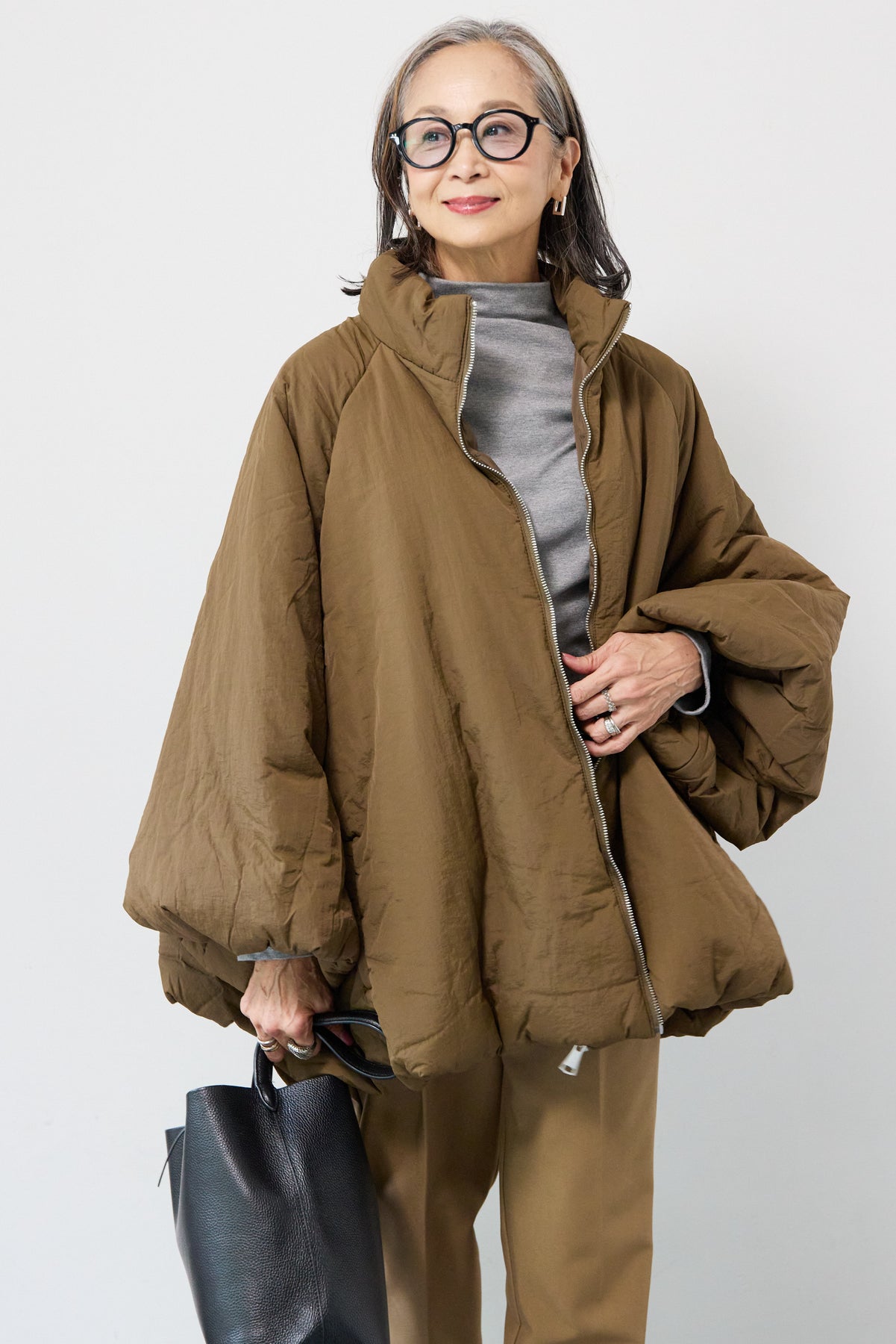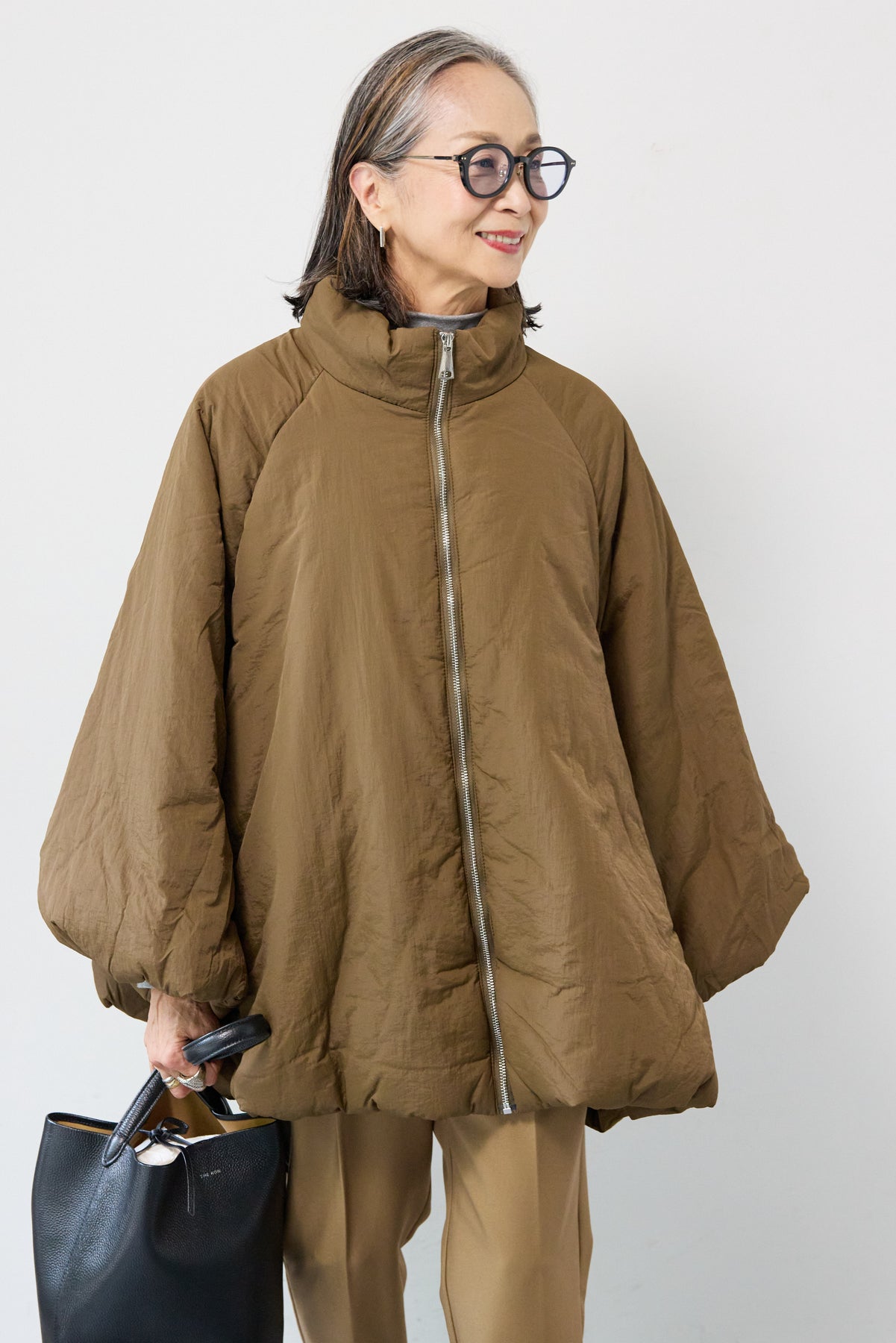 丸みのあるフォルムが特徴の中綿バルーンコート。軽やかな着心地ながらしっかりと保温性があり、寒い季節も快適に過ごせます。 ラグランスリーブのゆったりとしたシルエットで、厚手のニットの上からもストレスなく羽織れるデザイン。 艶を抑えたマットな質感が落ち着いた印象を与え、大人のカジュアルスタイルにぴったりです。 裾の丸みとふんわりとしたボリューム感が優しい雰囲気をプラスし、シンプルながら存在感のある一着です。