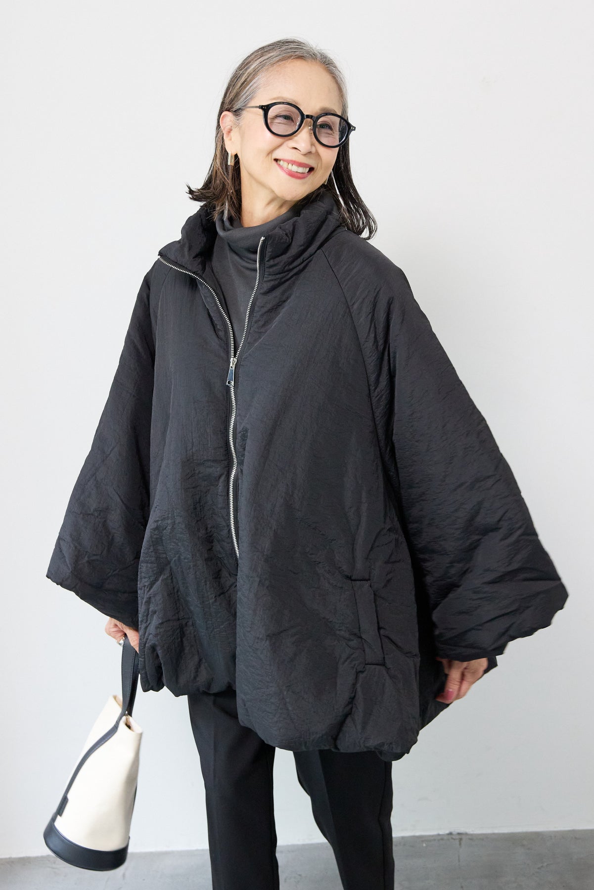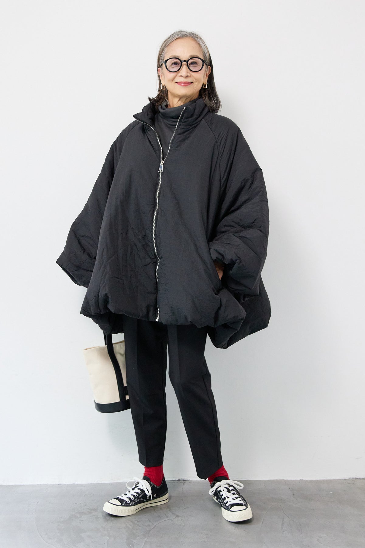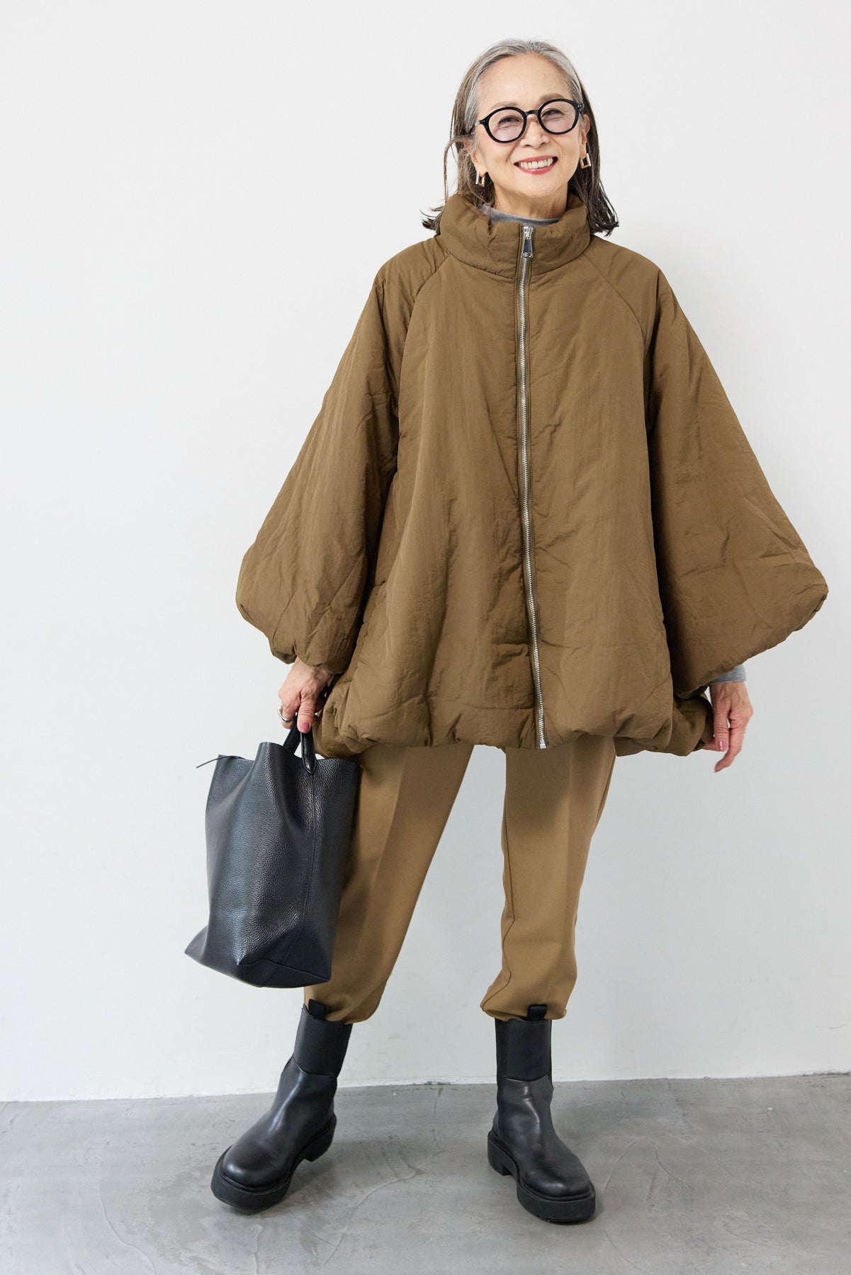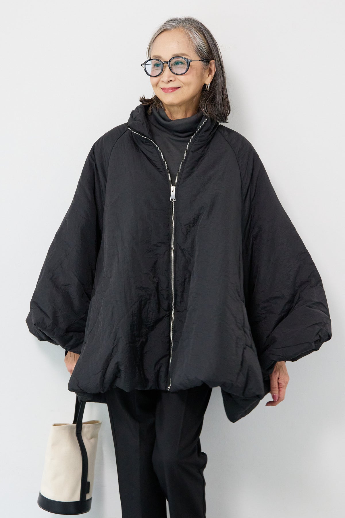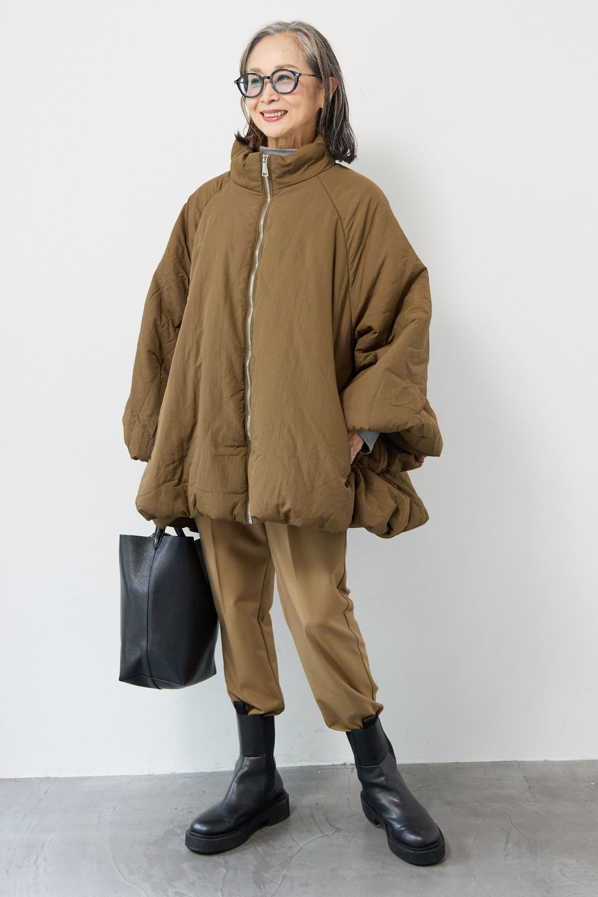 丸みのあるフォルムが特徴の中綿バルーンコート。軽やかな着心地ながらしっかりと保温性があり、寒い季節も快適に過ごせます。 ラグランスリーブのゆったりとしたシルエットで、厚手のニットの上からもストレスなく羽織れるデザイン。 艶を抑えたマットな質感が落ち着いた印象を与え、大人のカジュアルスタイルにぴったりです。 裾の丸みとふんわりとしたボリューム感が優しい雰囲気をプラスし、シンプルながら存在感のある一着です。