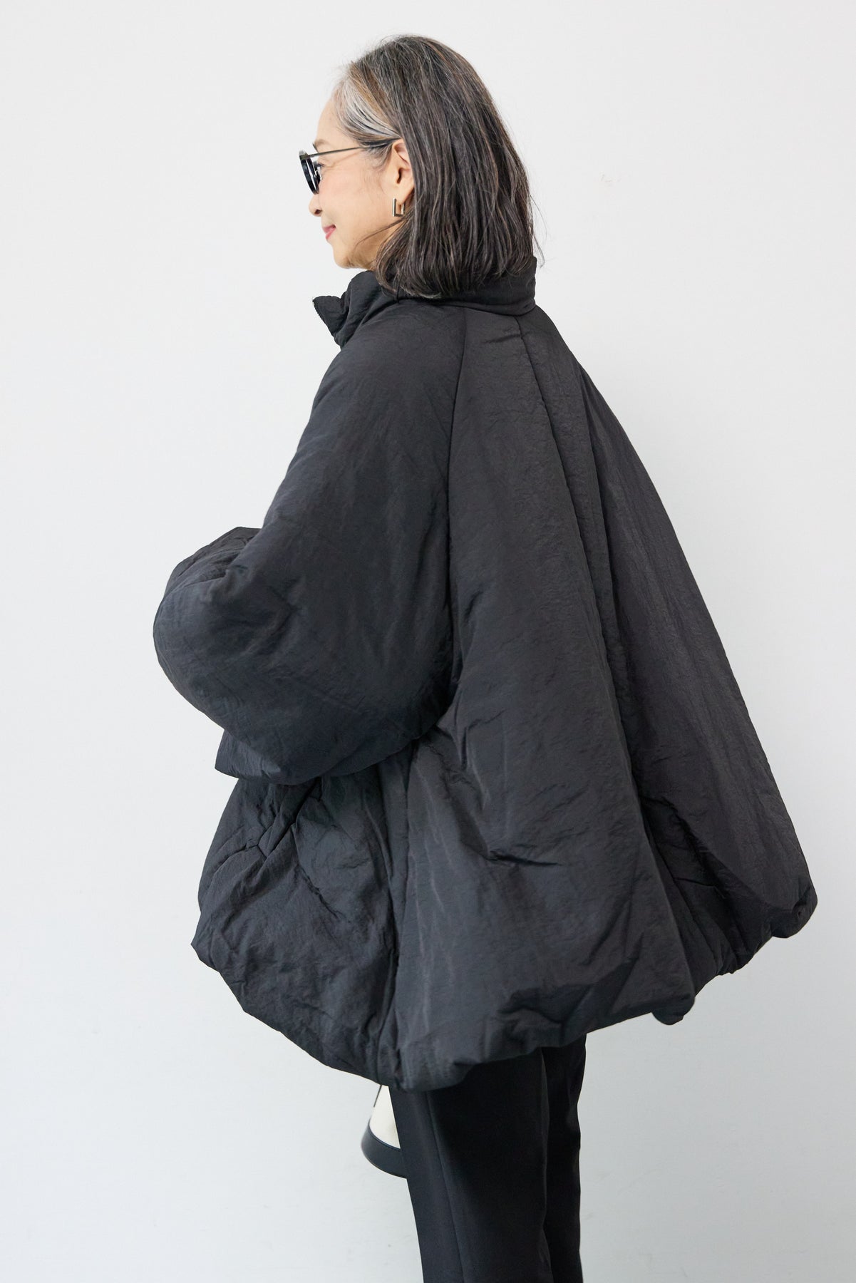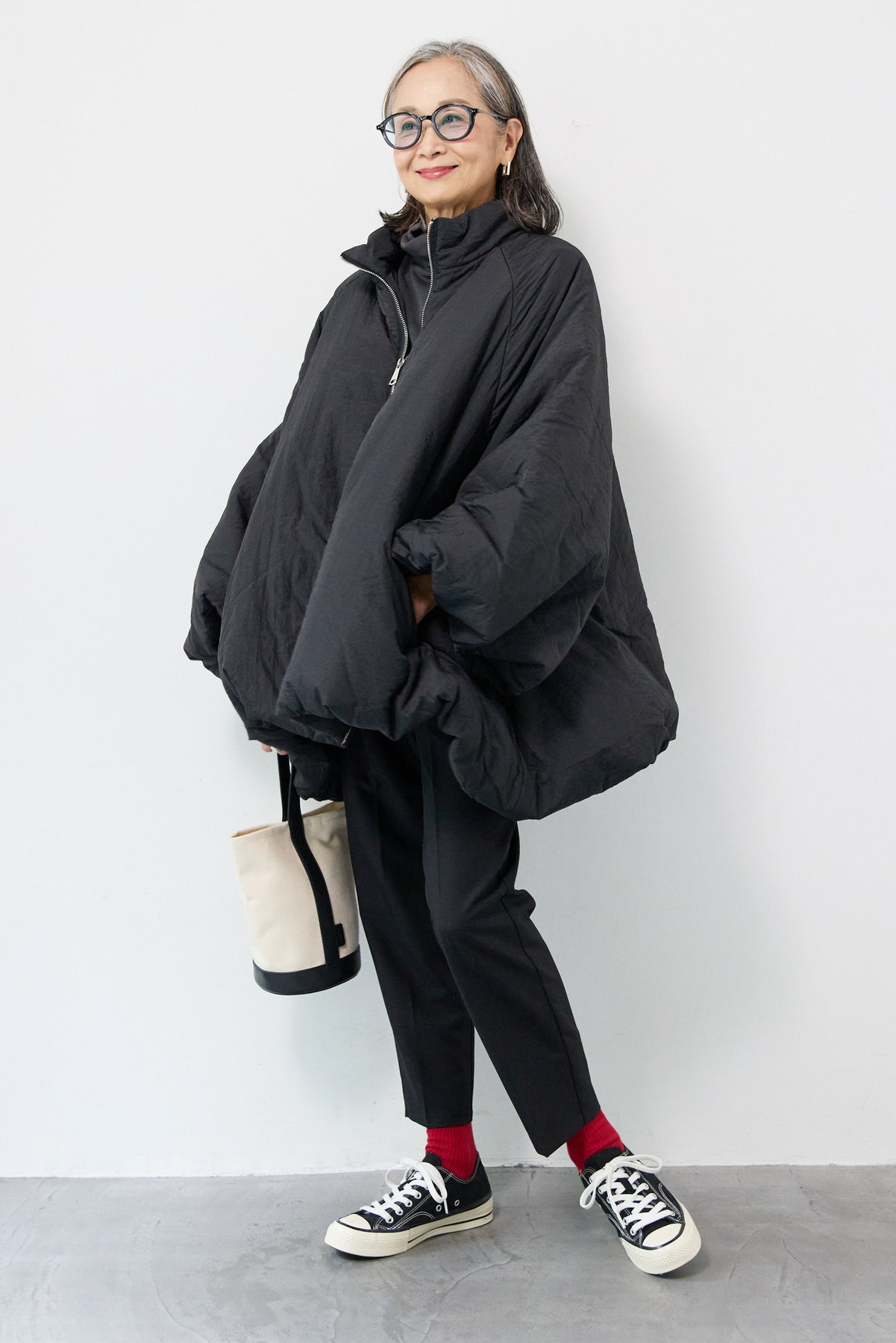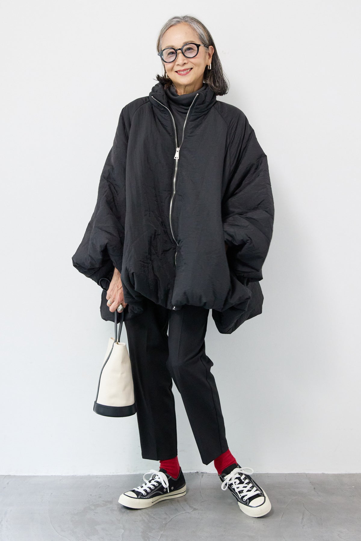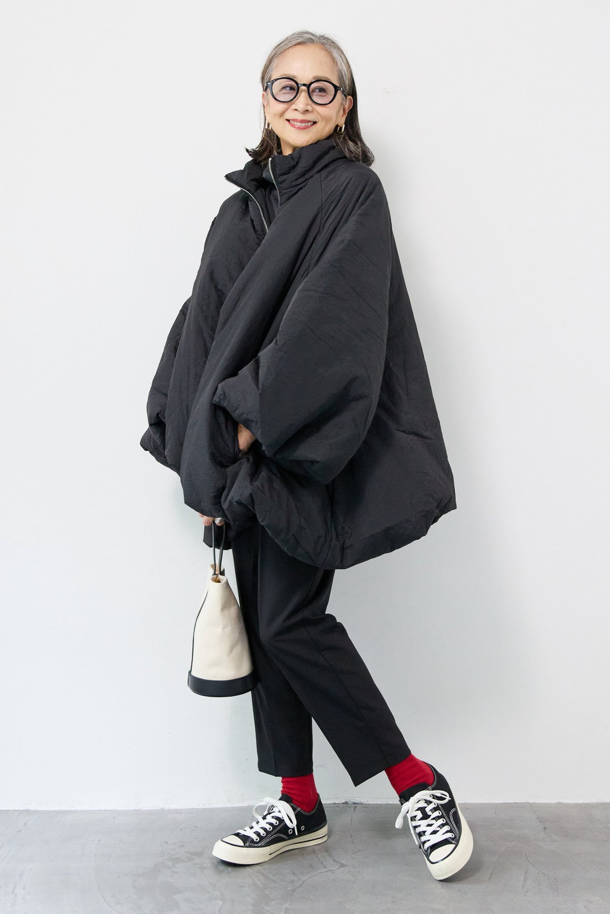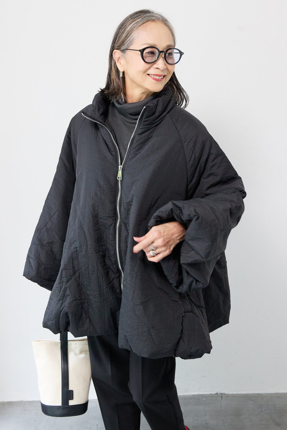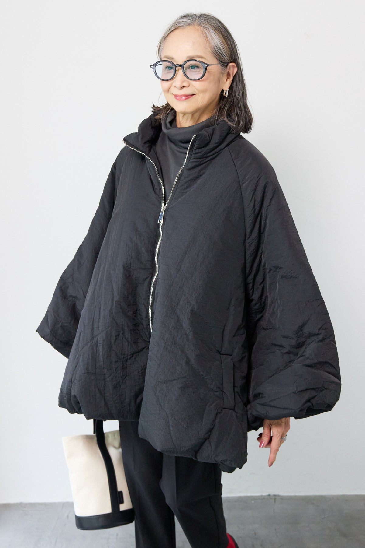 丸みのあるフォルムが特徴の中綿バルーンコート。軽やかな着心地ながらしっかりと保温性があり、寒い季節も快適に過ごせます。 ラグランスリーブのゆったりとしたシルエットで、厚手のニットの上からもストレスなく羽織れるデザイン。 艶を抑えたマットな質感が落ち着いた印象を与え、大人のカジュアルスタイルにぴったりです。 裾の丸みとふんわりとしたボリューム感が優しい雰囲気をプラスし、シンプルながら存在感のある一着です。